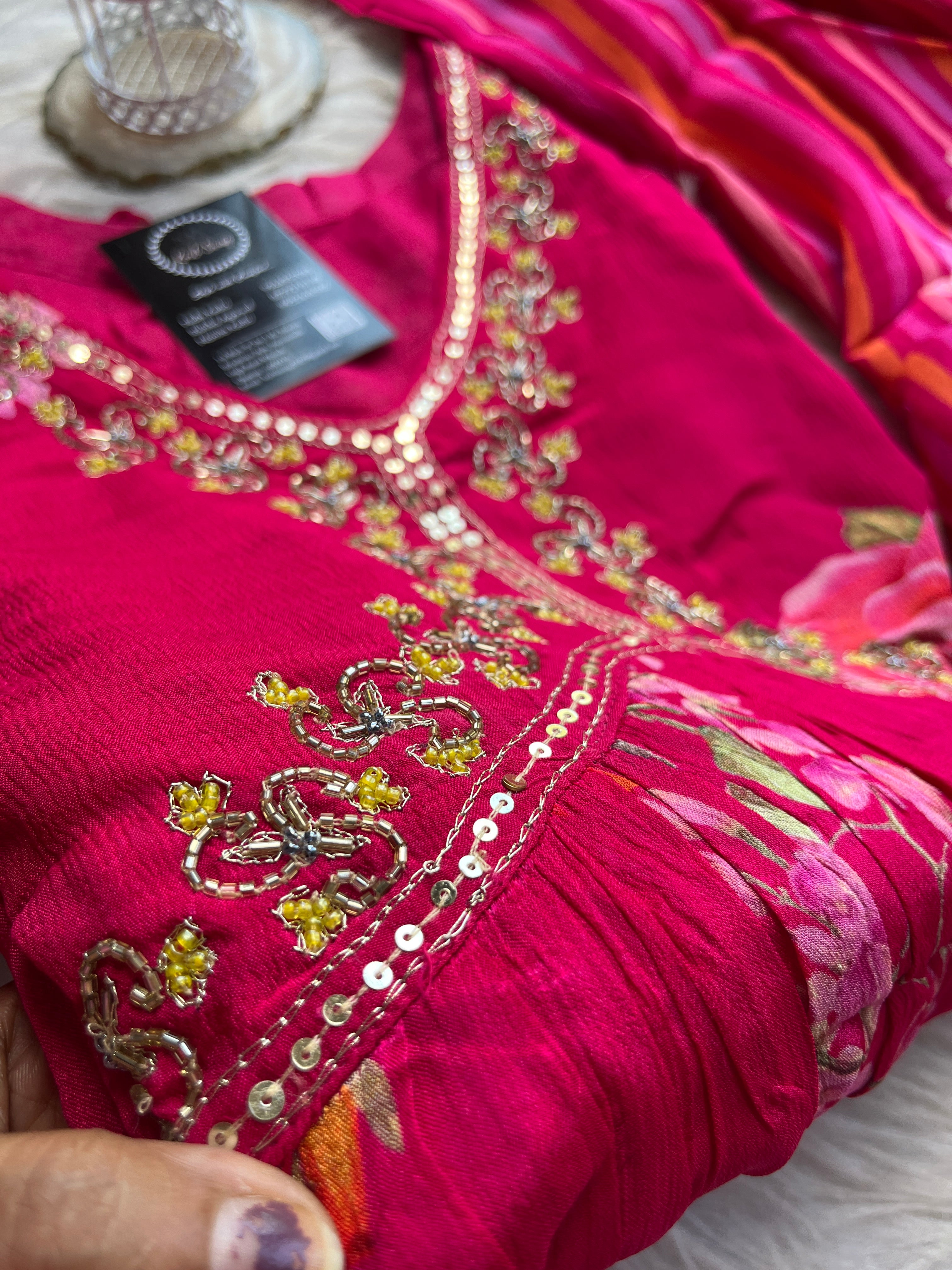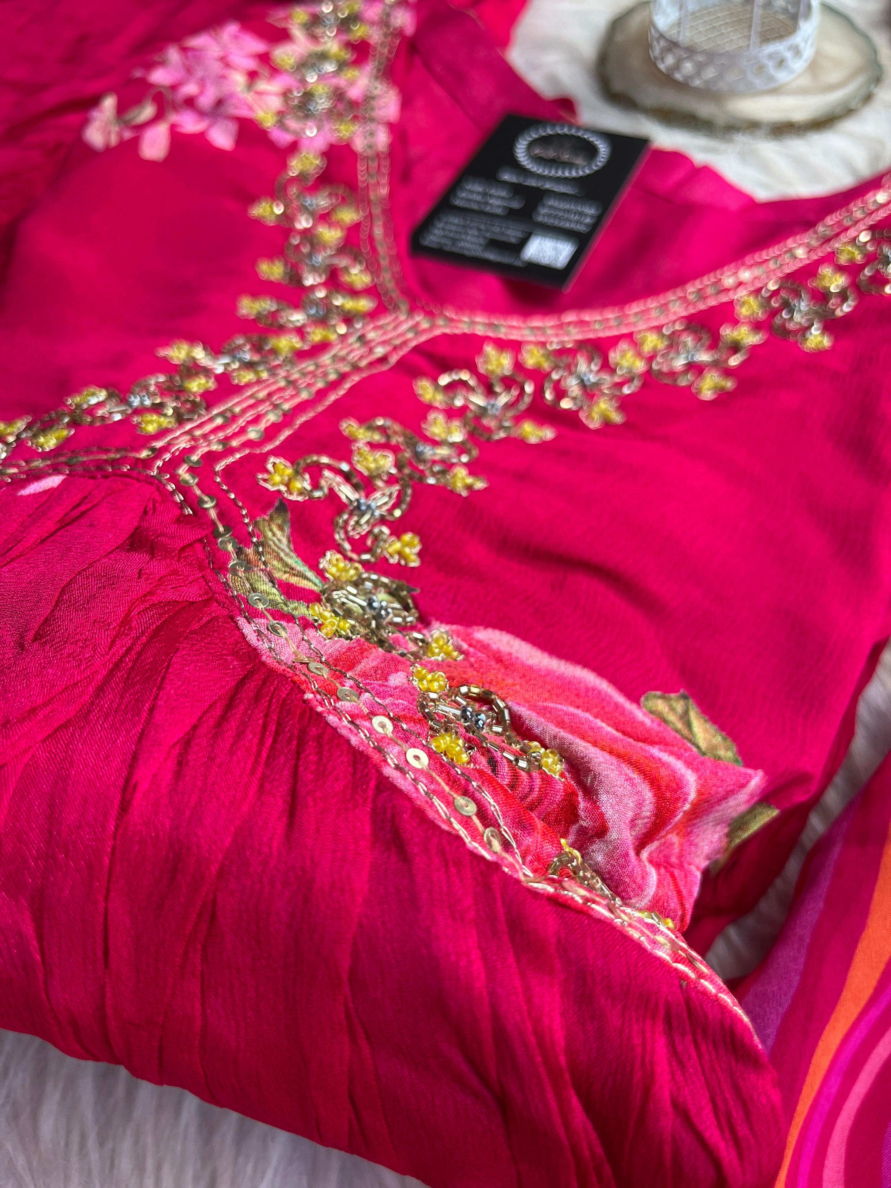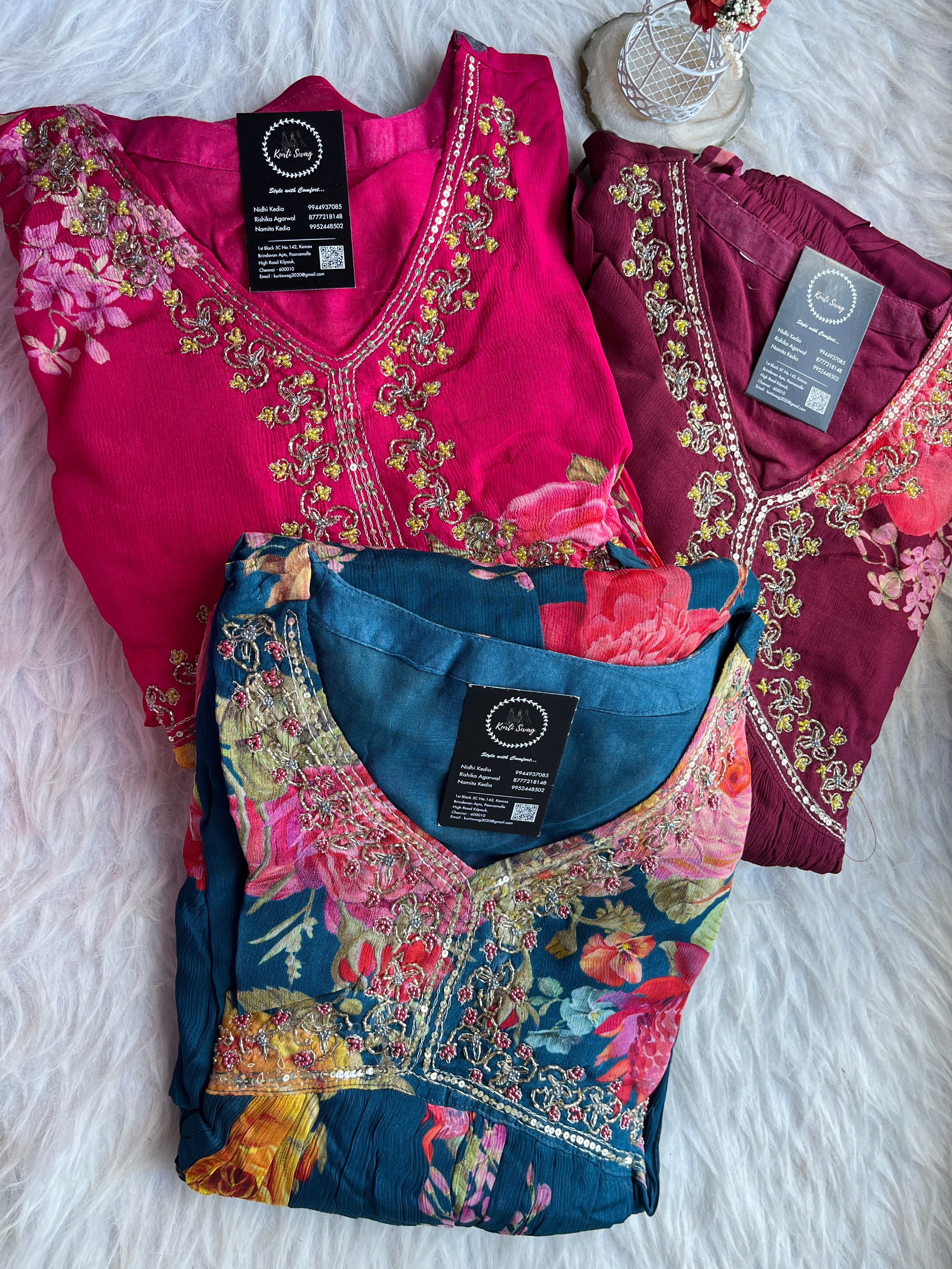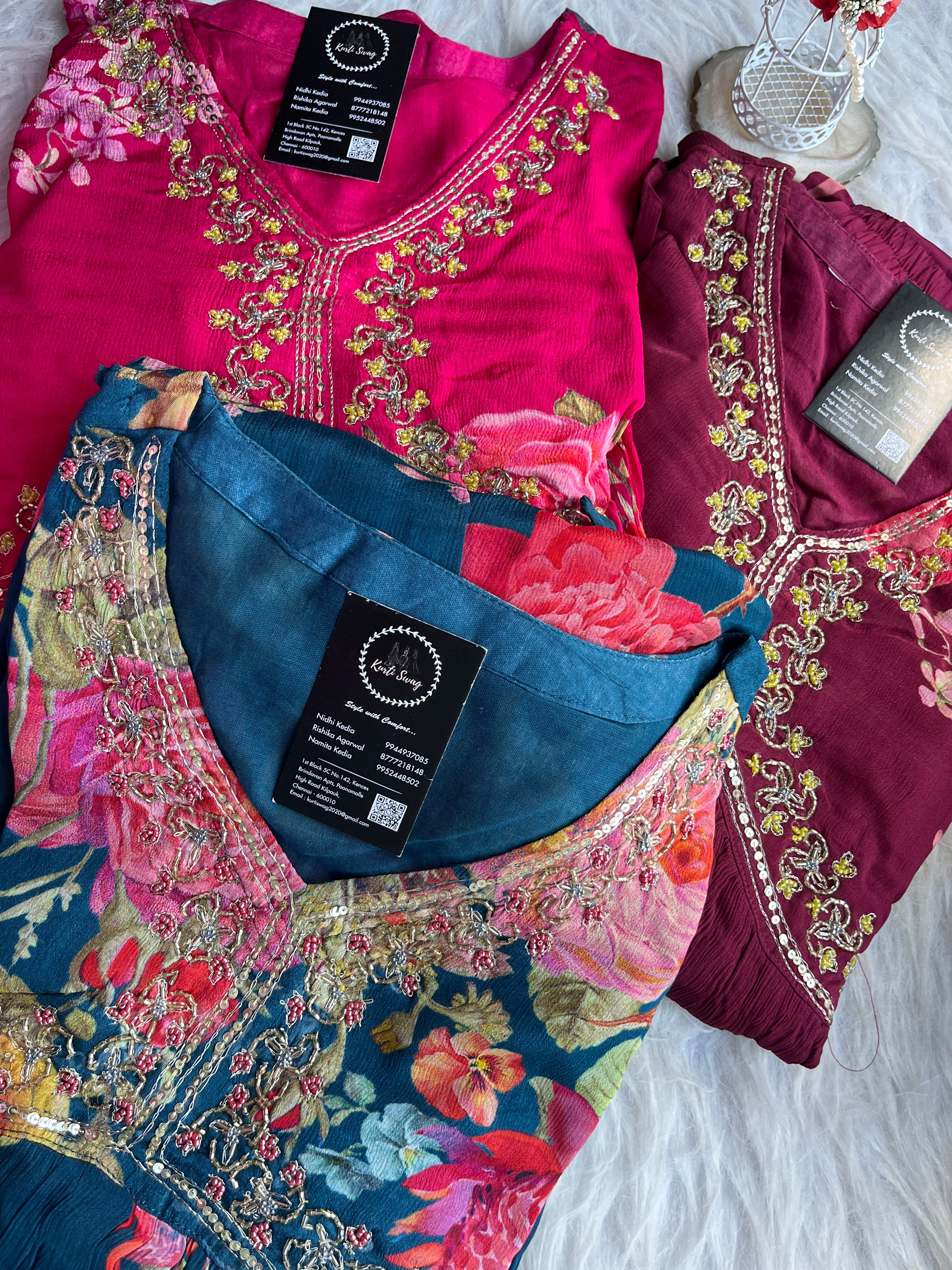 ✅ Printed chinnon kurti in alia cut with embroidery on the yoke.