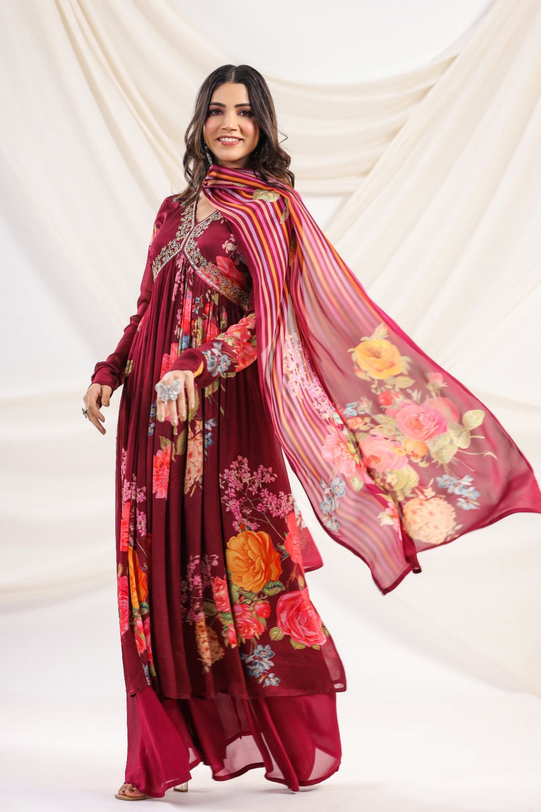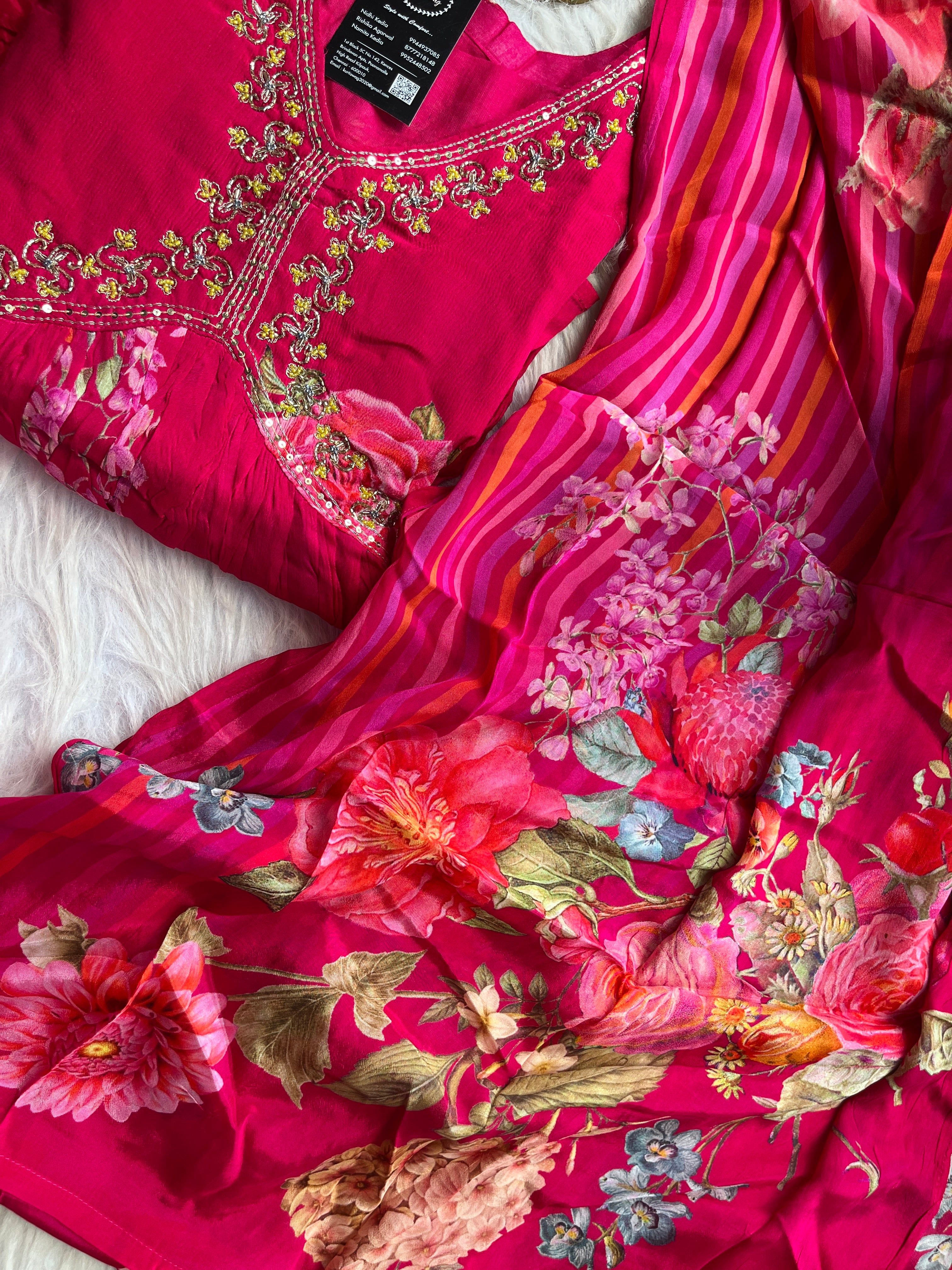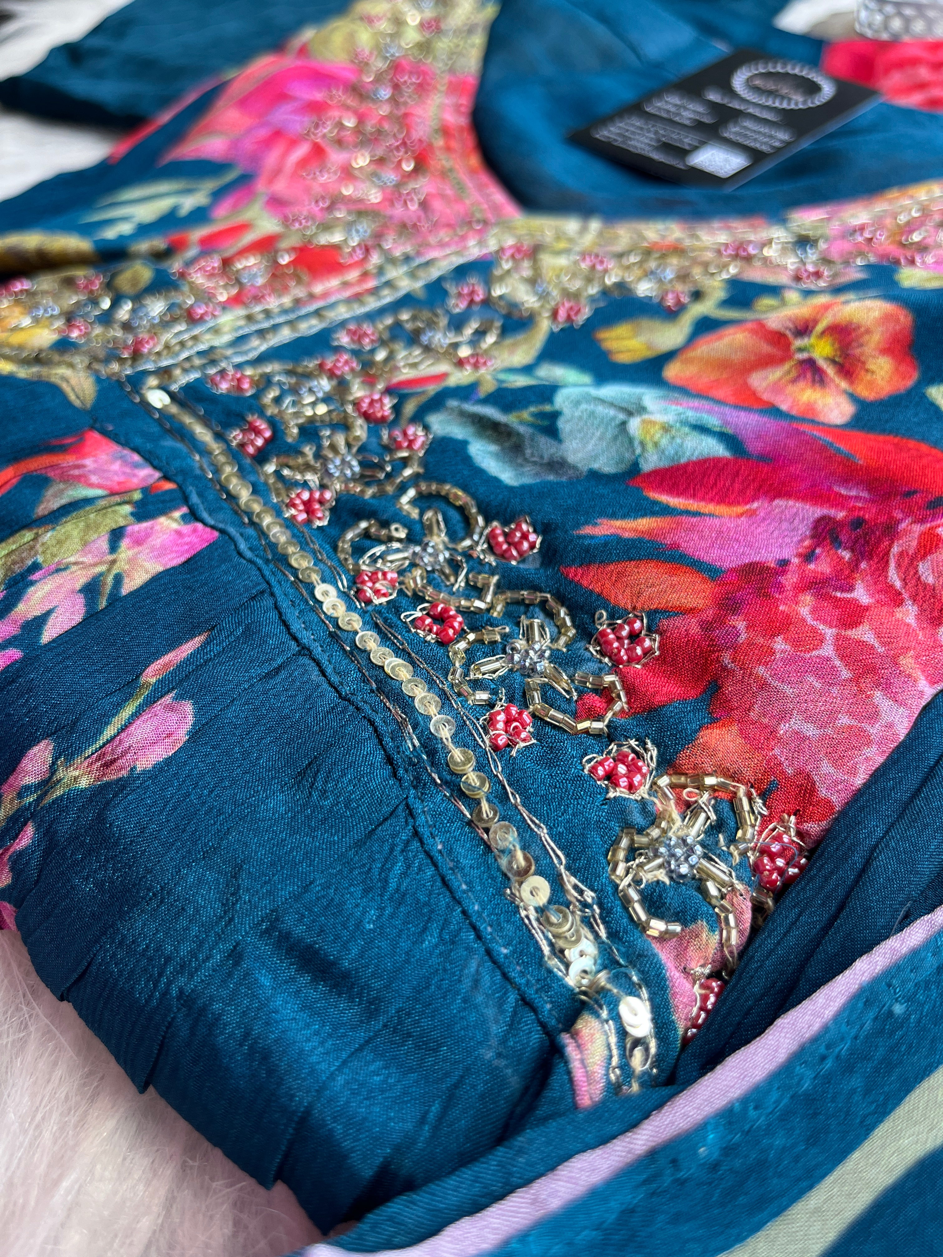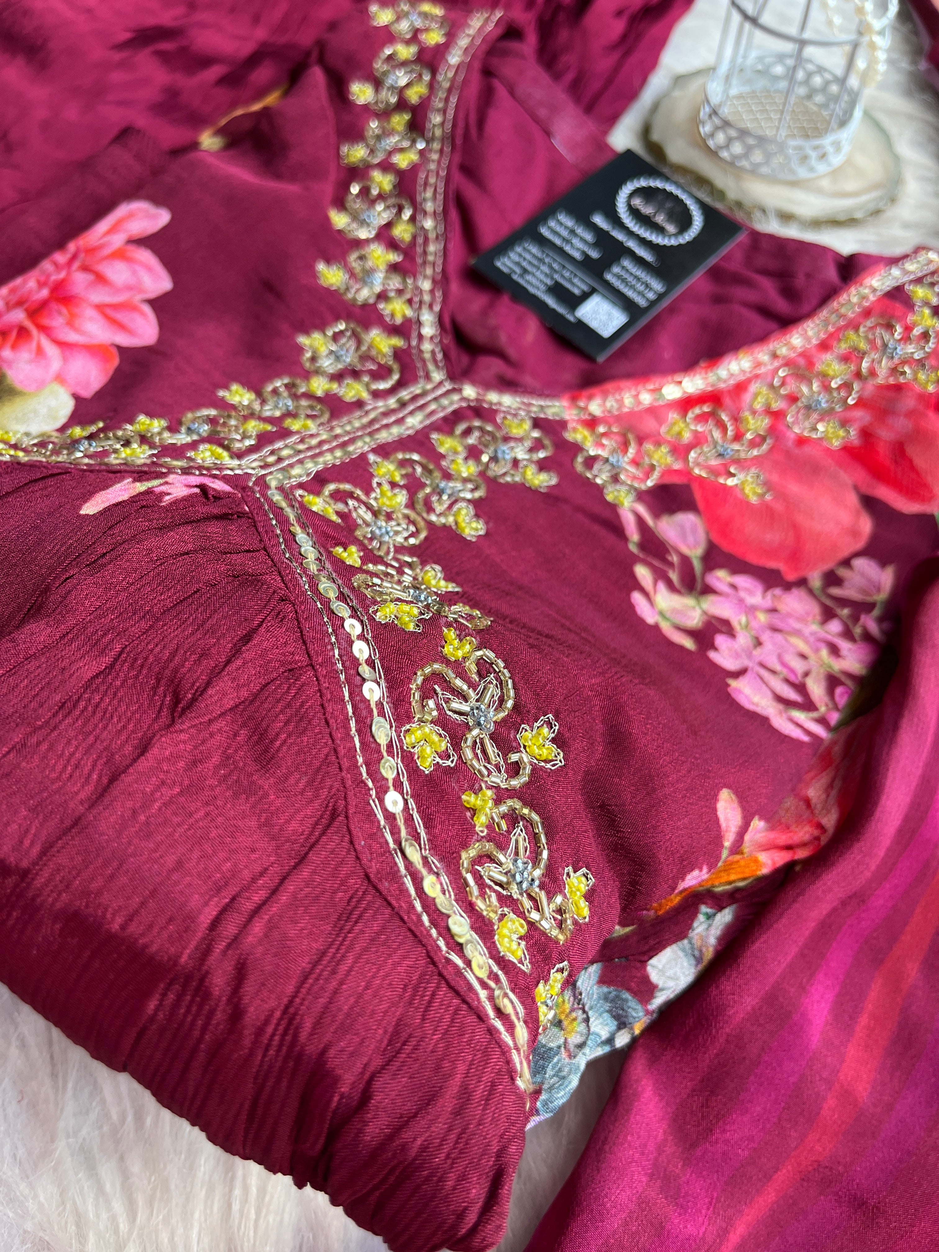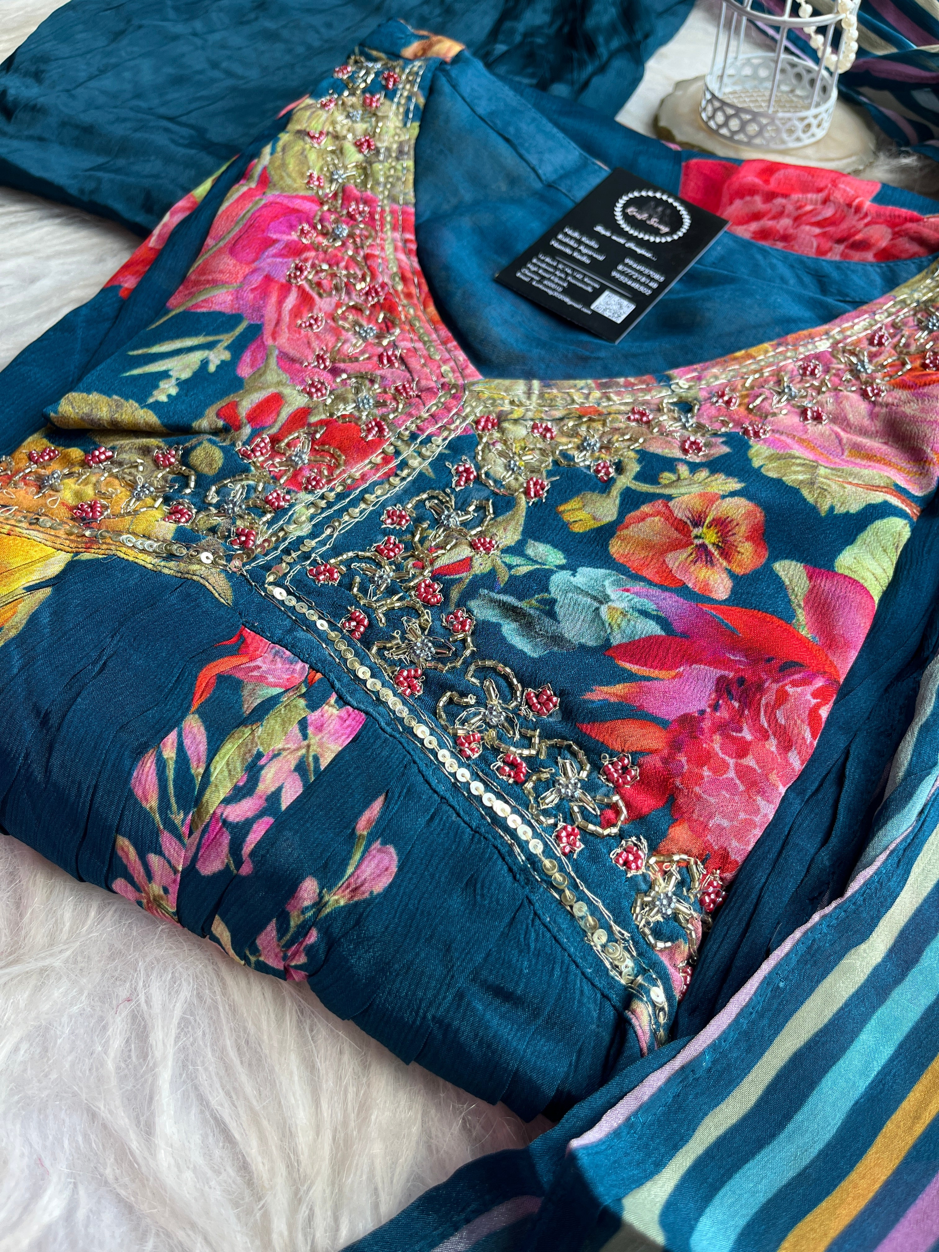 ✅ Printed chinnon kurti in alia cut with embroidery on the yoke.