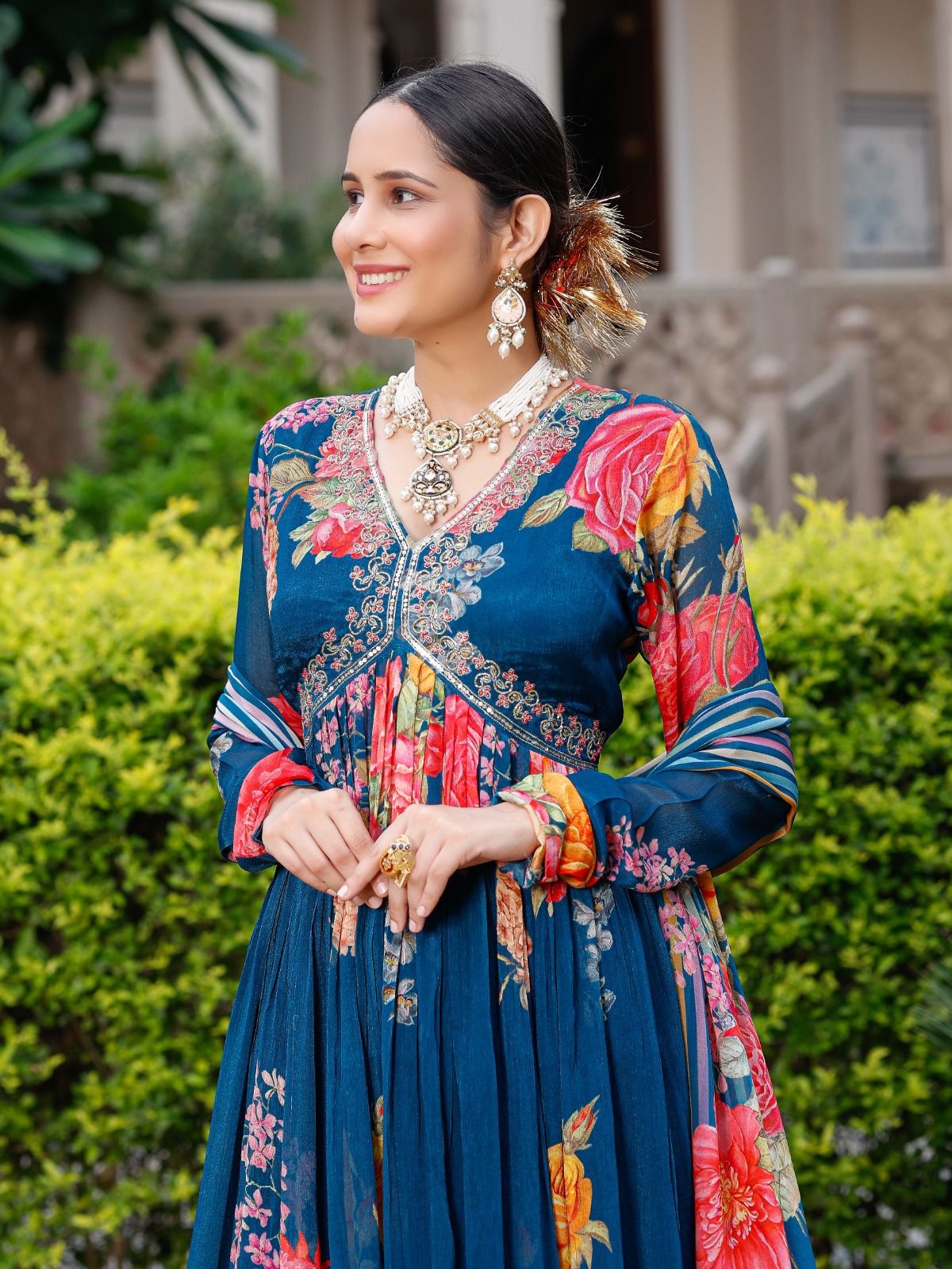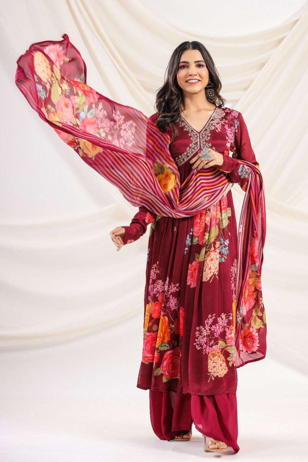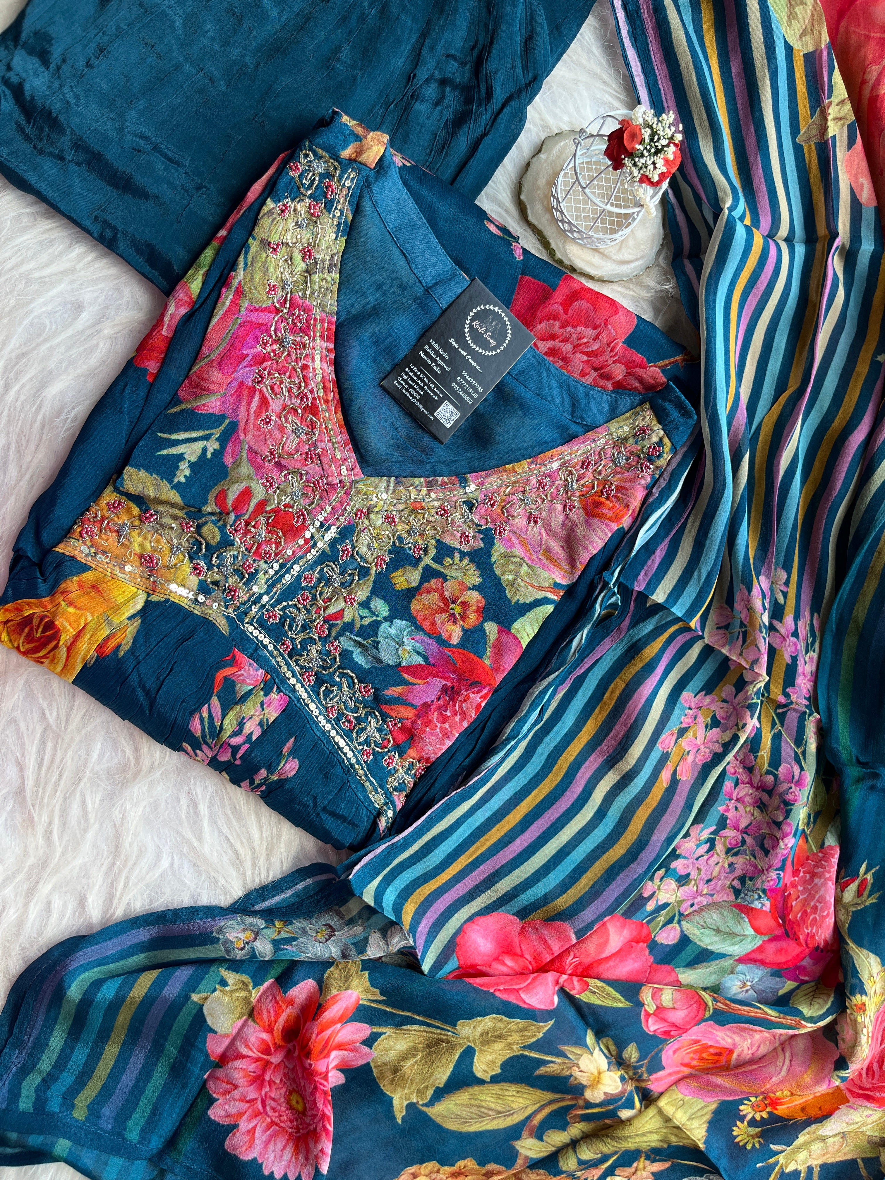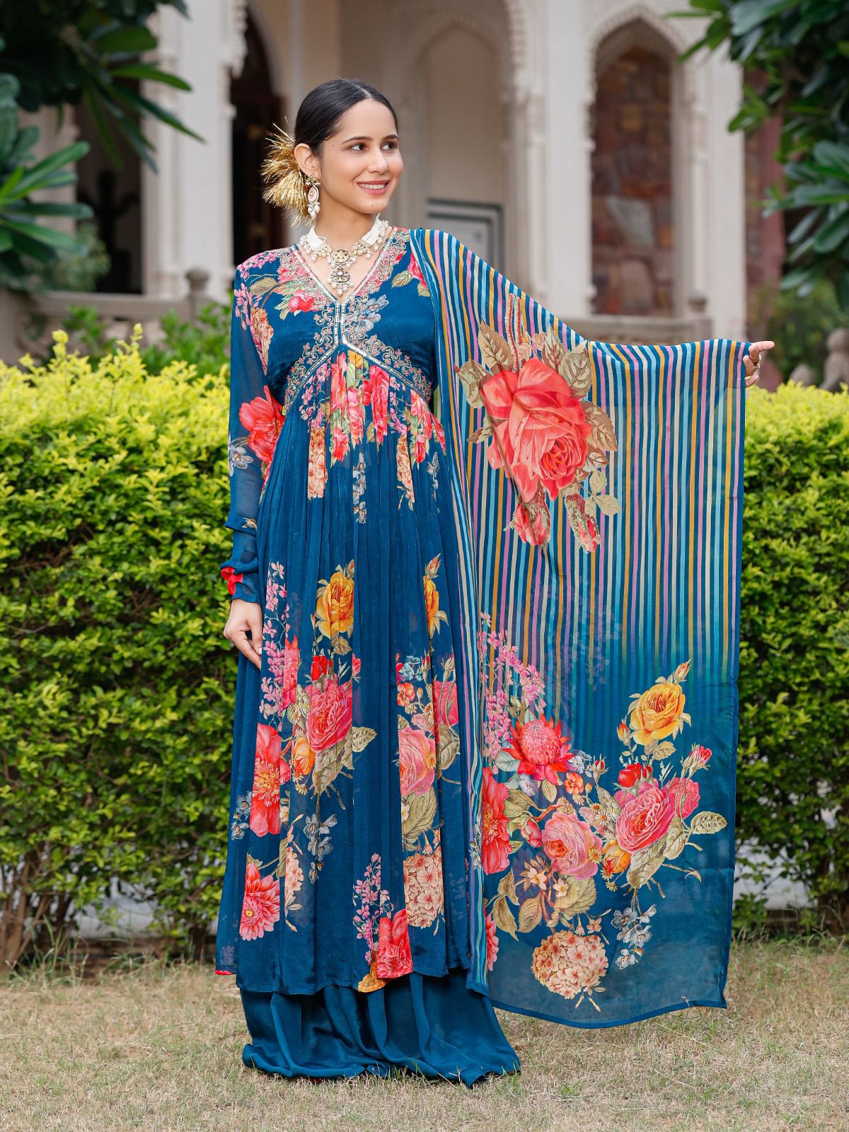 ✅ Printed chinnon kurti in alia cut with embroidery on the yoke.