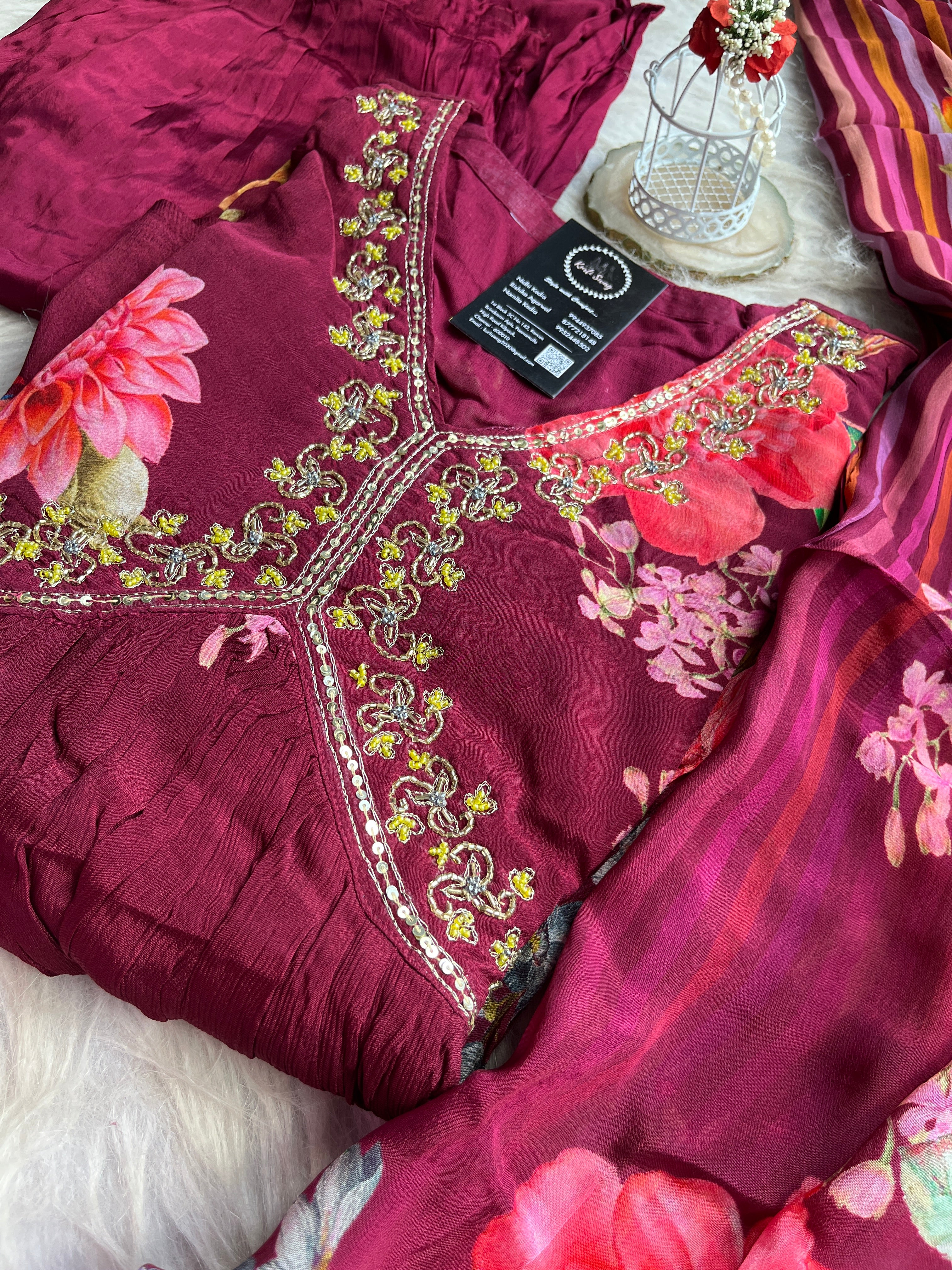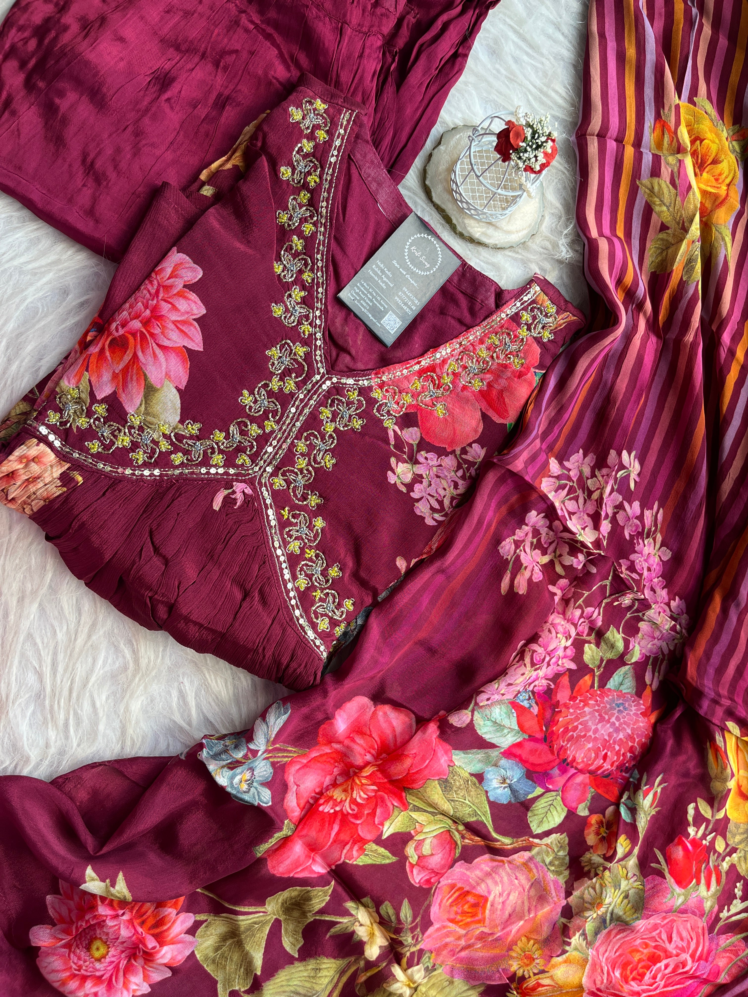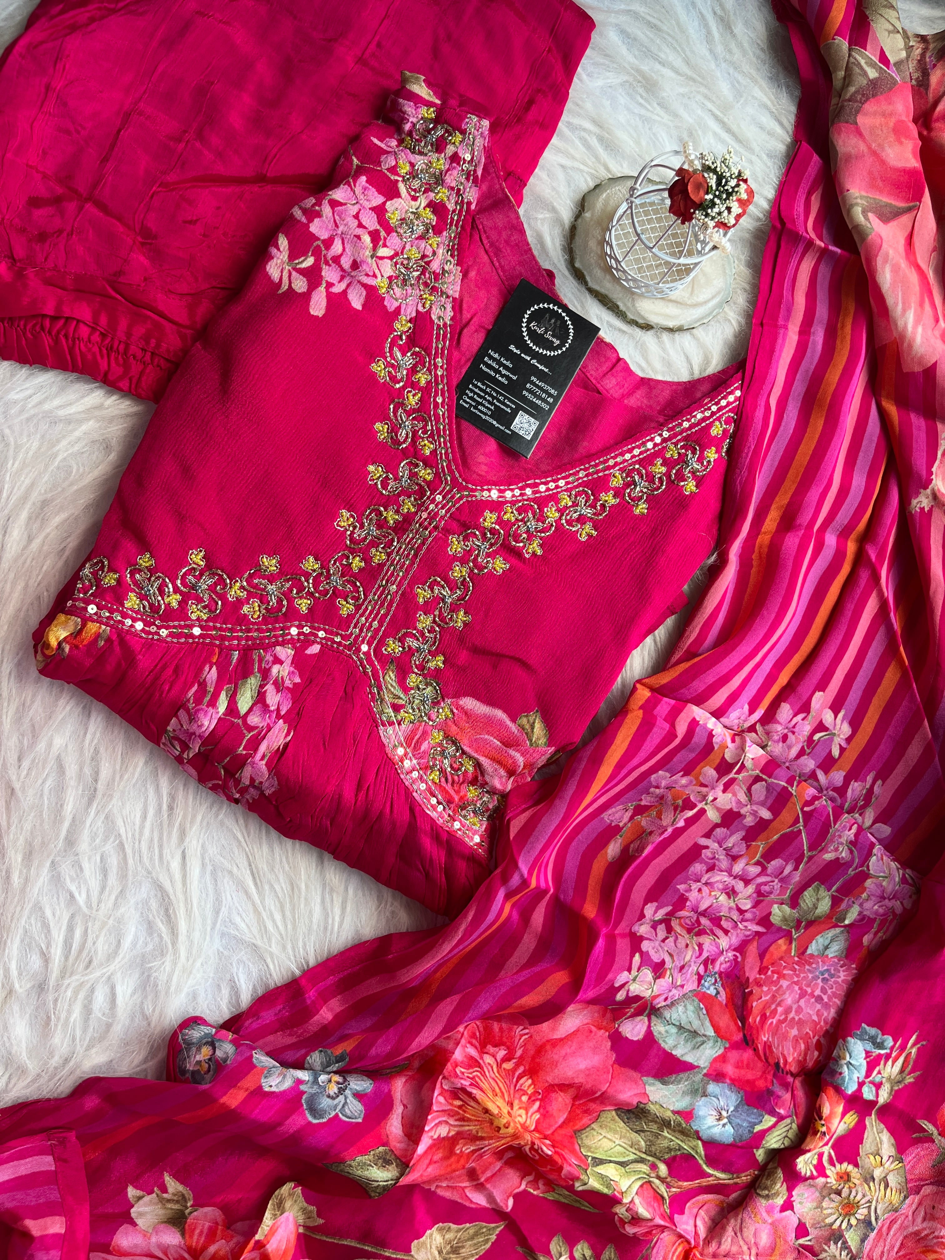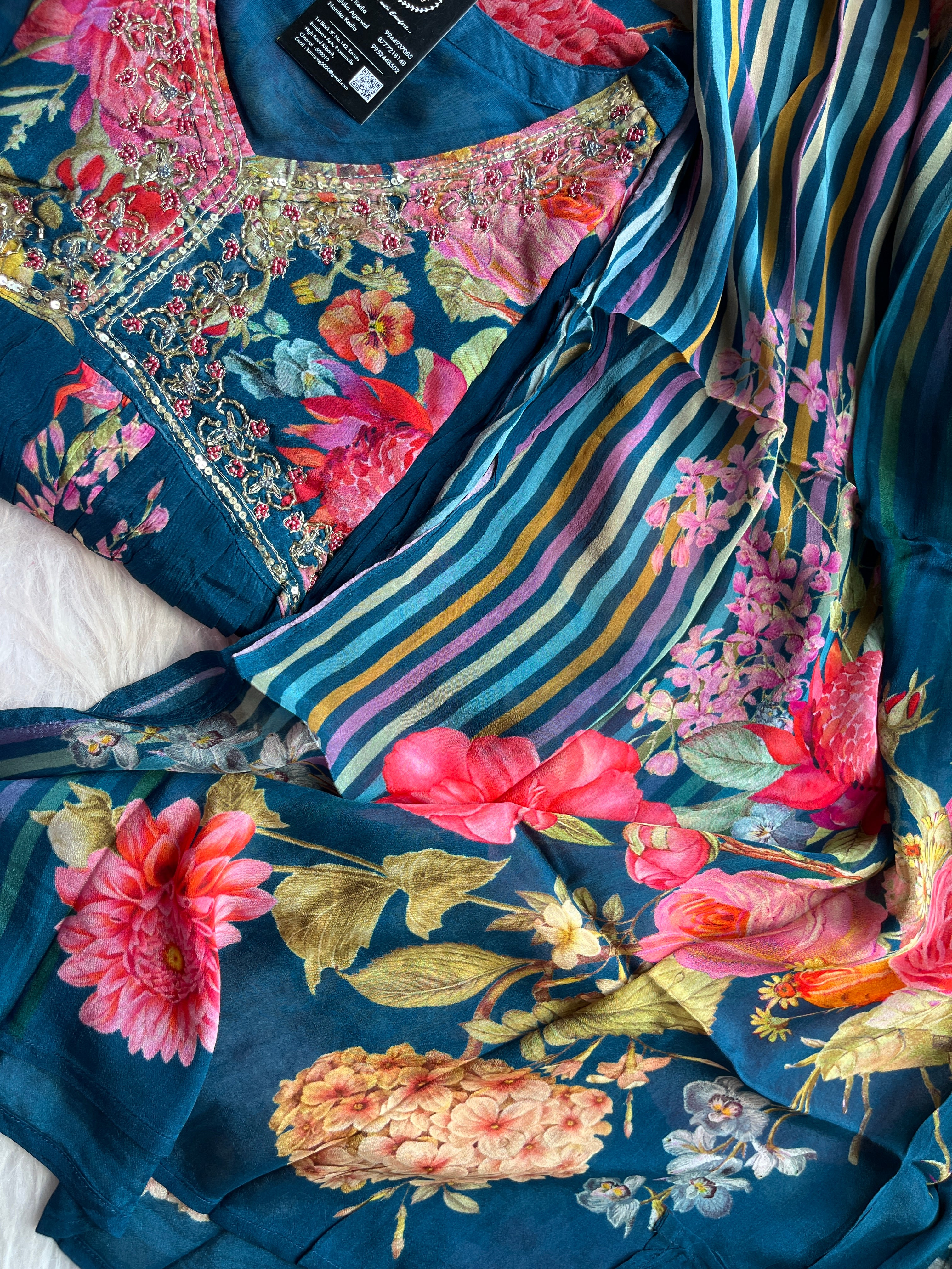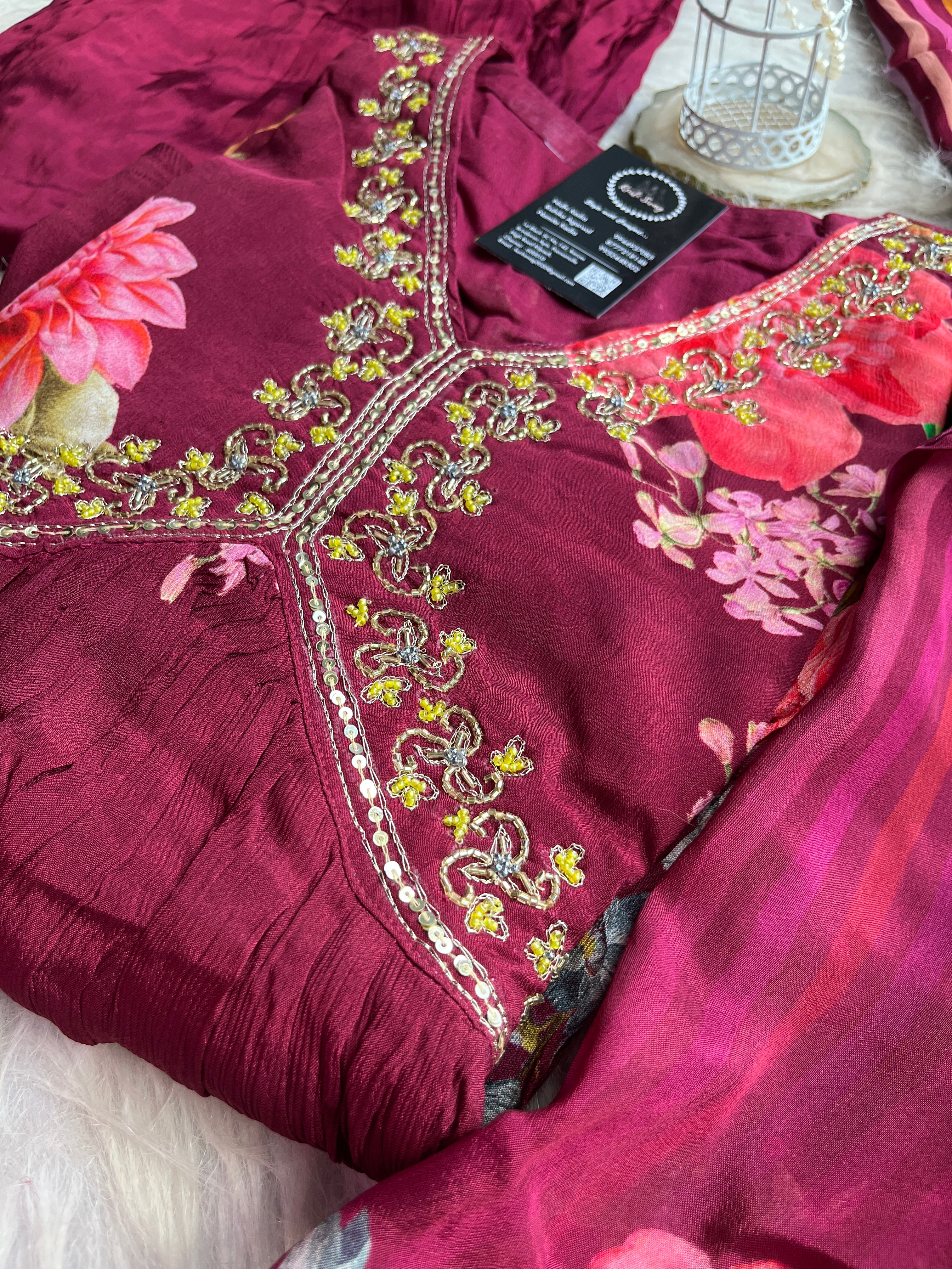 ✅ Printed chinnon kurti in alia cut with embroidery on the yoke.
