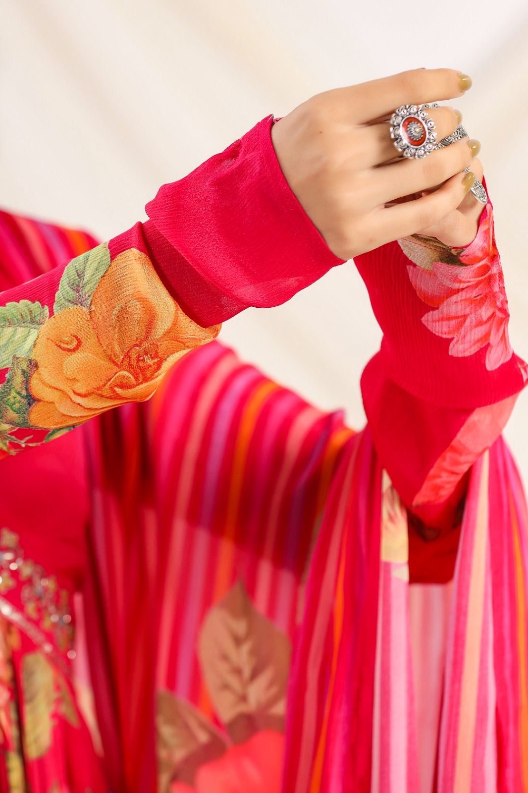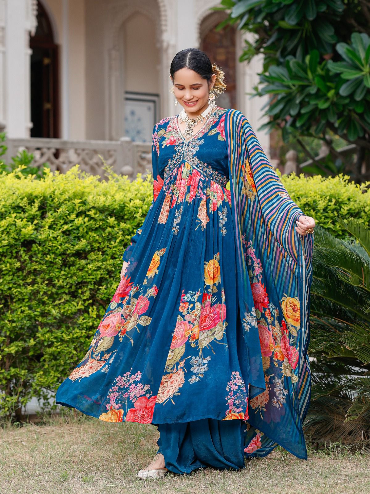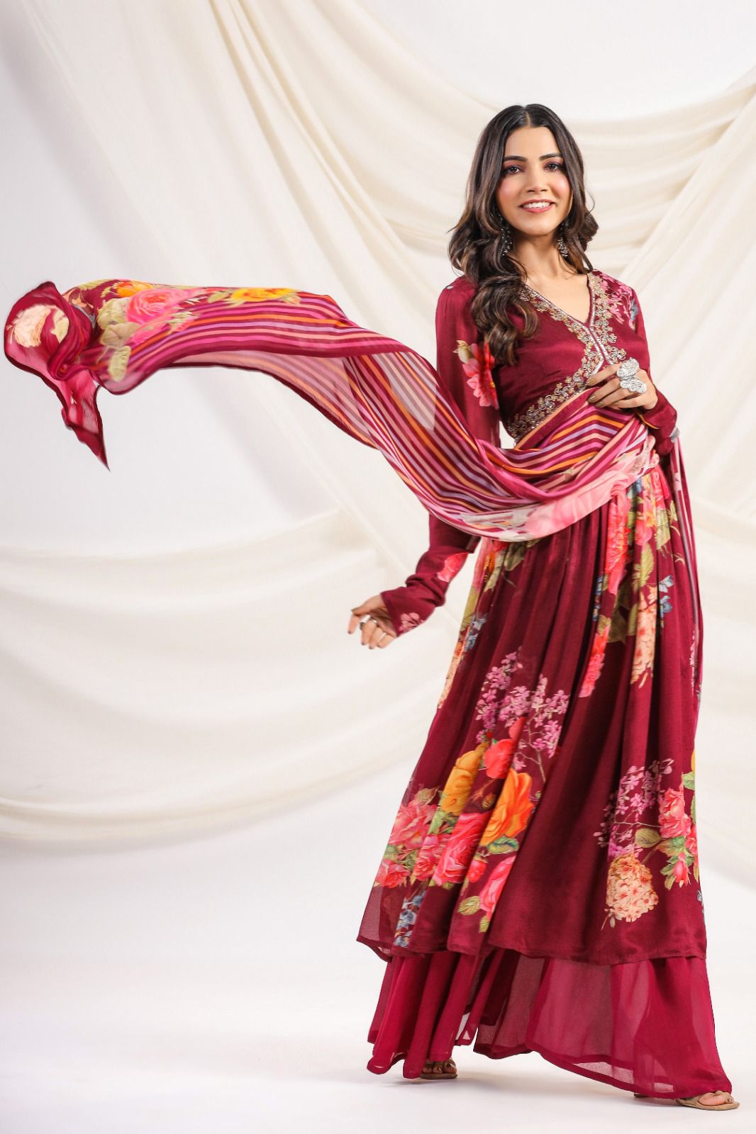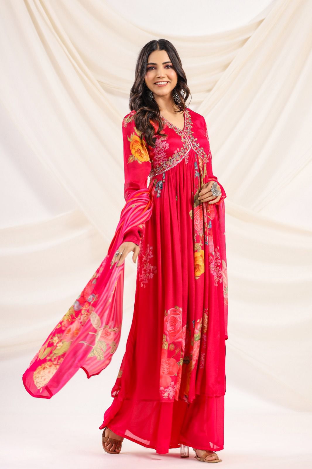 ✅ Printed chinnon kurti in alia cut with embroidery on the yoke.