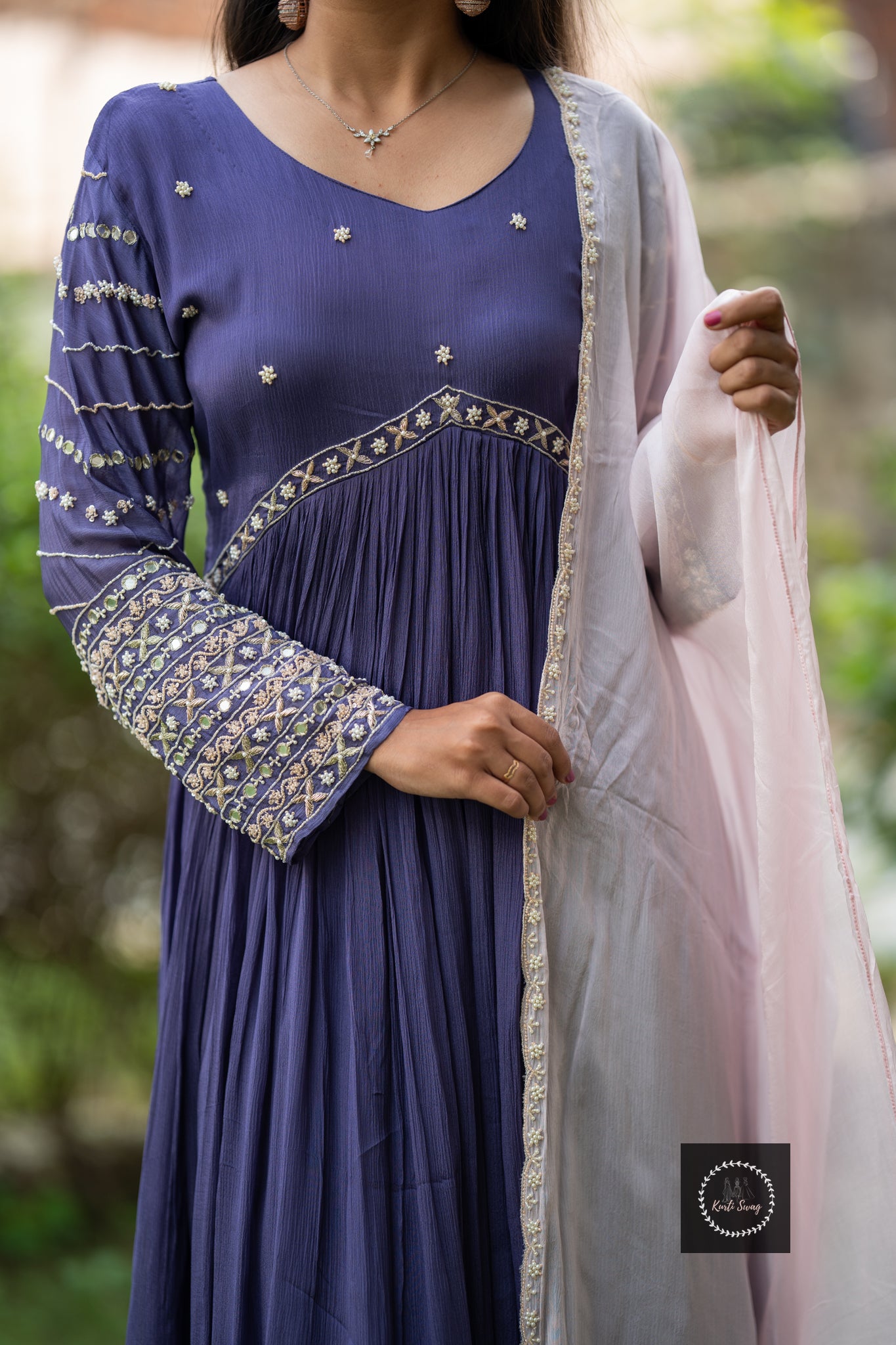 ✅Premium chinnon kurti in alia pattern with pearl hand embroidery on the yoke.