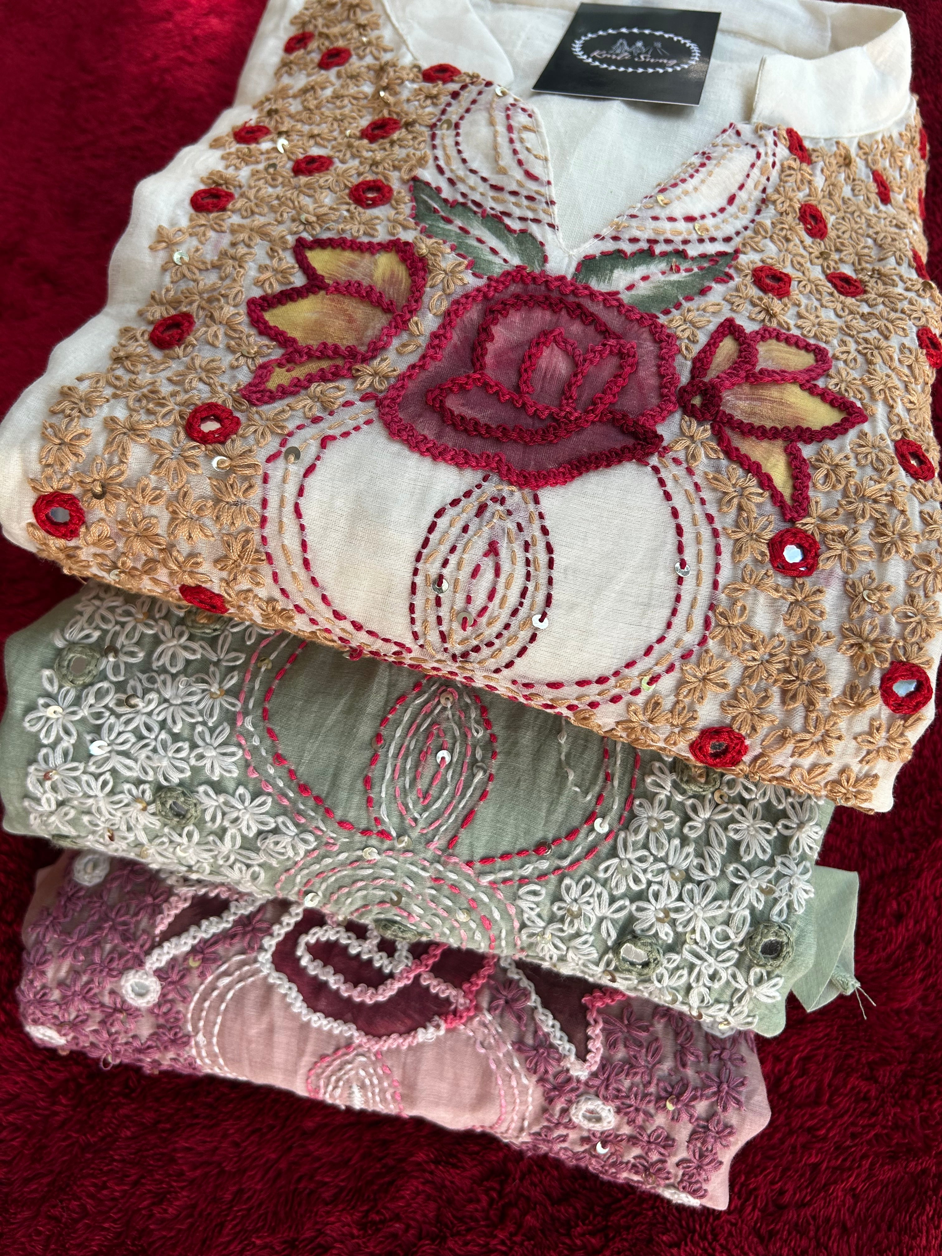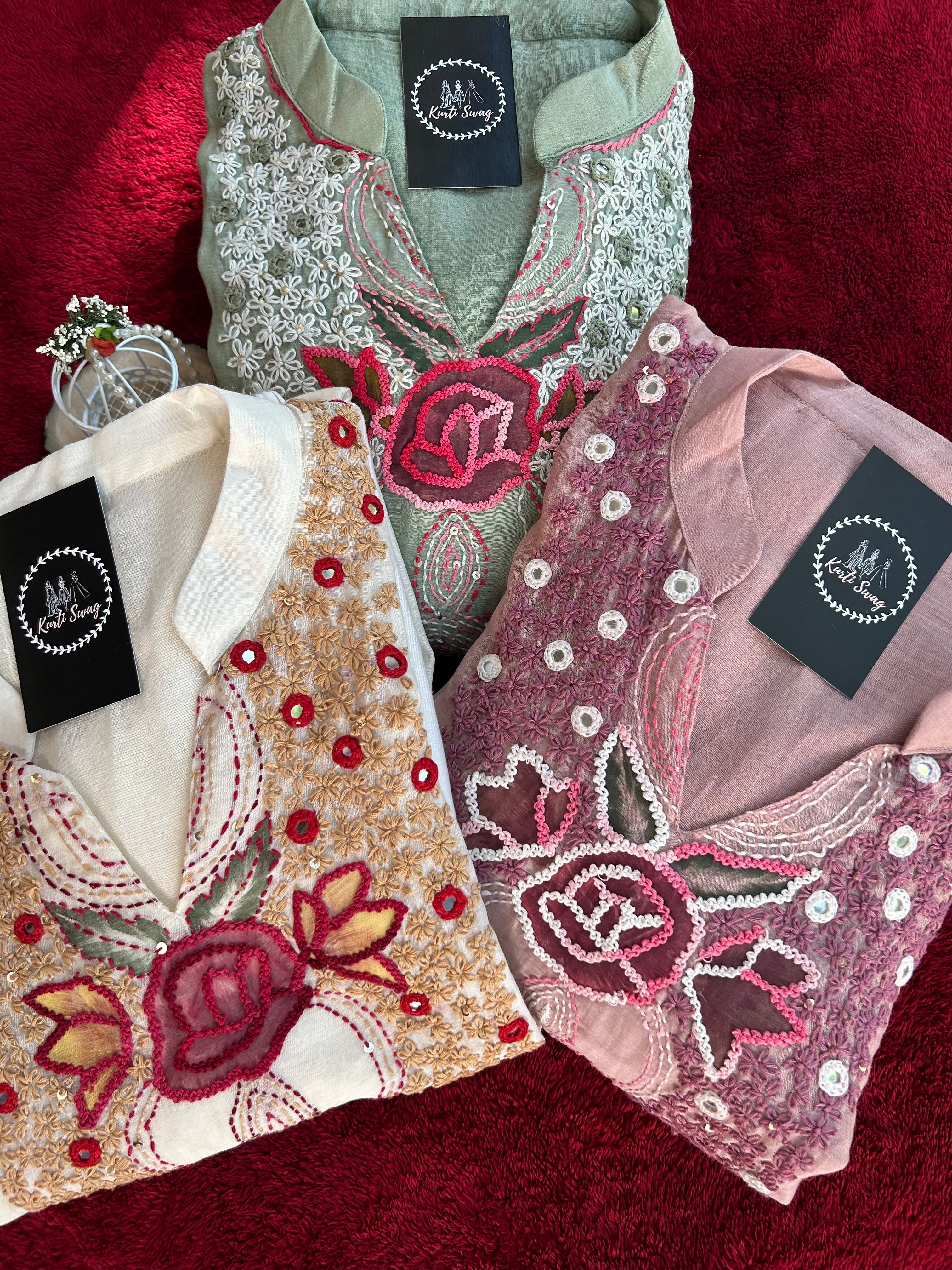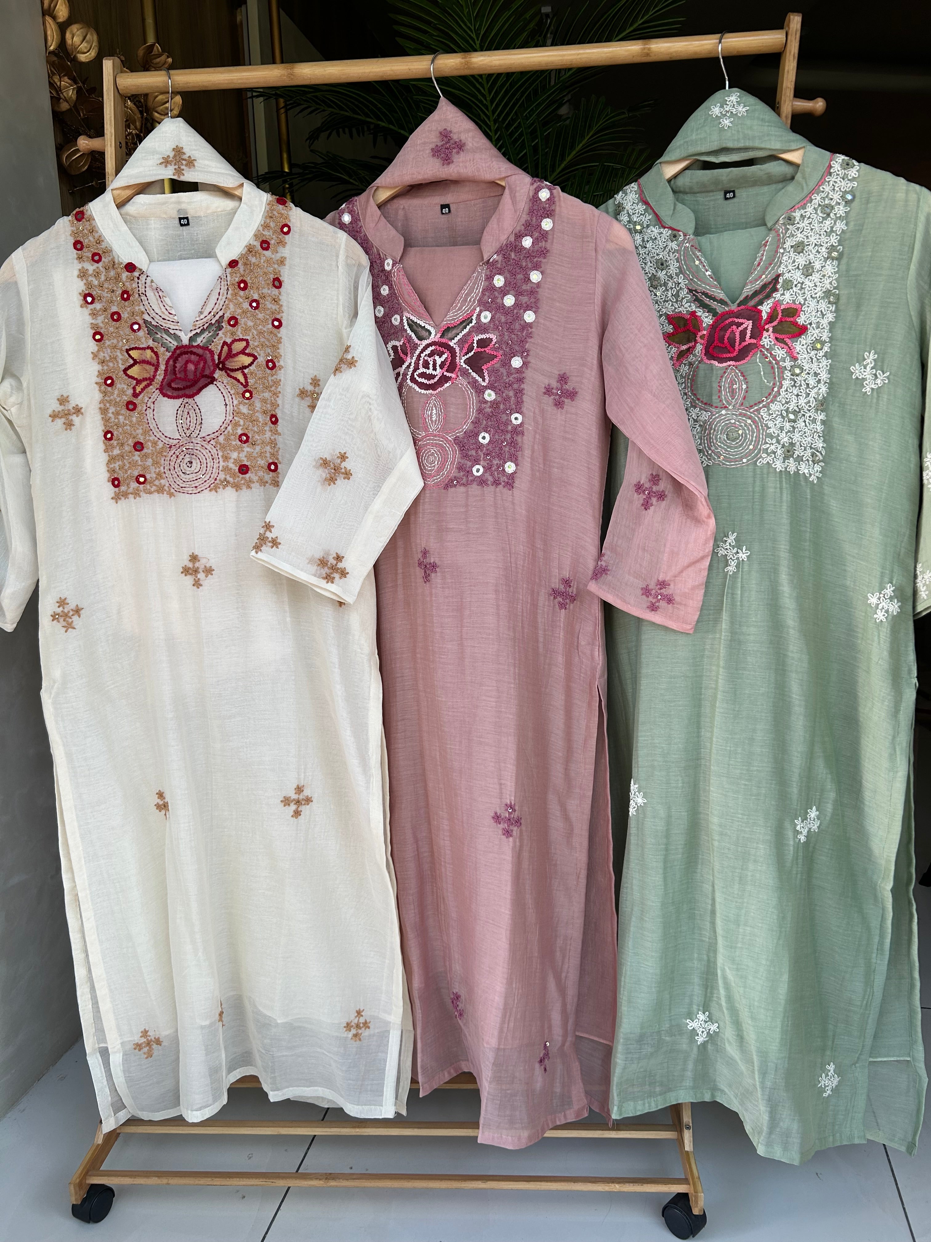 ✅ Premium Mul Chanderi Kurti With Katha handwork Work At The yoke