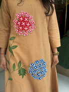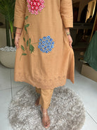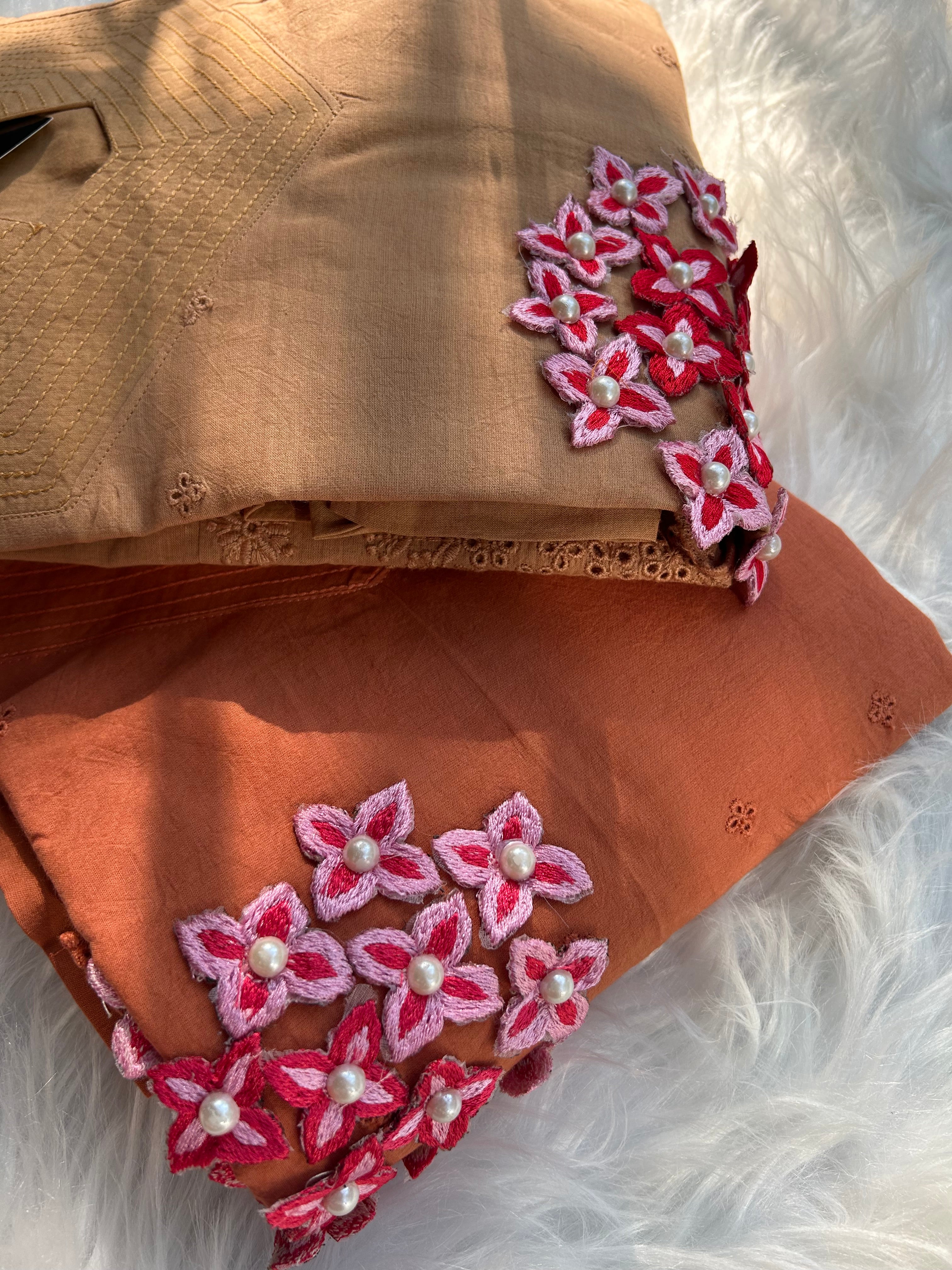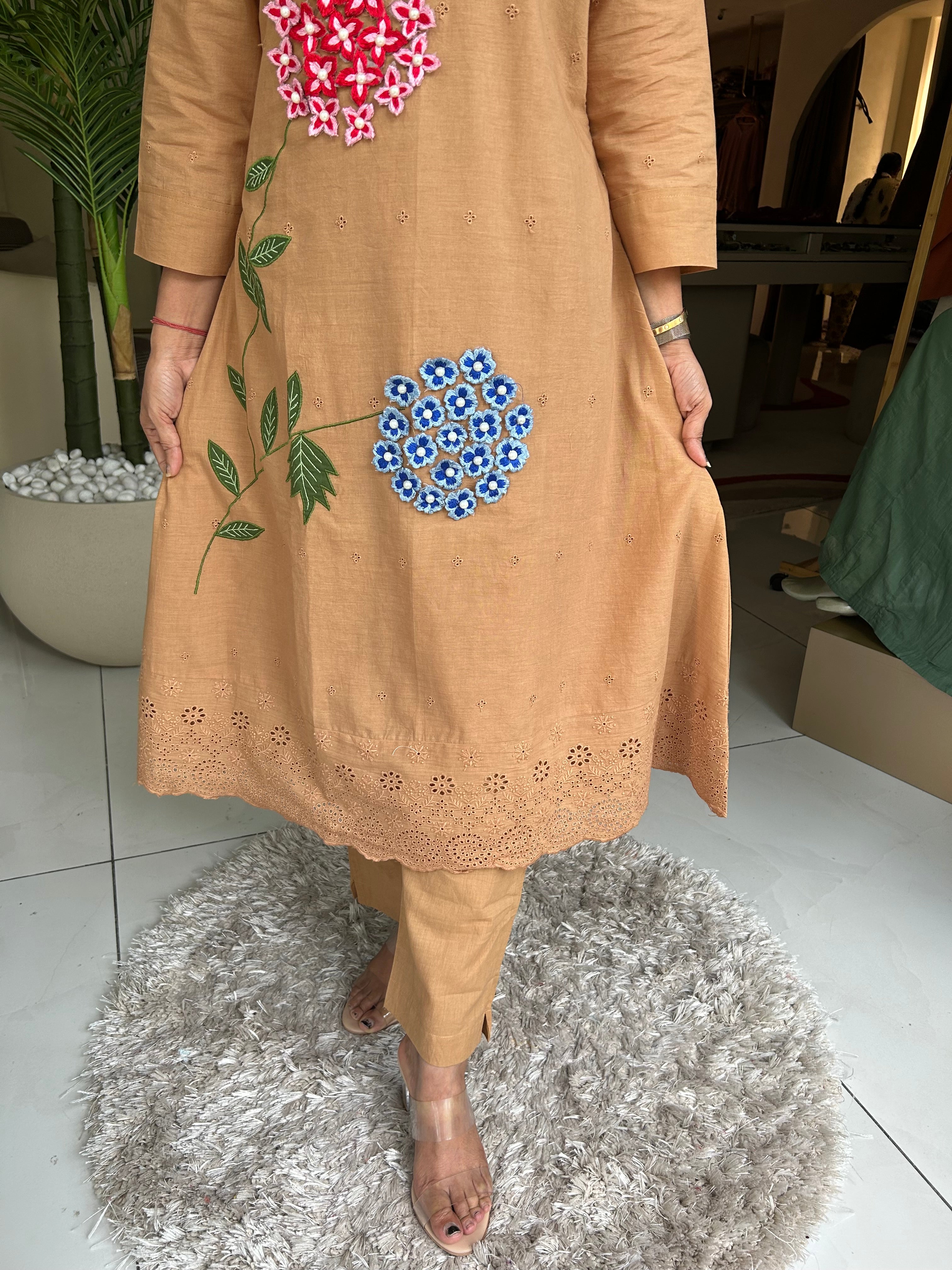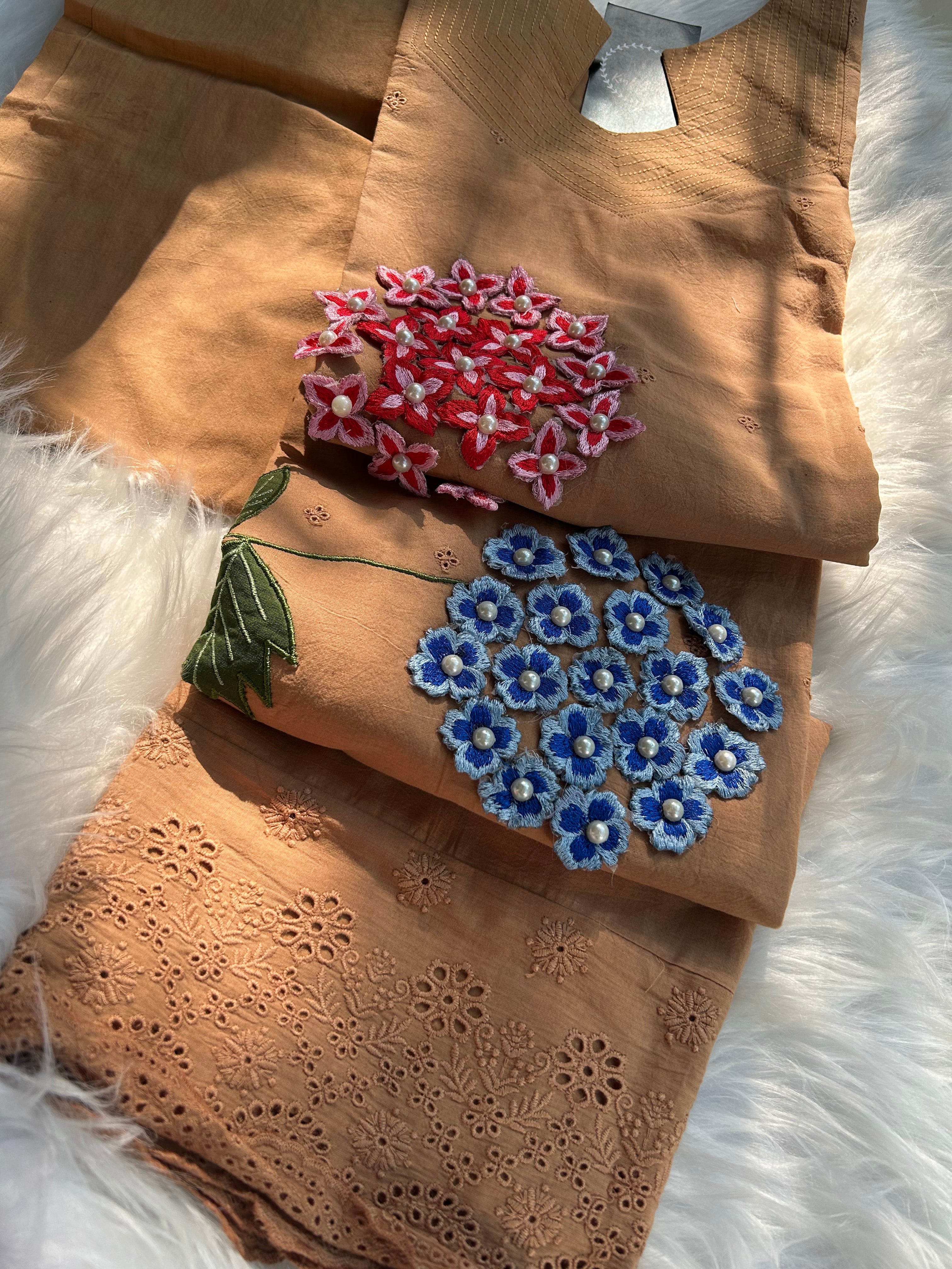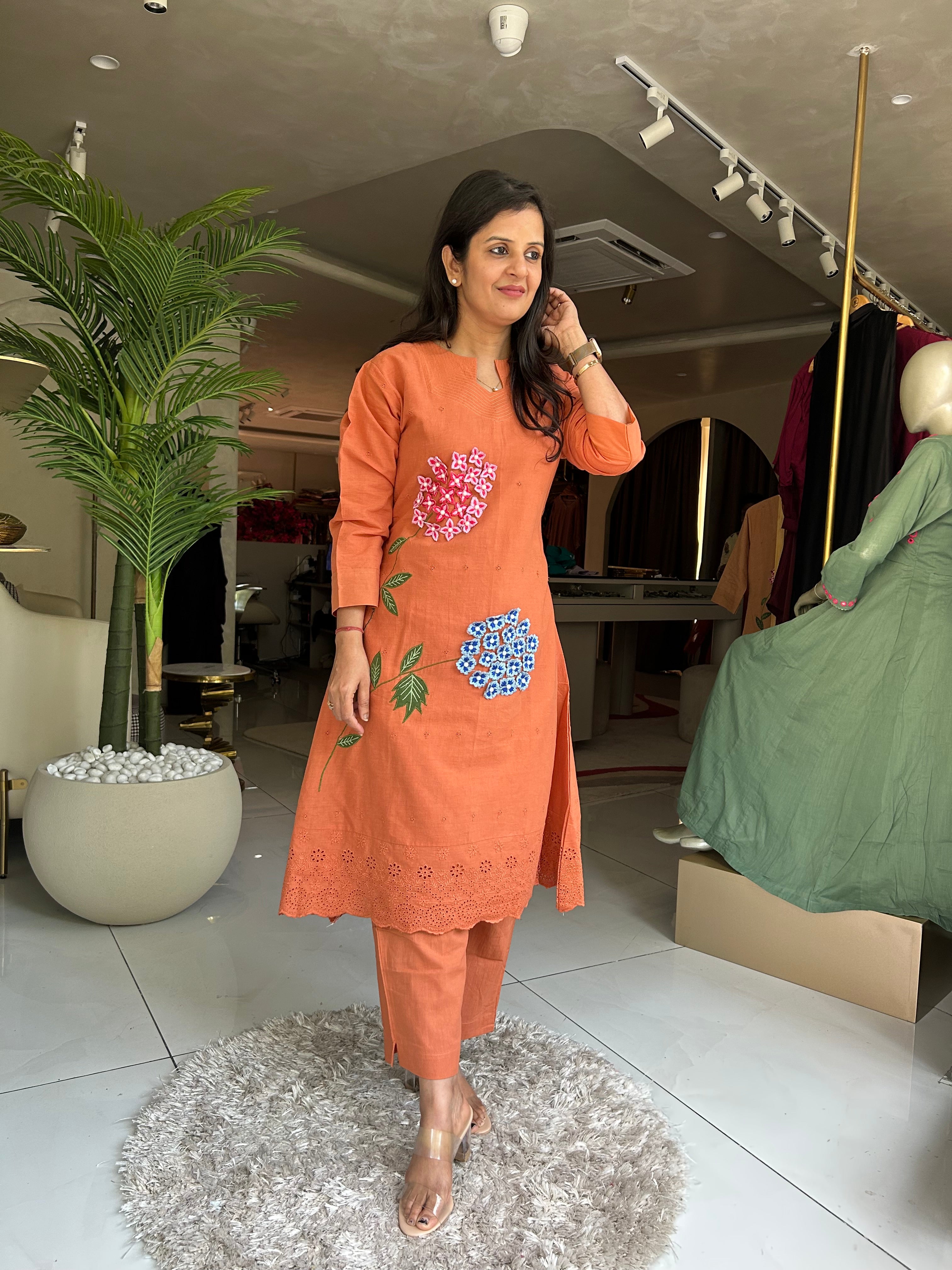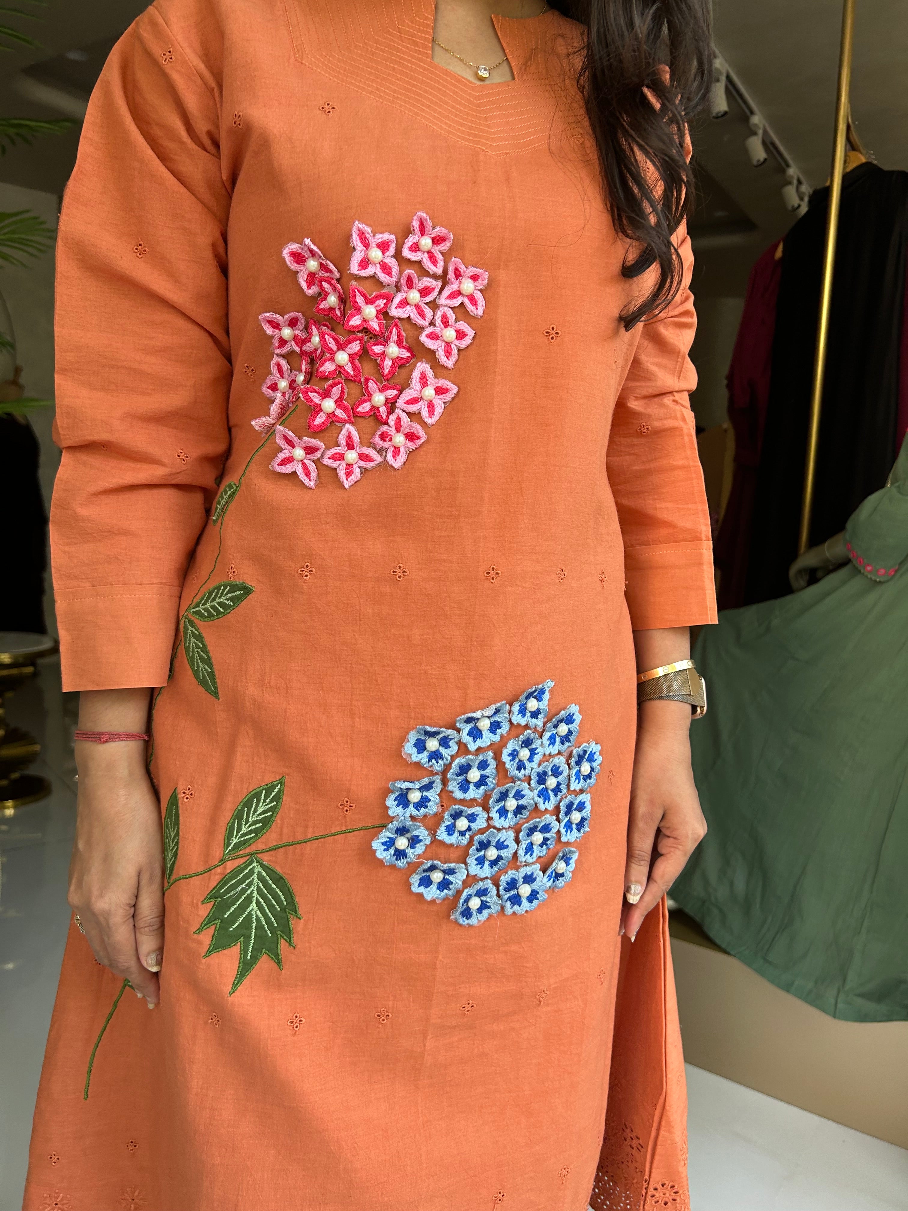 โ Cotton Applique With Stylish Threadwork On The Schiffli Kurta