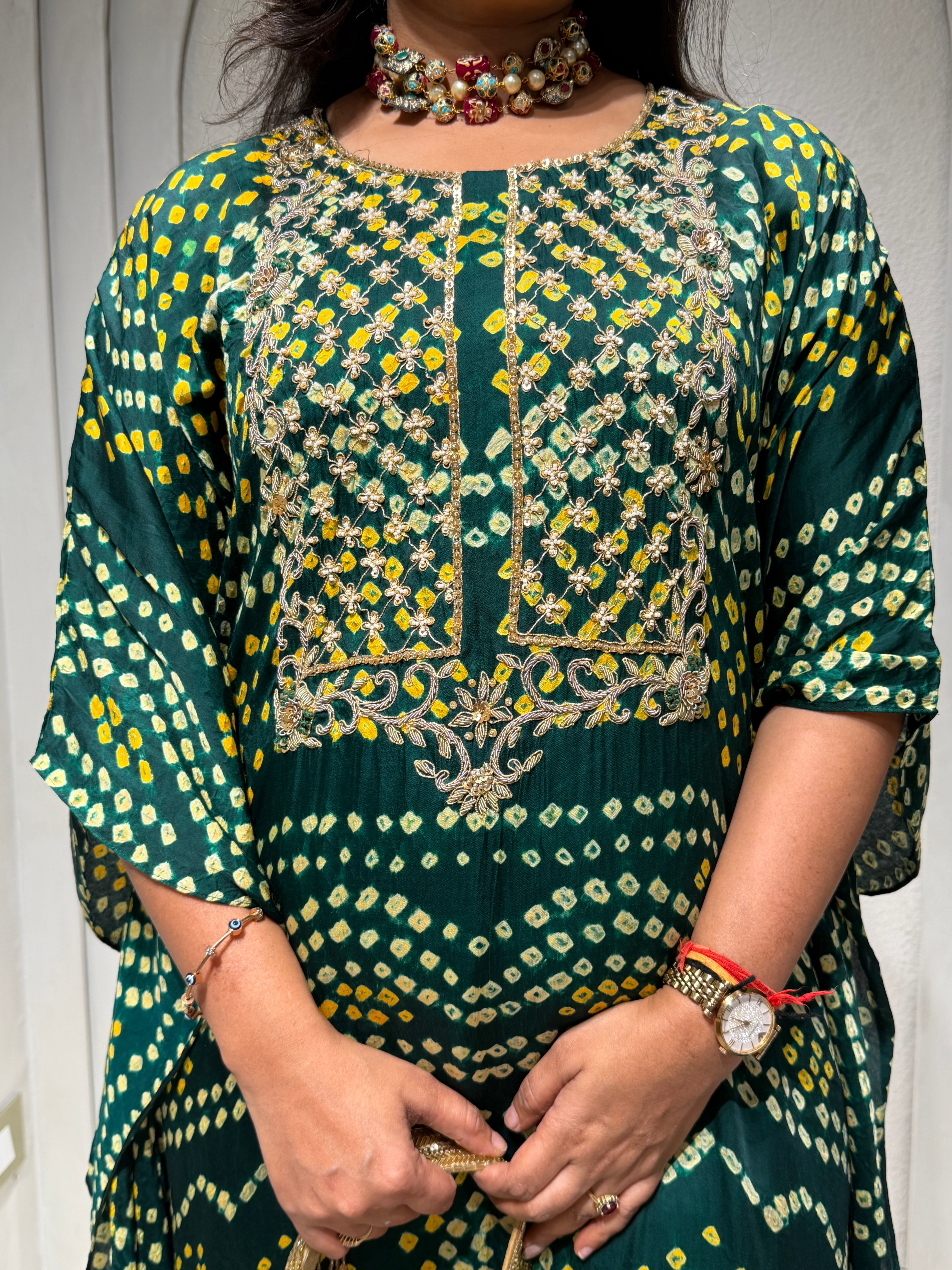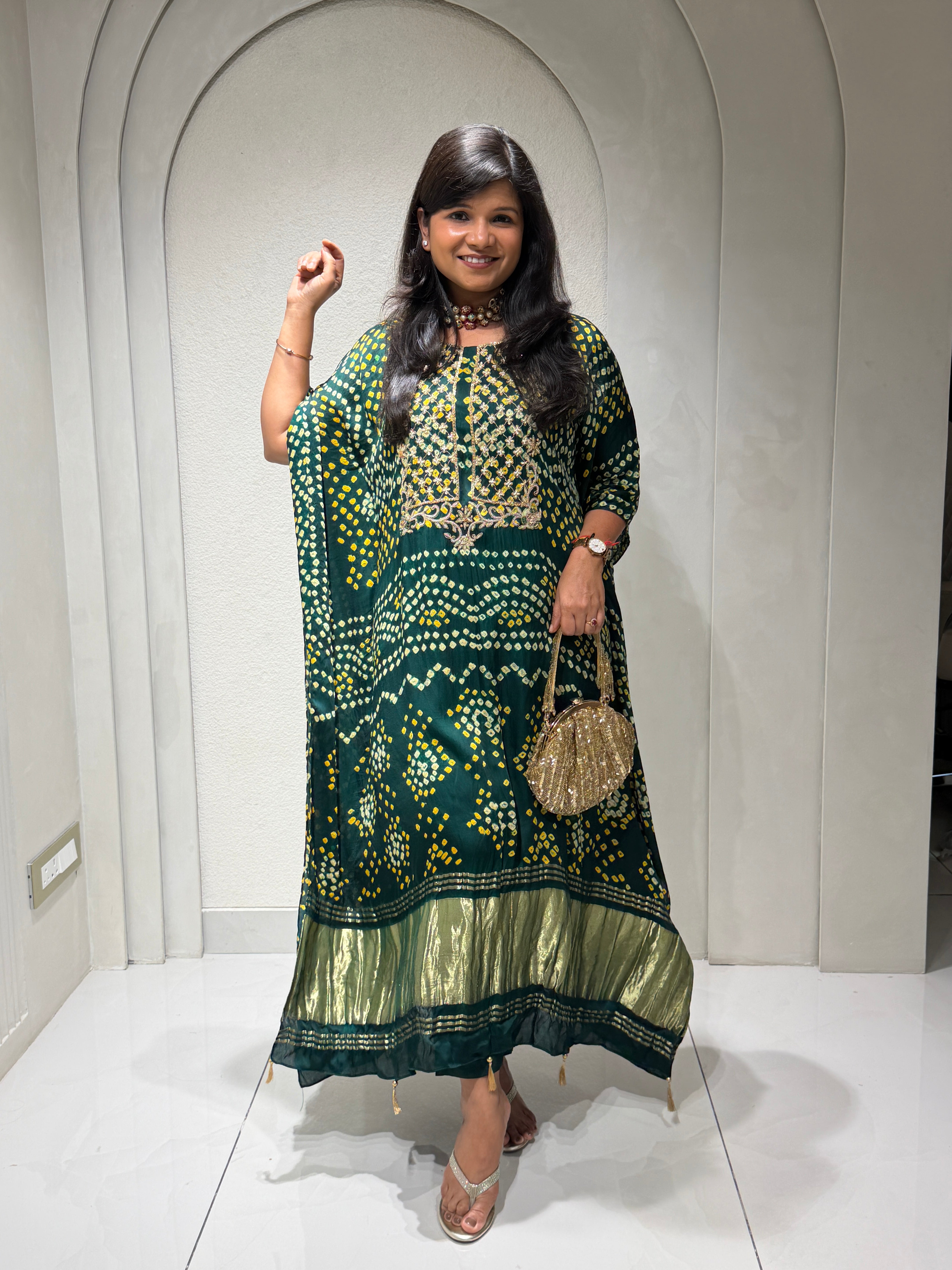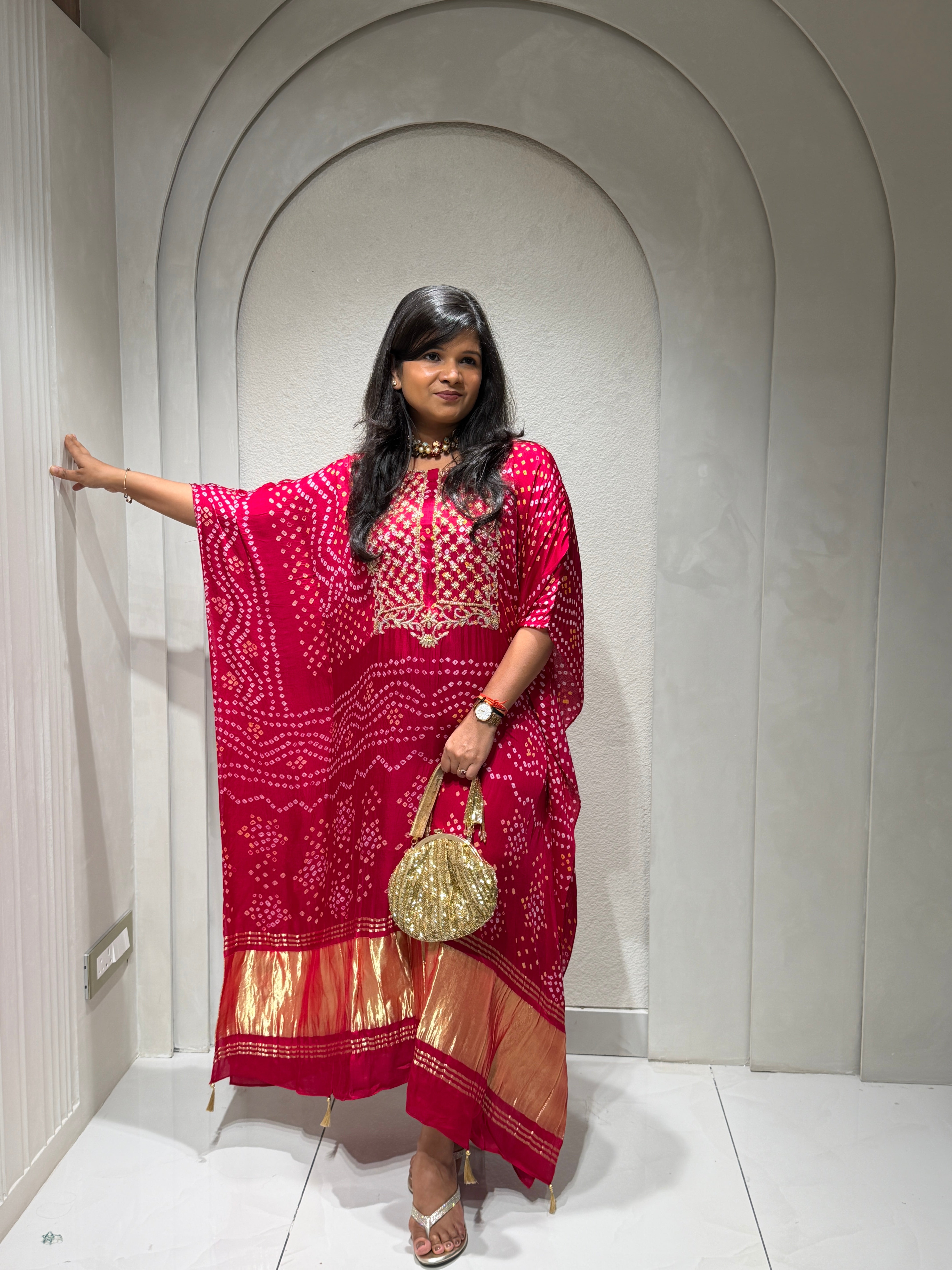 ✅ Gajji Silk Bandhni Print Kaftan With Zardosi Hand embroidery On The Yoke