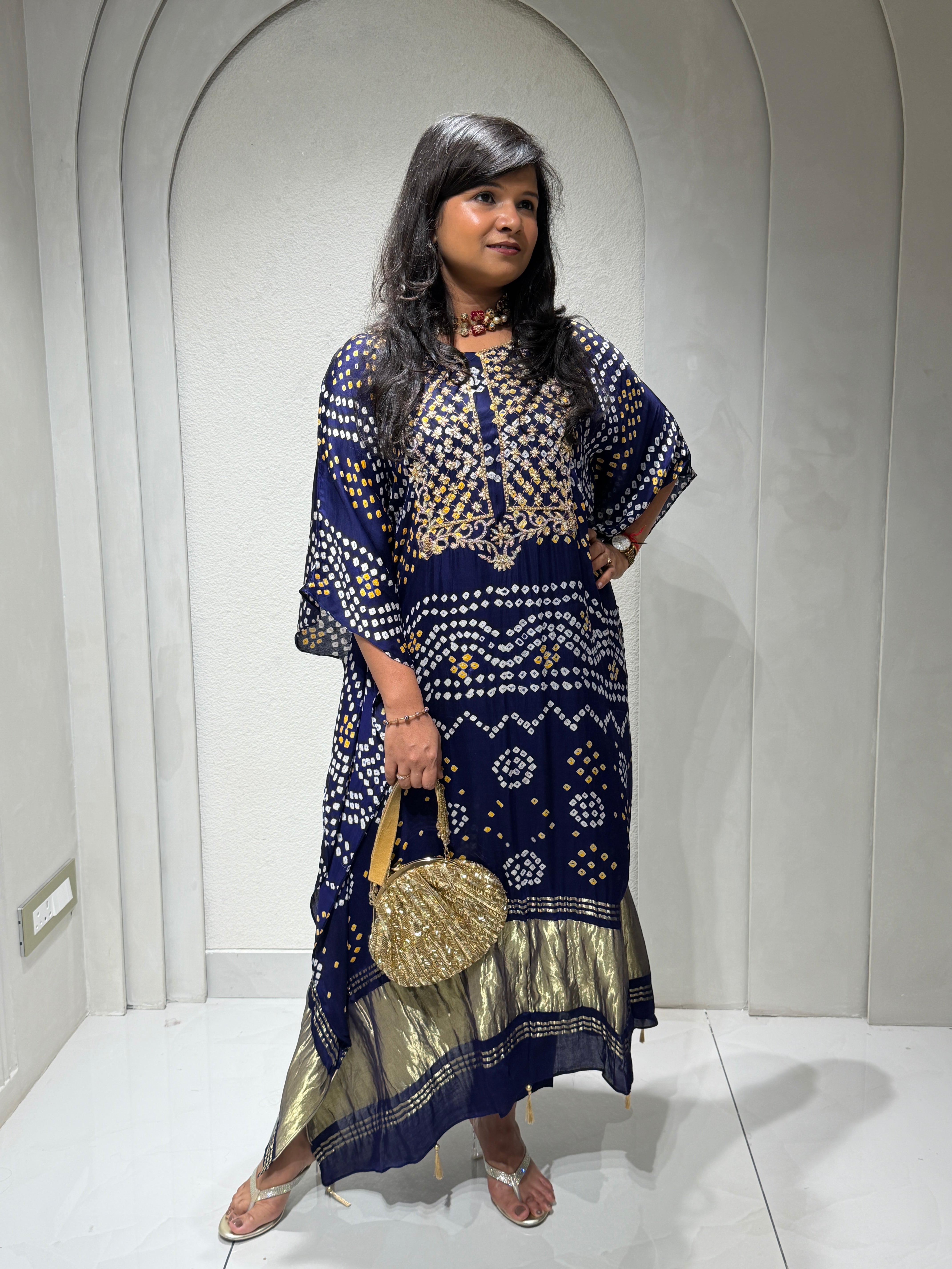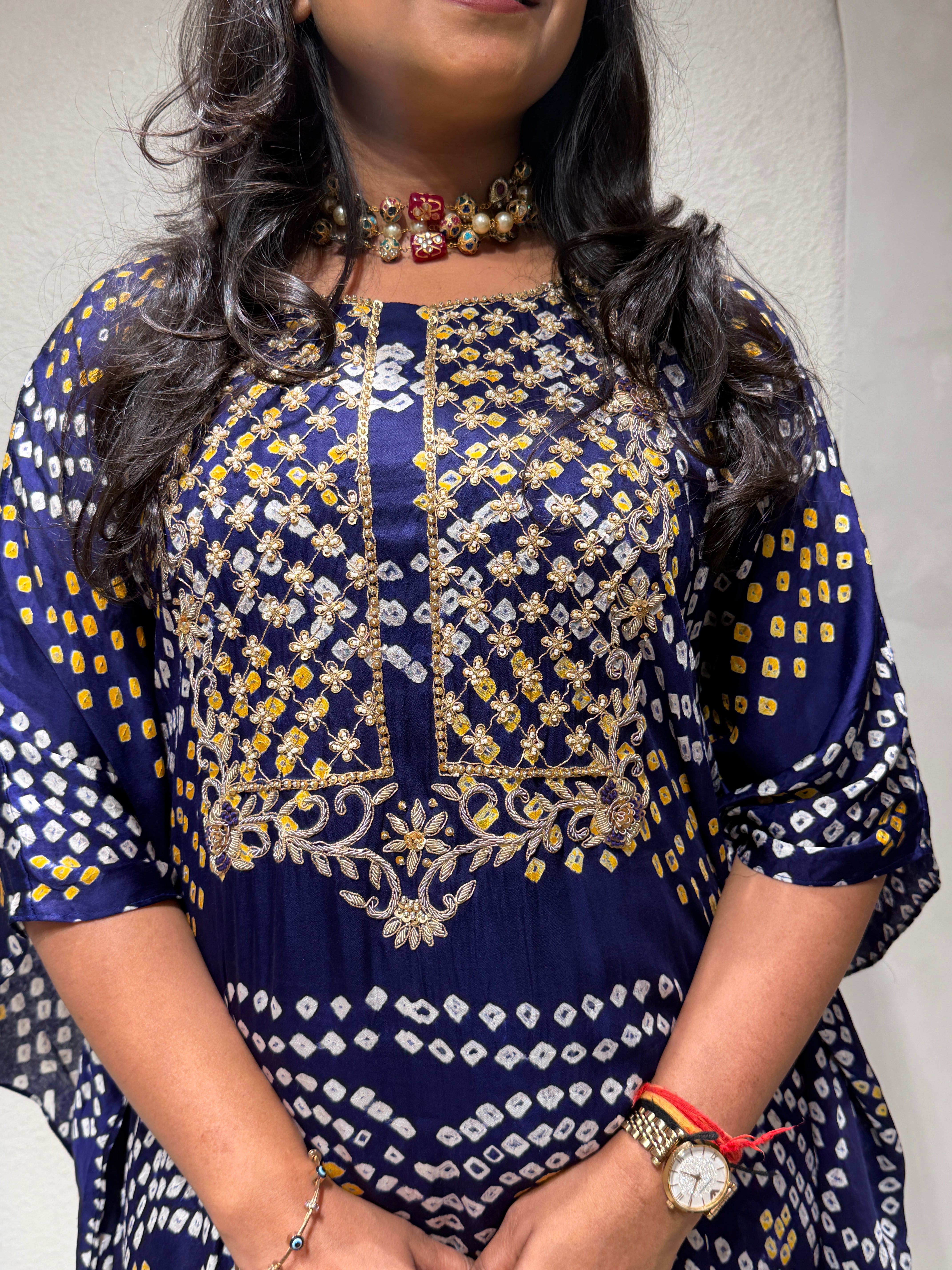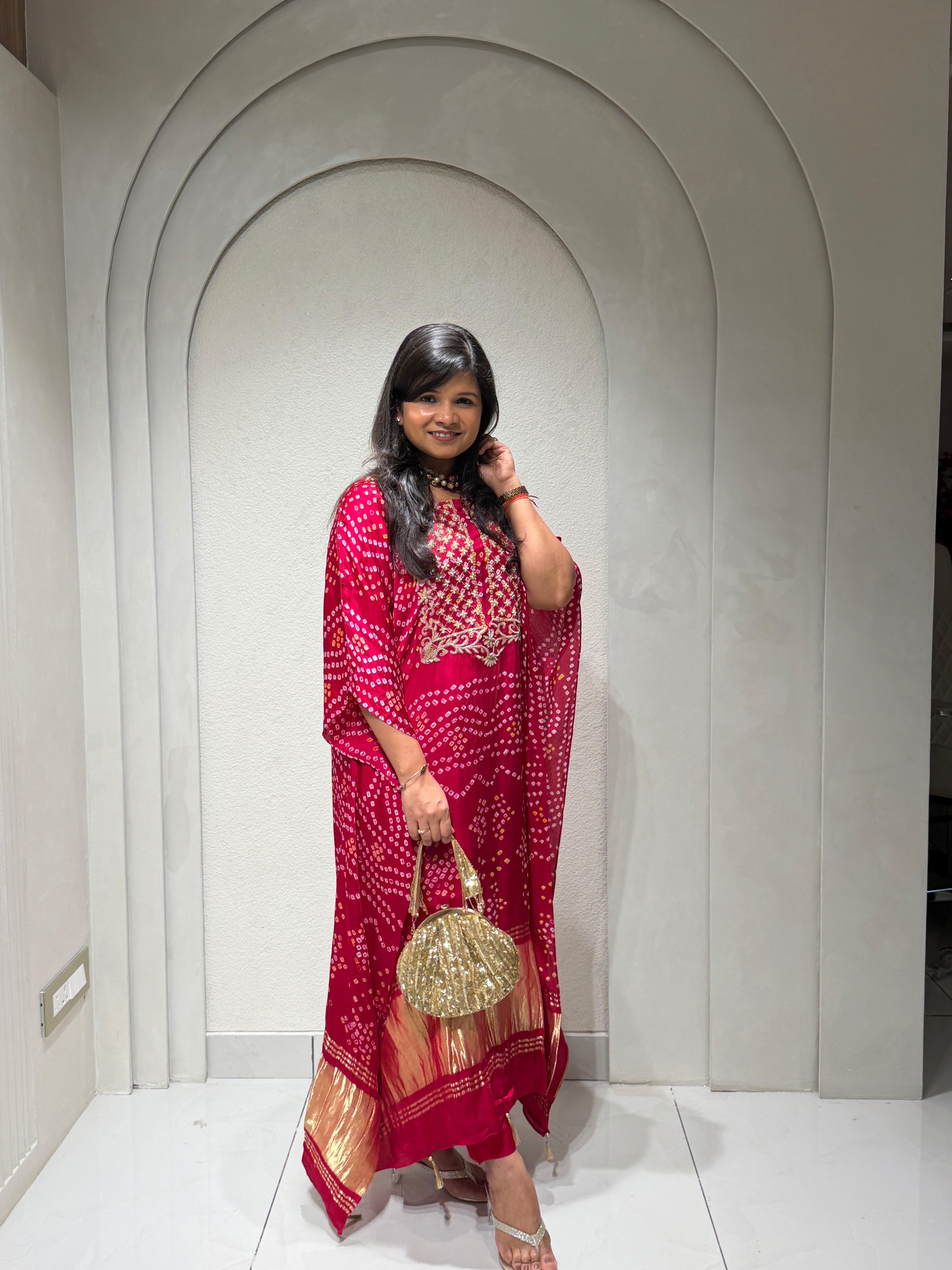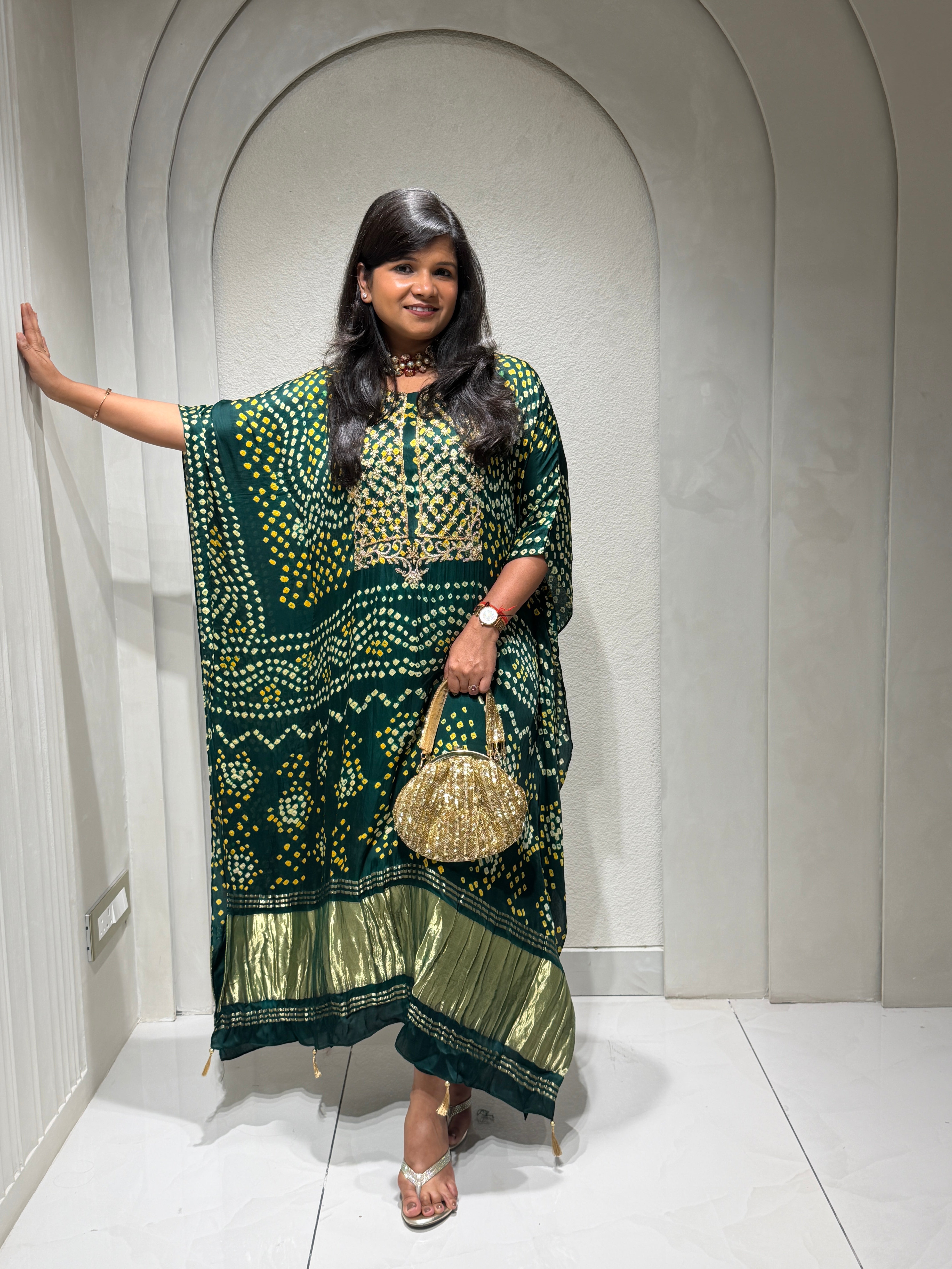 ✅ Gajji Silk Bandhni Print Kaftan With Zardosi Hand embroidery On The Yoke