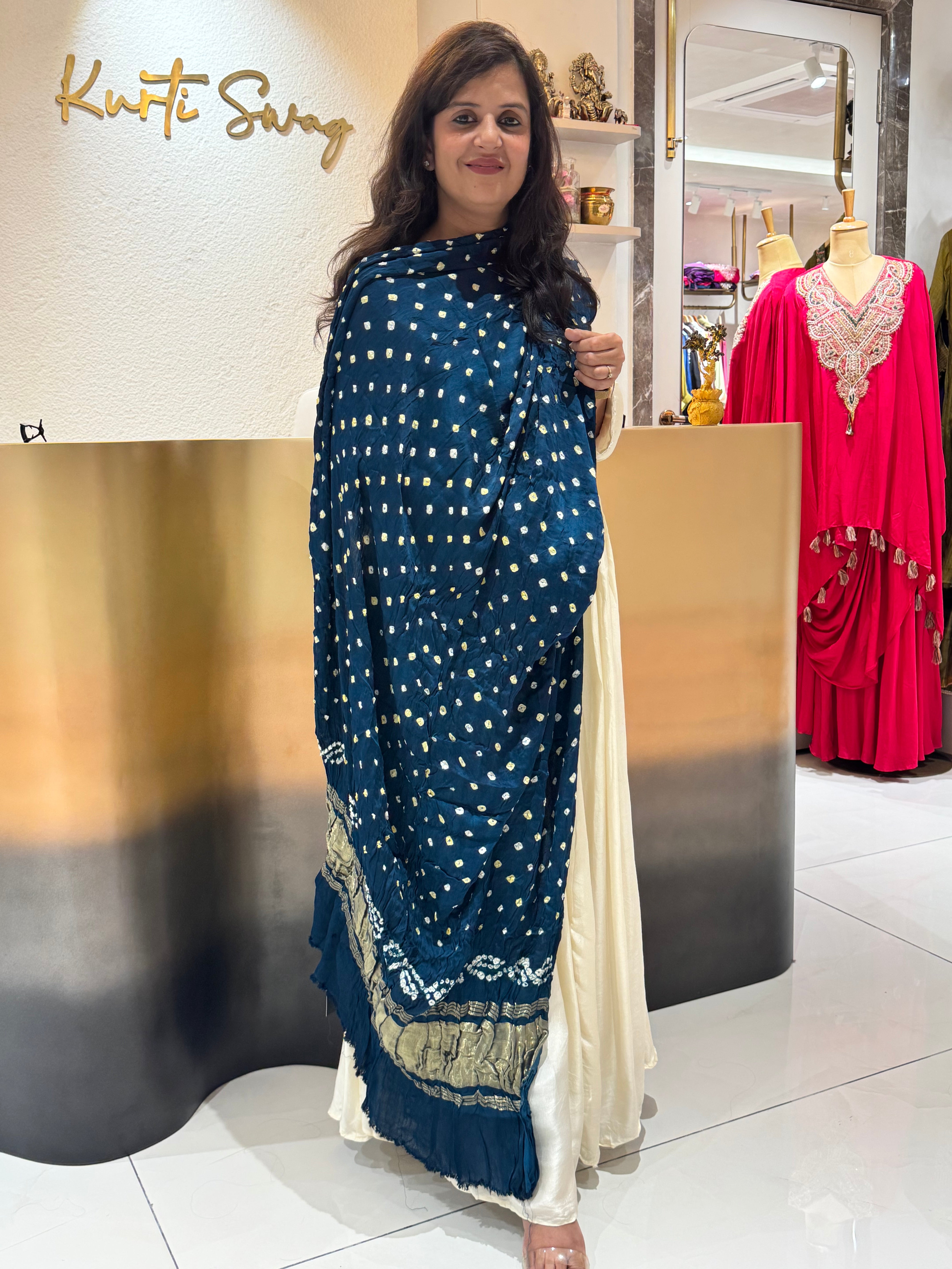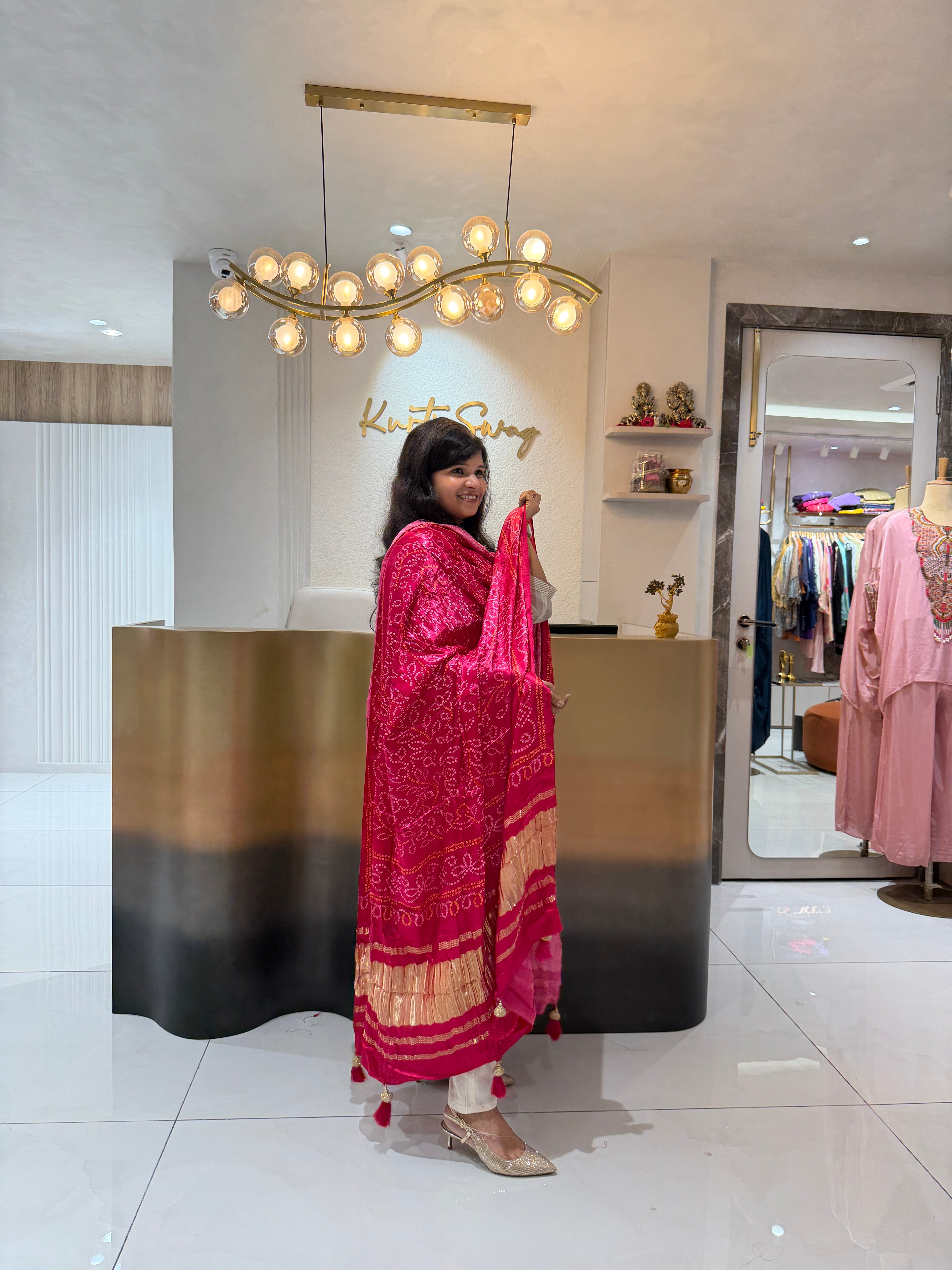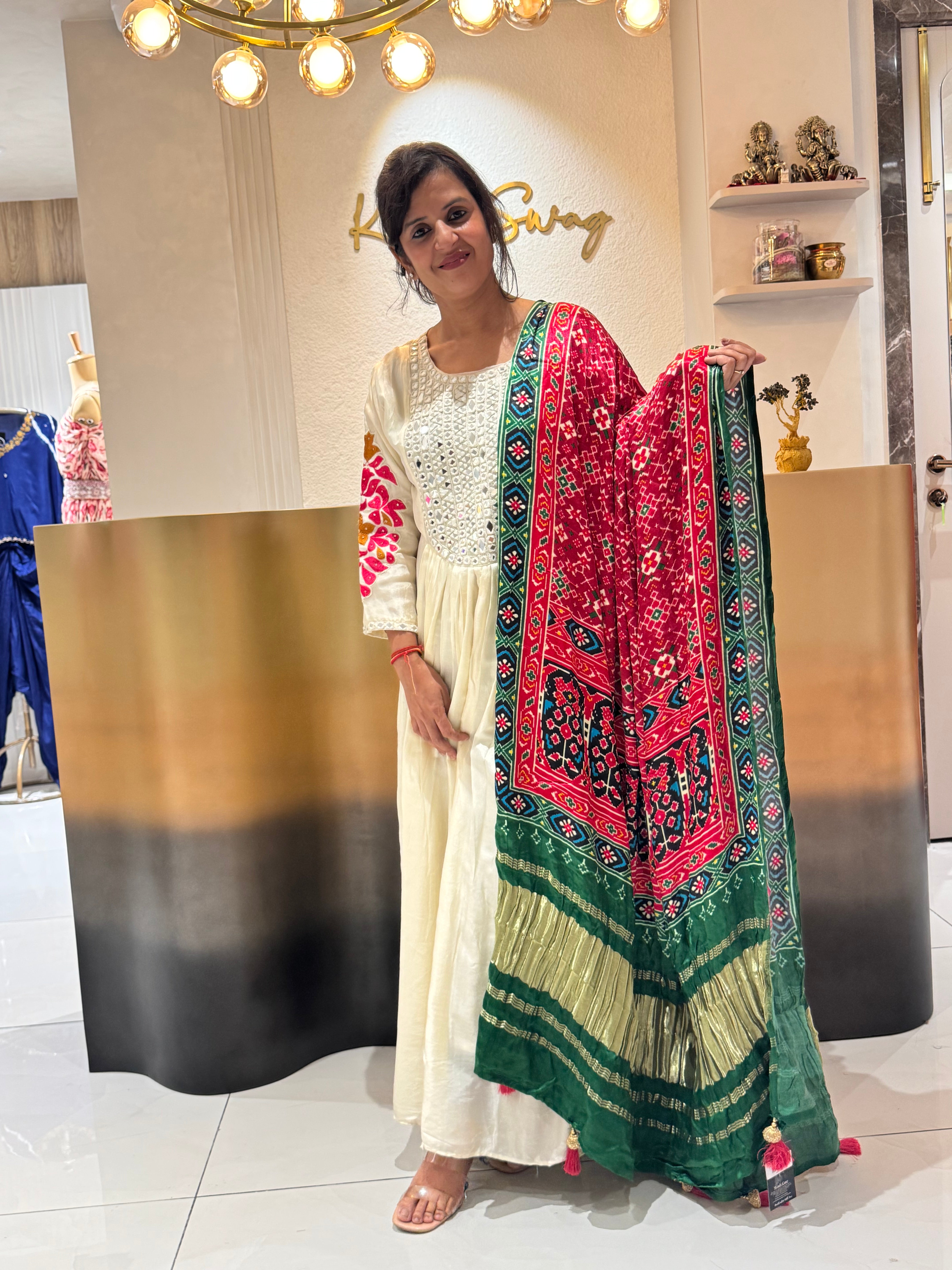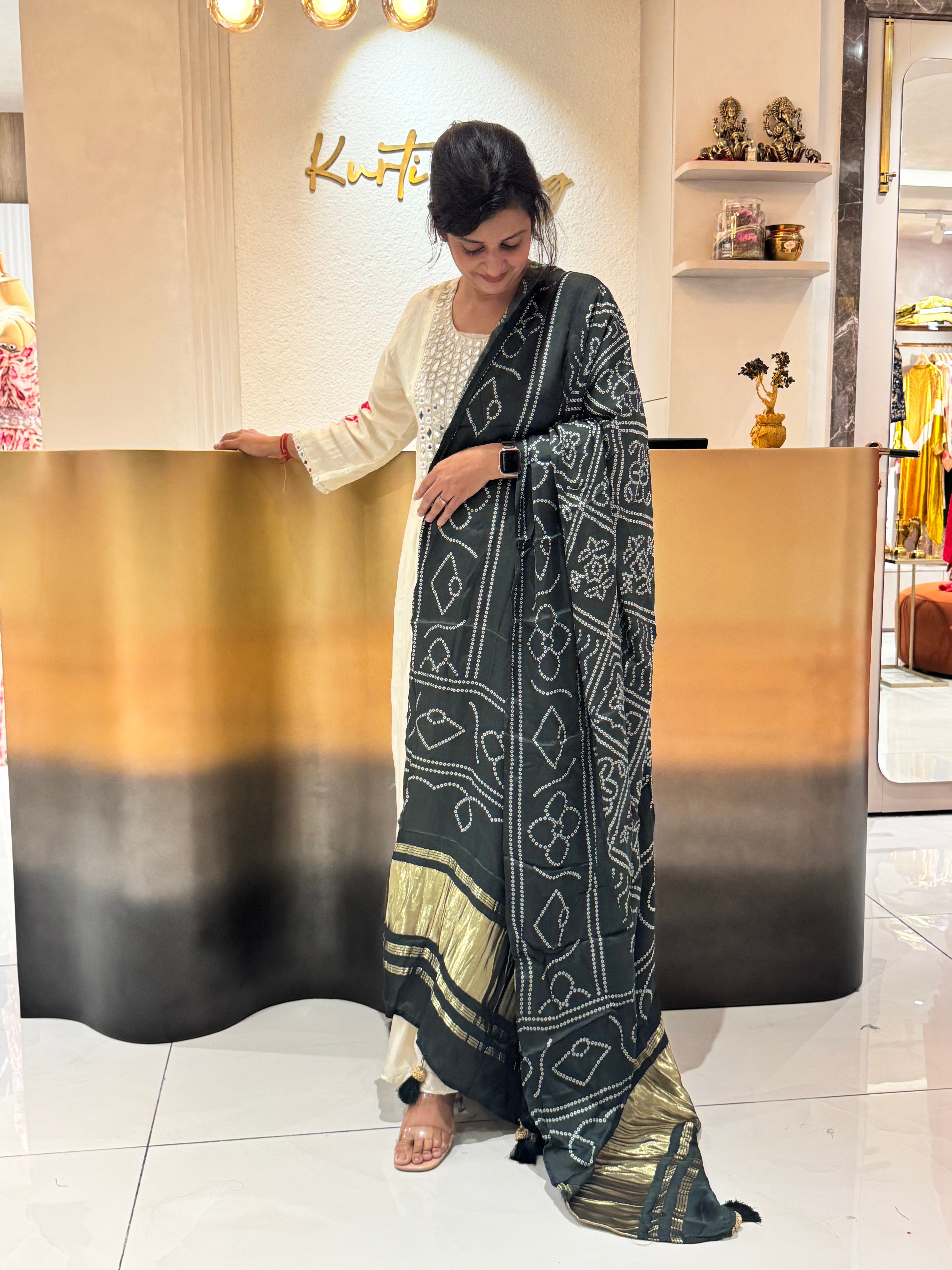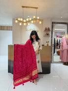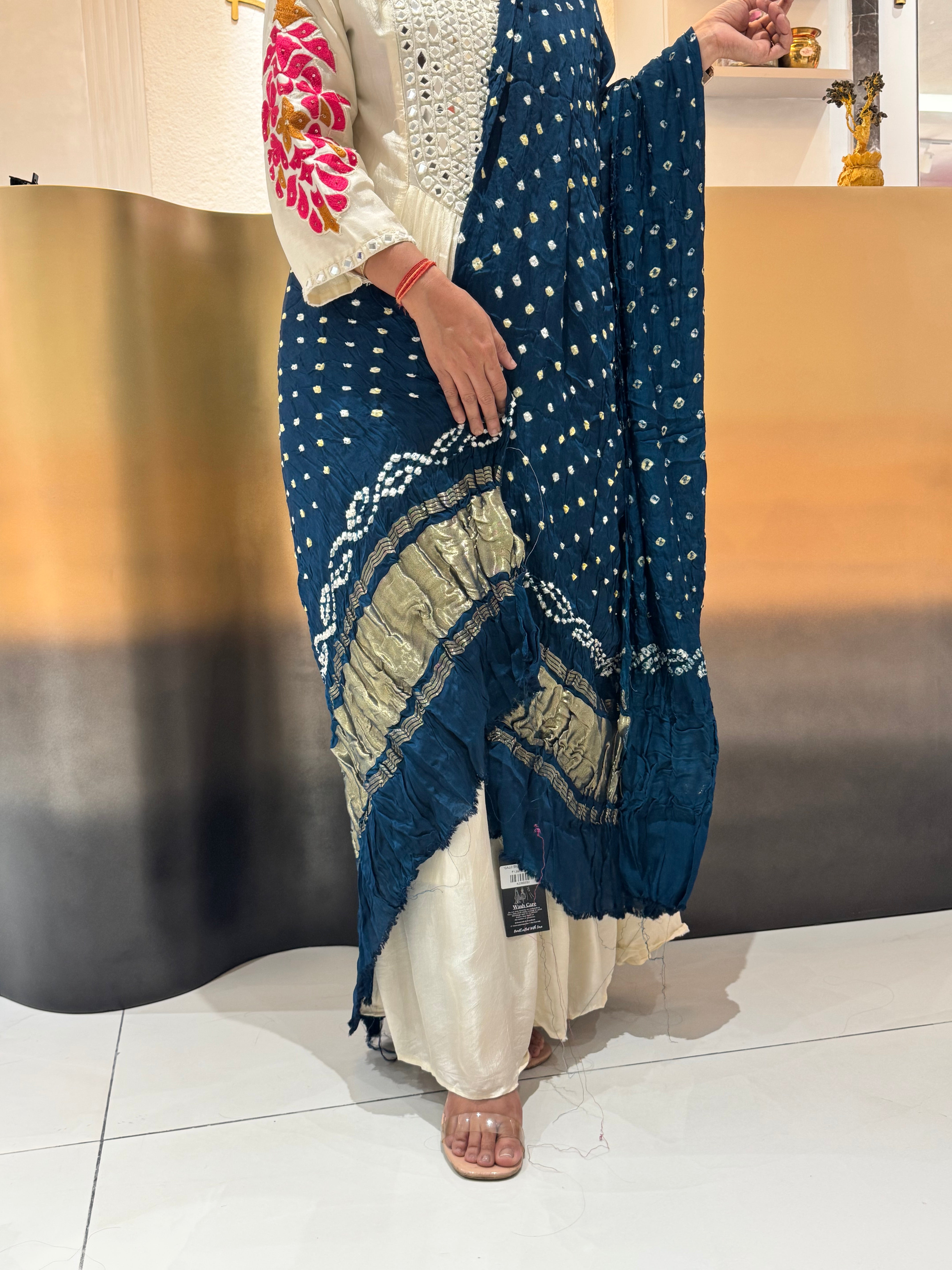 Drape yourself in timeless elegance with our pure Gajji silk dupatta, crafted with a luxurious sheen and buttery soft texture. The fabric flows effortlessly, adding a regal charm to any outfit.