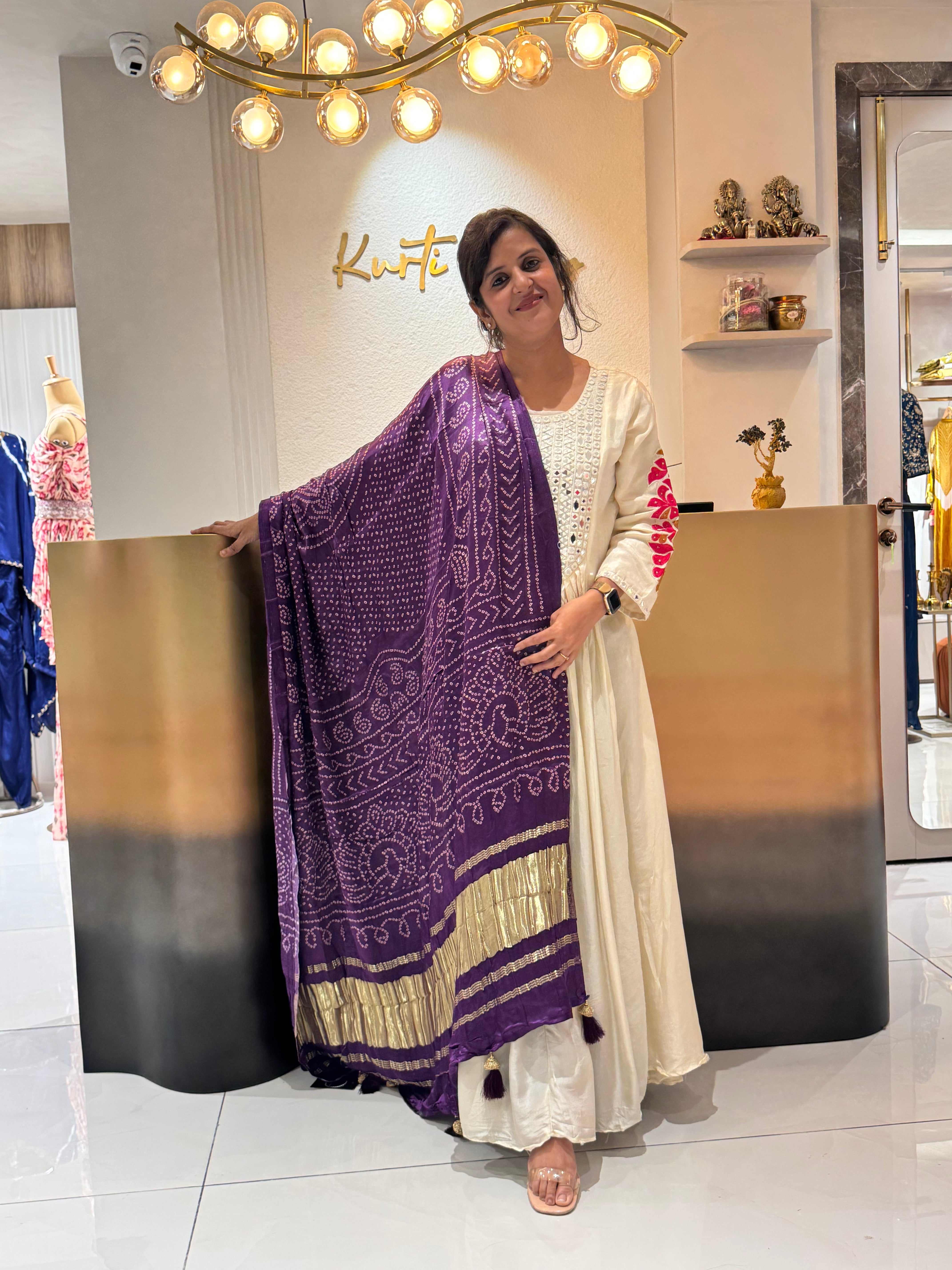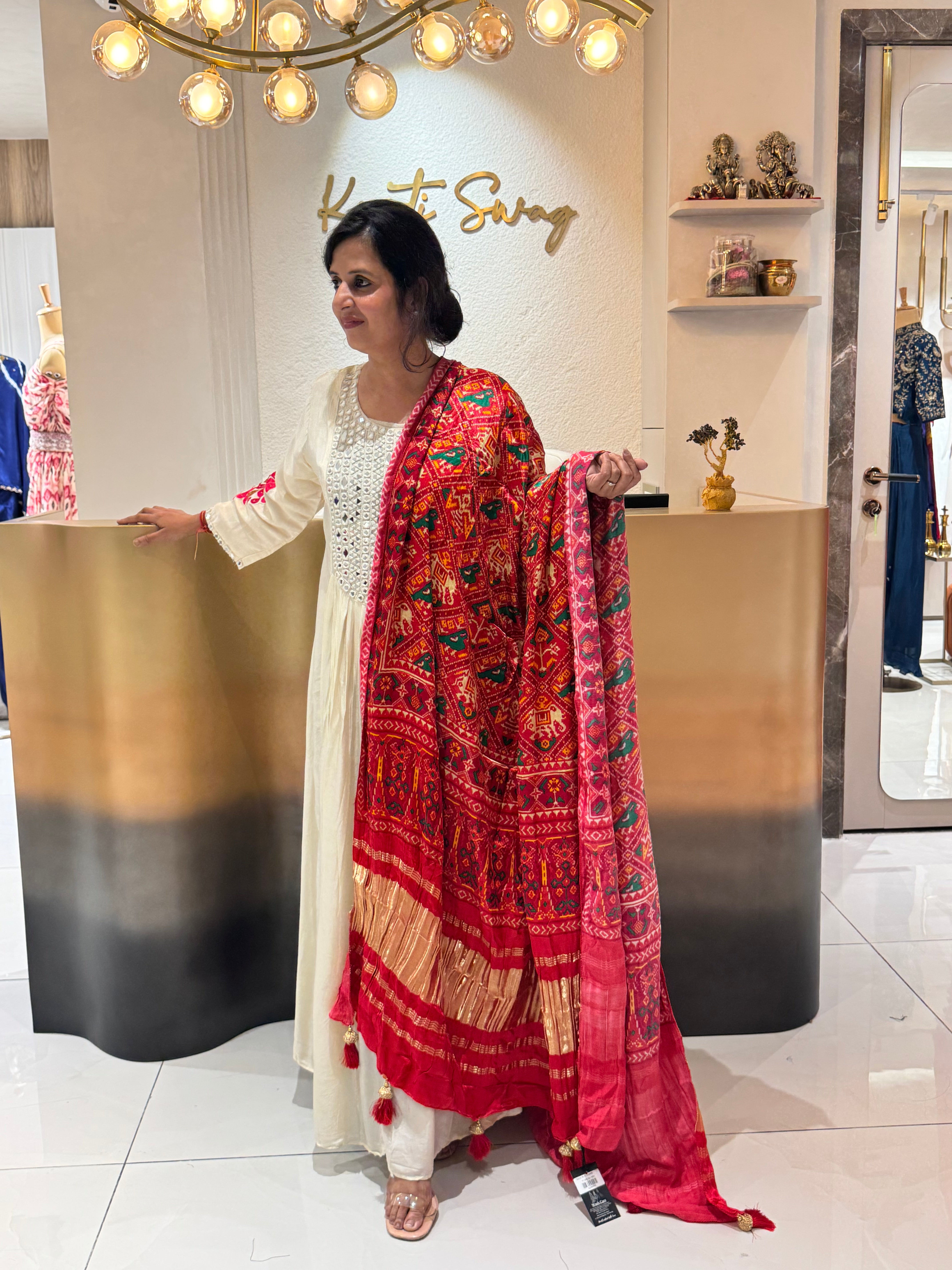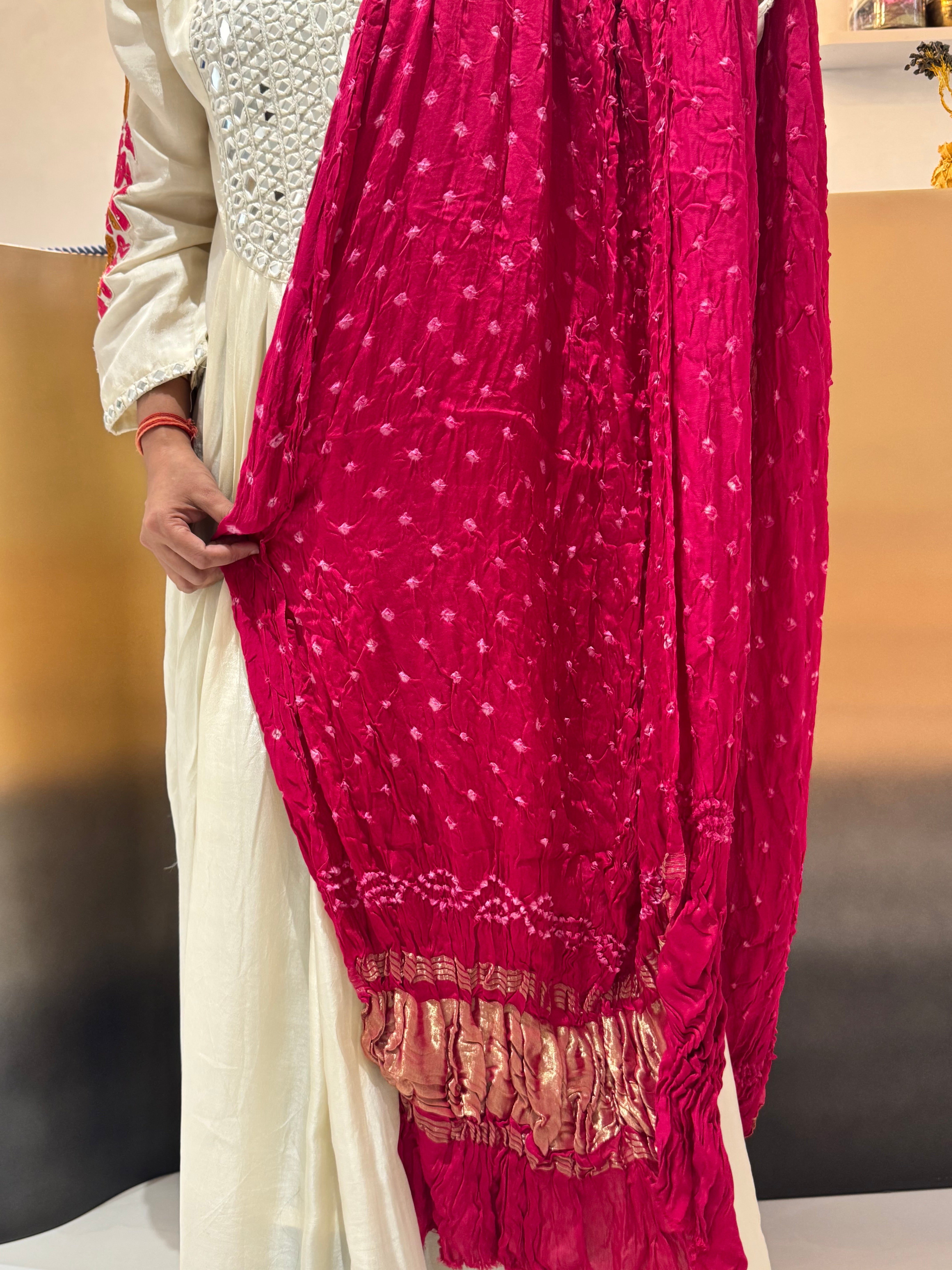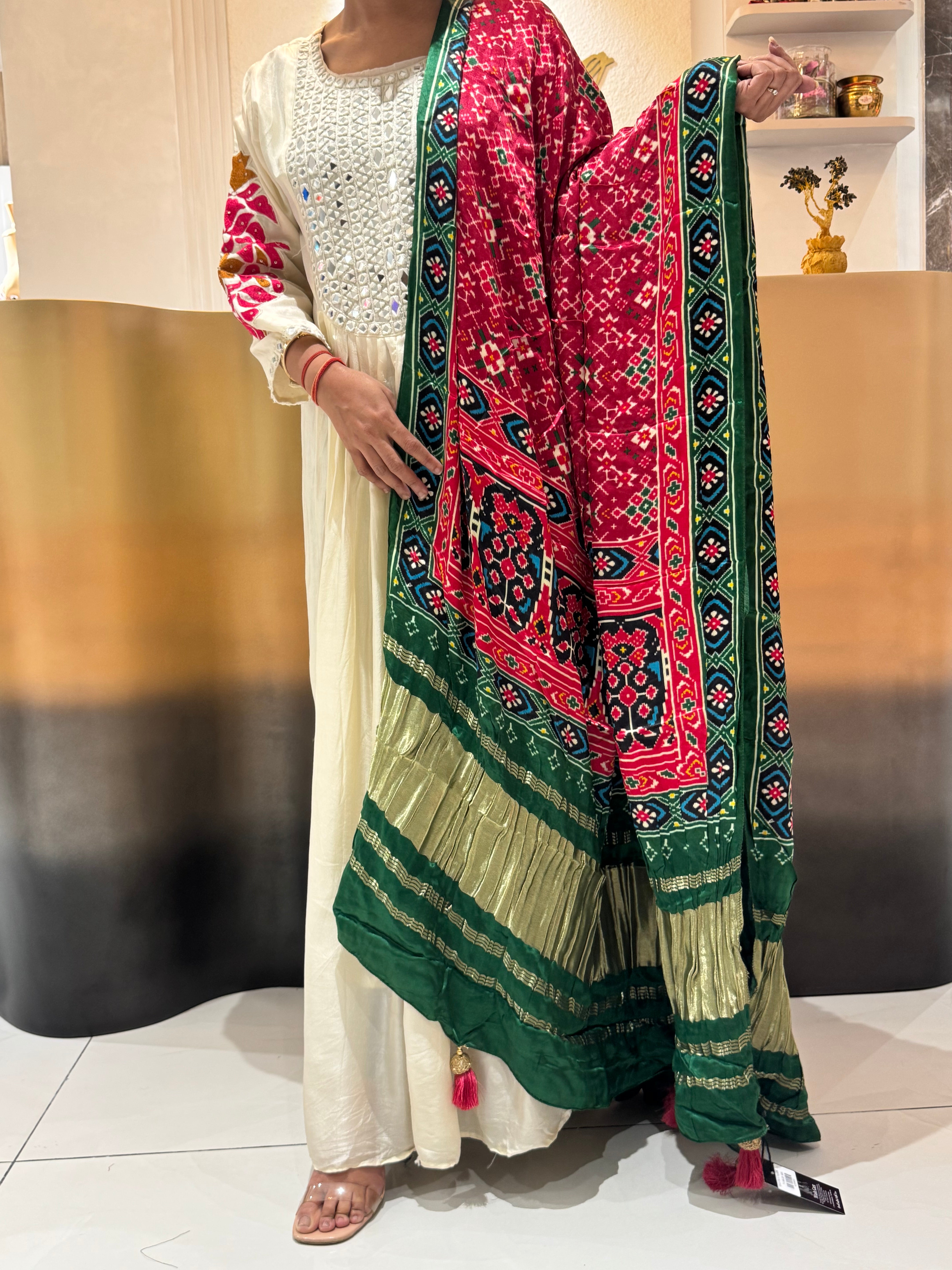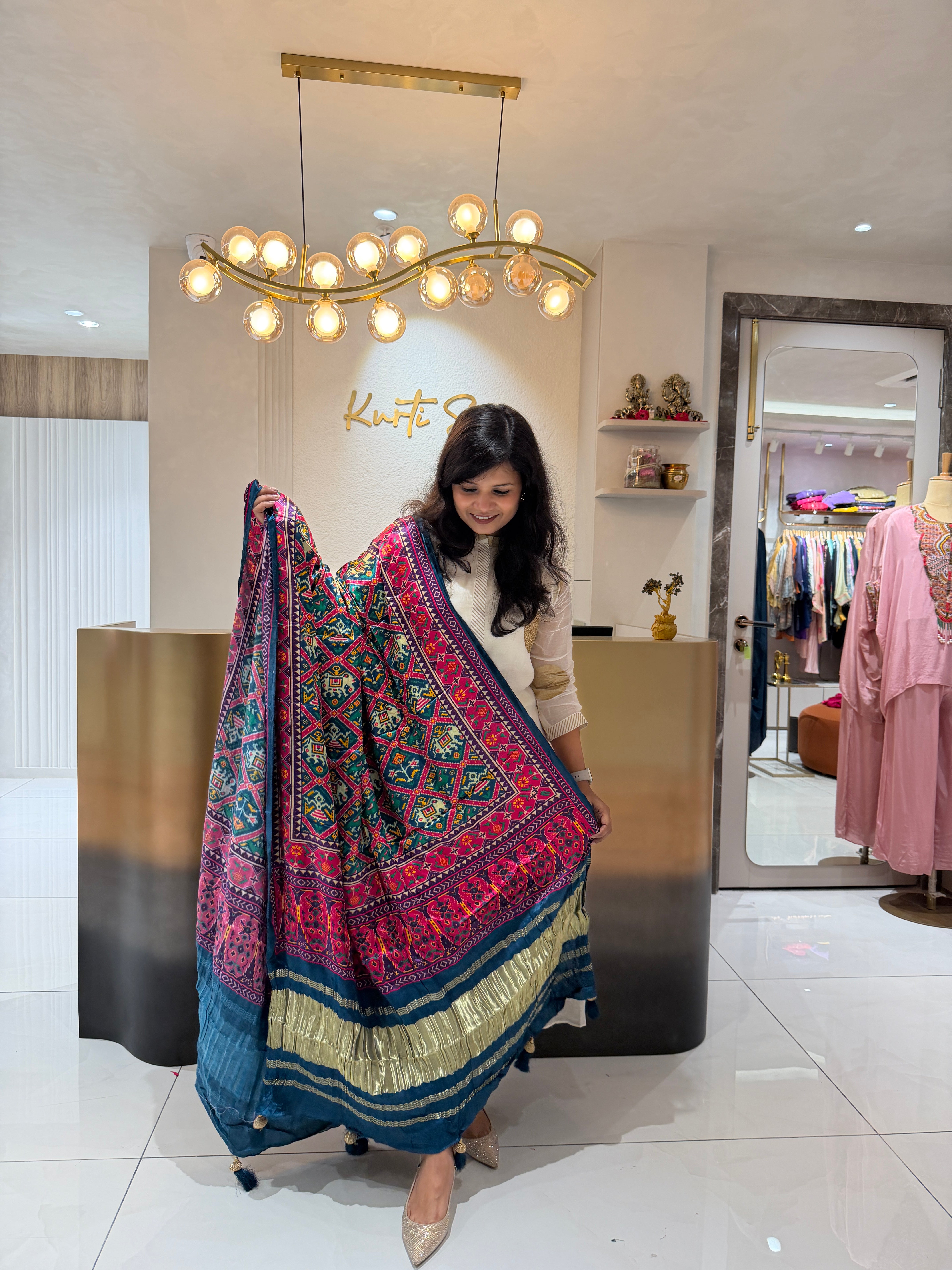 Drape yourself in timeless elegance with our pure Gajji silk dupatta, crafted with a luxurious sheen and buttery soft texture. The fabric flows effortlessly, adding a regal charm to any outfit.