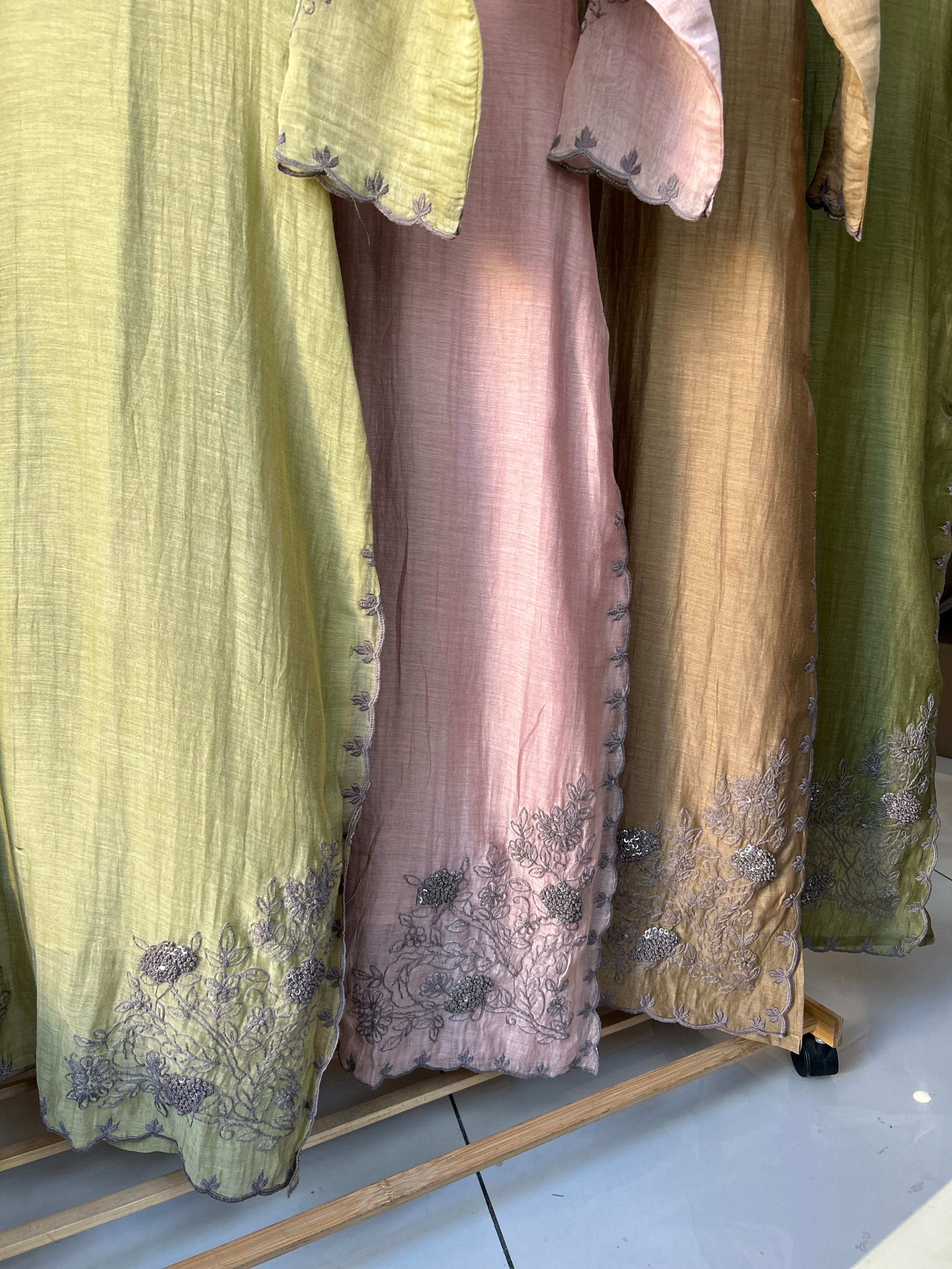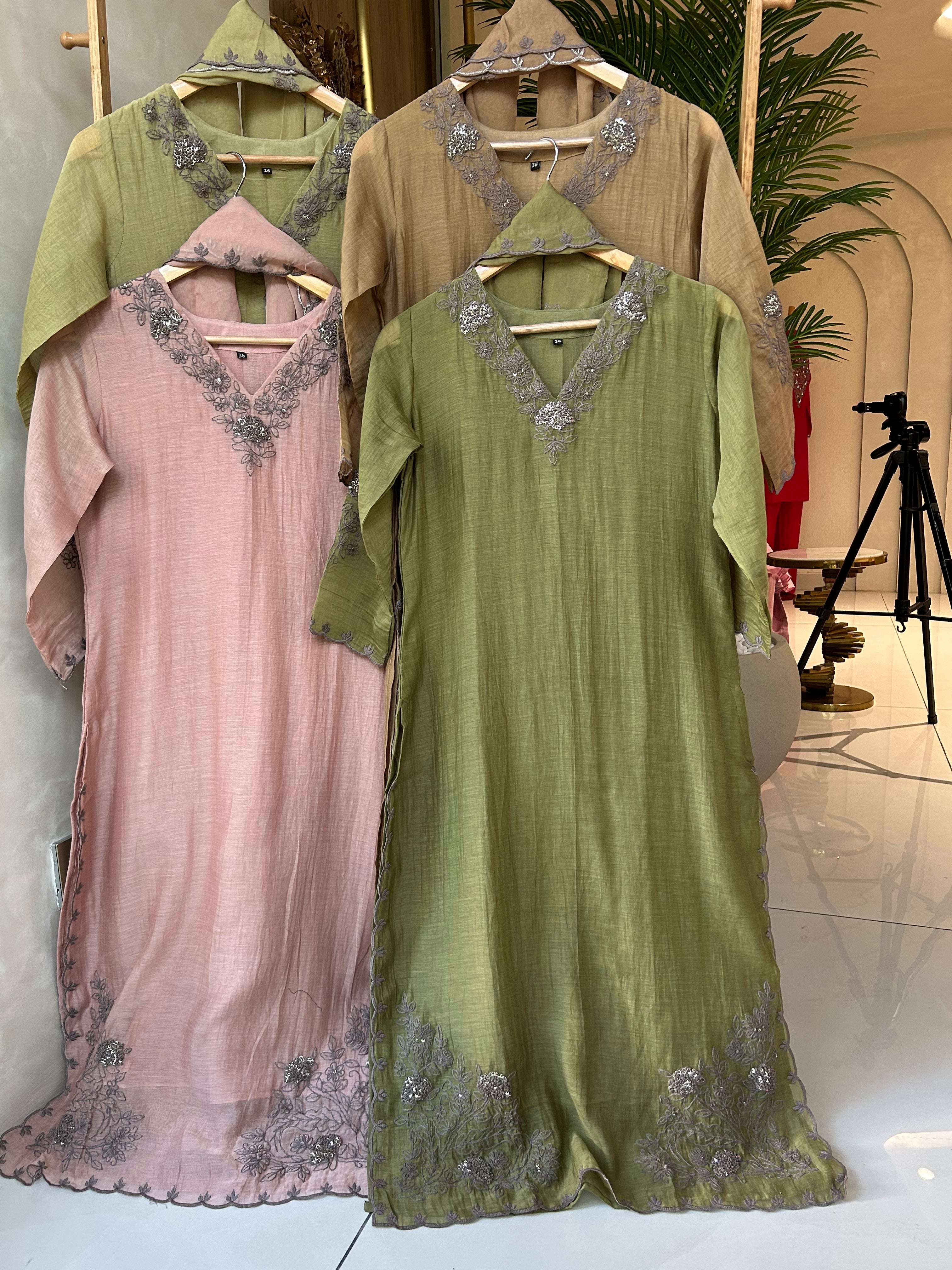 ✅ Premium Mul Chanderi Kurti With Antique Work On The Neckline Of The Kurti