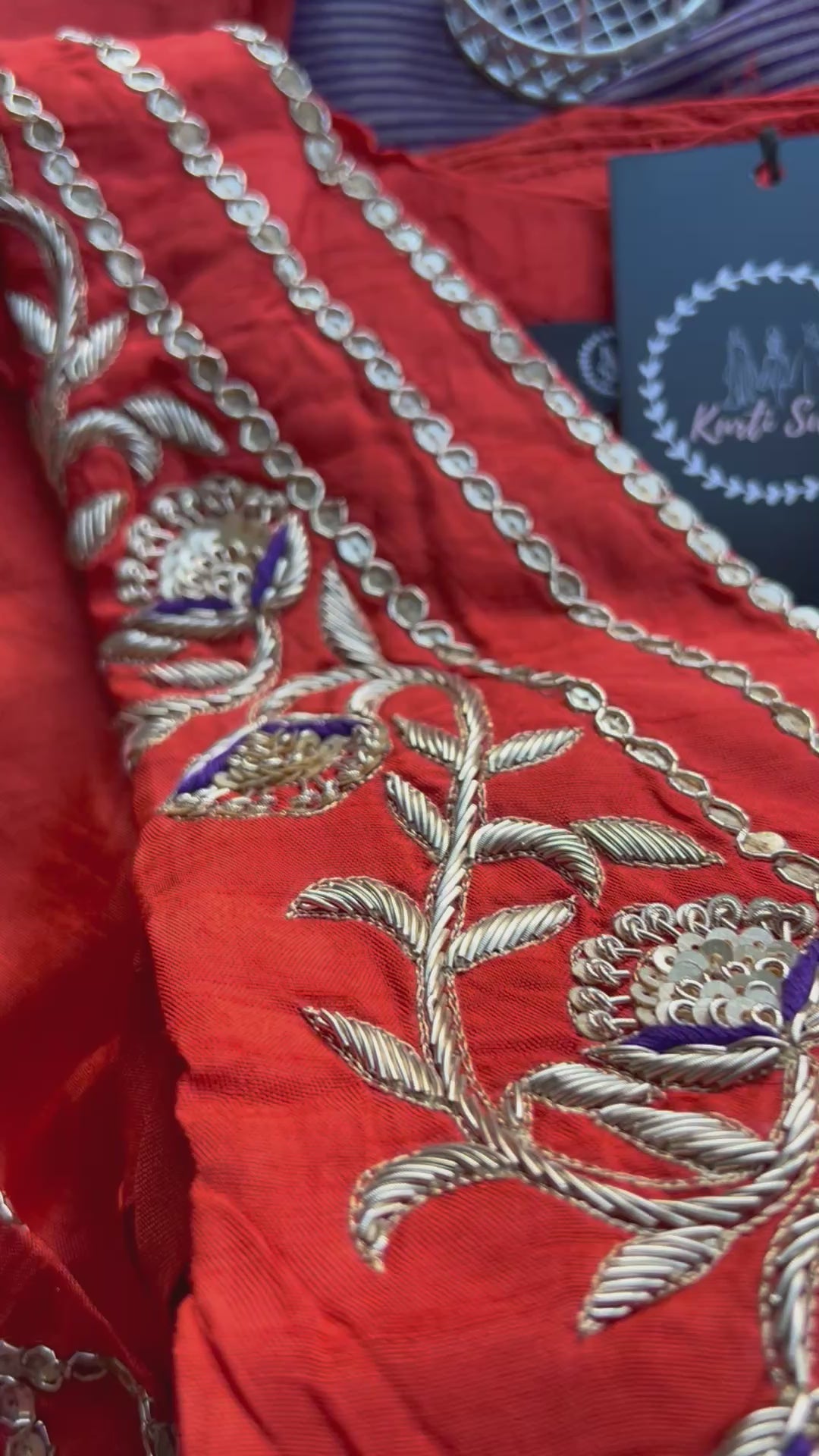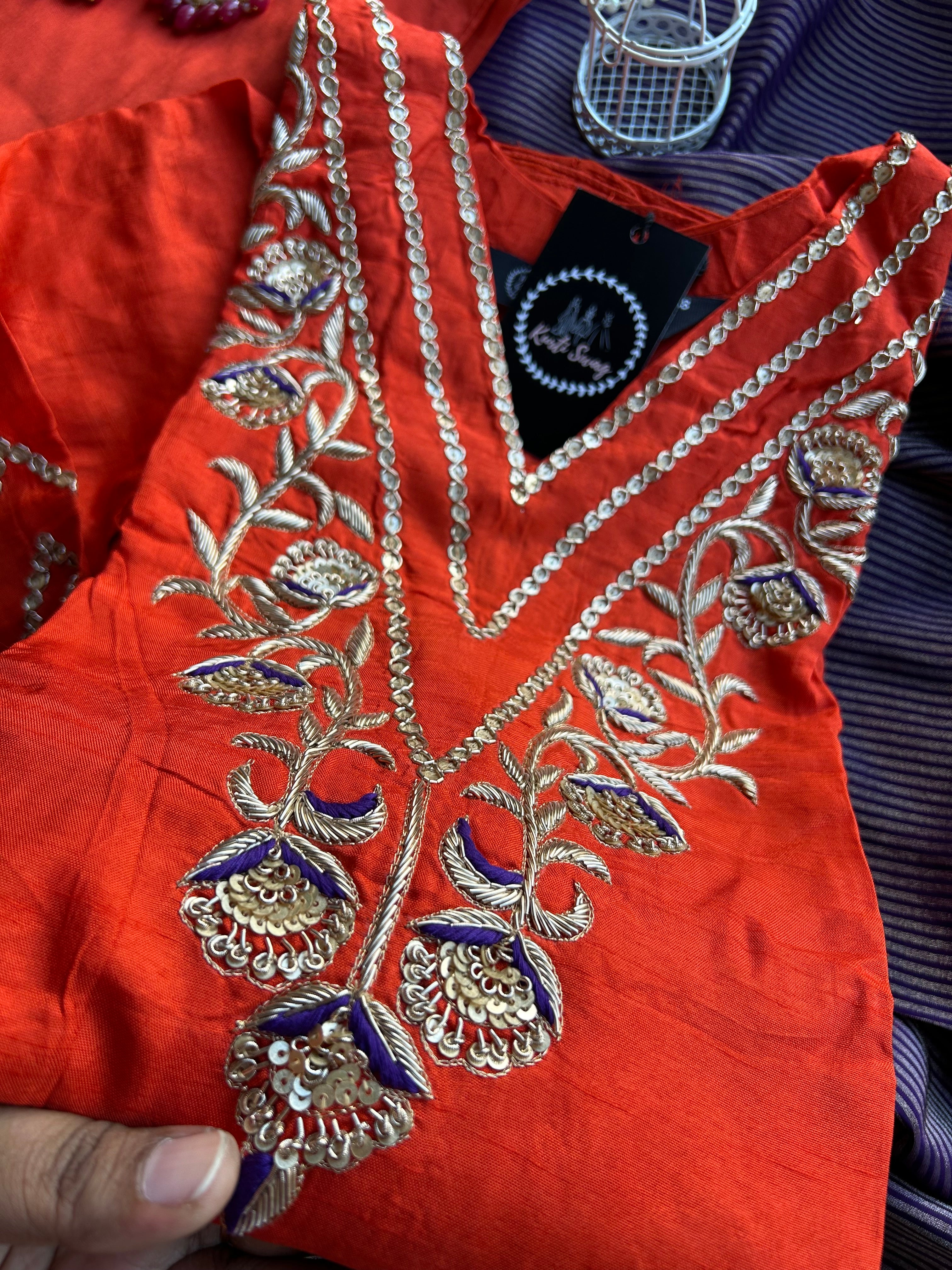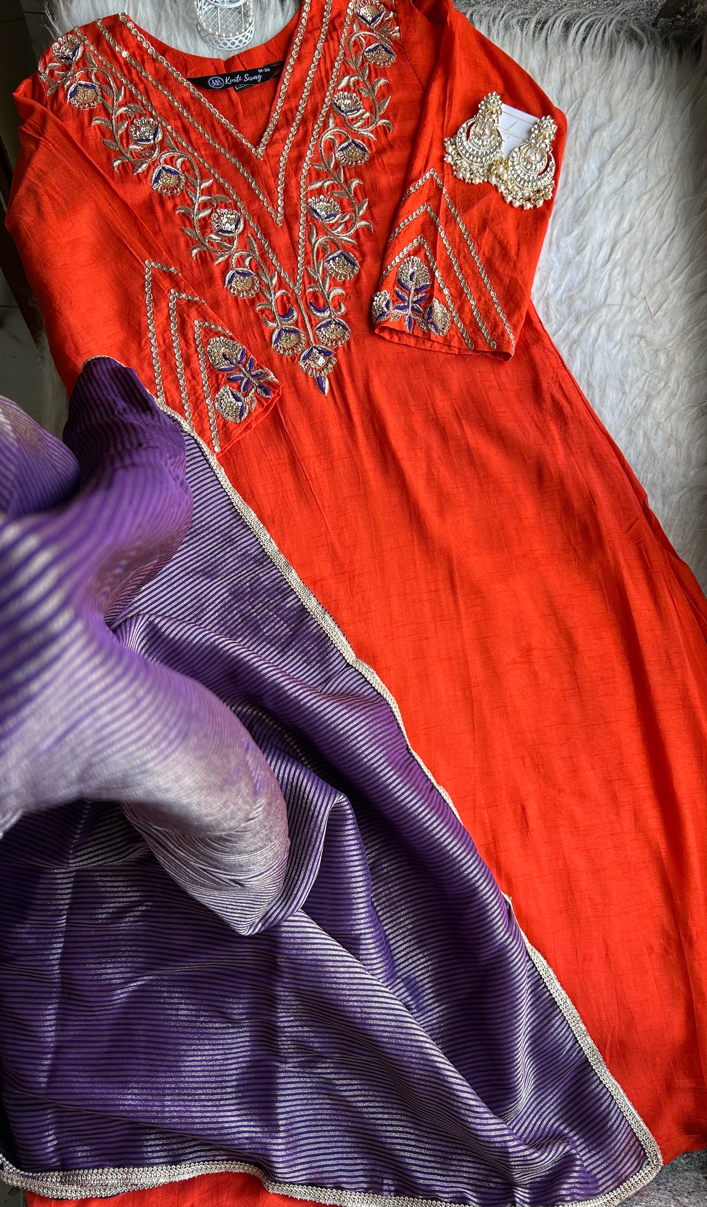 ✅ Premium Dola Silk A Line Kurti With Zardosi & Dabka Handwork on the Neckline