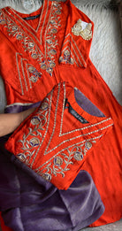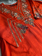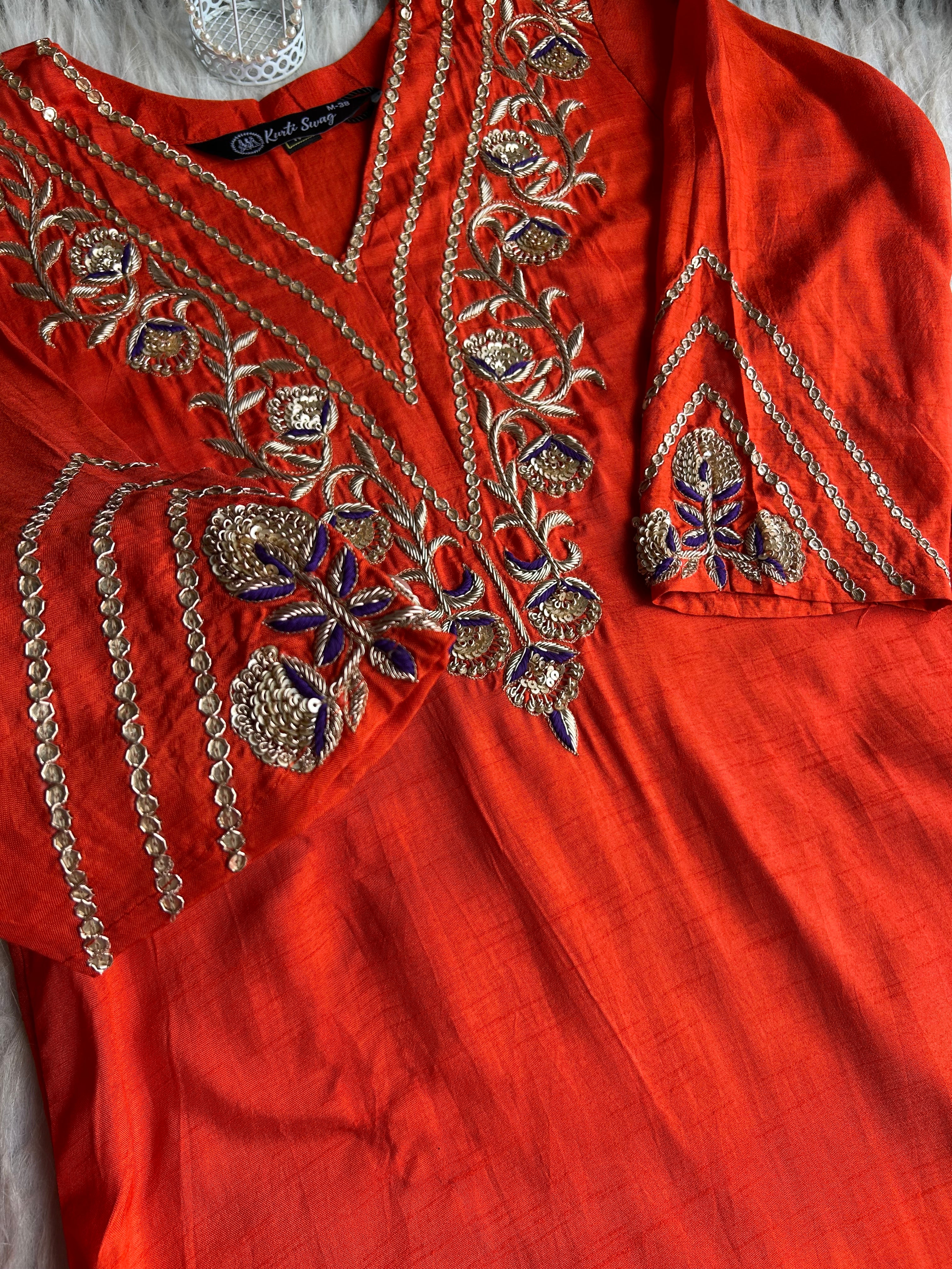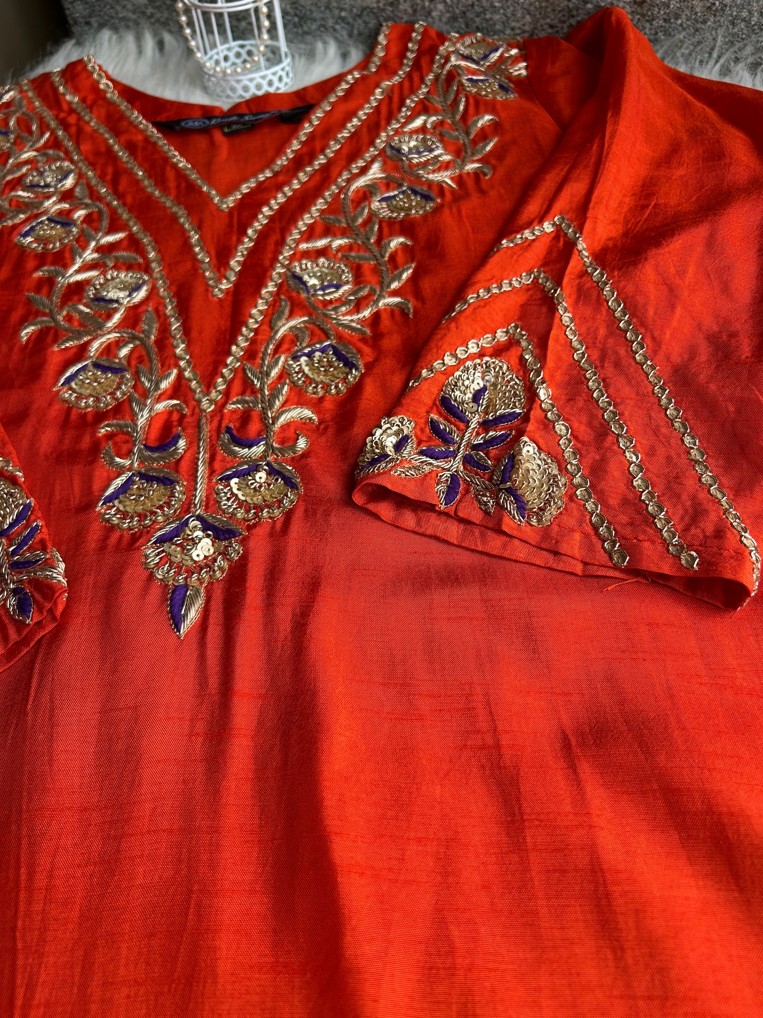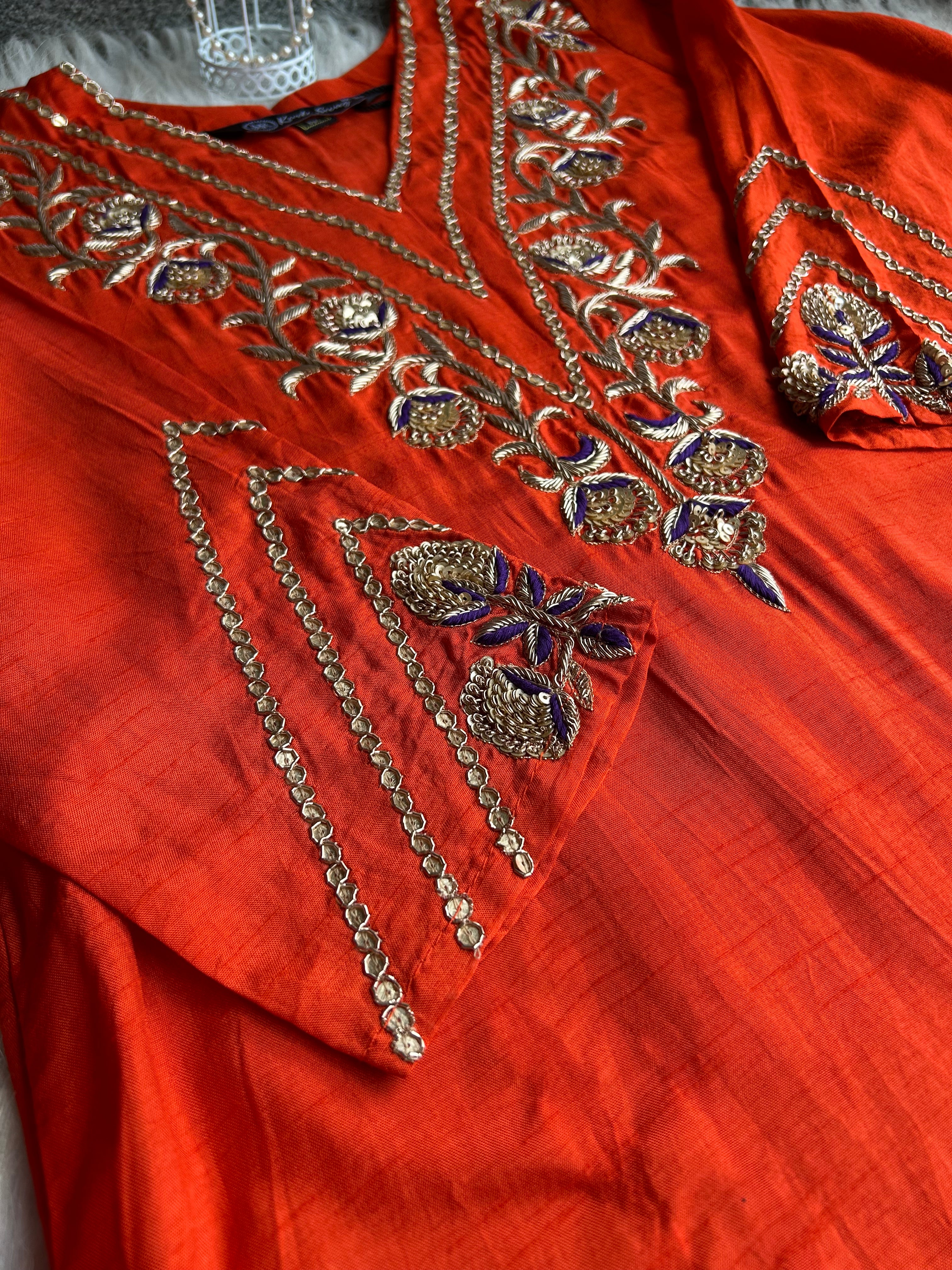 ✅ Premium Dola Silk A Line Kurti With Zardosi & Dabka Handwork on the Neckline
