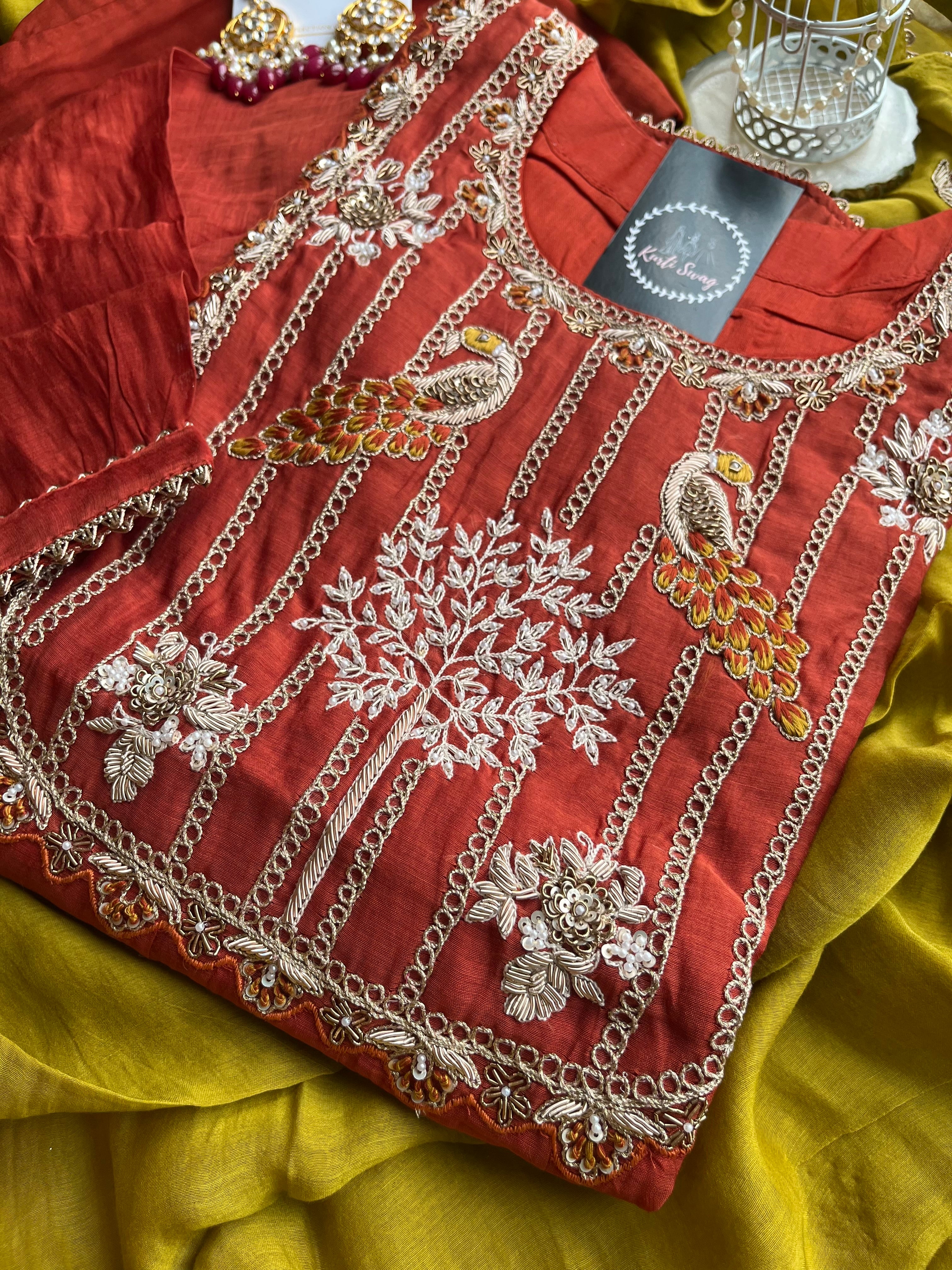 ✅ Premium Mul Chanderi Kurti With Heavy Zardosi Work On The Yoke Of The Kurti