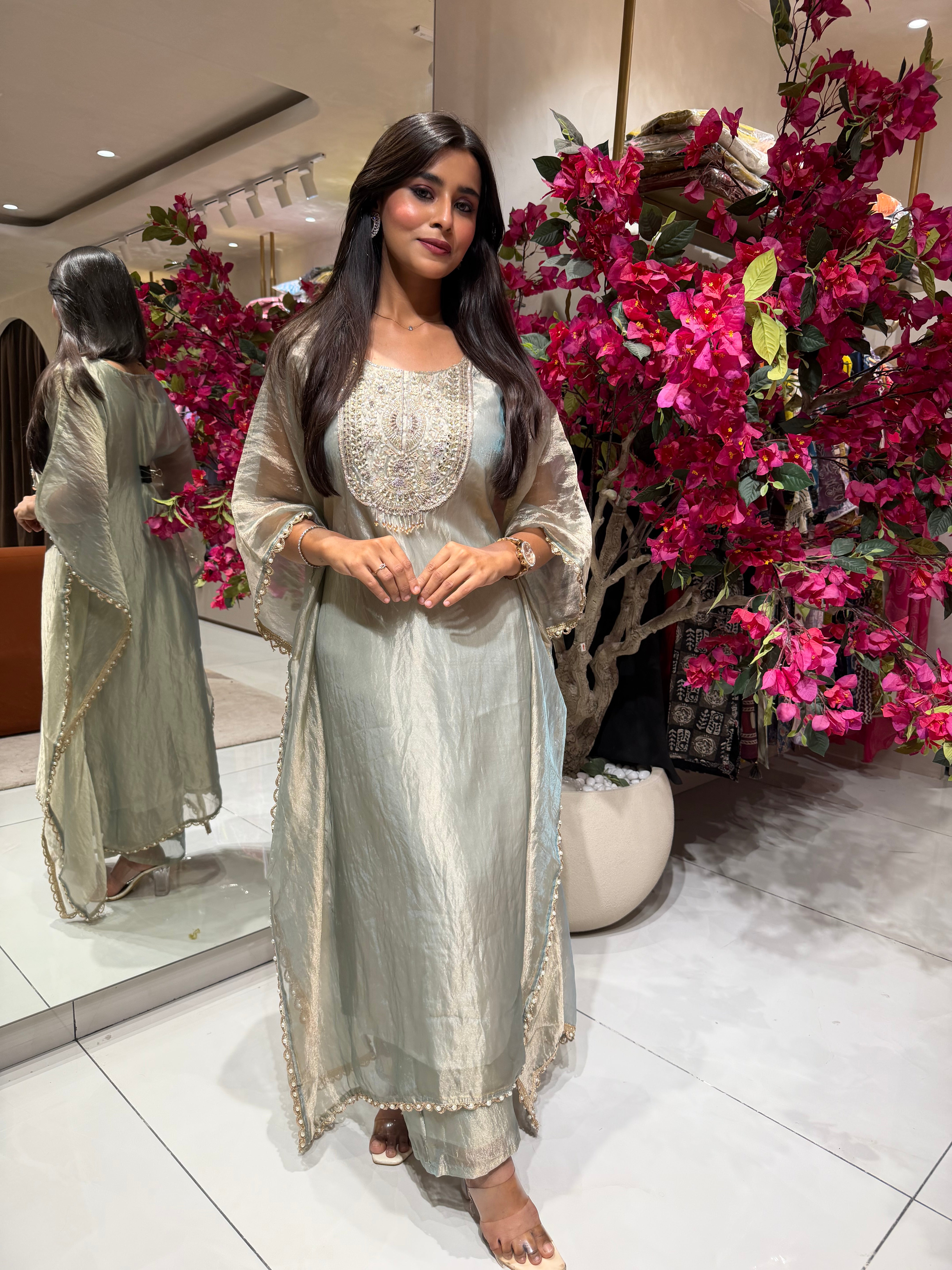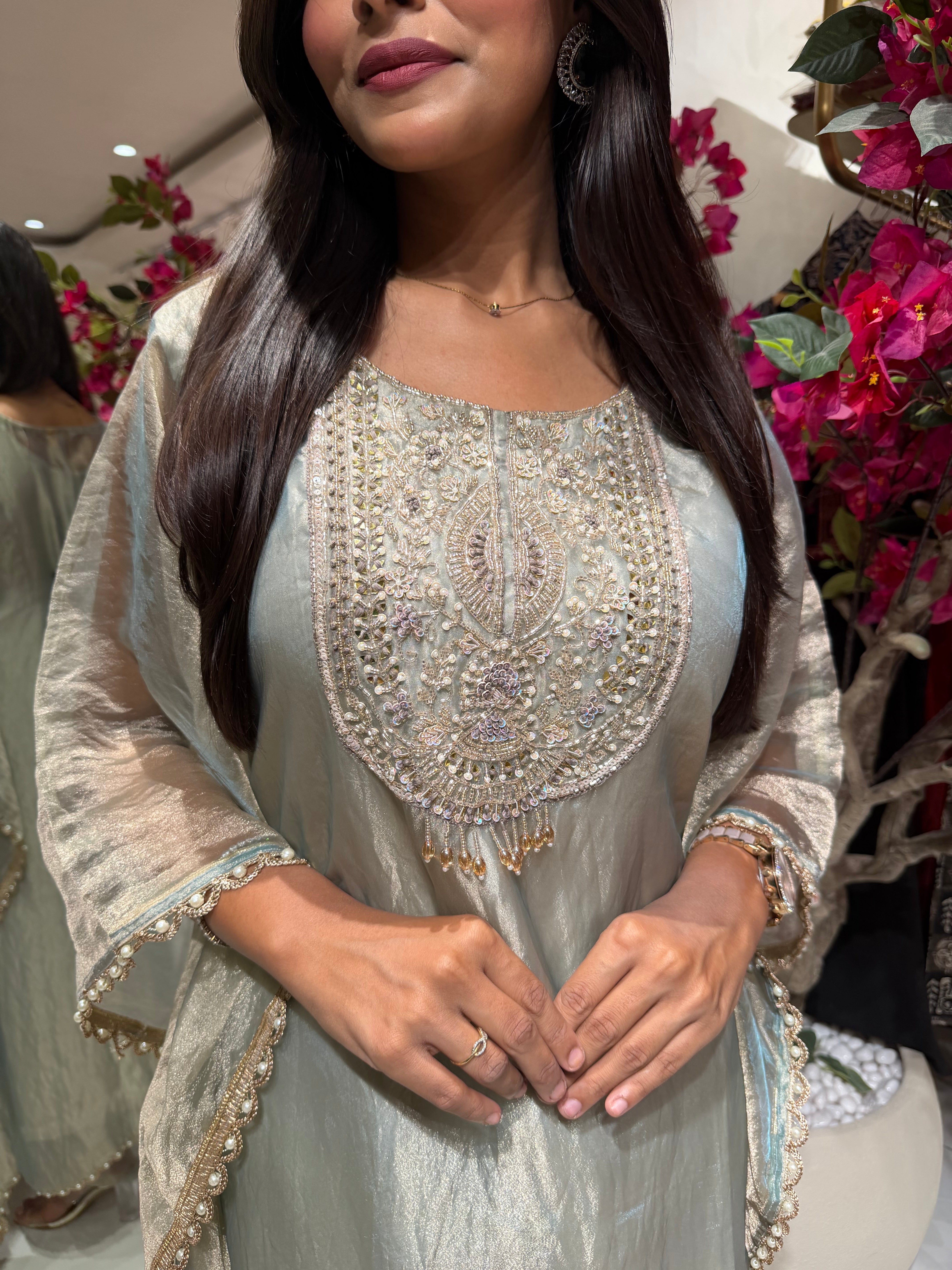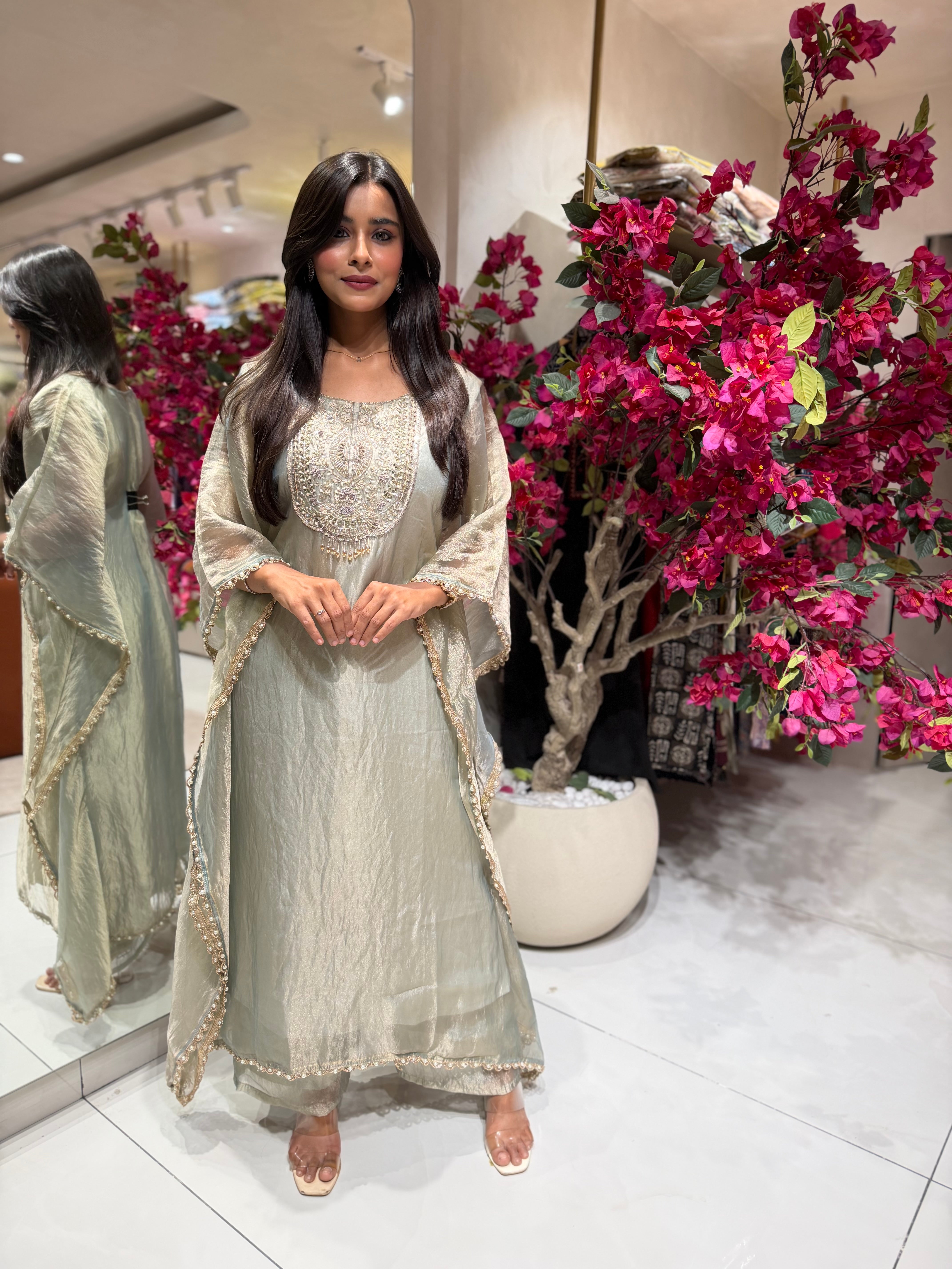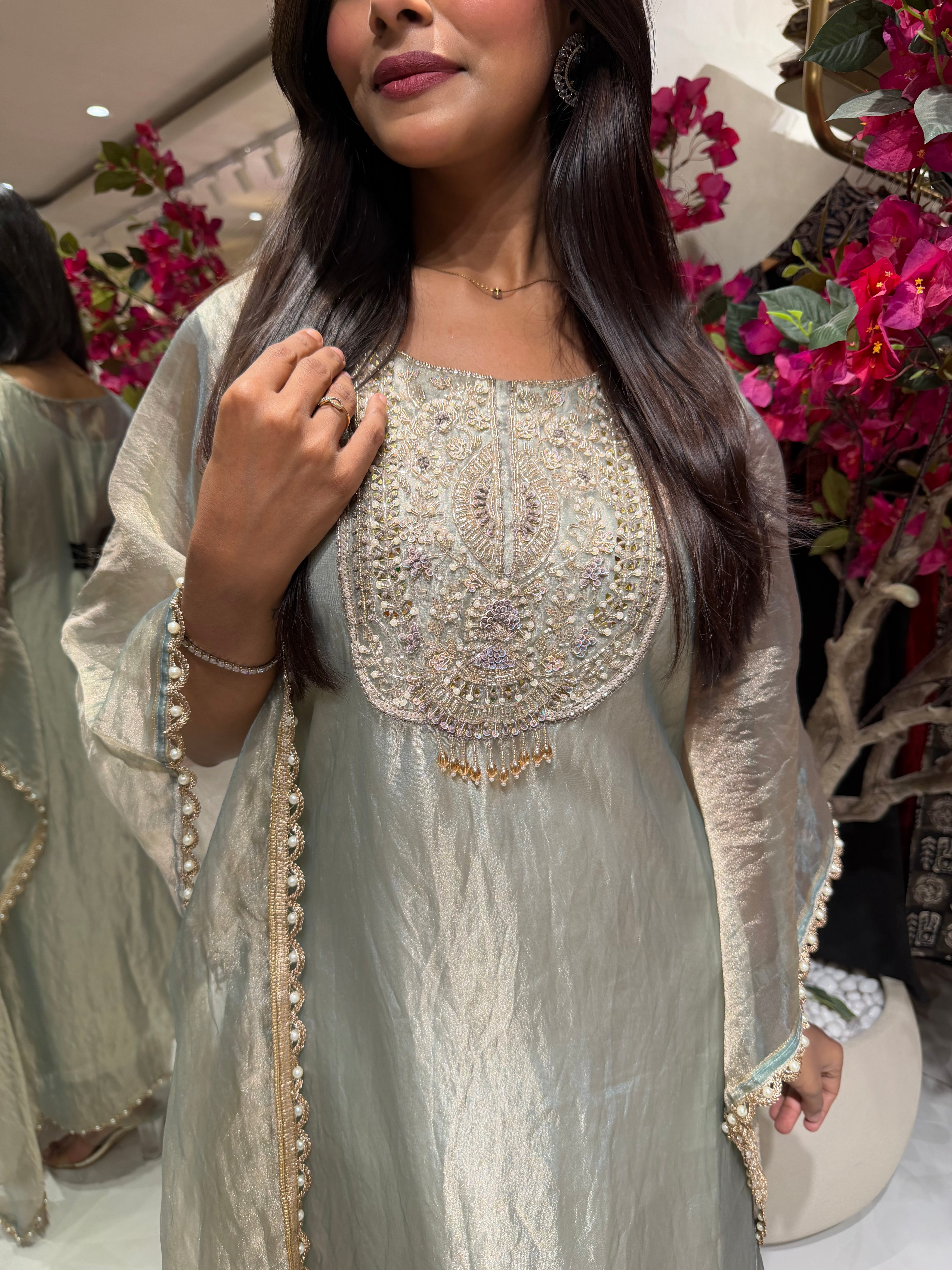 ✅ Premium Crush Glass Tissue Kaftan With Golden Zardosi And Sequin Handwork On The Yoke