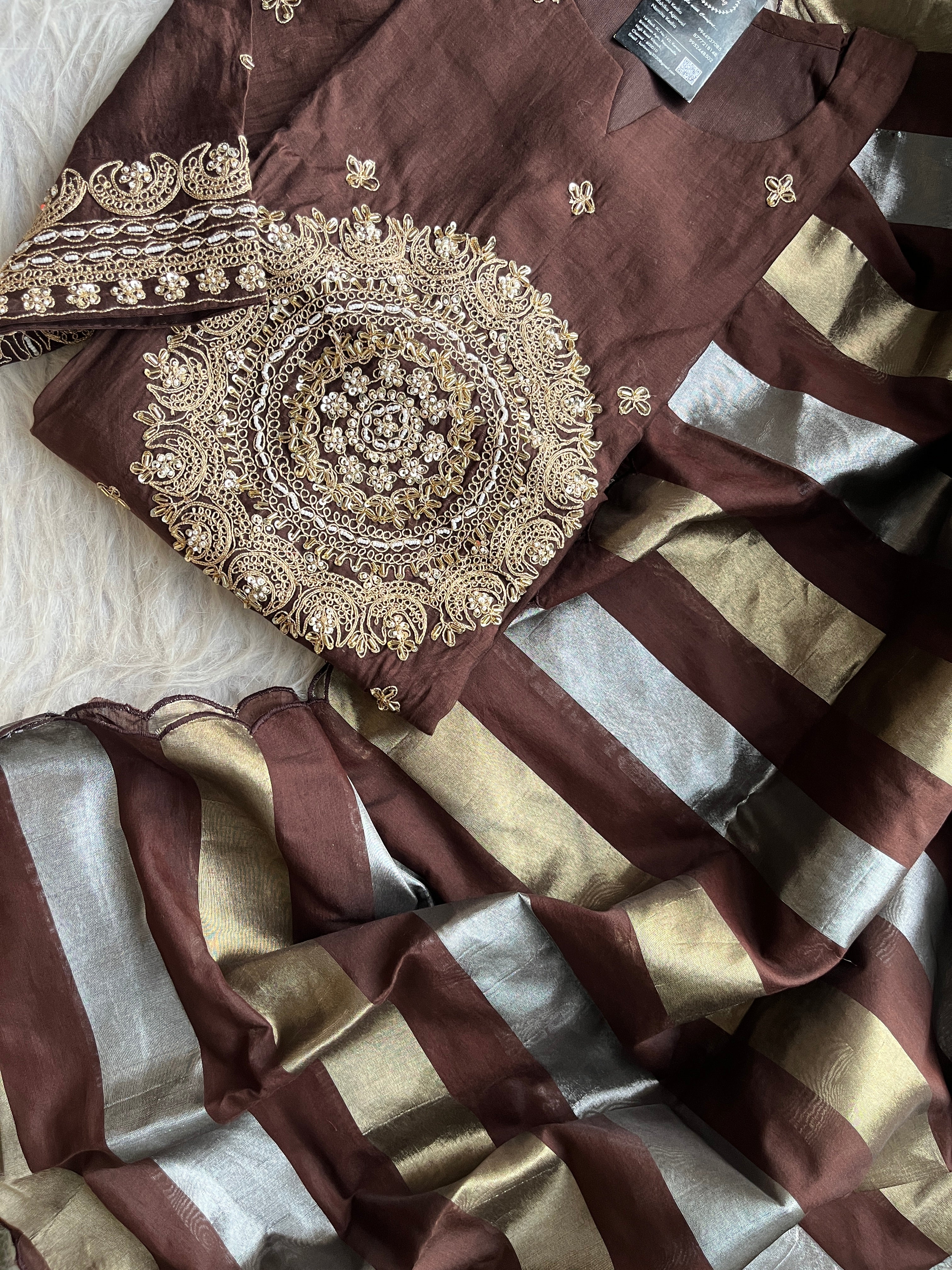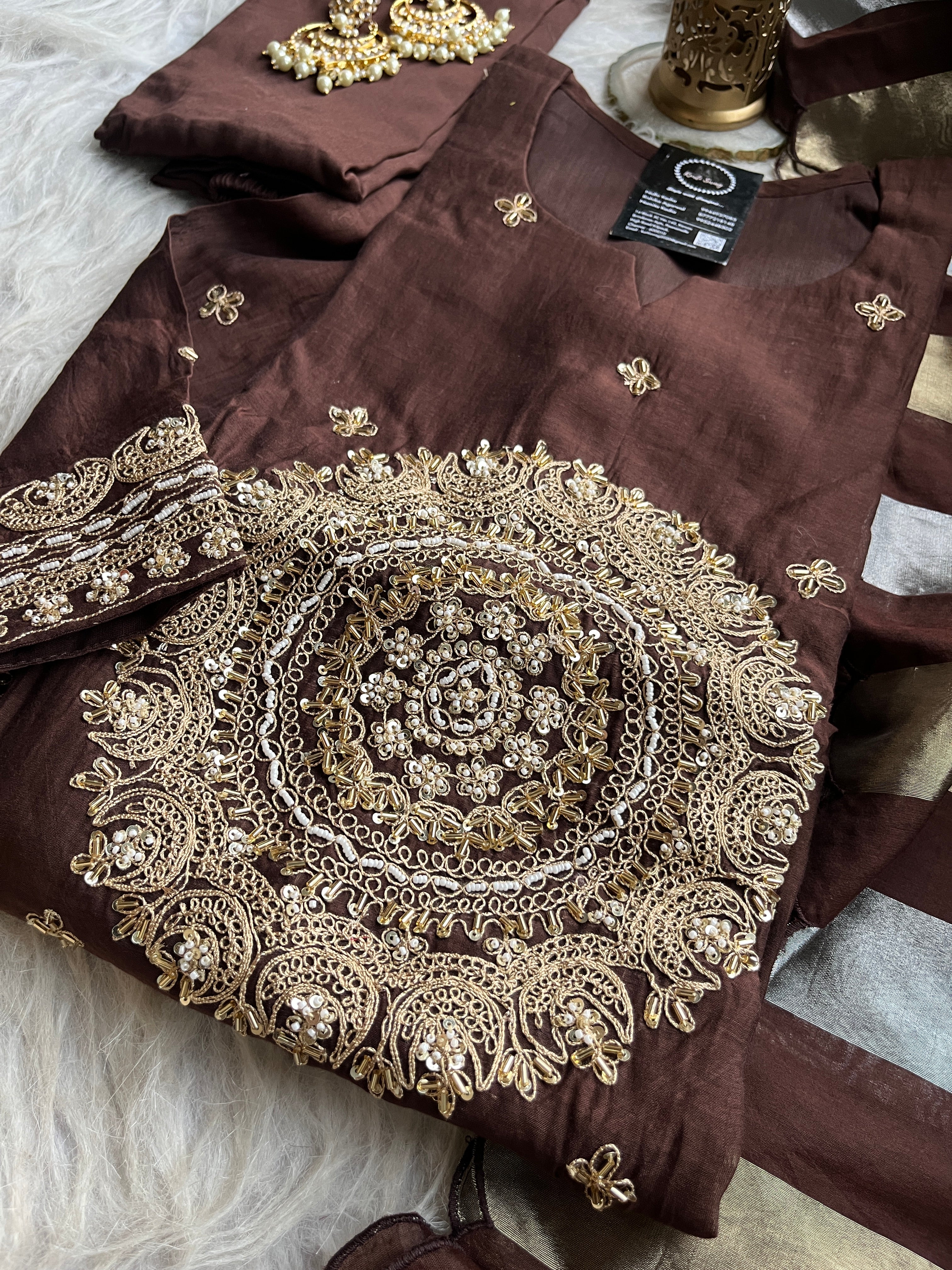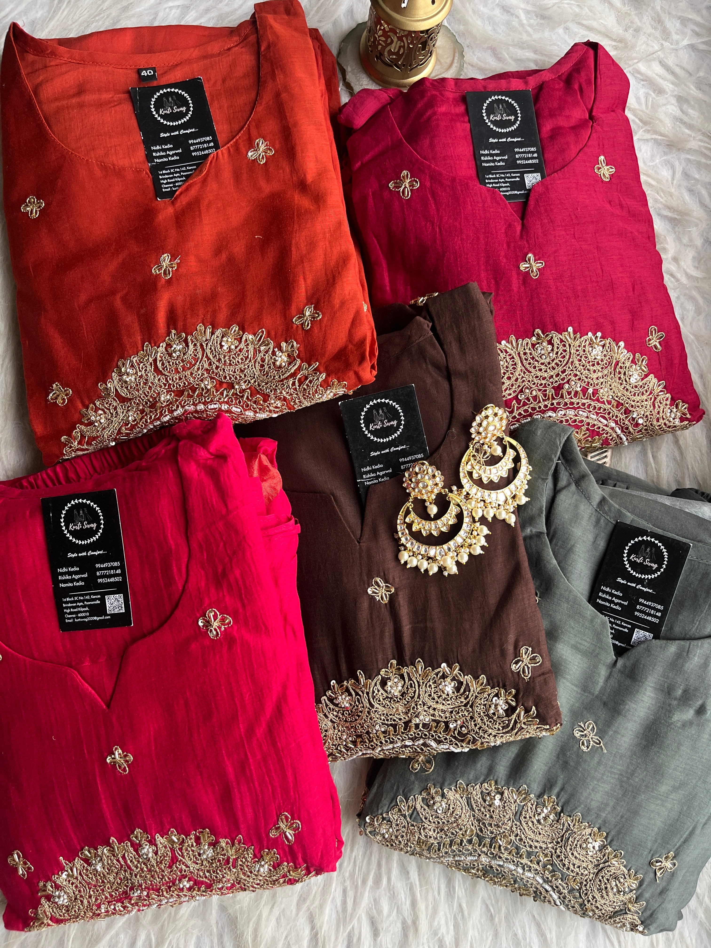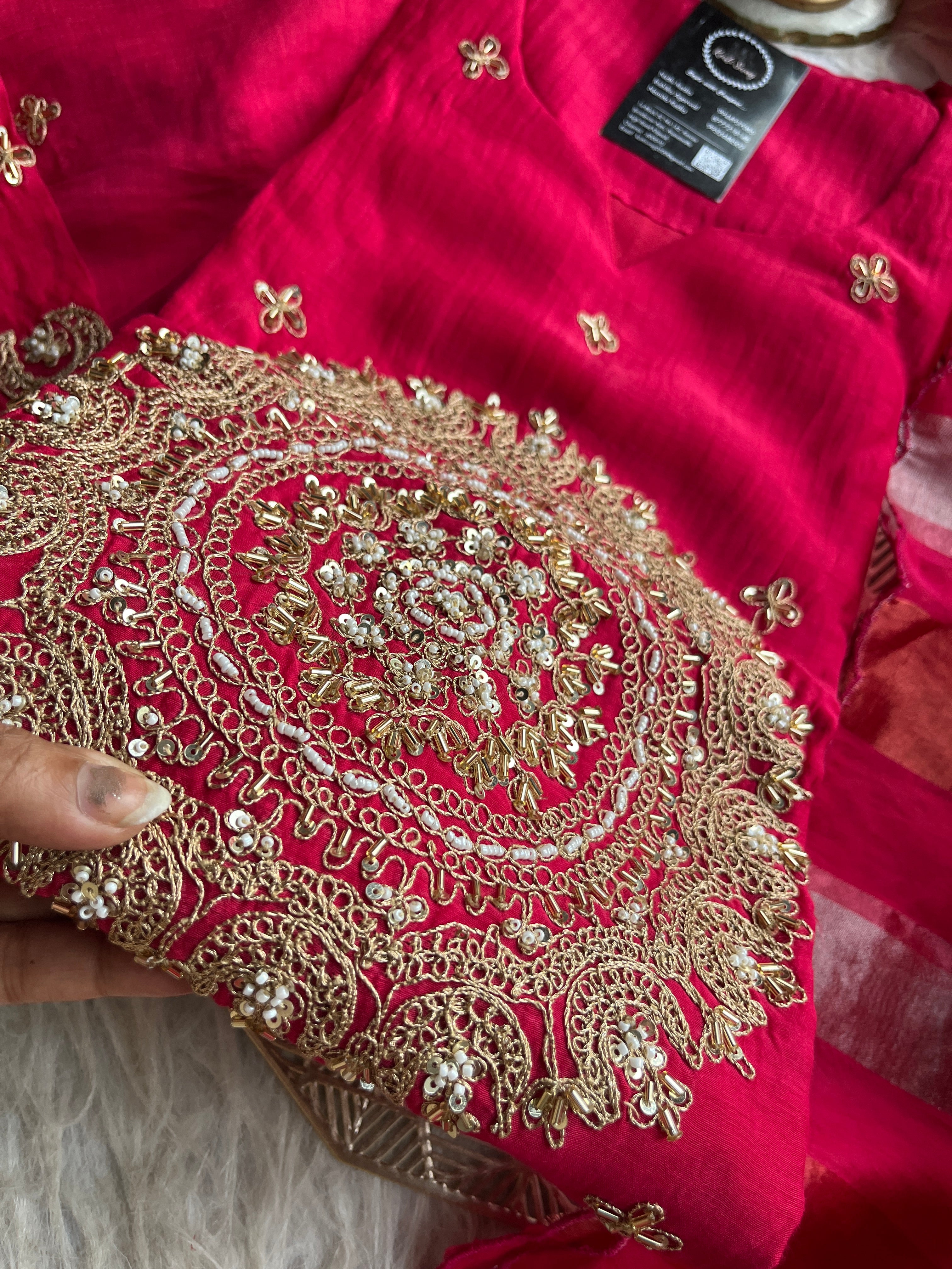 ✅Super Premium Mul Chanderi Dress With golden Zari Hand Embroidery Handwork On The Yoke
