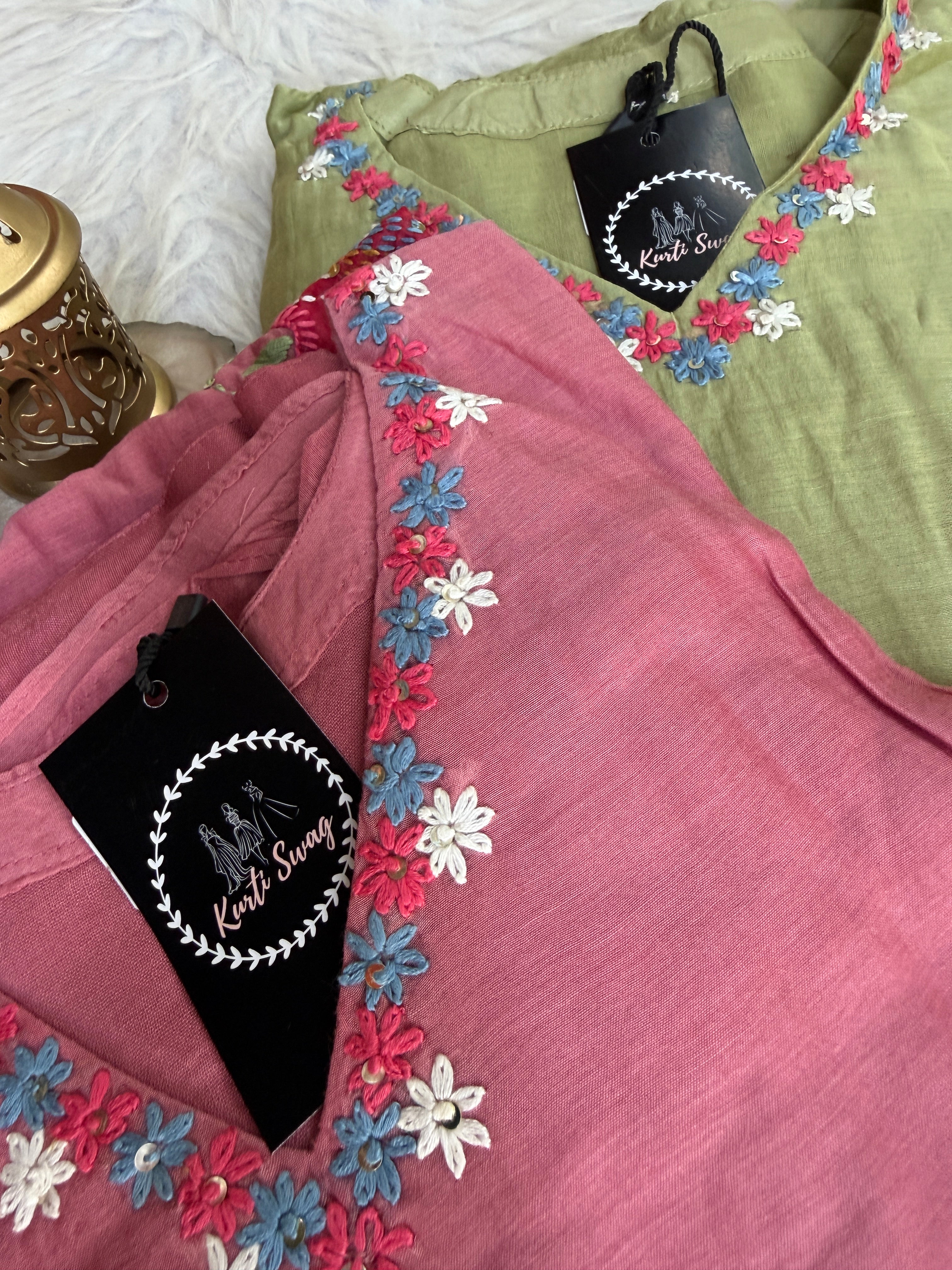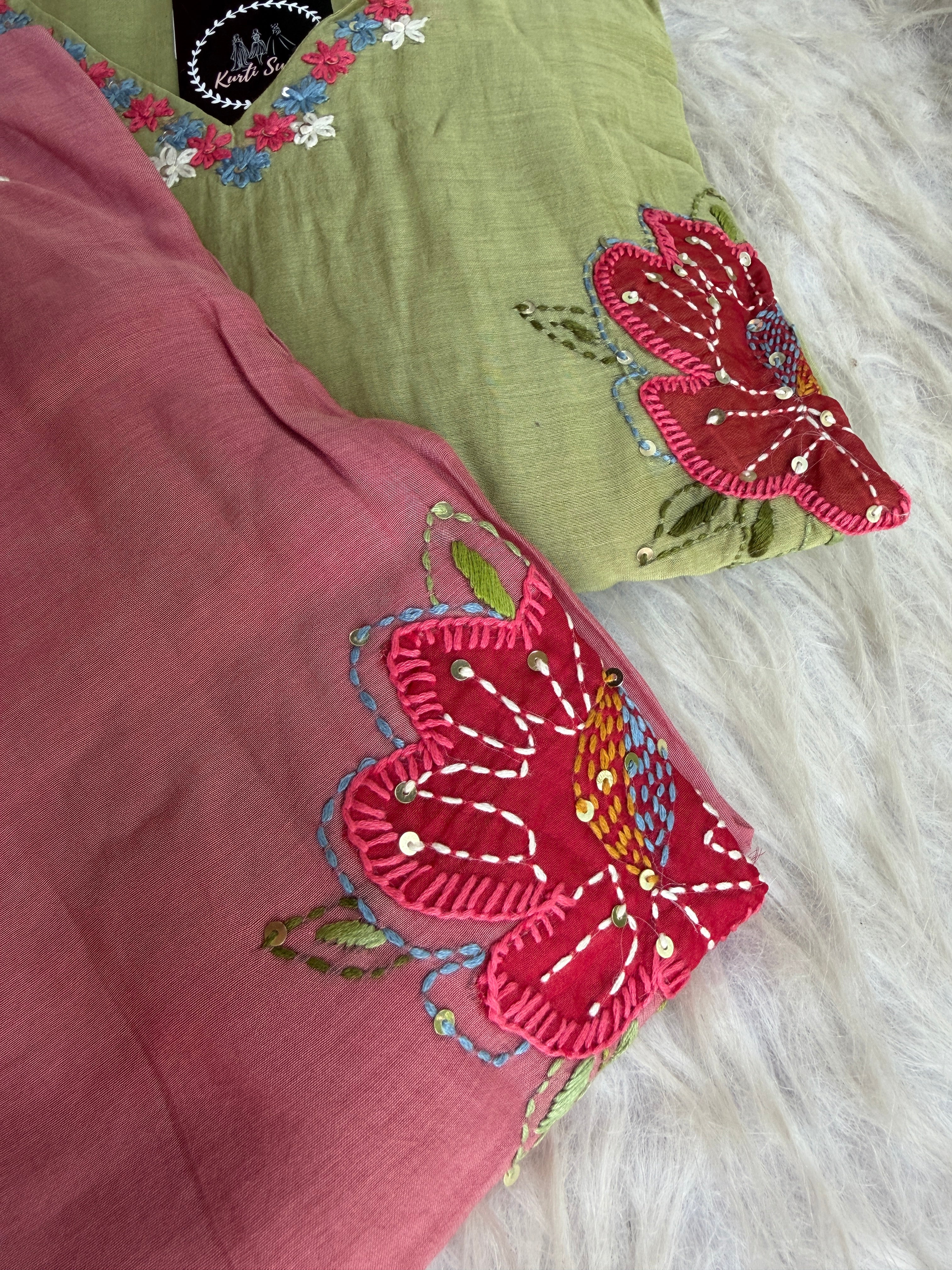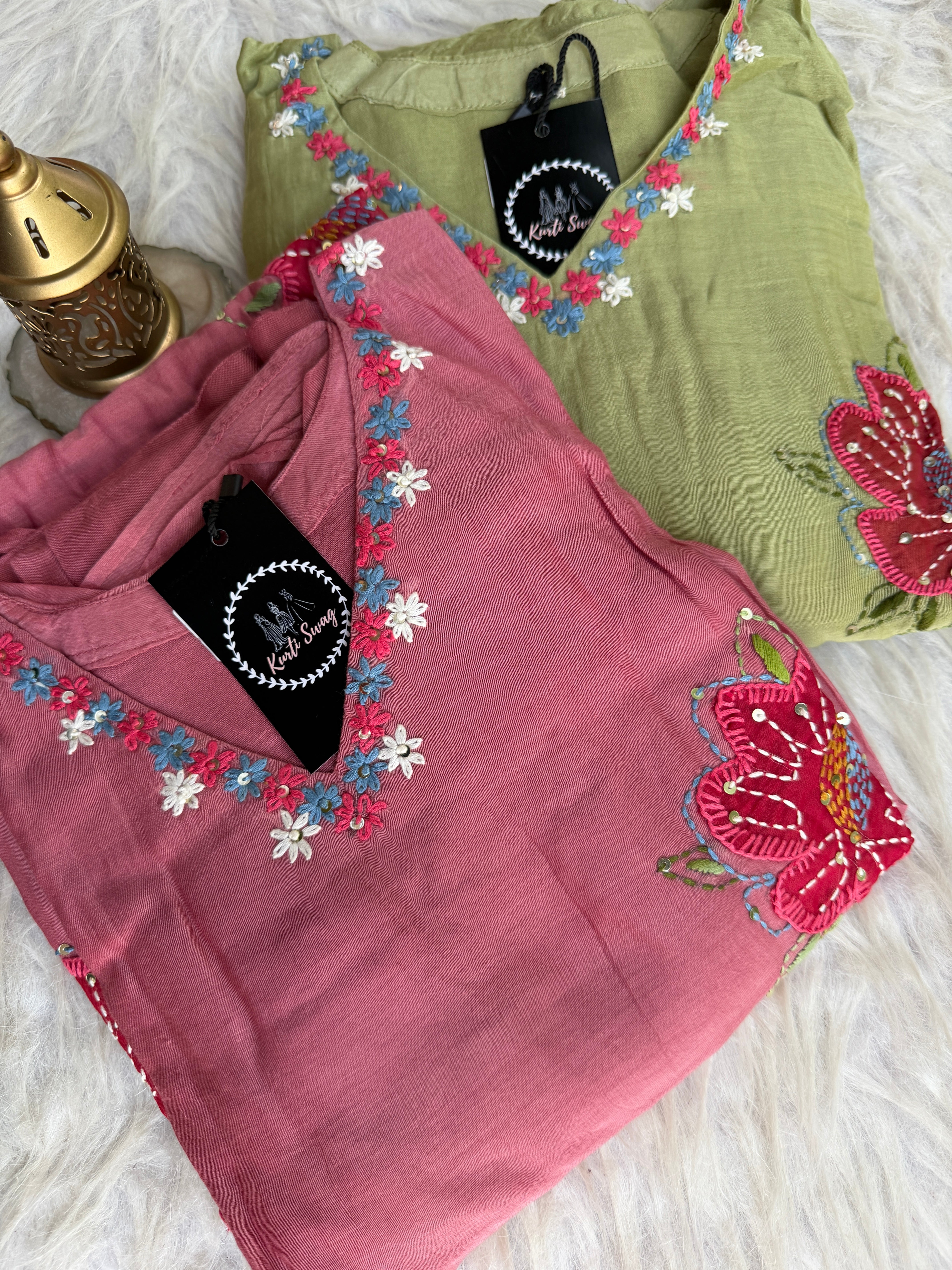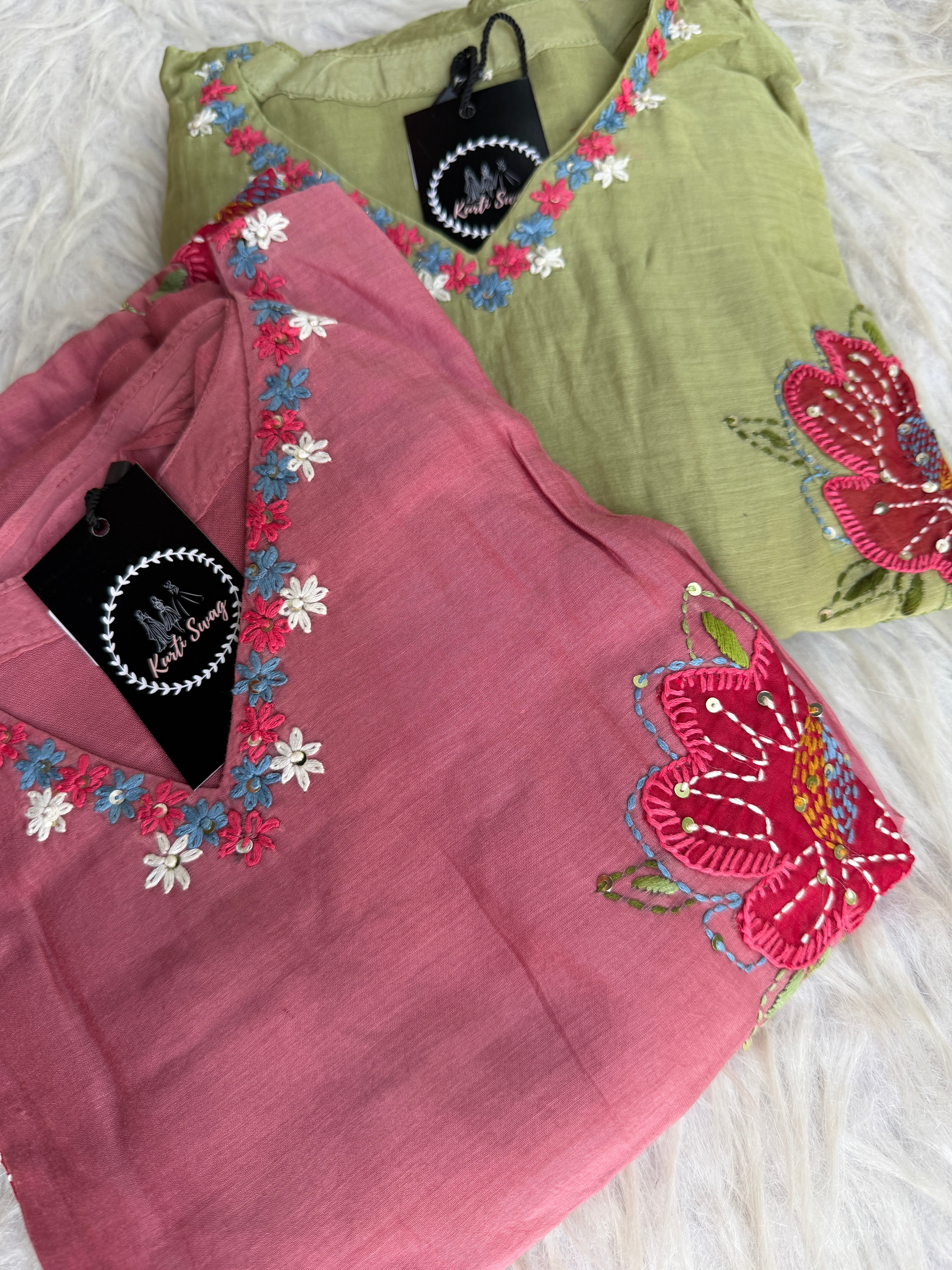 ✅ Premium Mul Chanderi Kurti With Thread And Applique Work On The Kurti