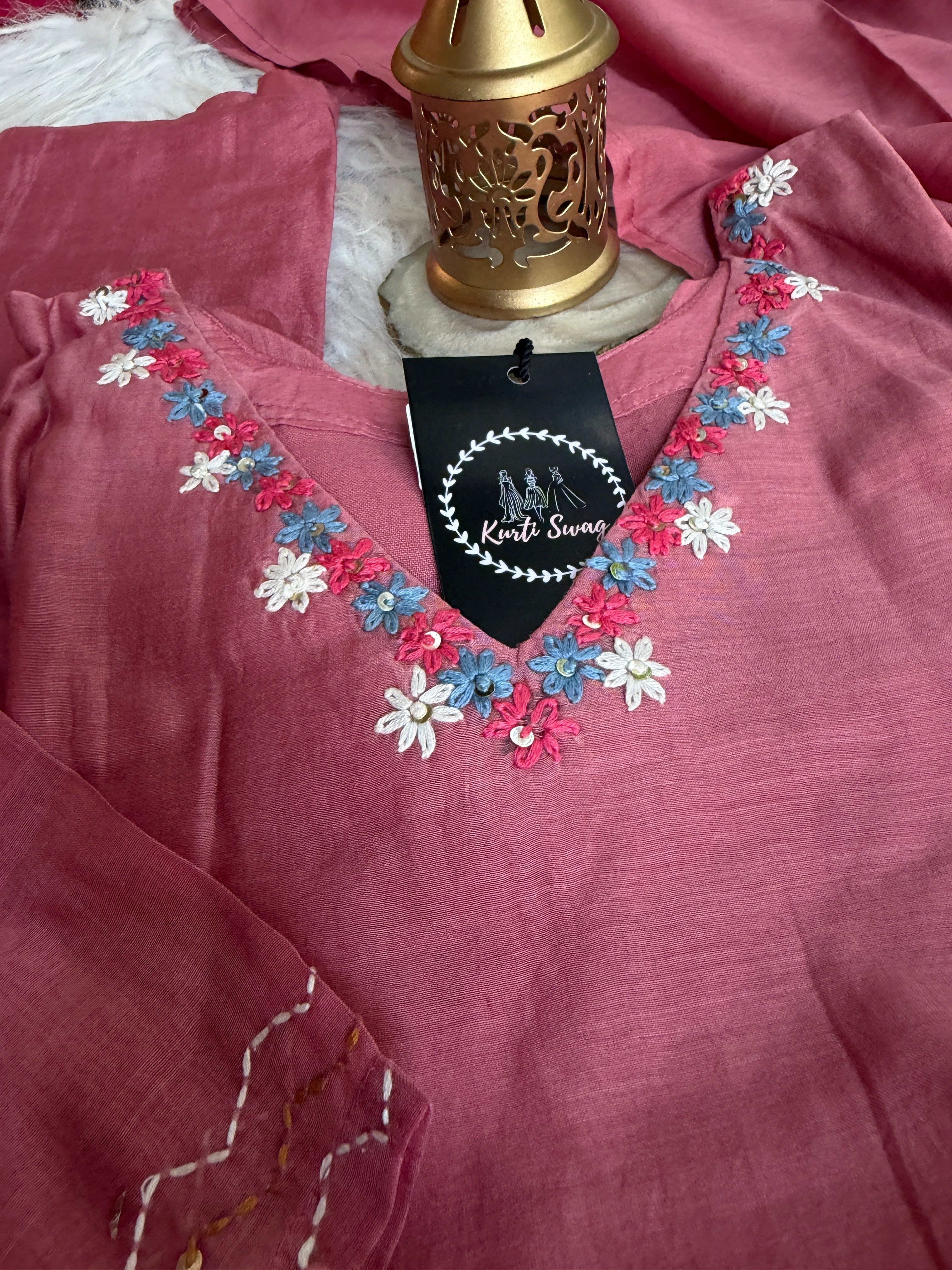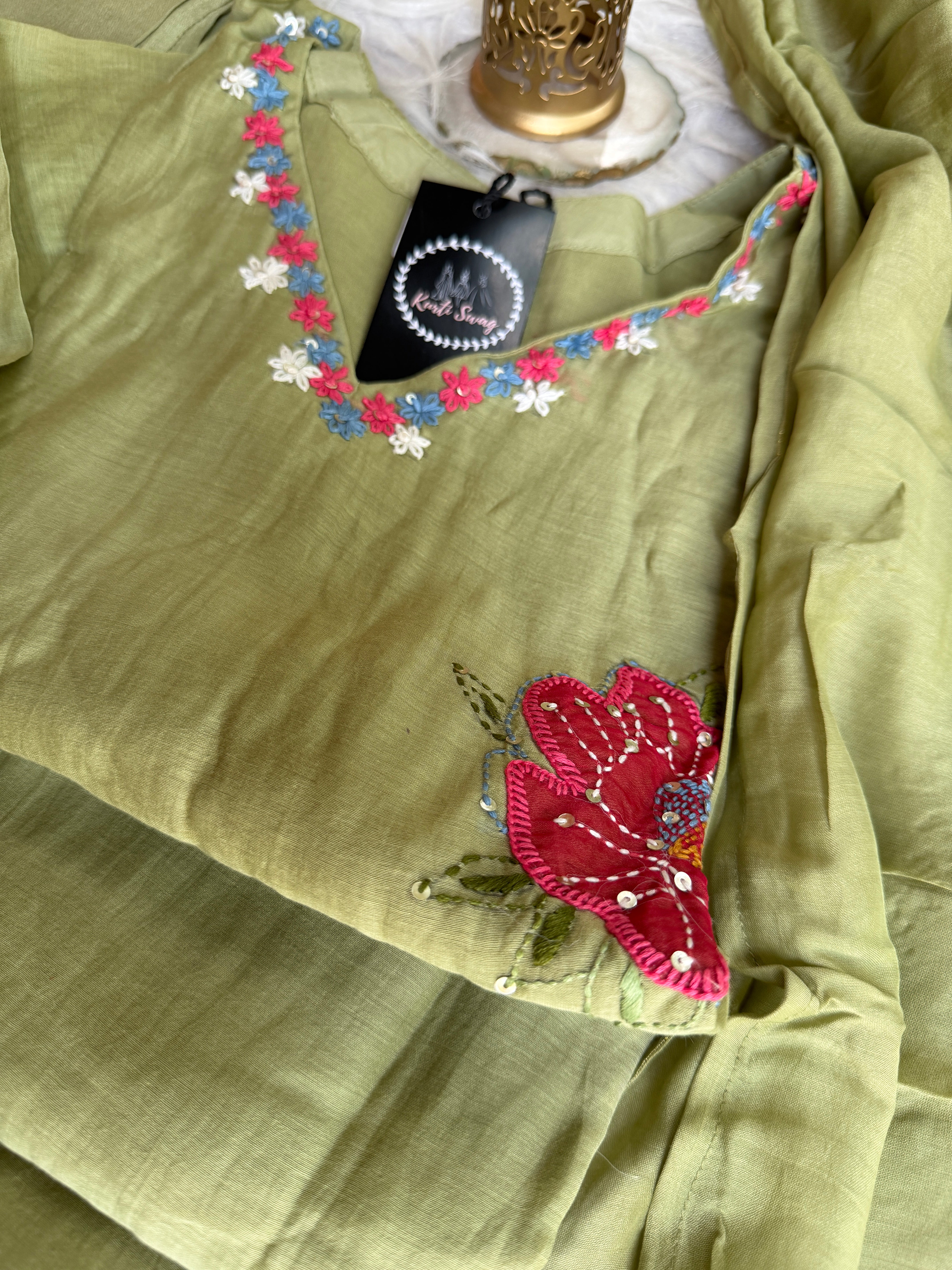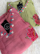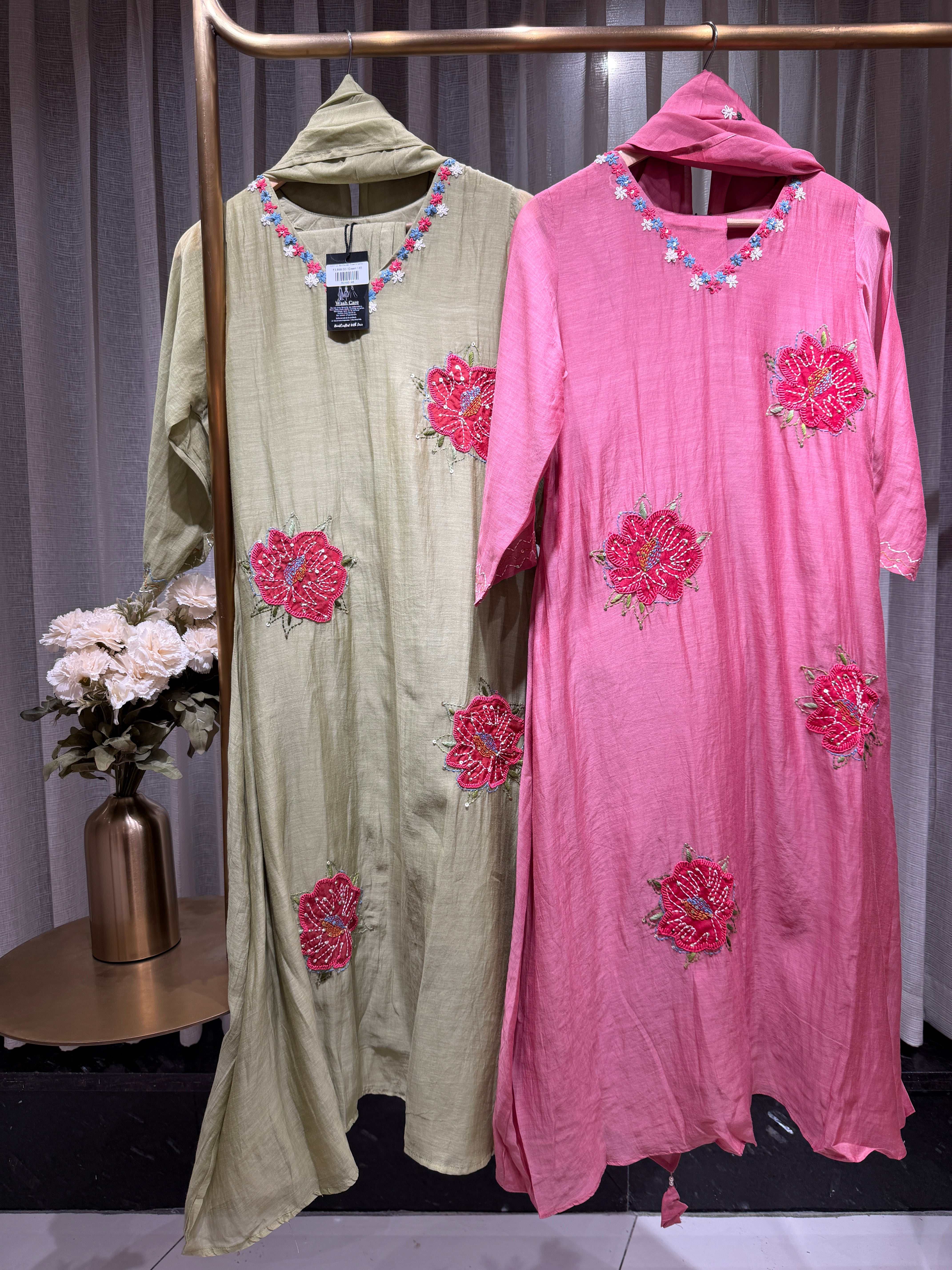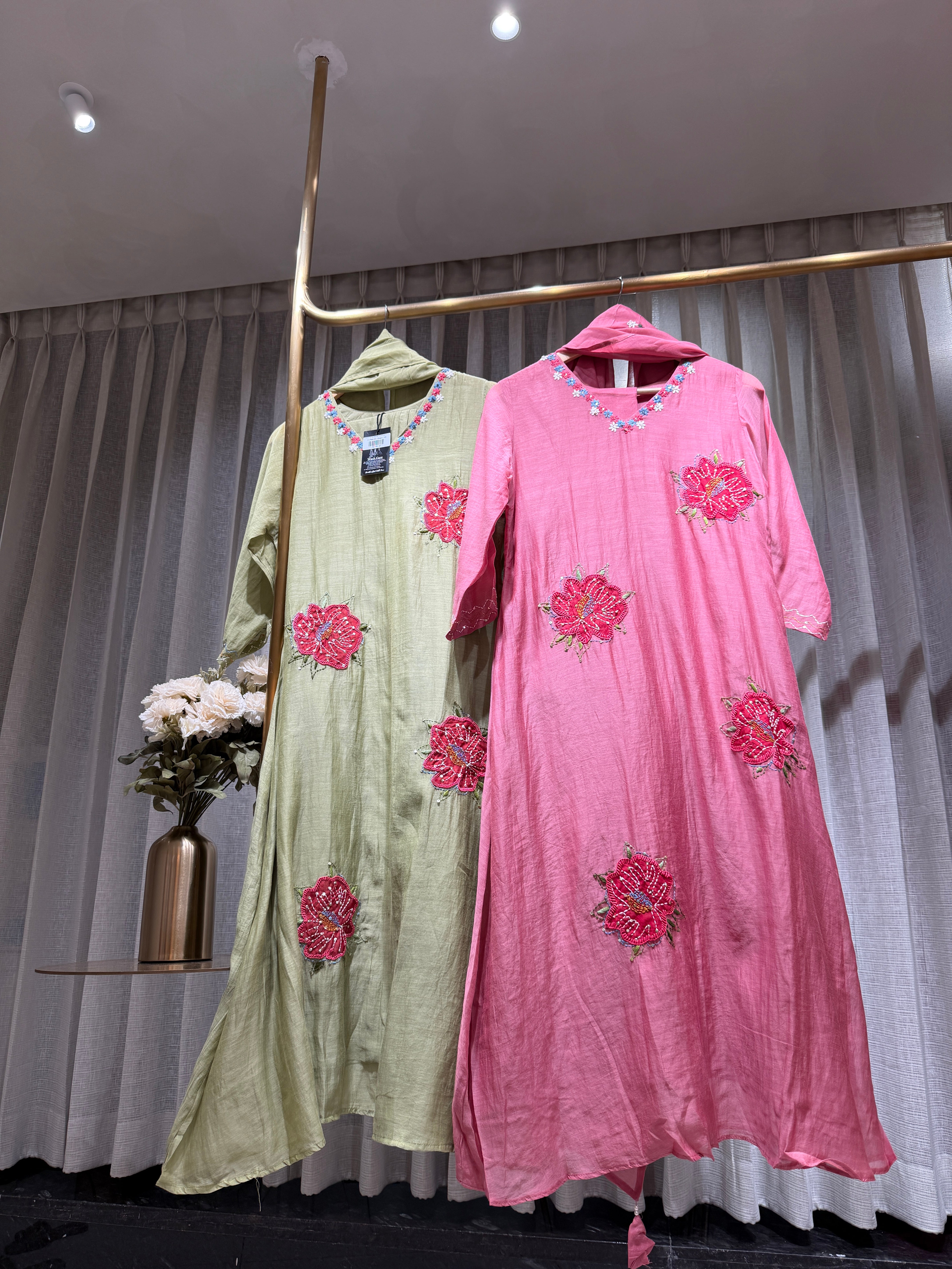 ✅ Premium Mul Chanderi Kurti With Thread And Applique Work On The Kurti