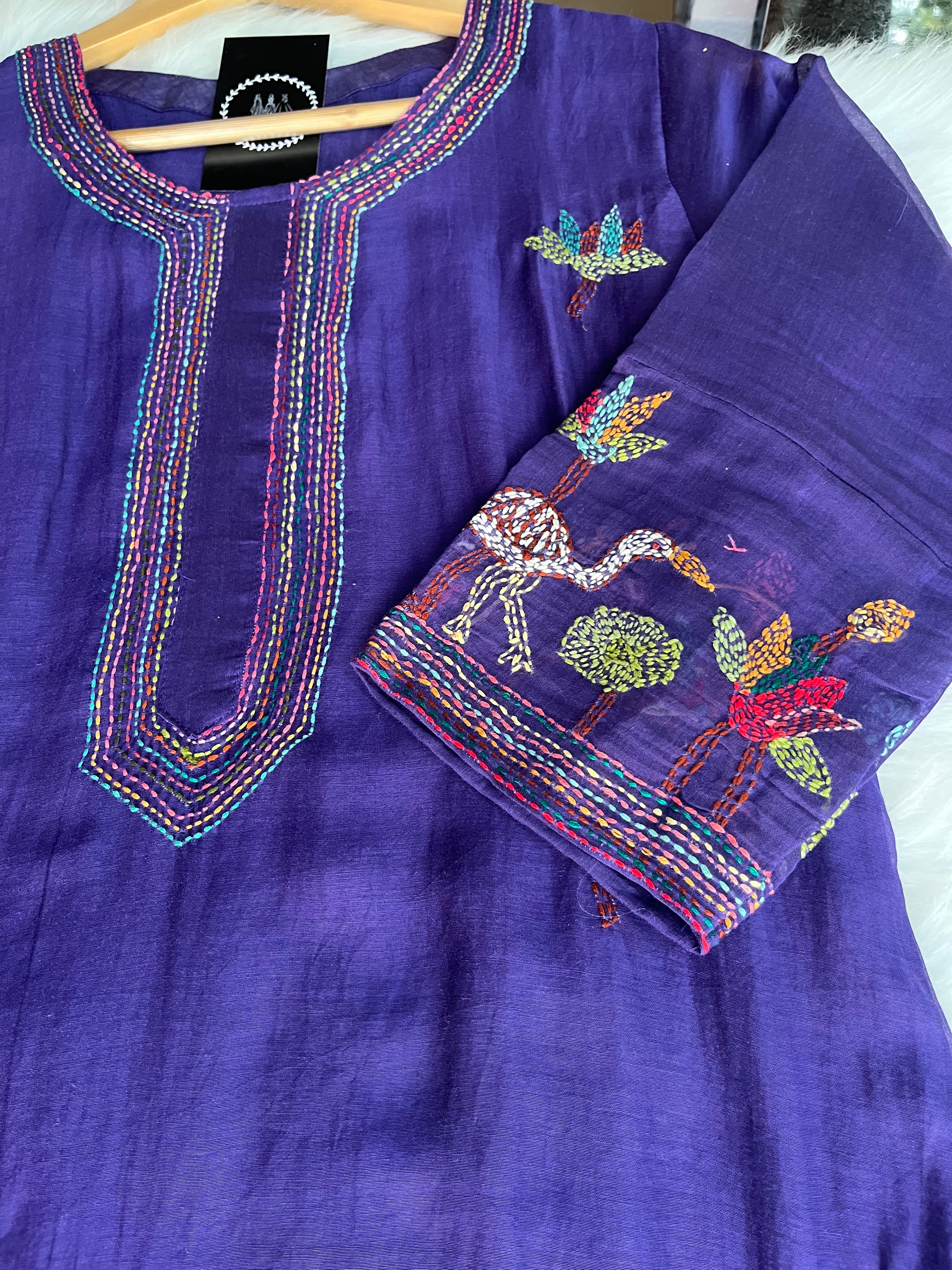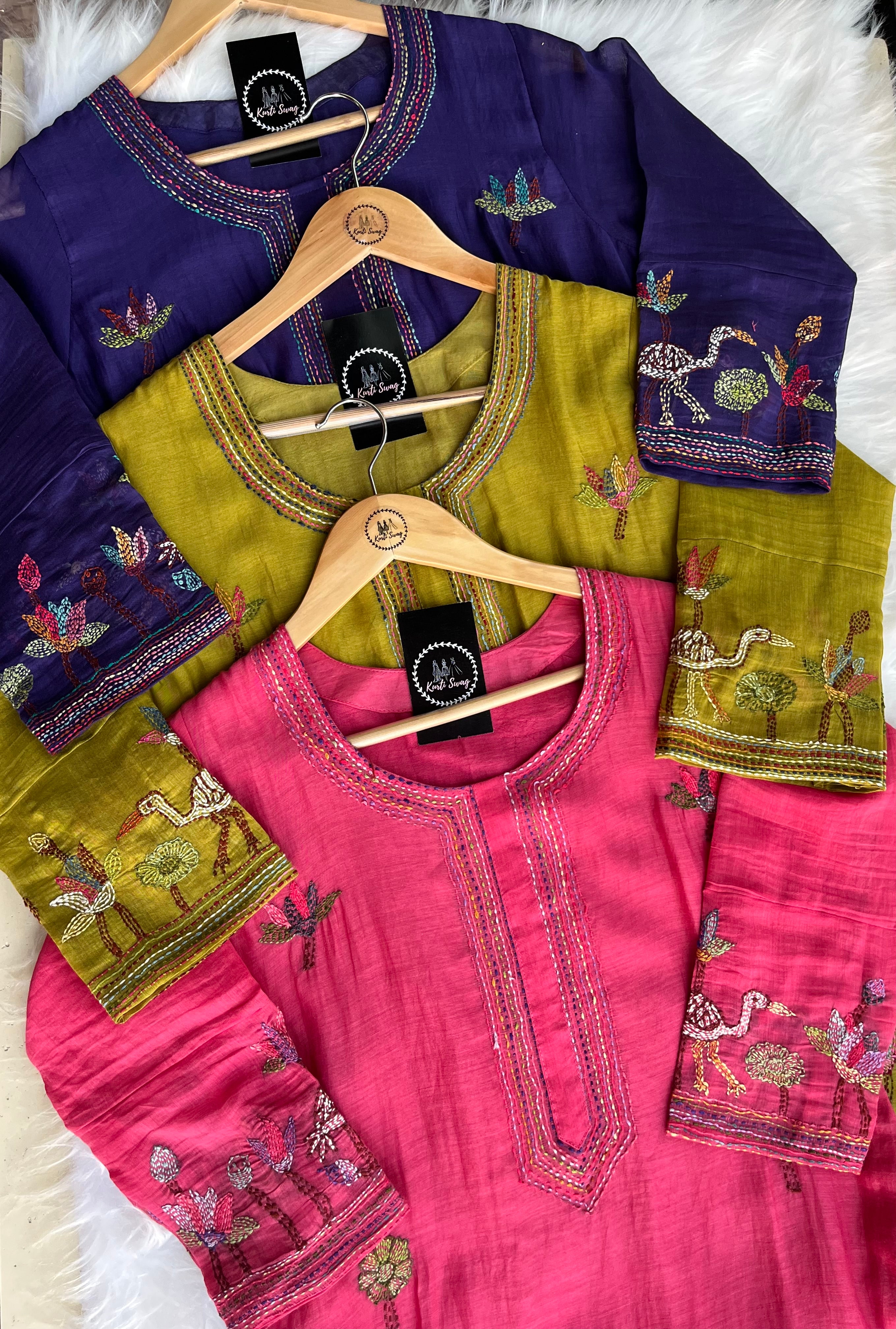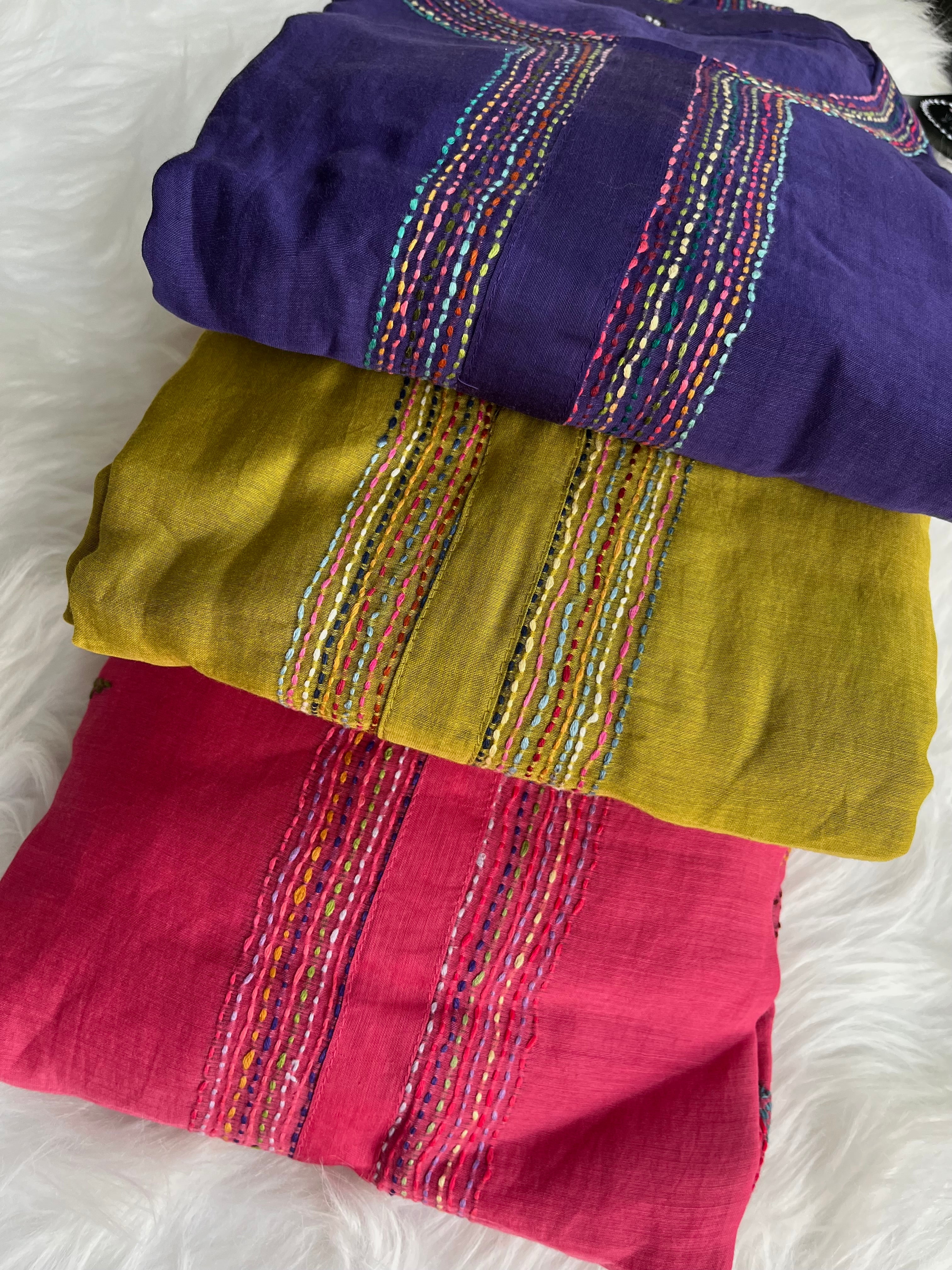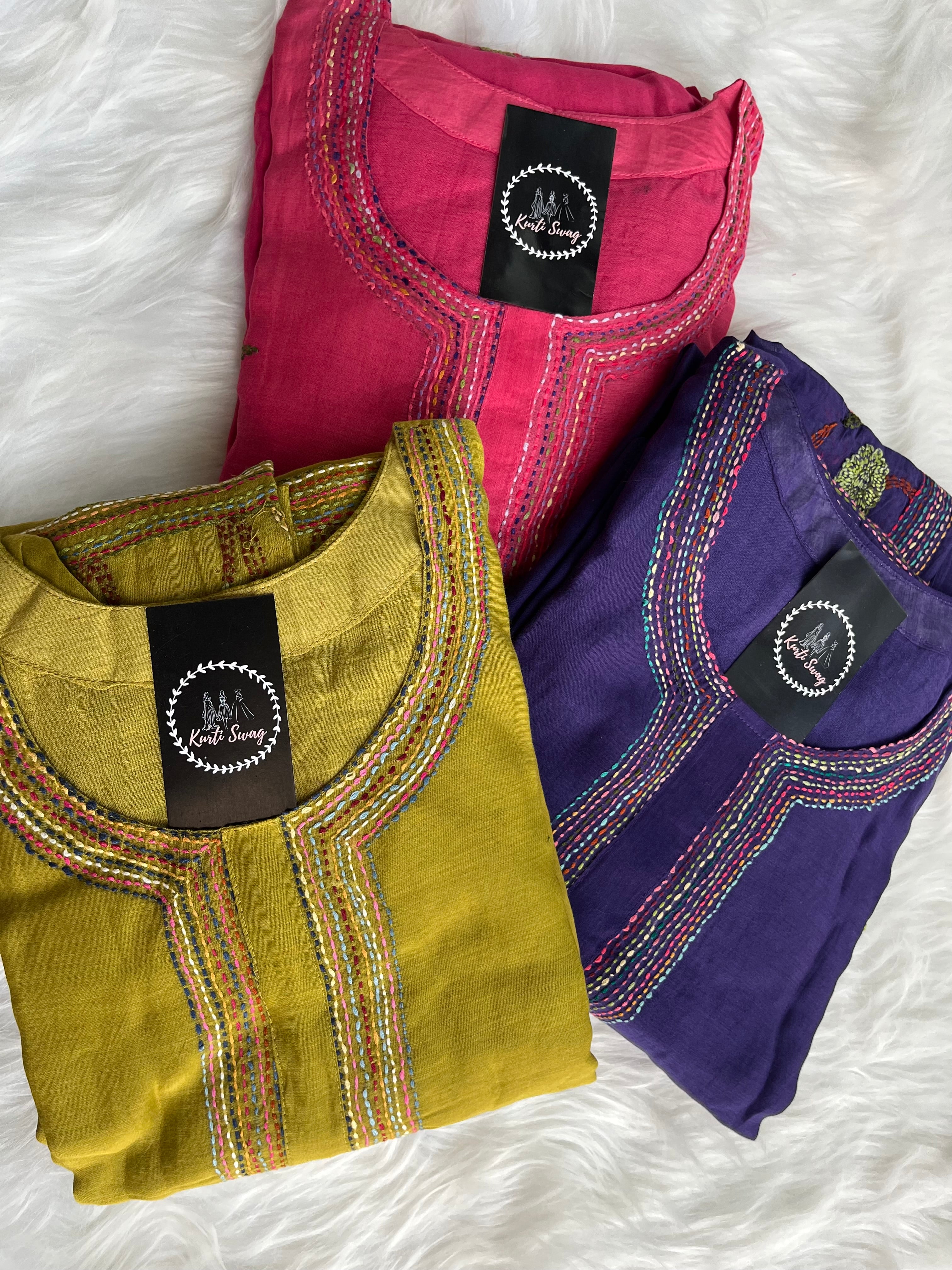 ✅ Premium Mul Chanderi Kurti With Kantha Handwork On The Neckline Of The Kurti