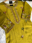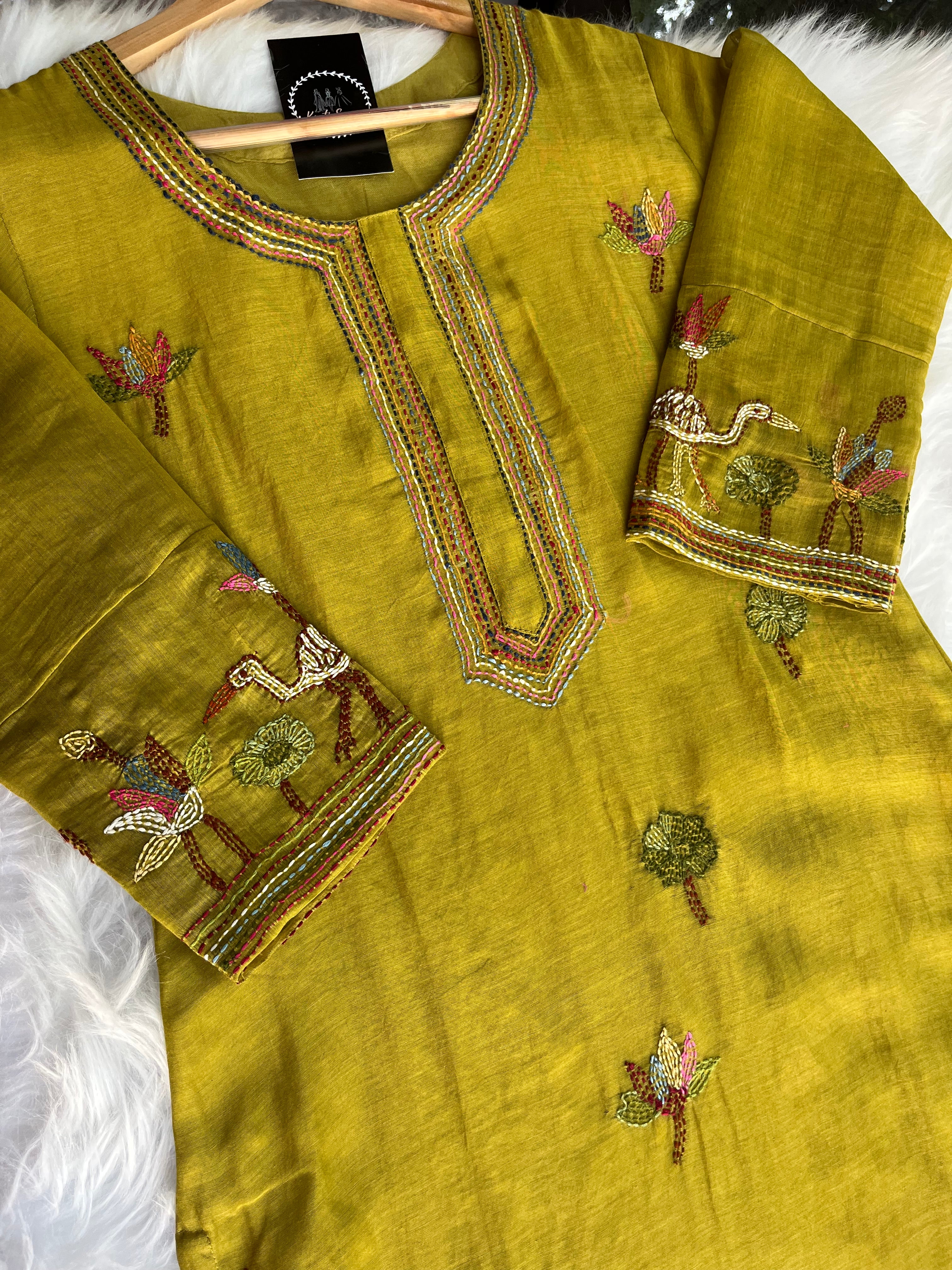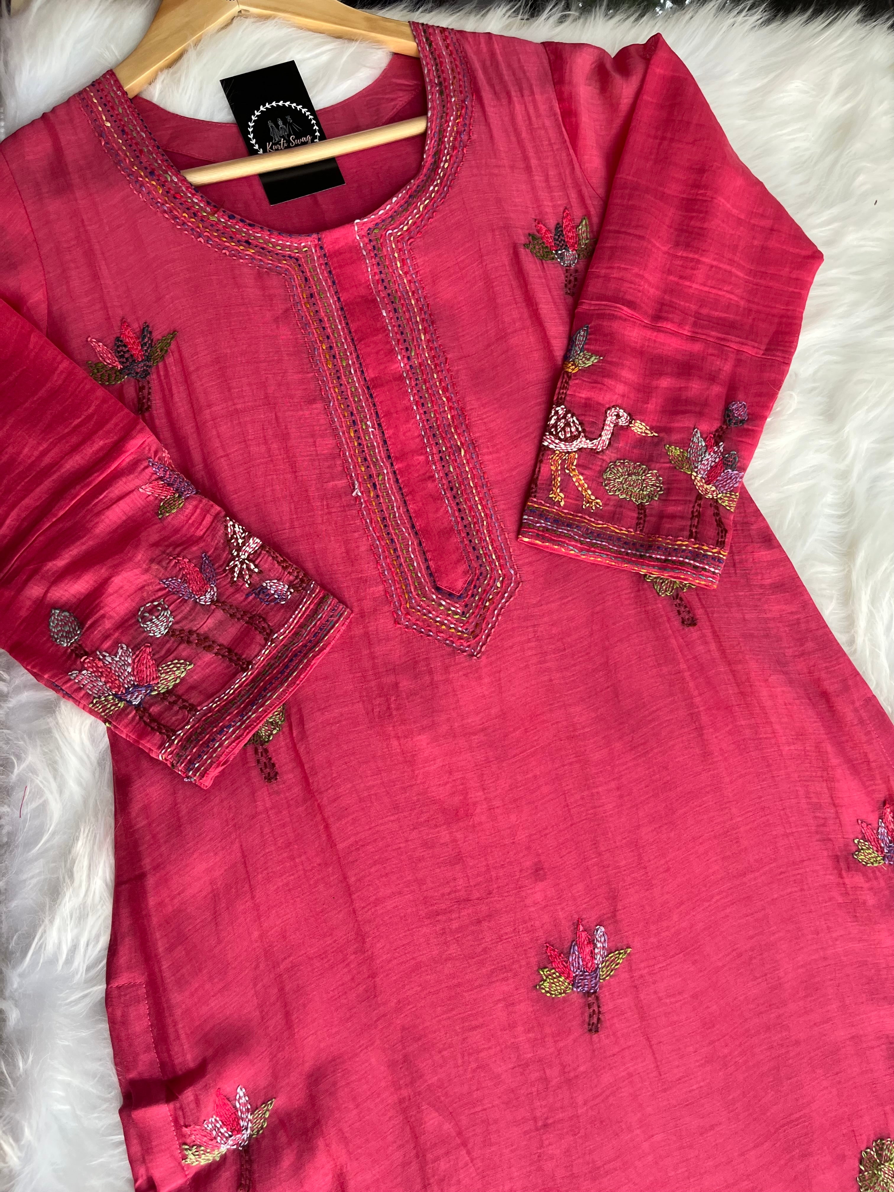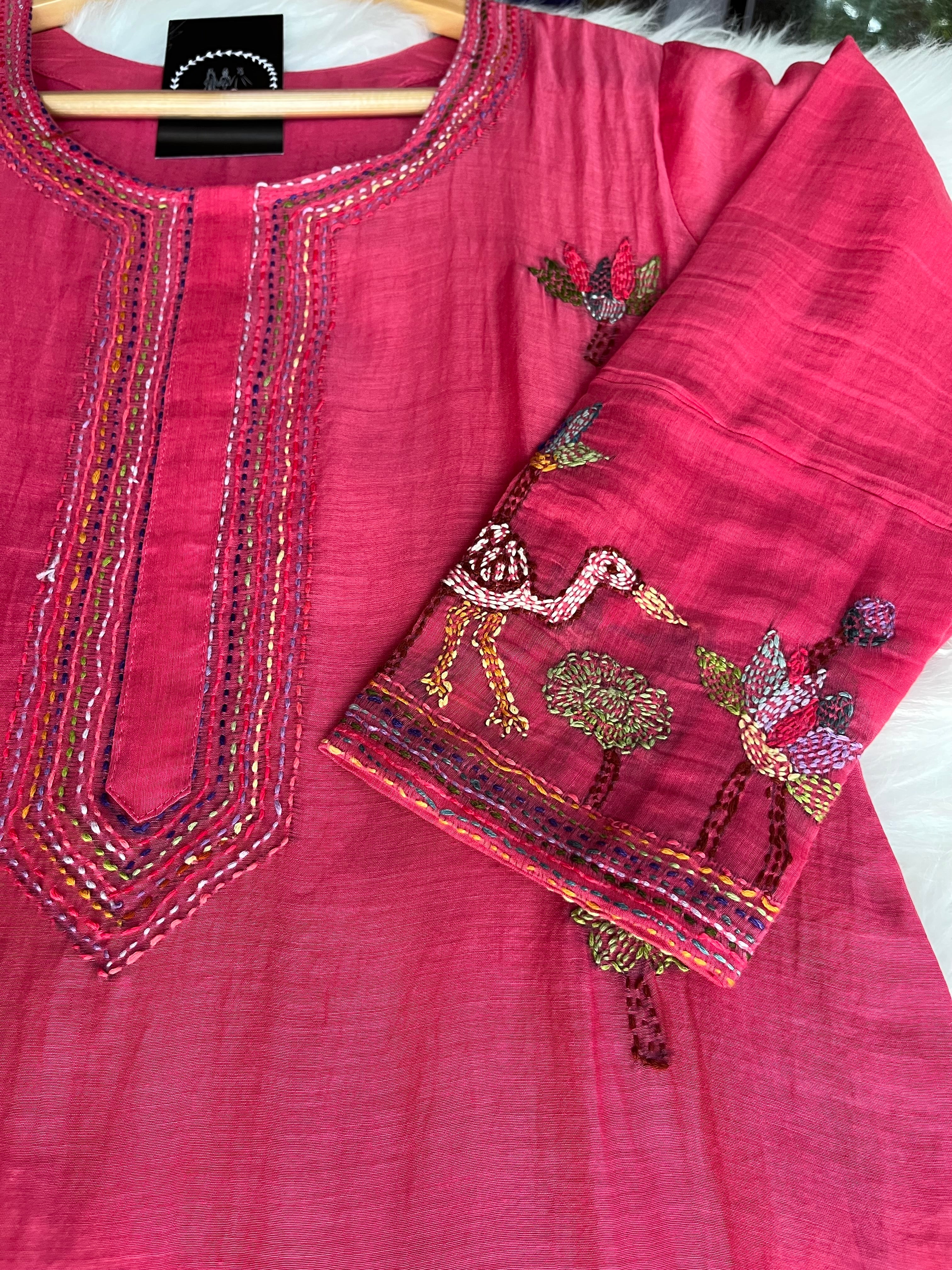 ✅ Premium Mul Chanderi Kurti With Kantha Handwork On The Neckline Of The Kurti