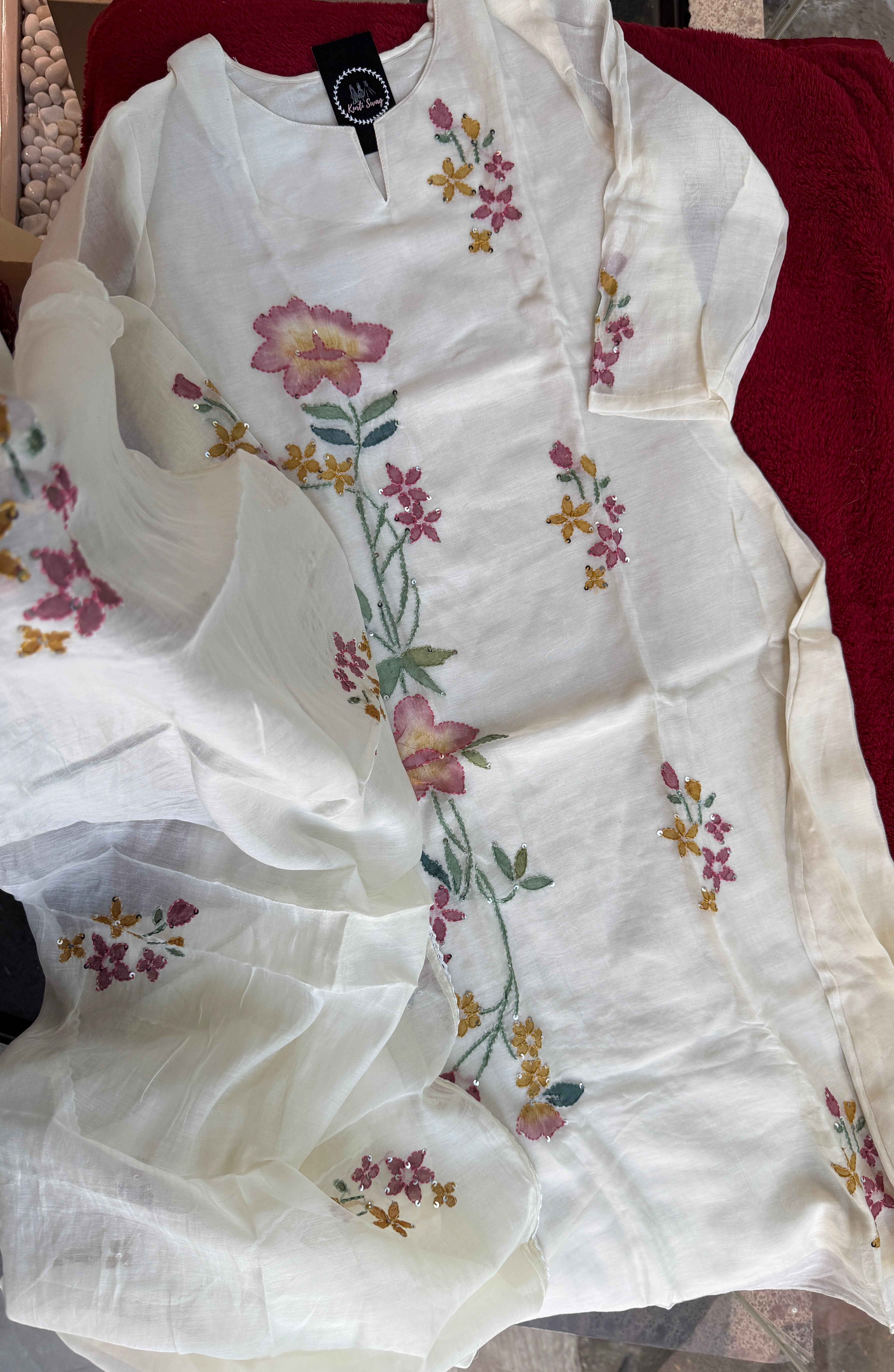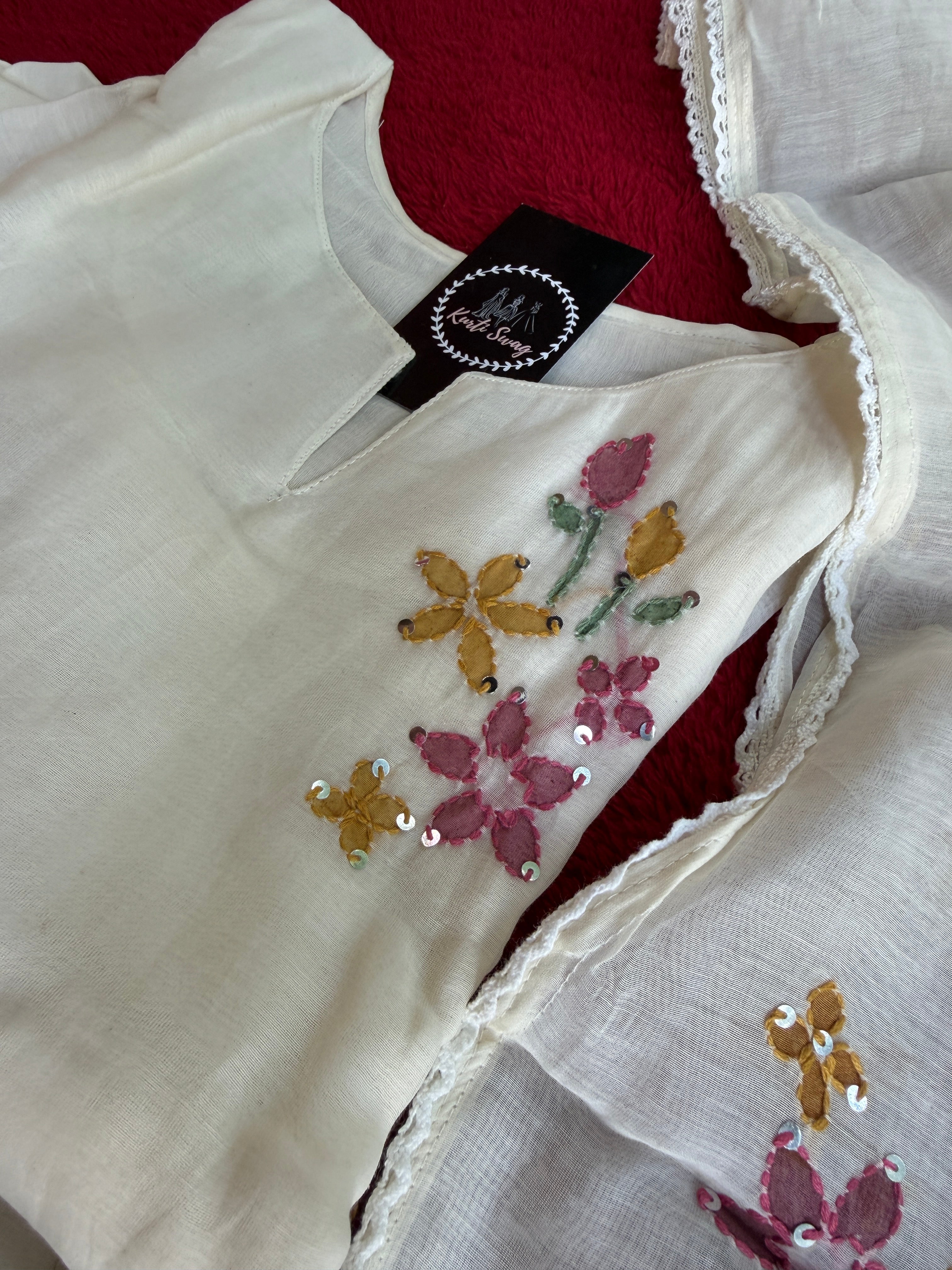 ✅ Premium Mul Chanderi A Line Kurti With Handpaint, Kantha & Sequin Handwork on the The Kurti