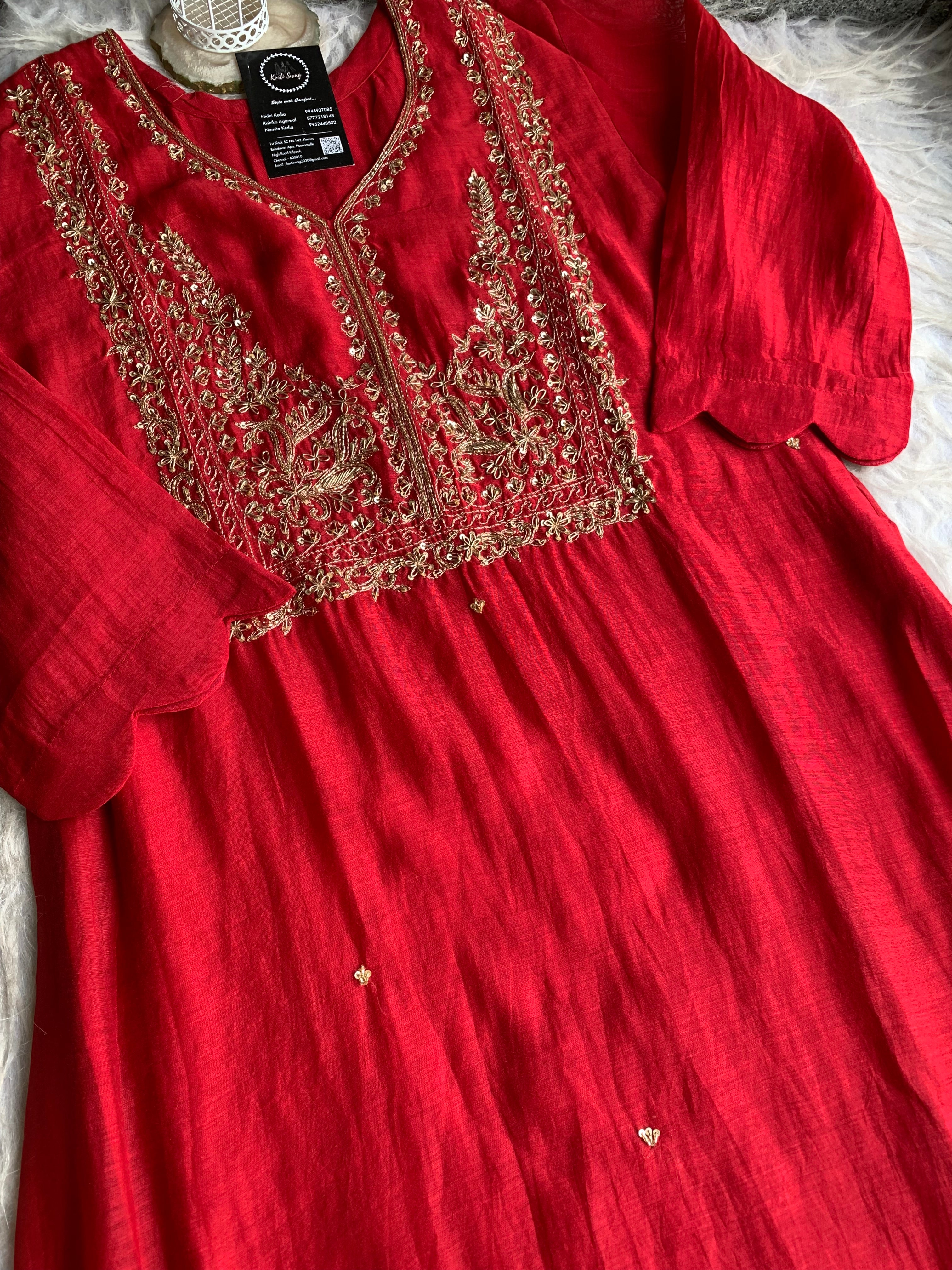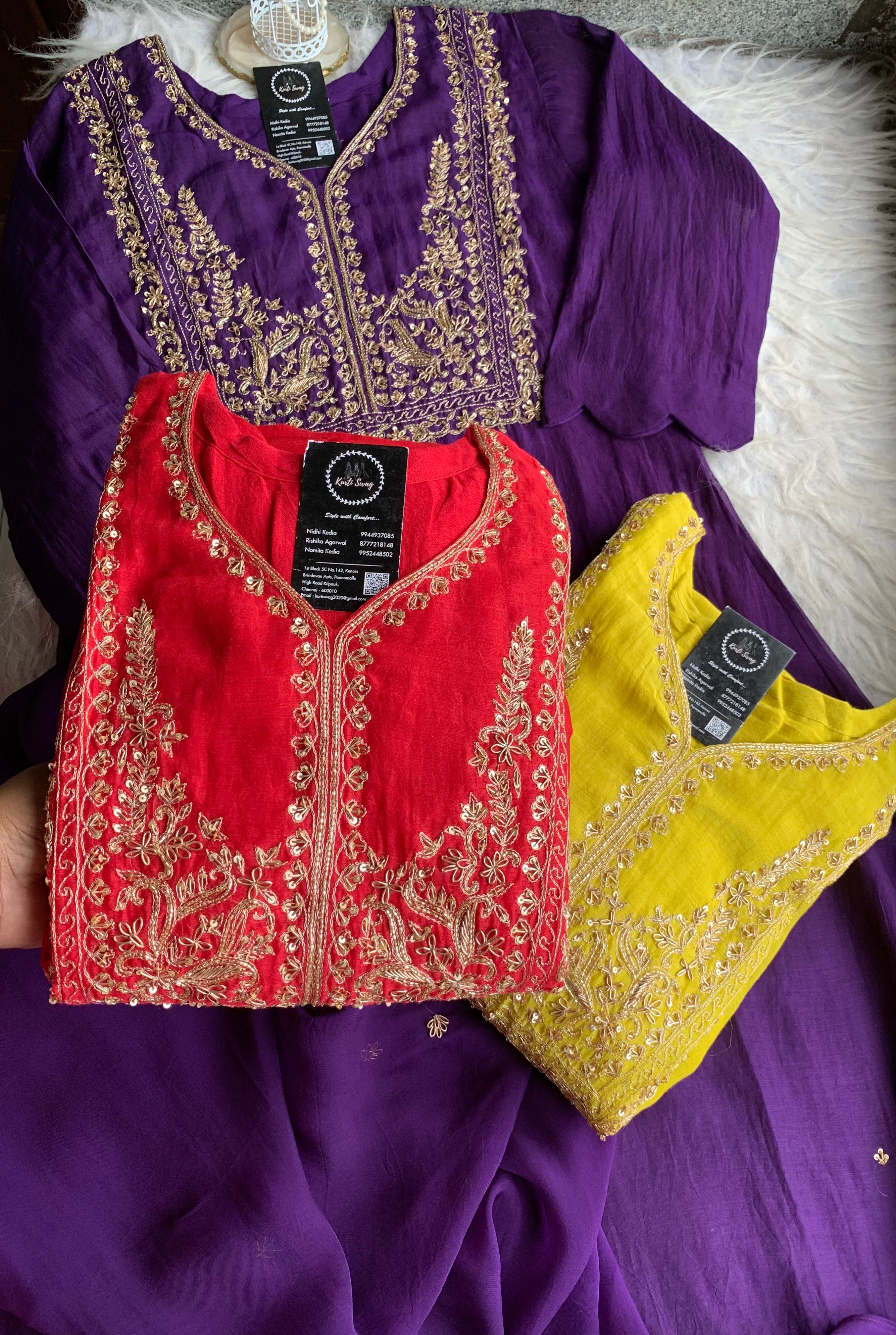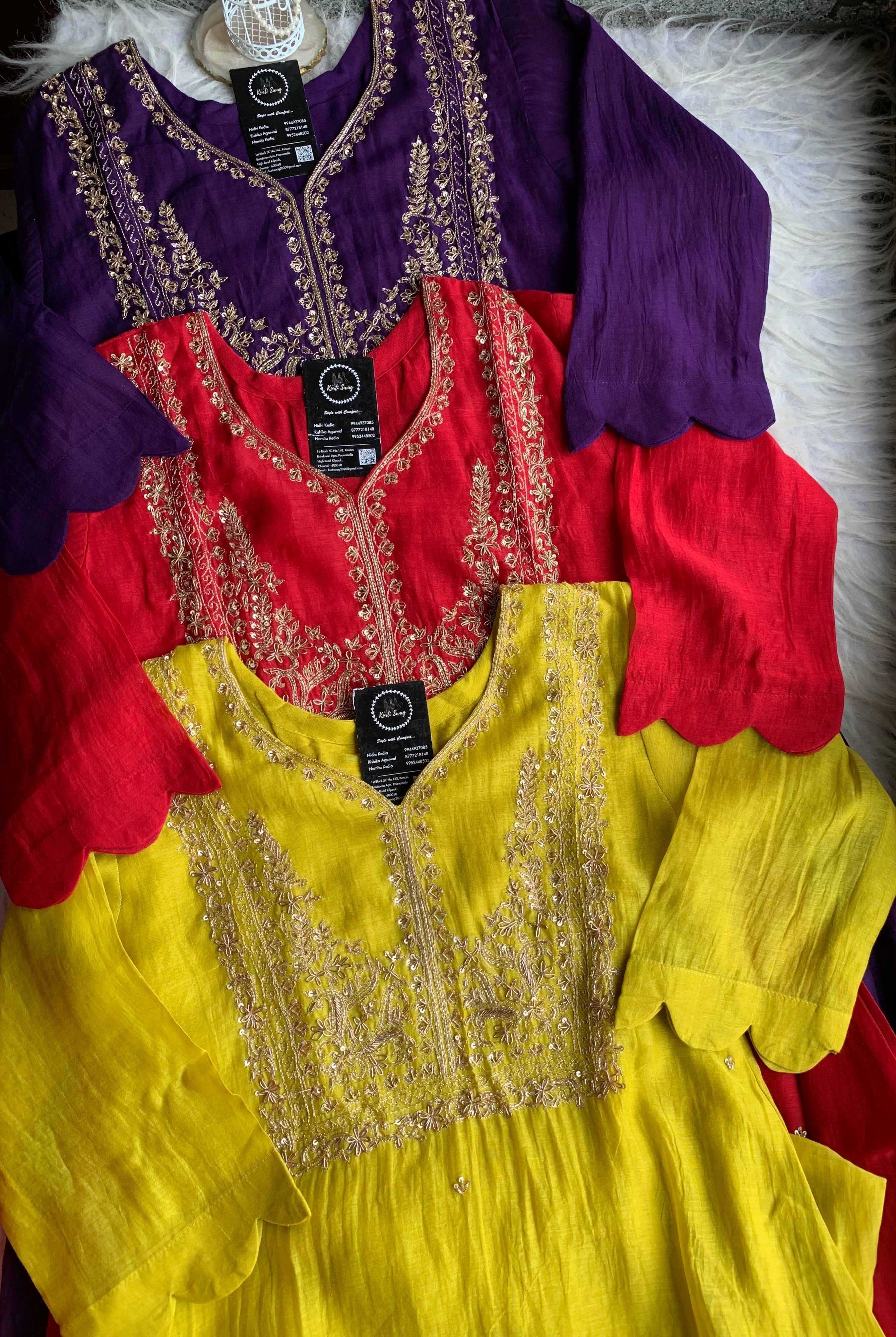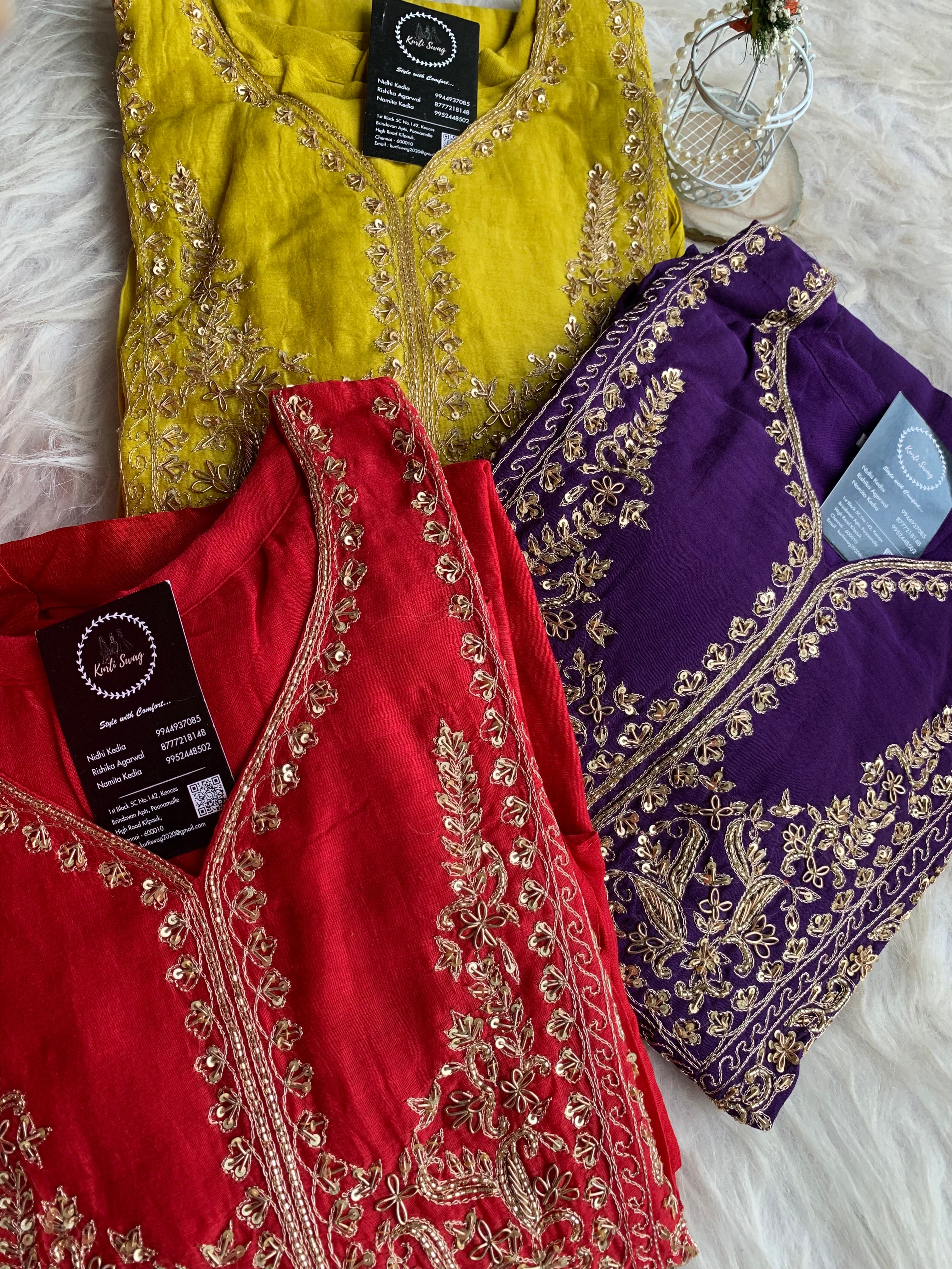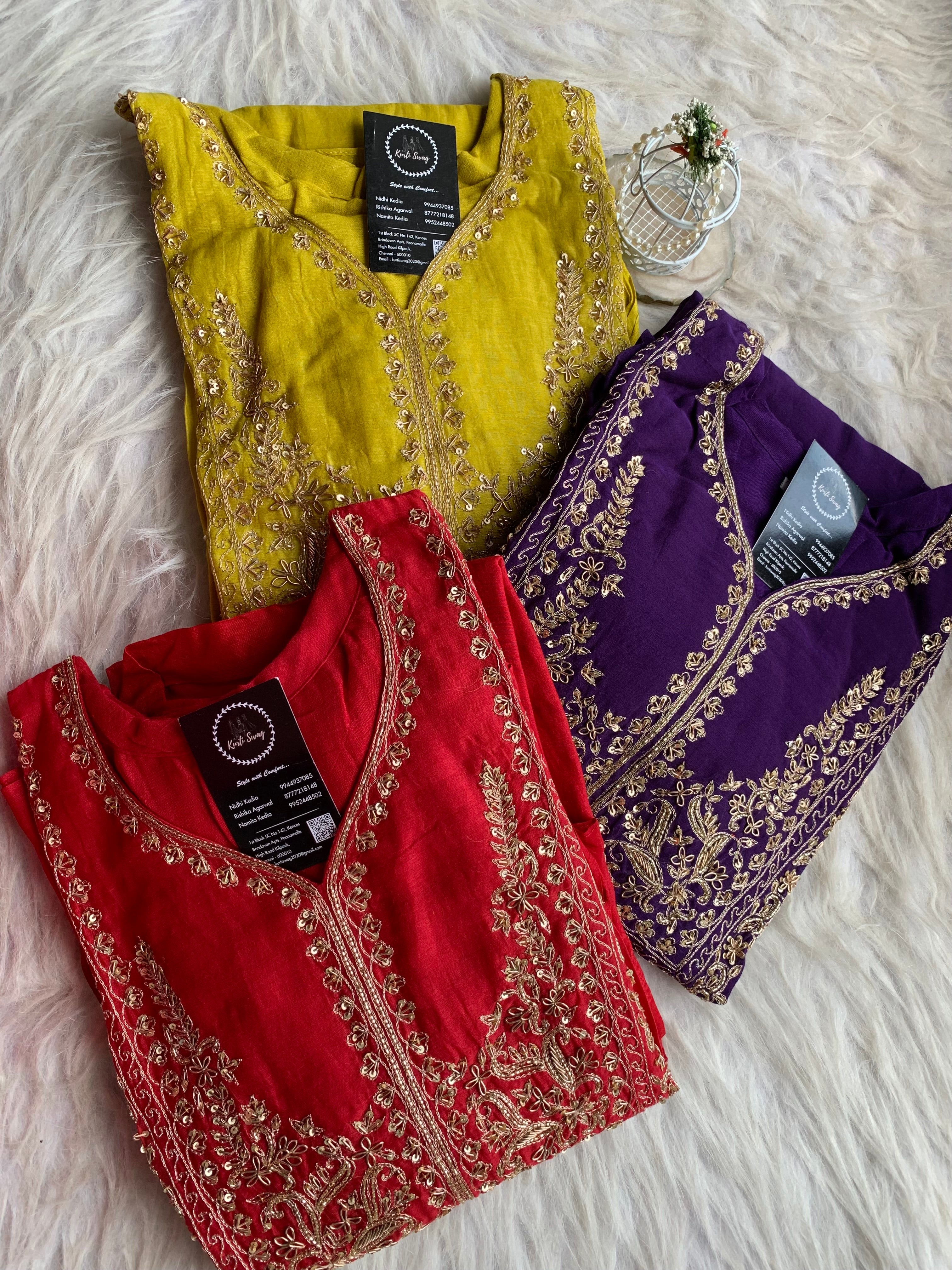 ✅ Premium Mul Chanderi Kurti With Zardosi Work On The Yoke Of The Kurti