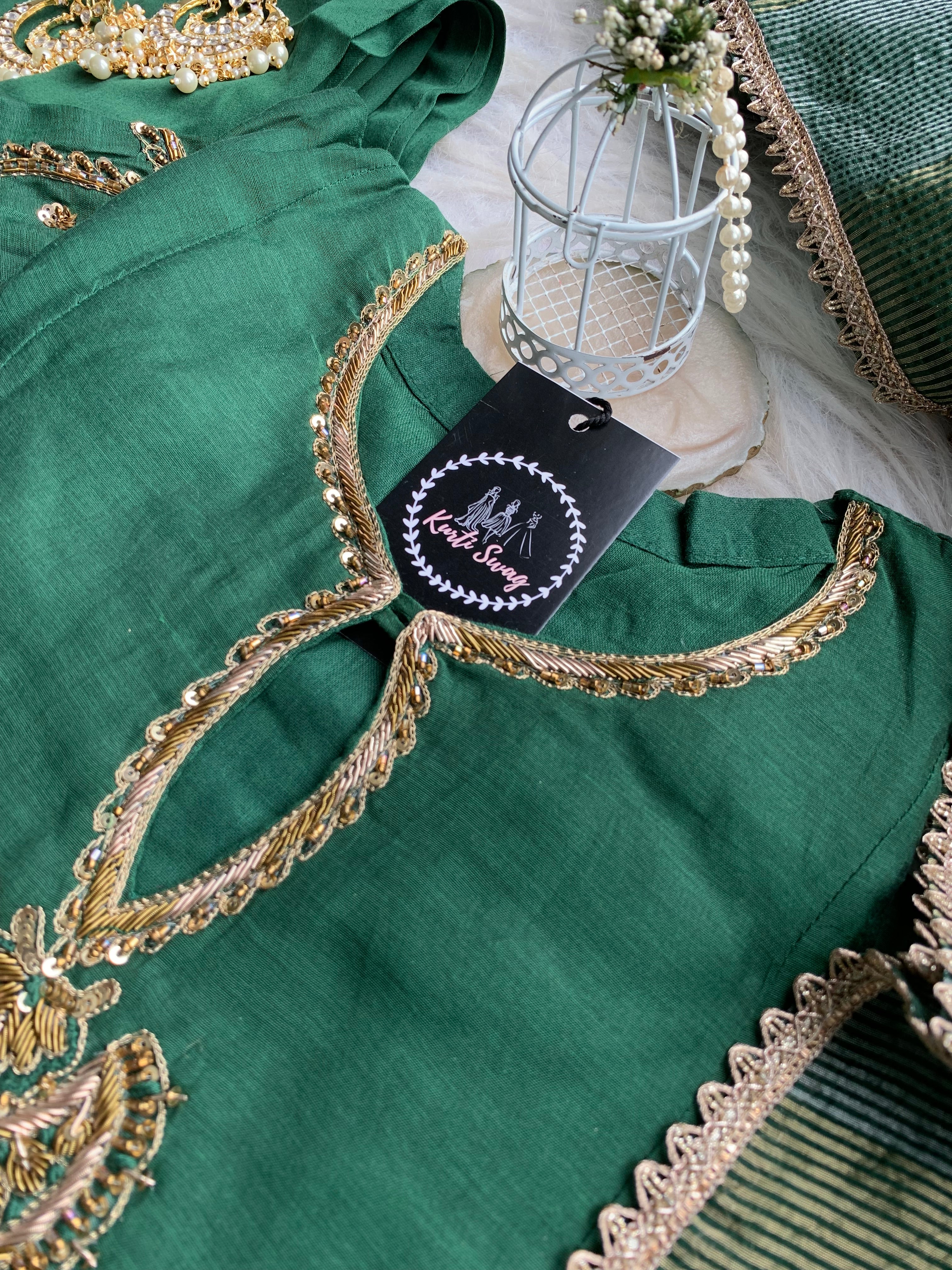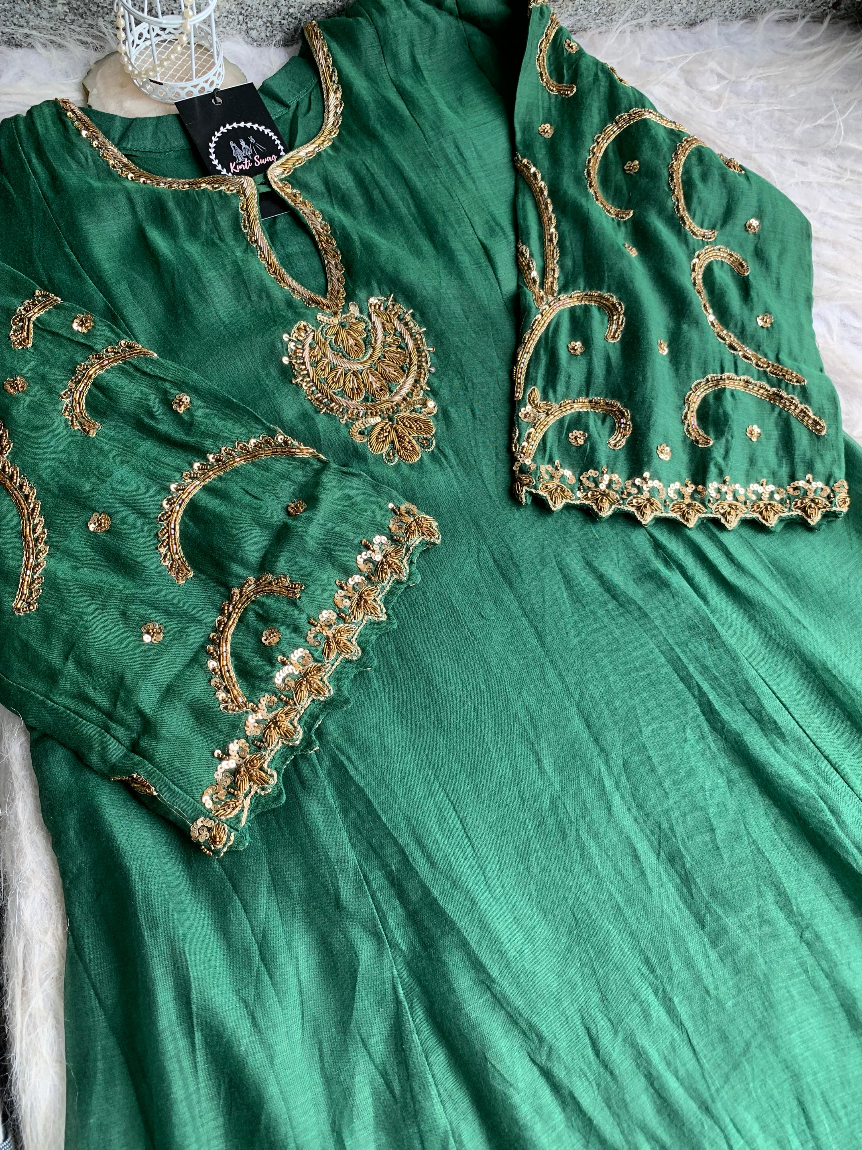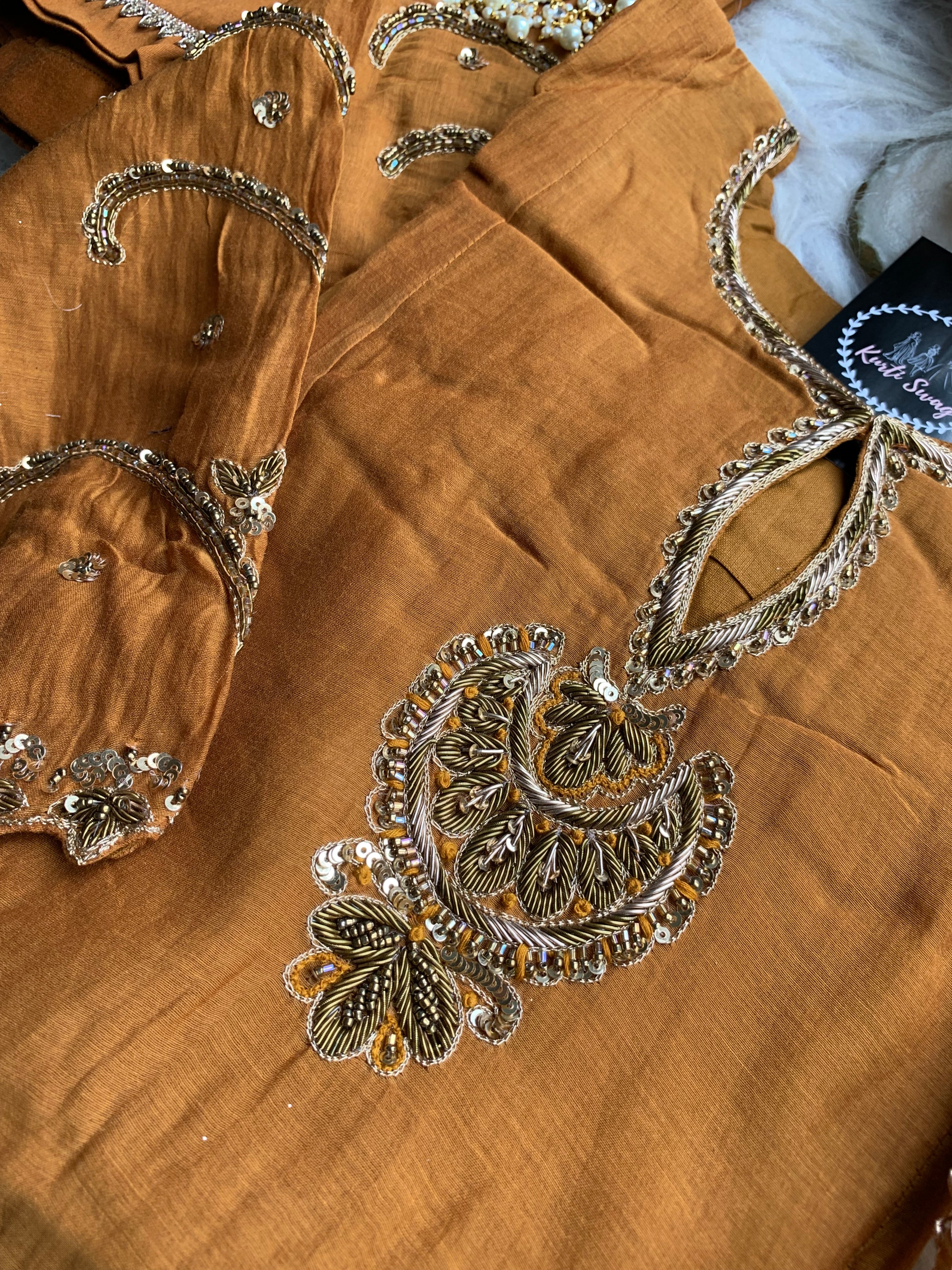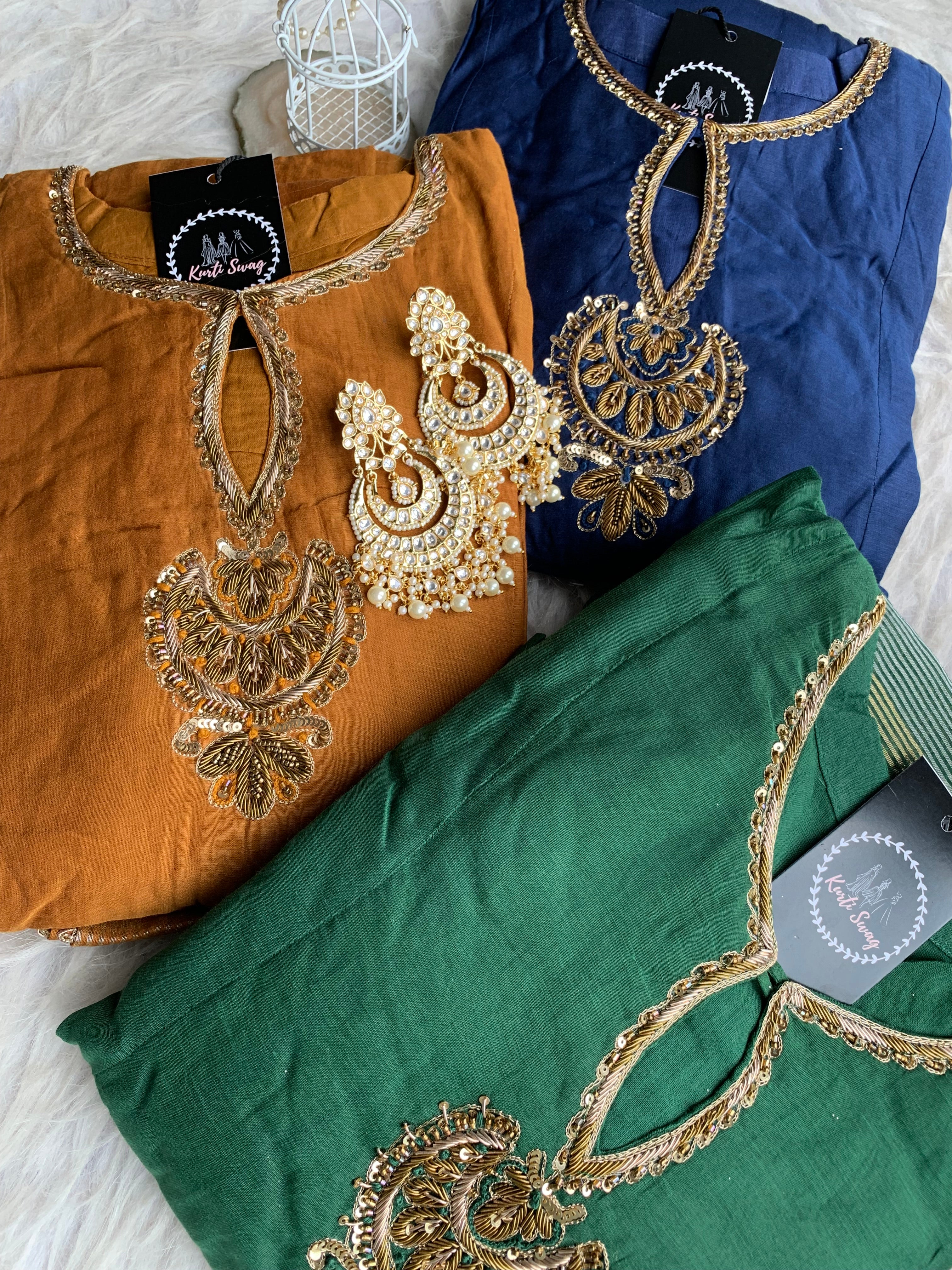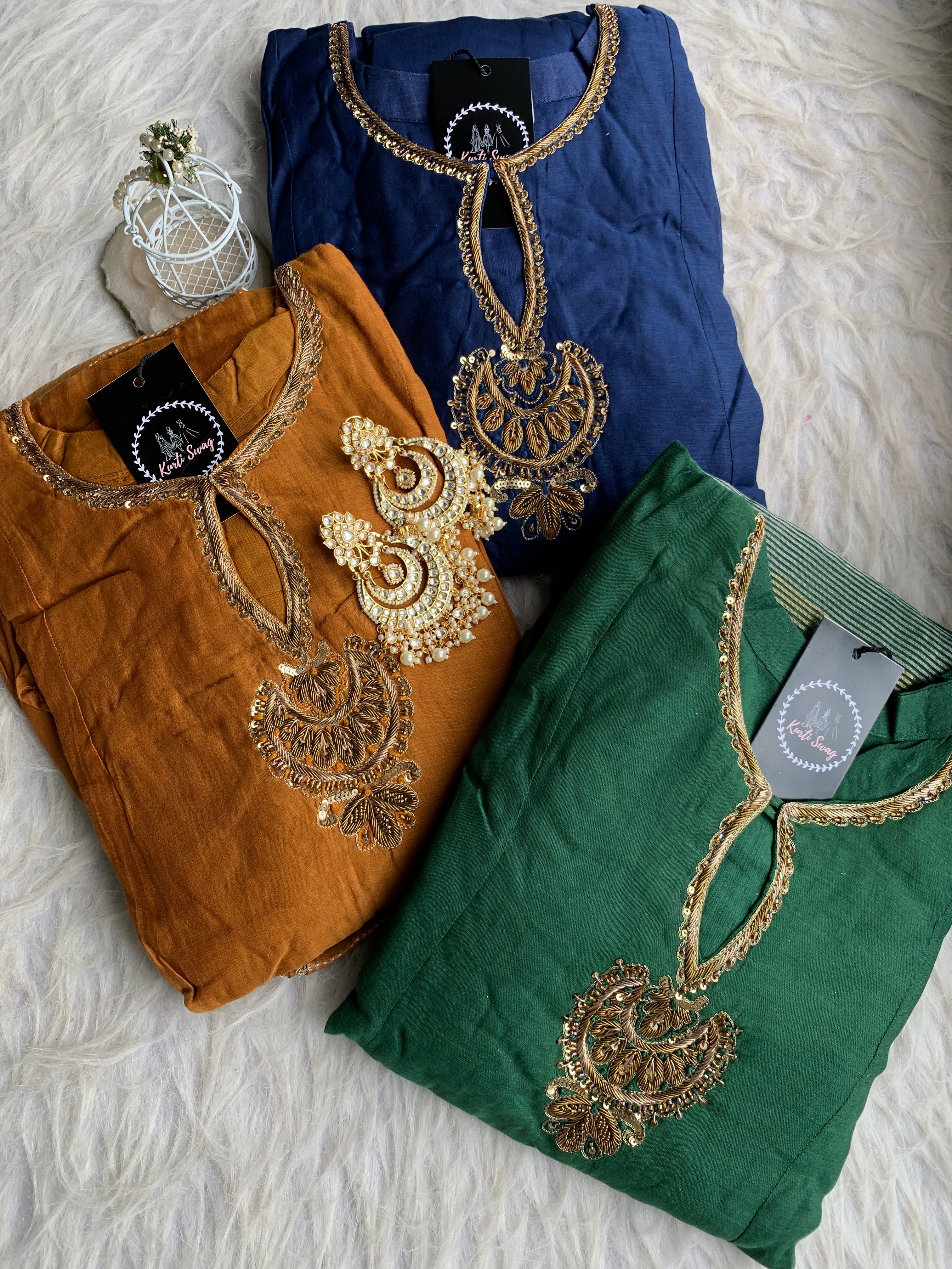 ✅ Premium Mul Chanderi Kurti With Zardosi, Dabka Amd Sequins HandWork On The Neckline Of The Kurti