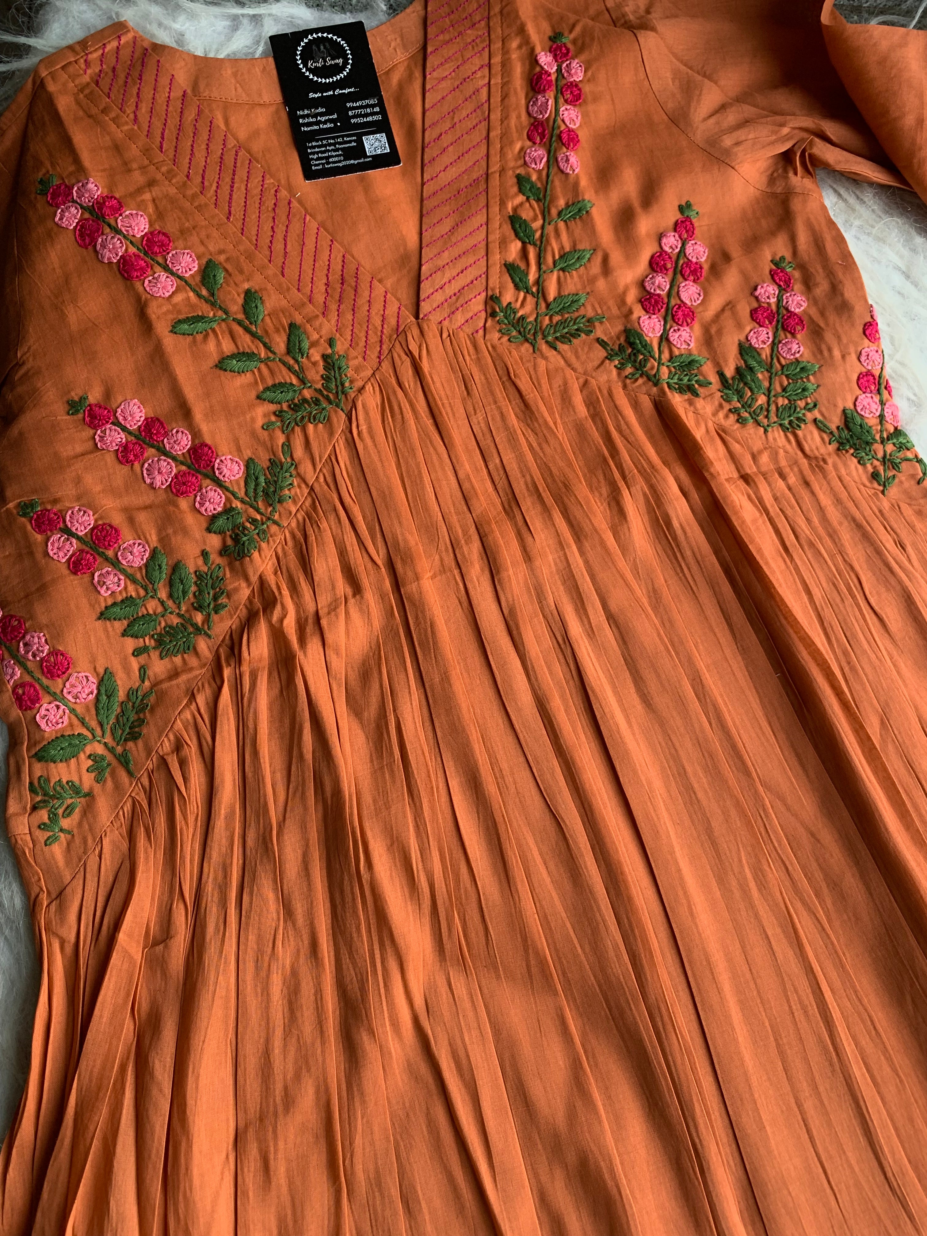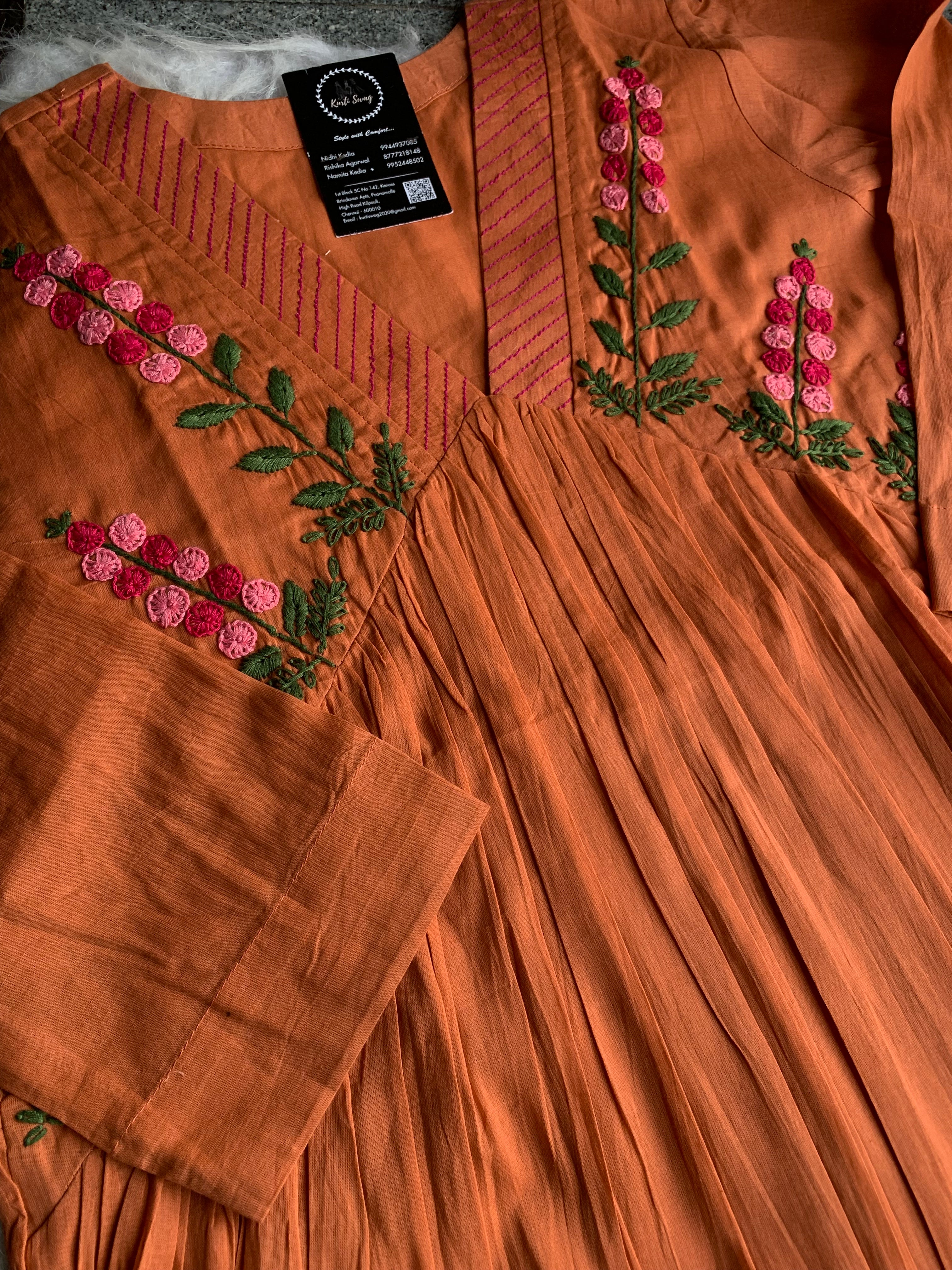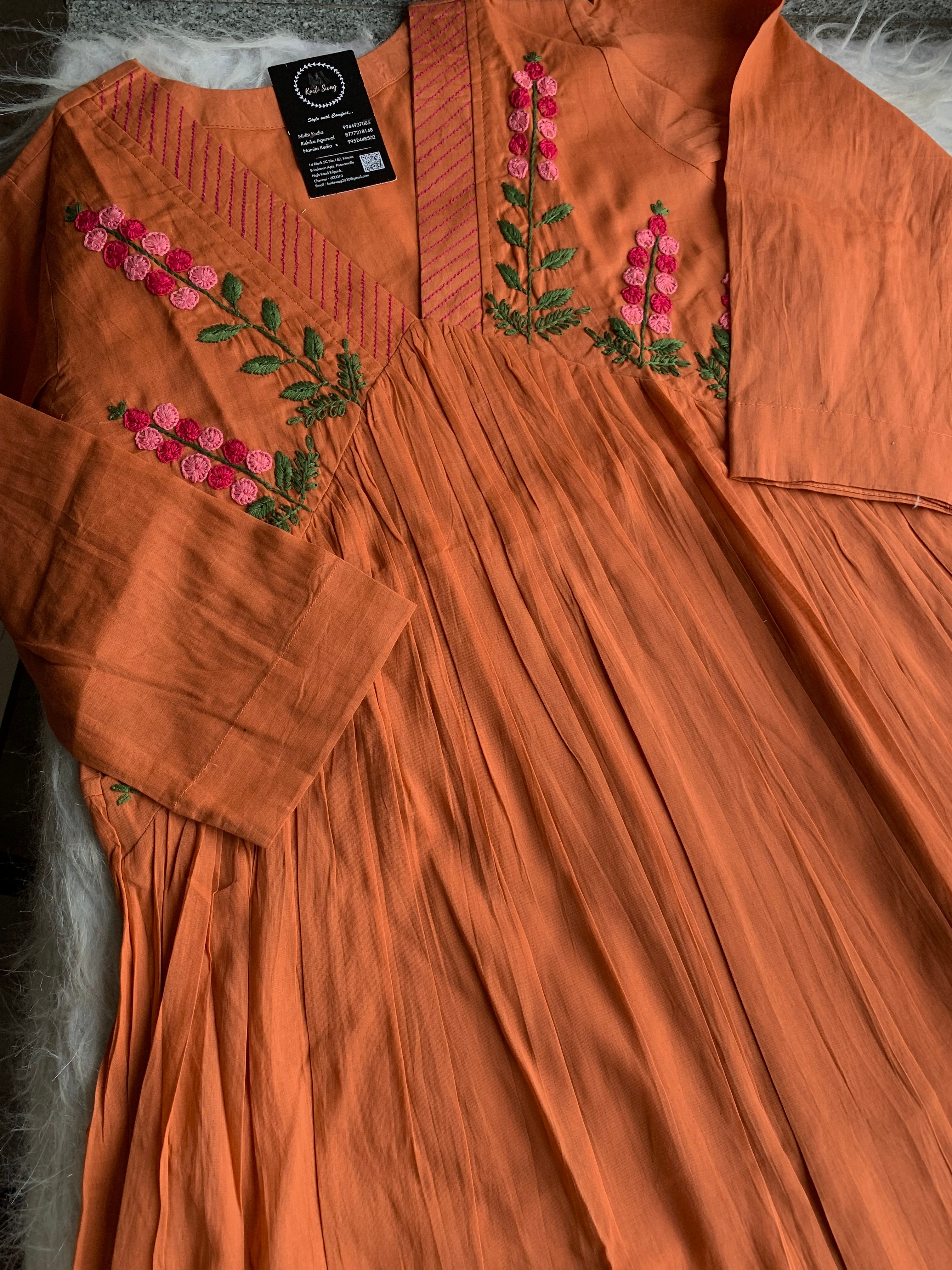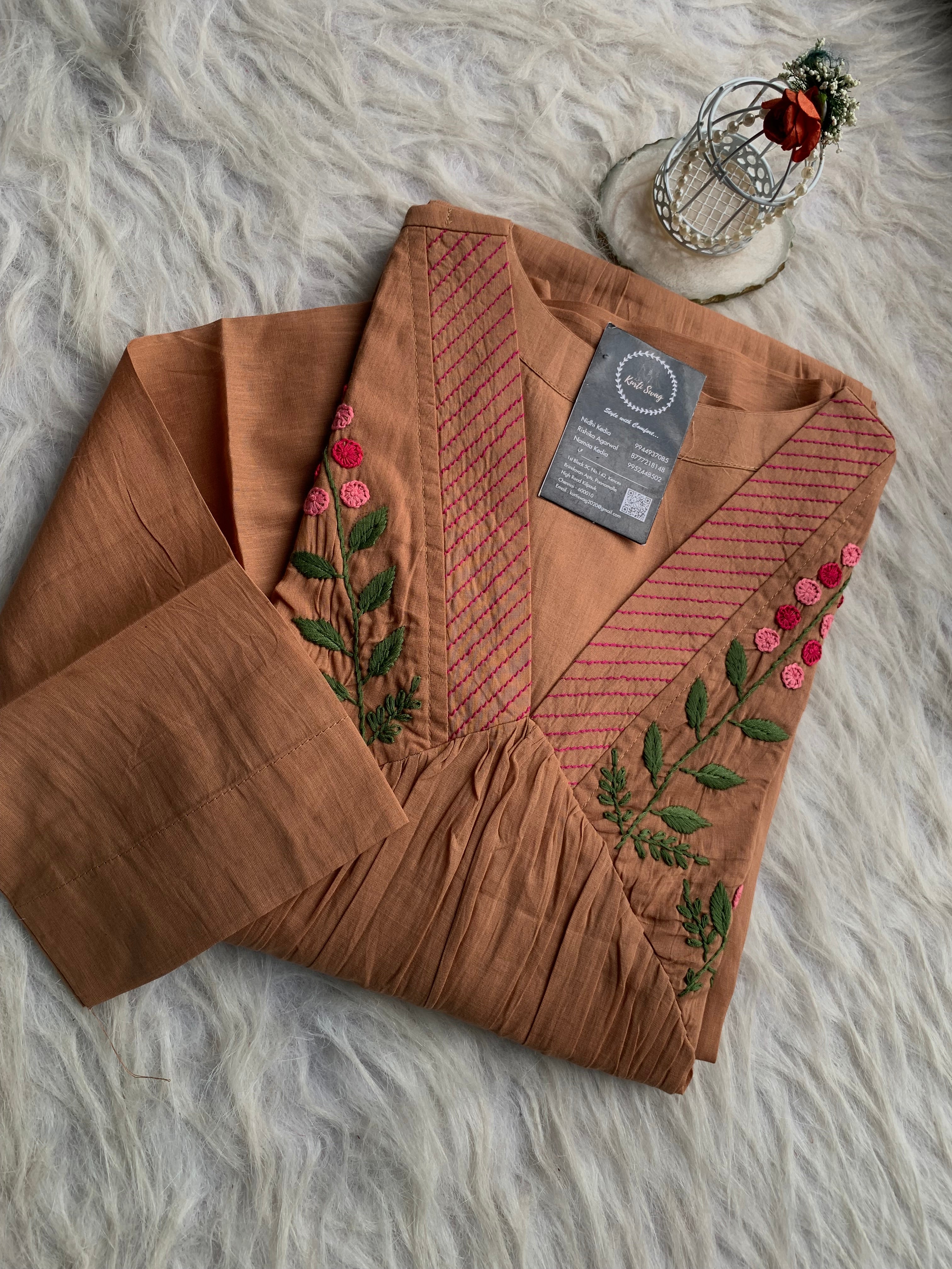 ✅ Organic cotton Kurti with thread and hand embroidery on the Kurti (46 inches kurta length)