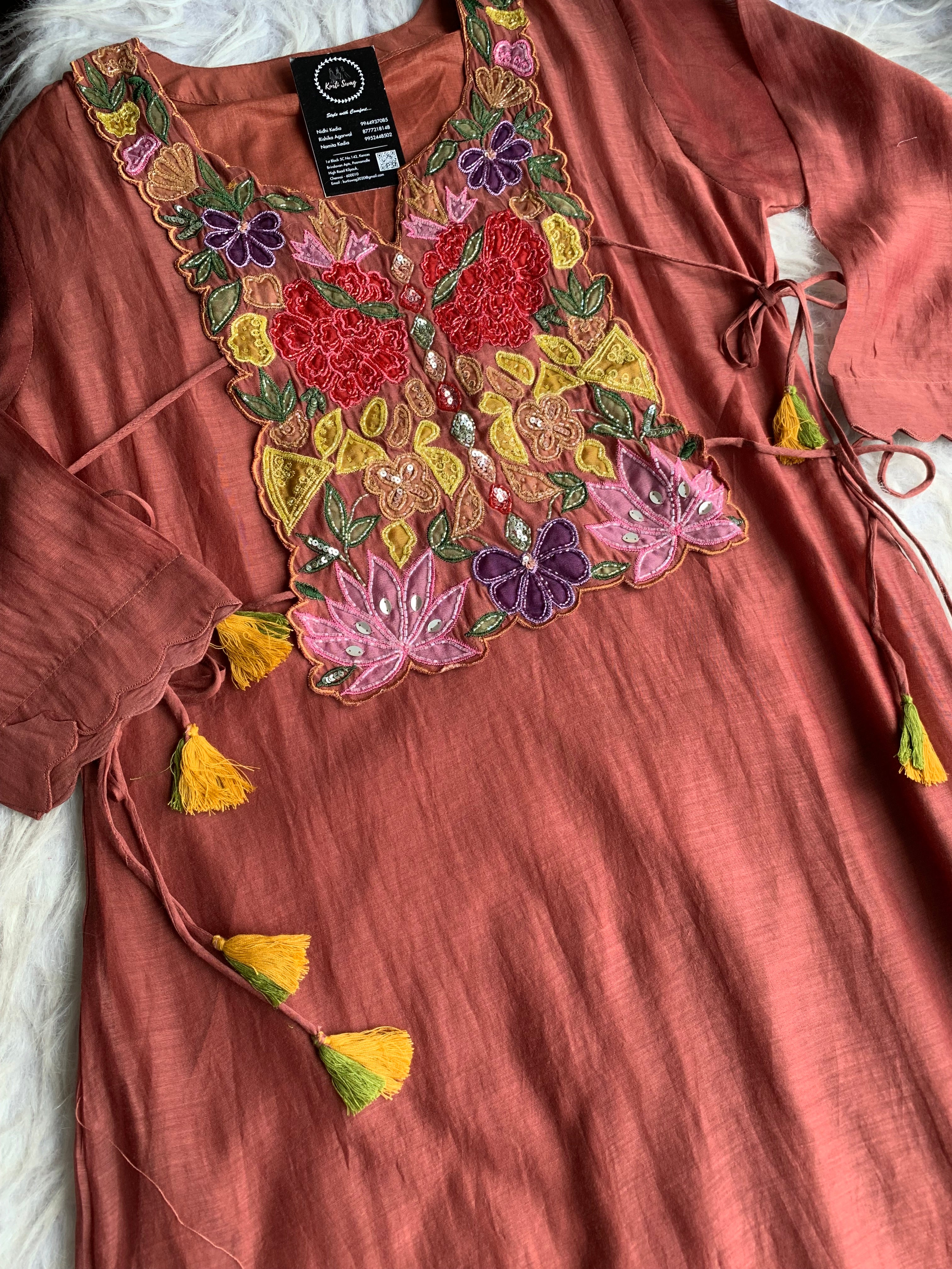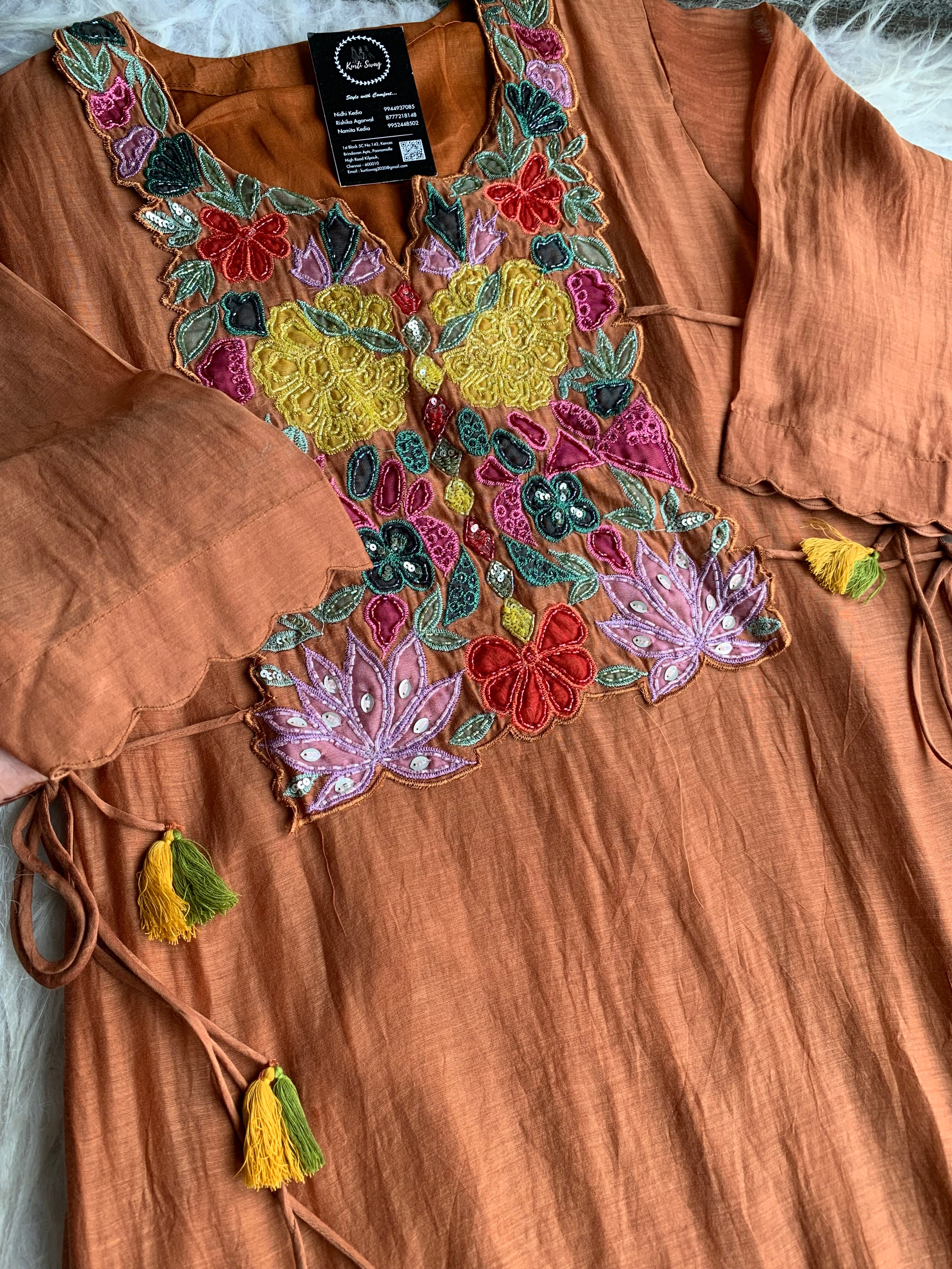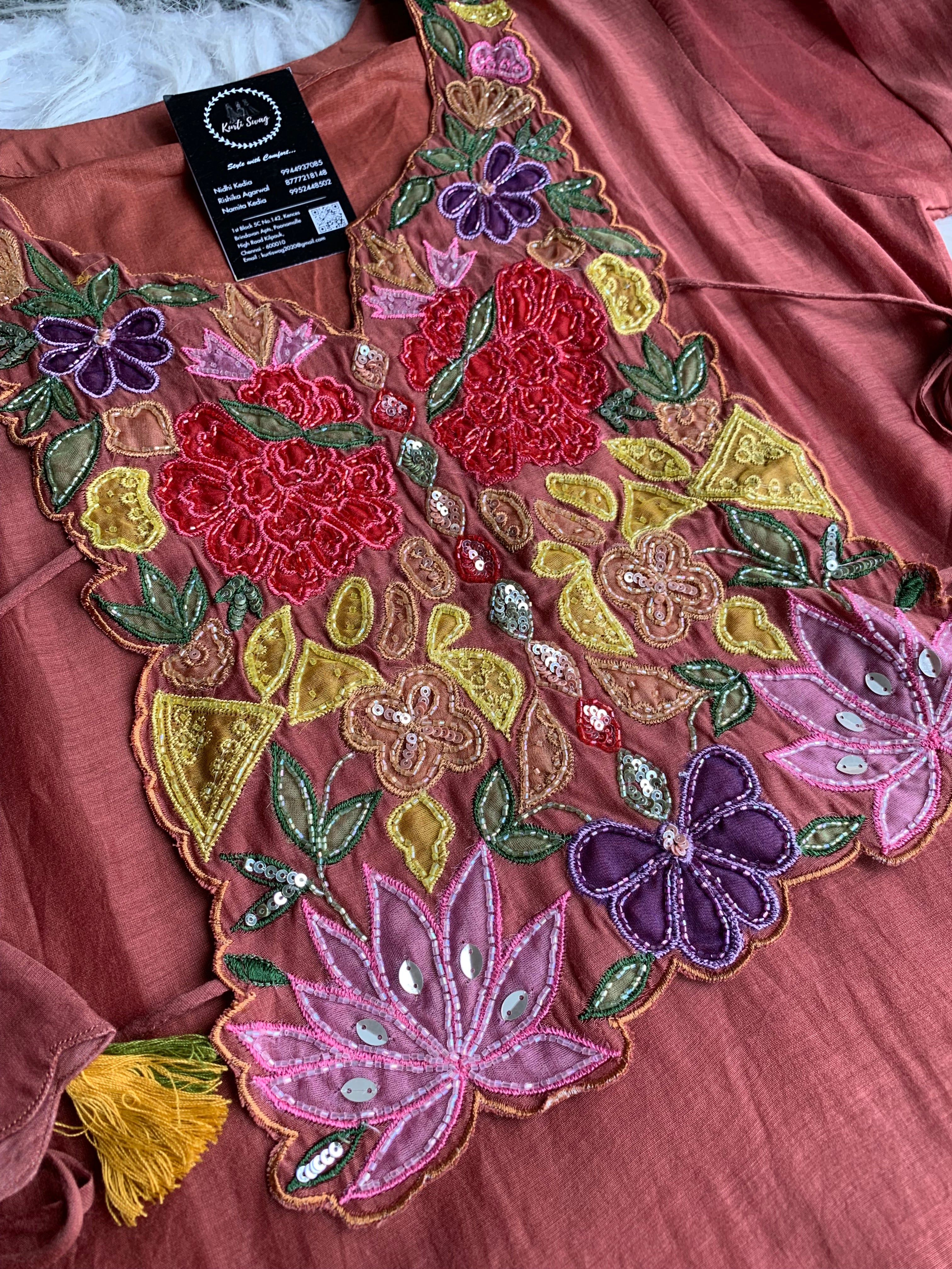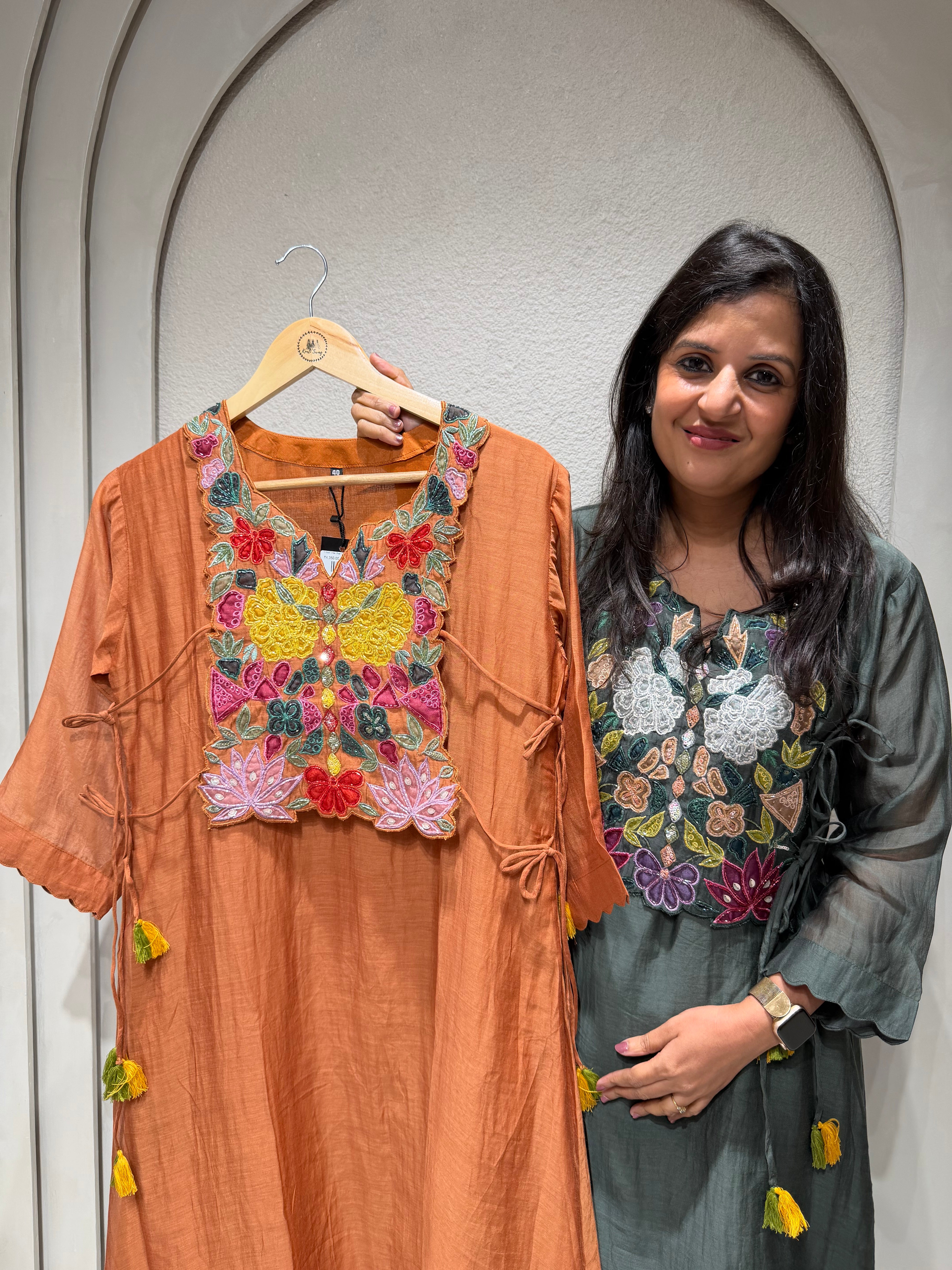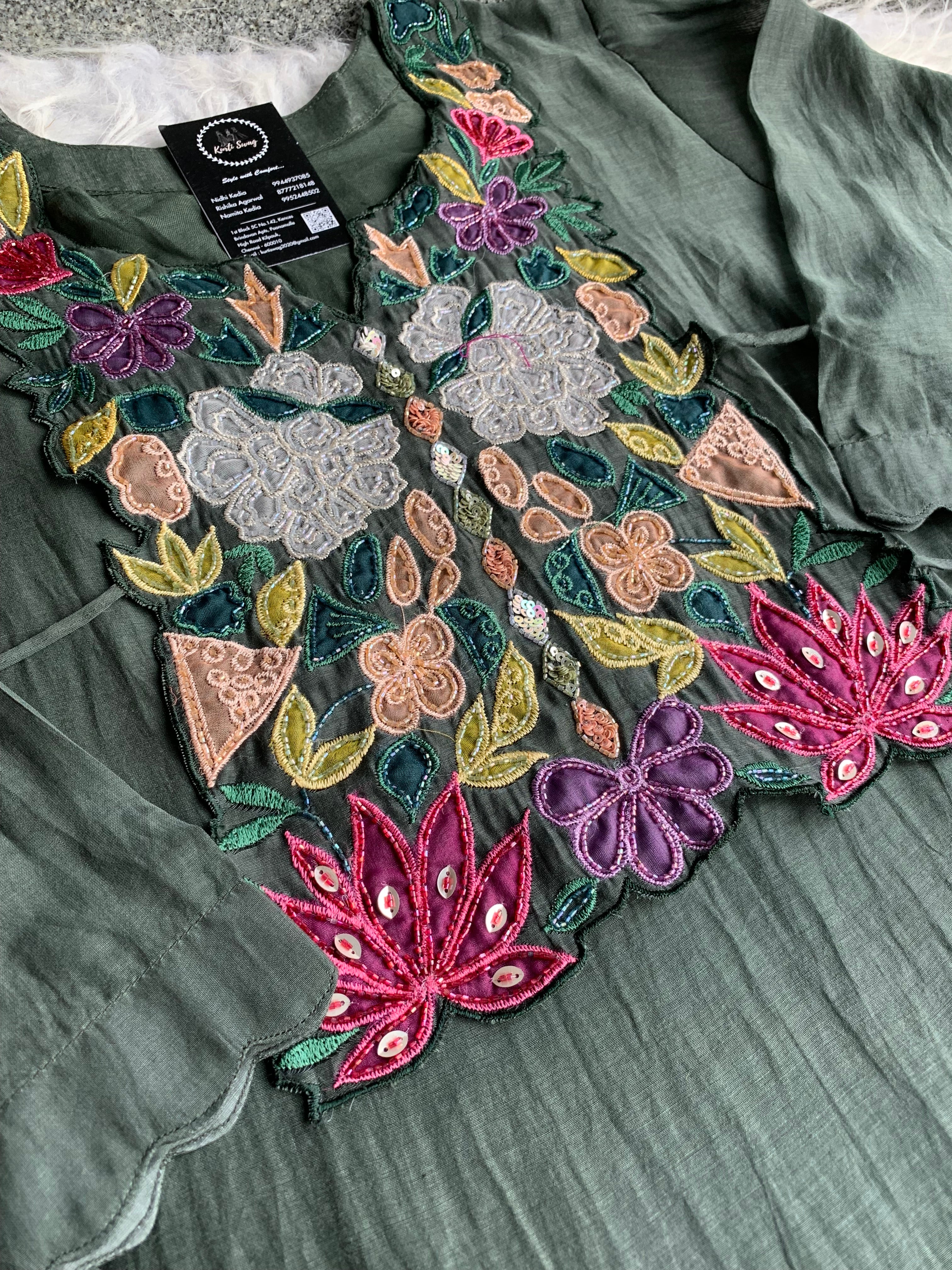 ✅ Premium Mul Chanderi Kurti With thread, Applique And Cutdaana Handwork On The Yoke Of The Kurta