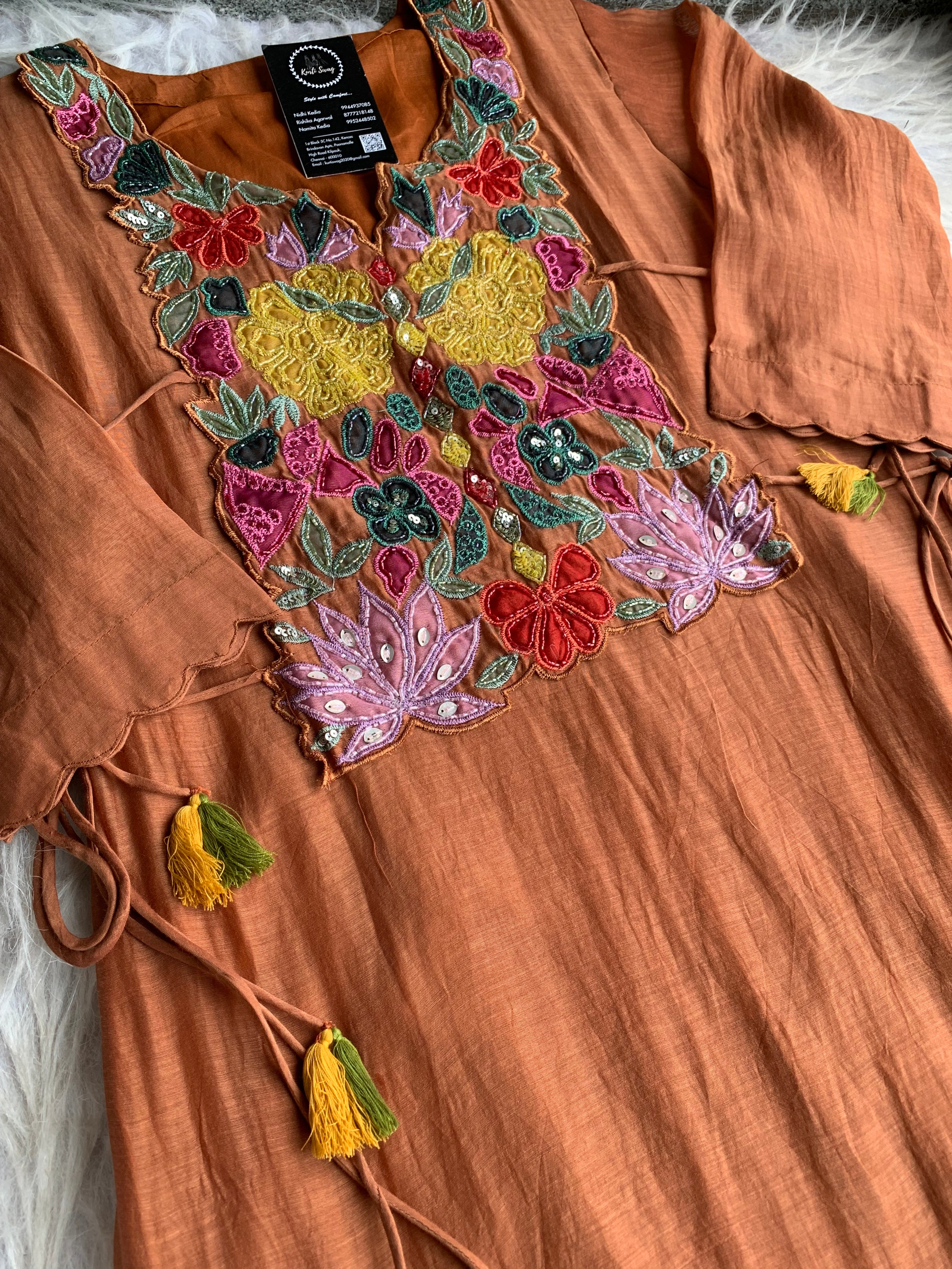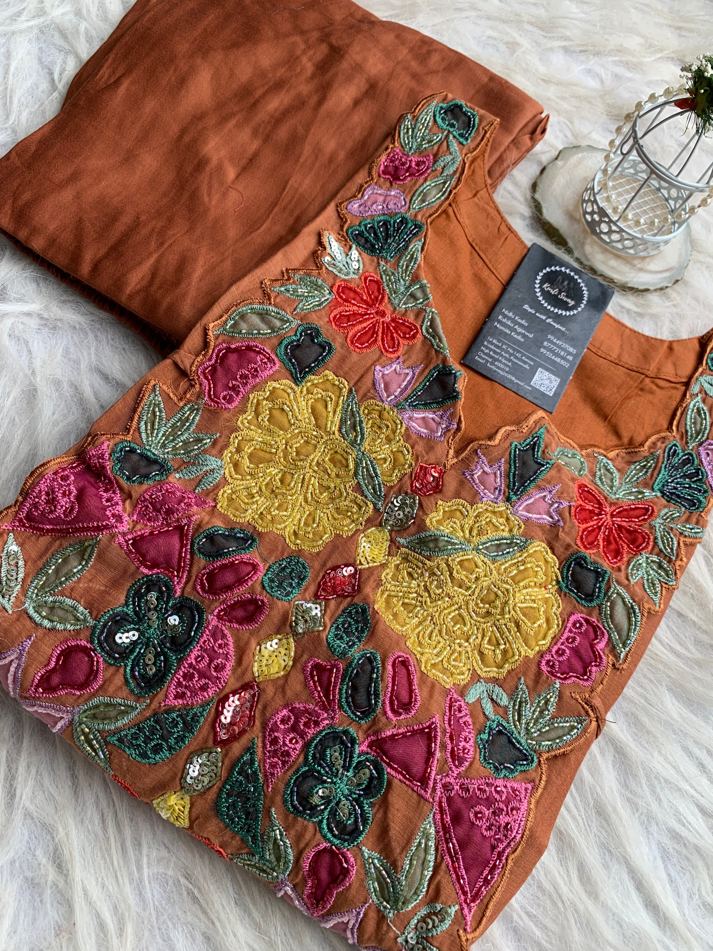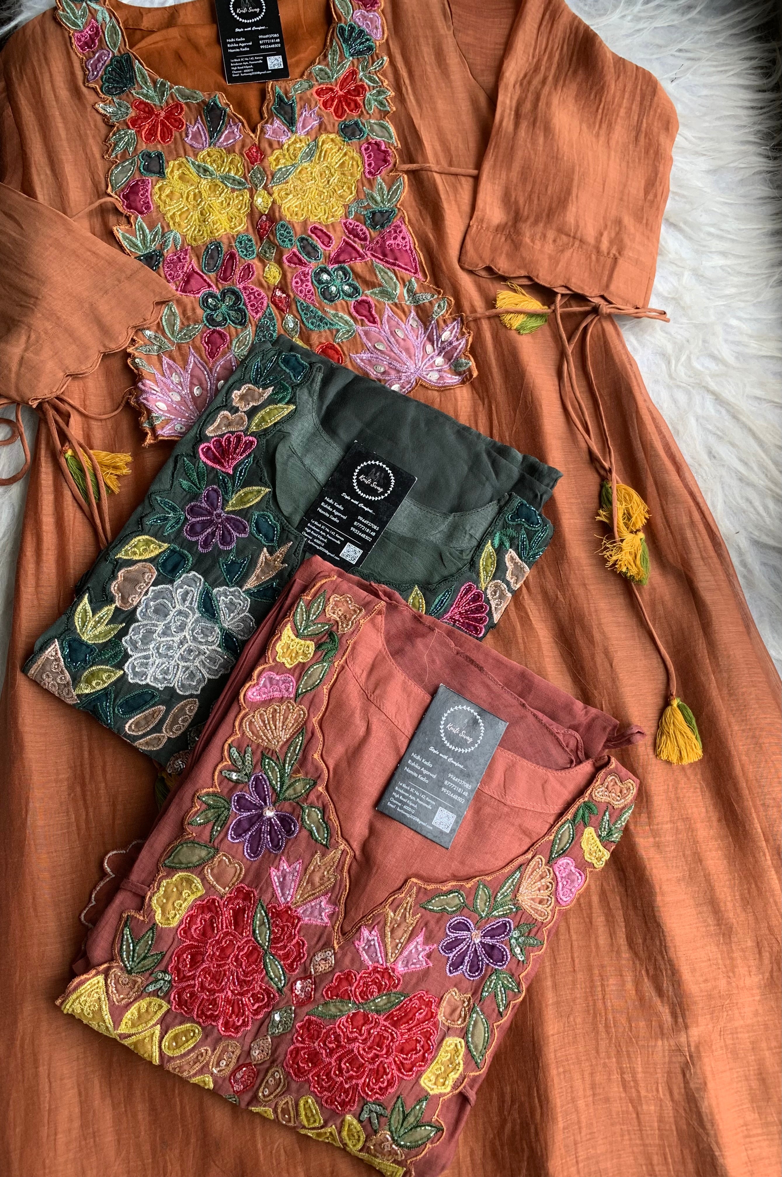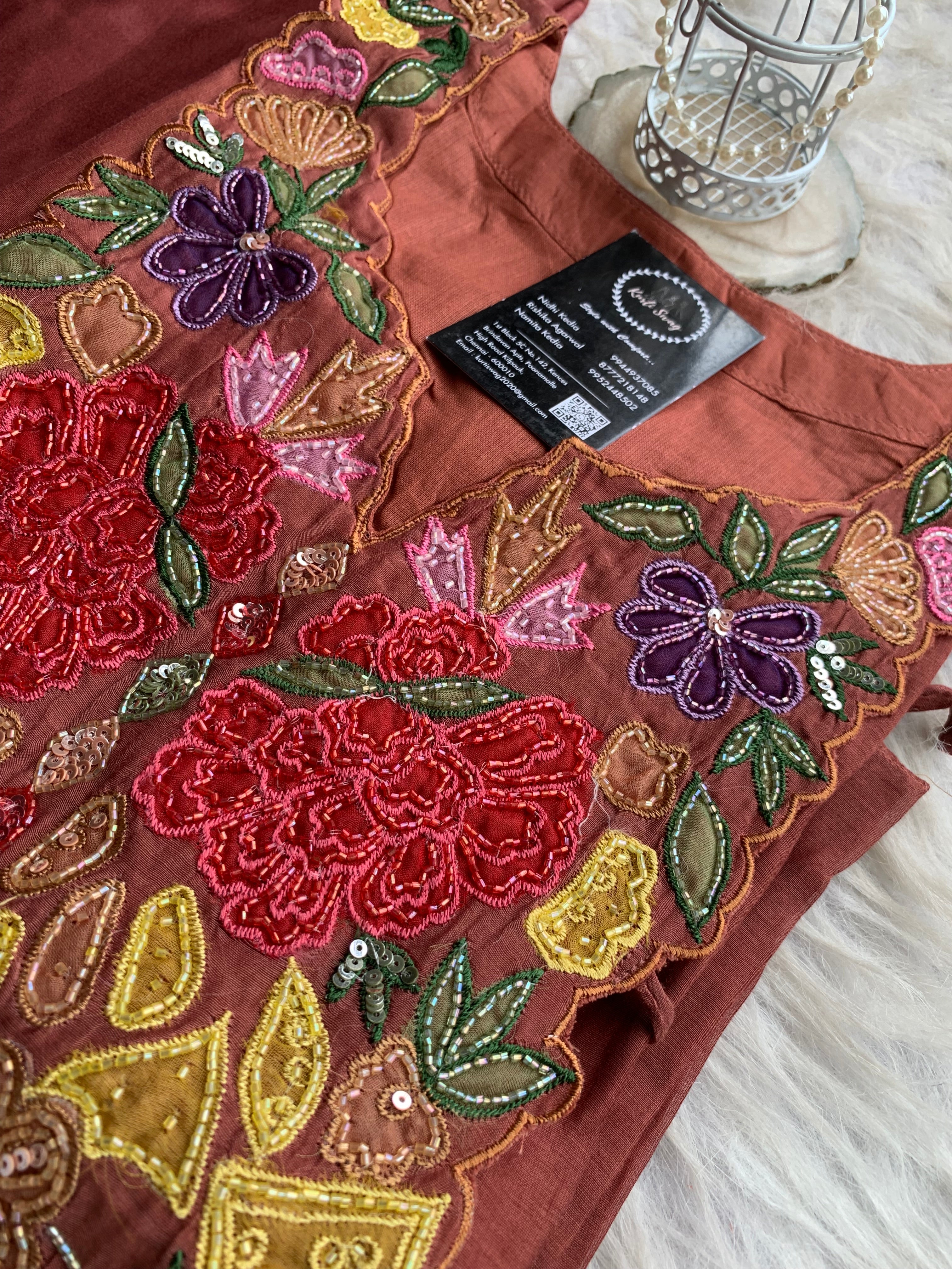 ✅ Premium Mul Chanderi Kurti With thread, Applique And Cutdaana Handwork On The Yoke Of The Kurta