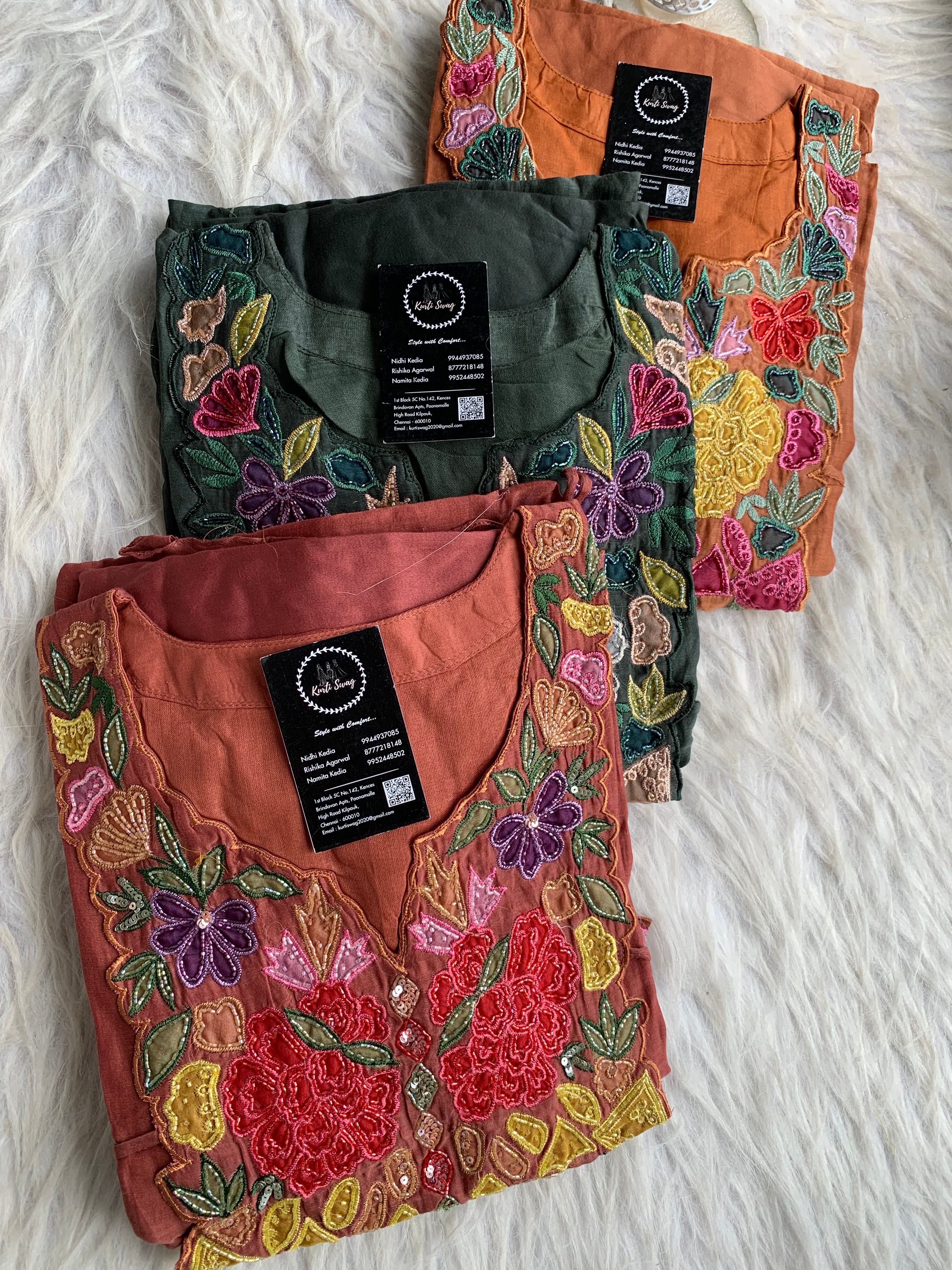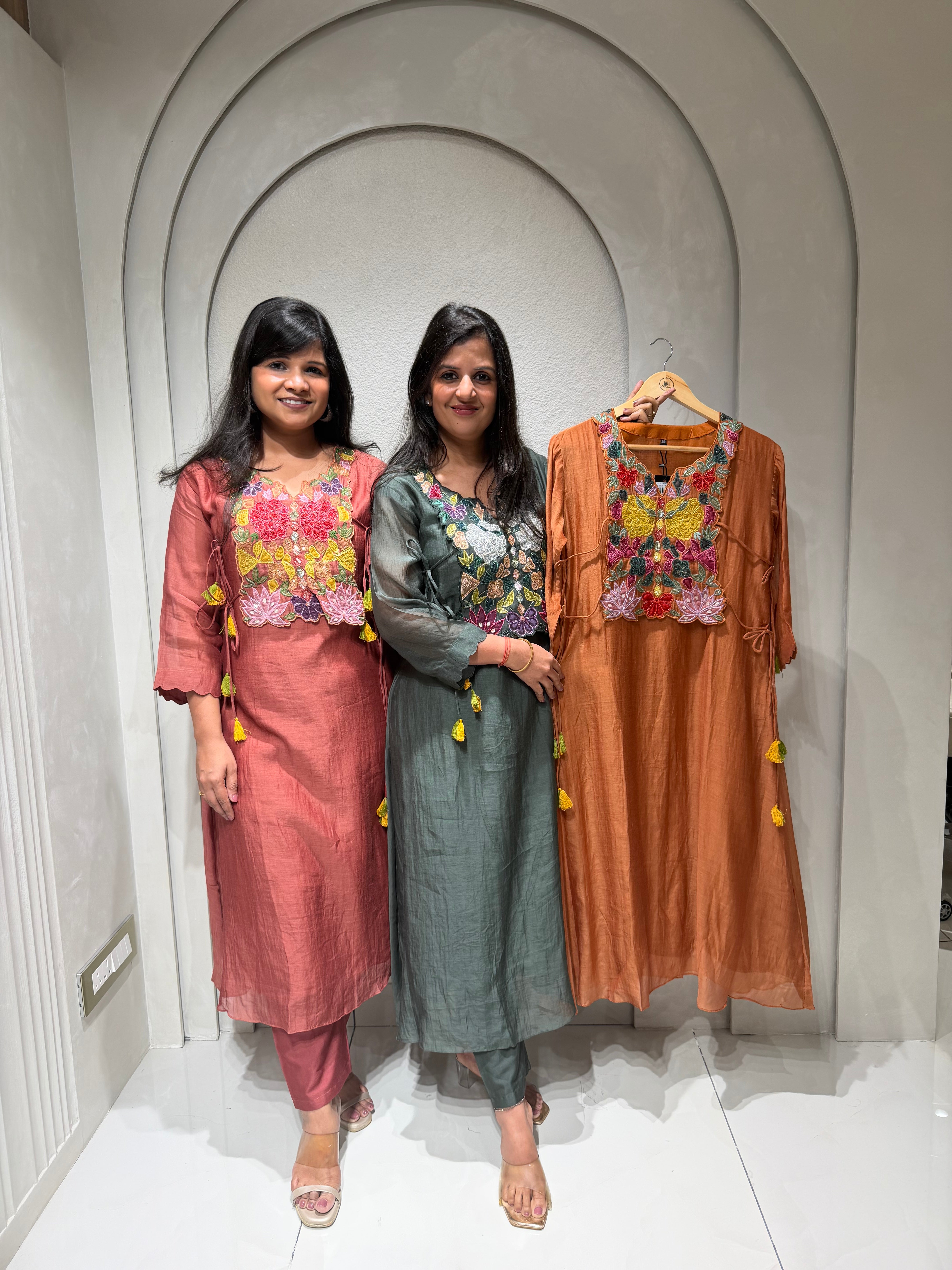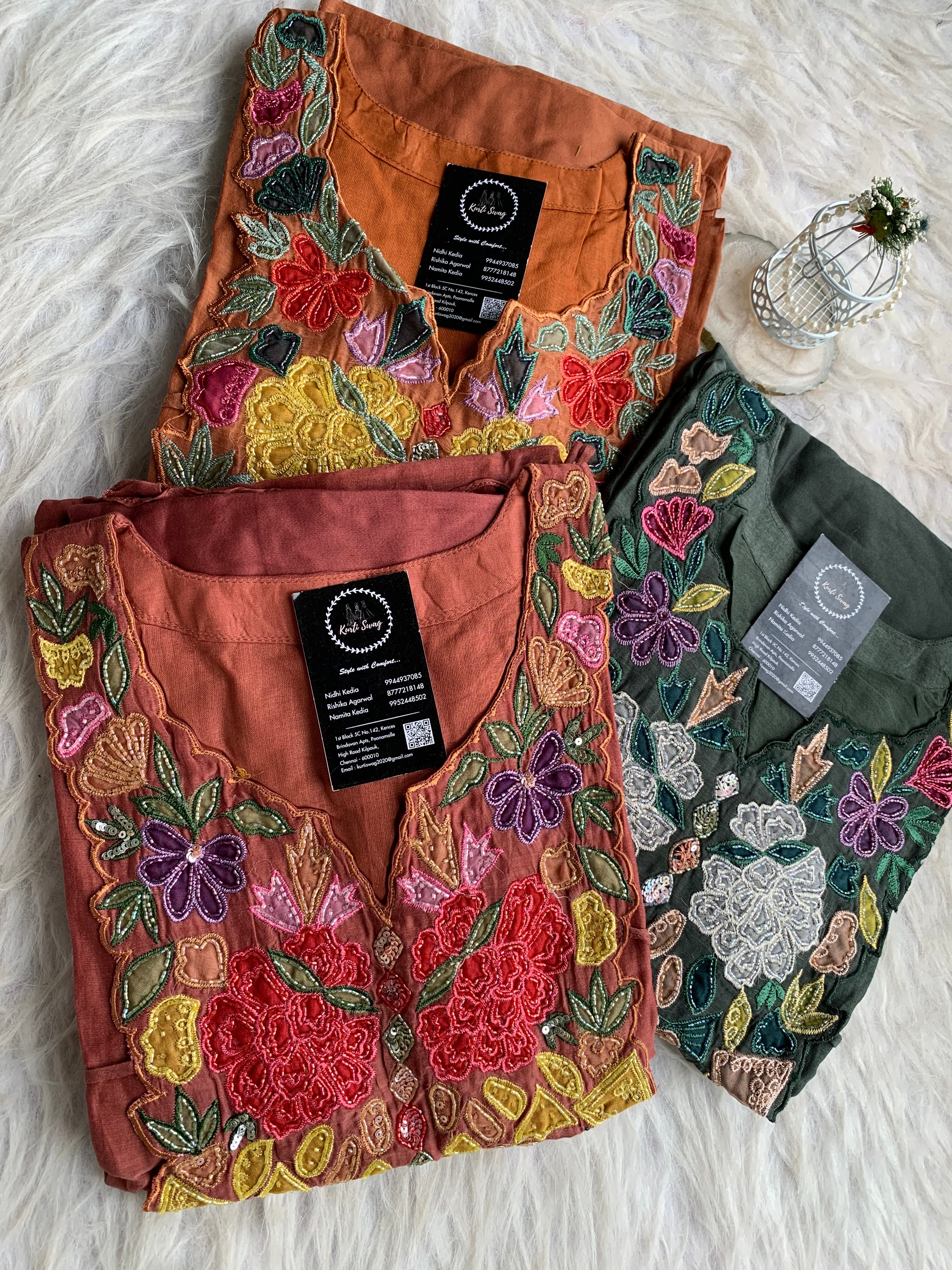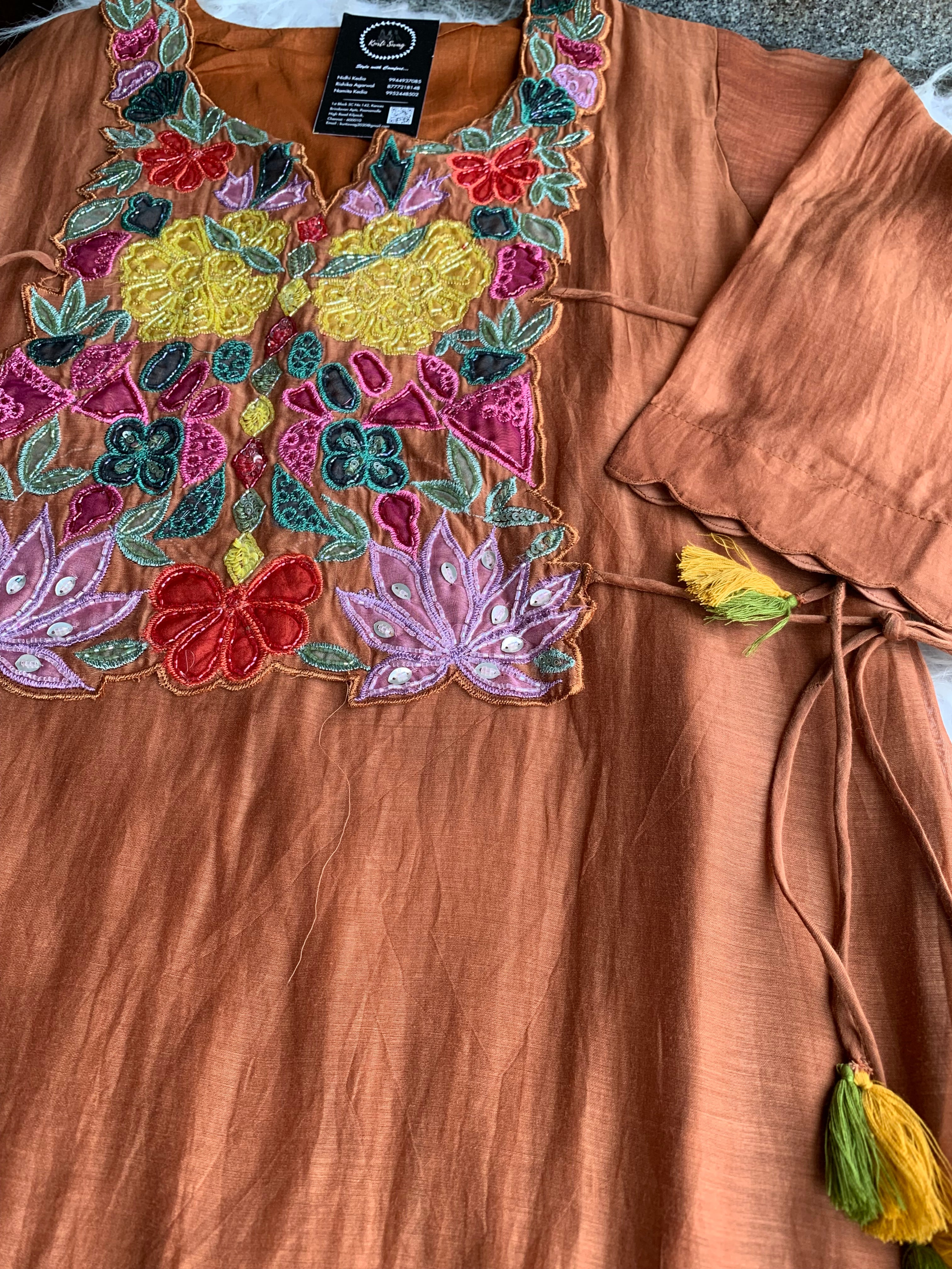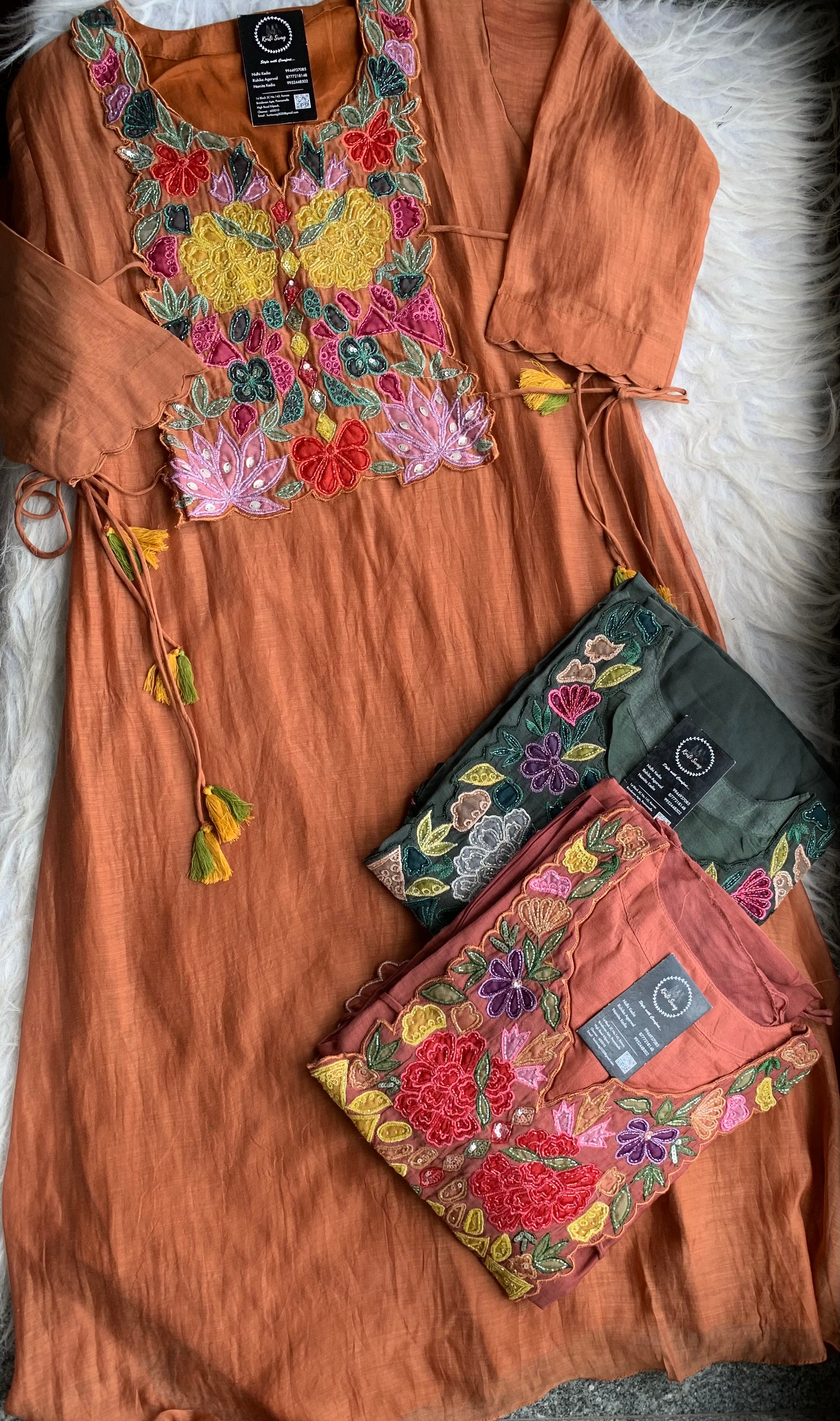 ✅ Premium Mul Chanderi Kurti With thread, Applique And Cutdaana Handwork On The Yoke Of The Kurta