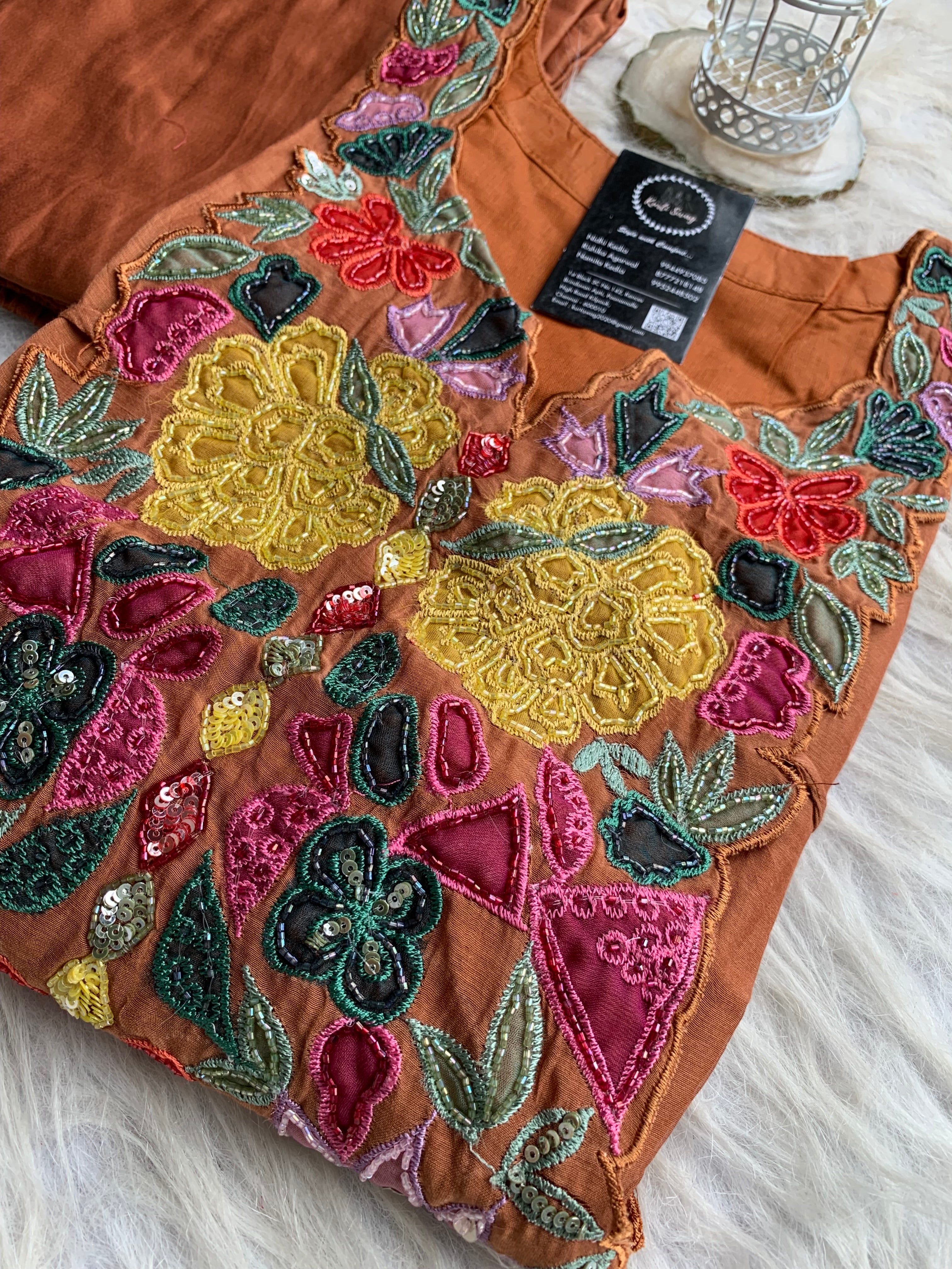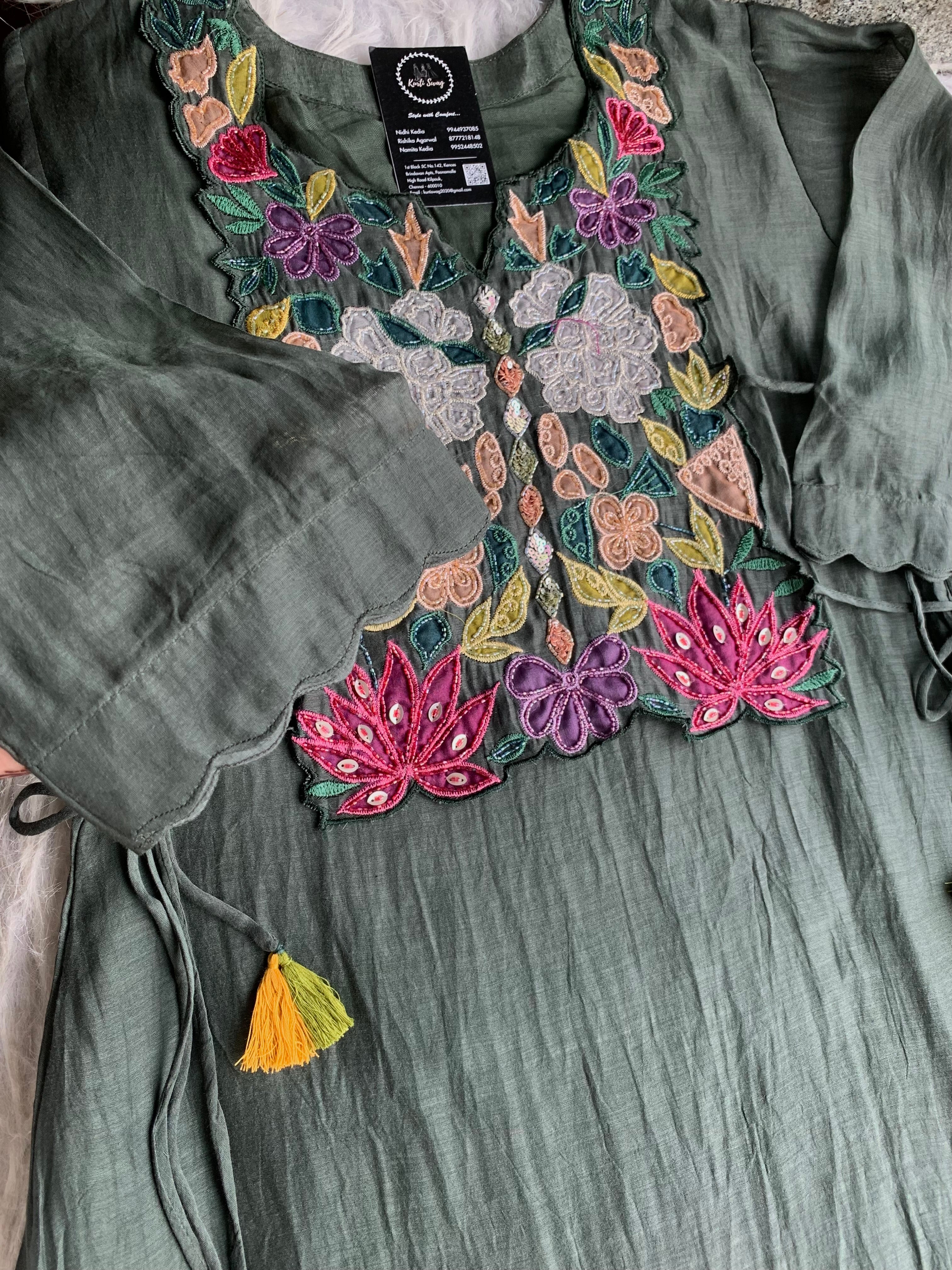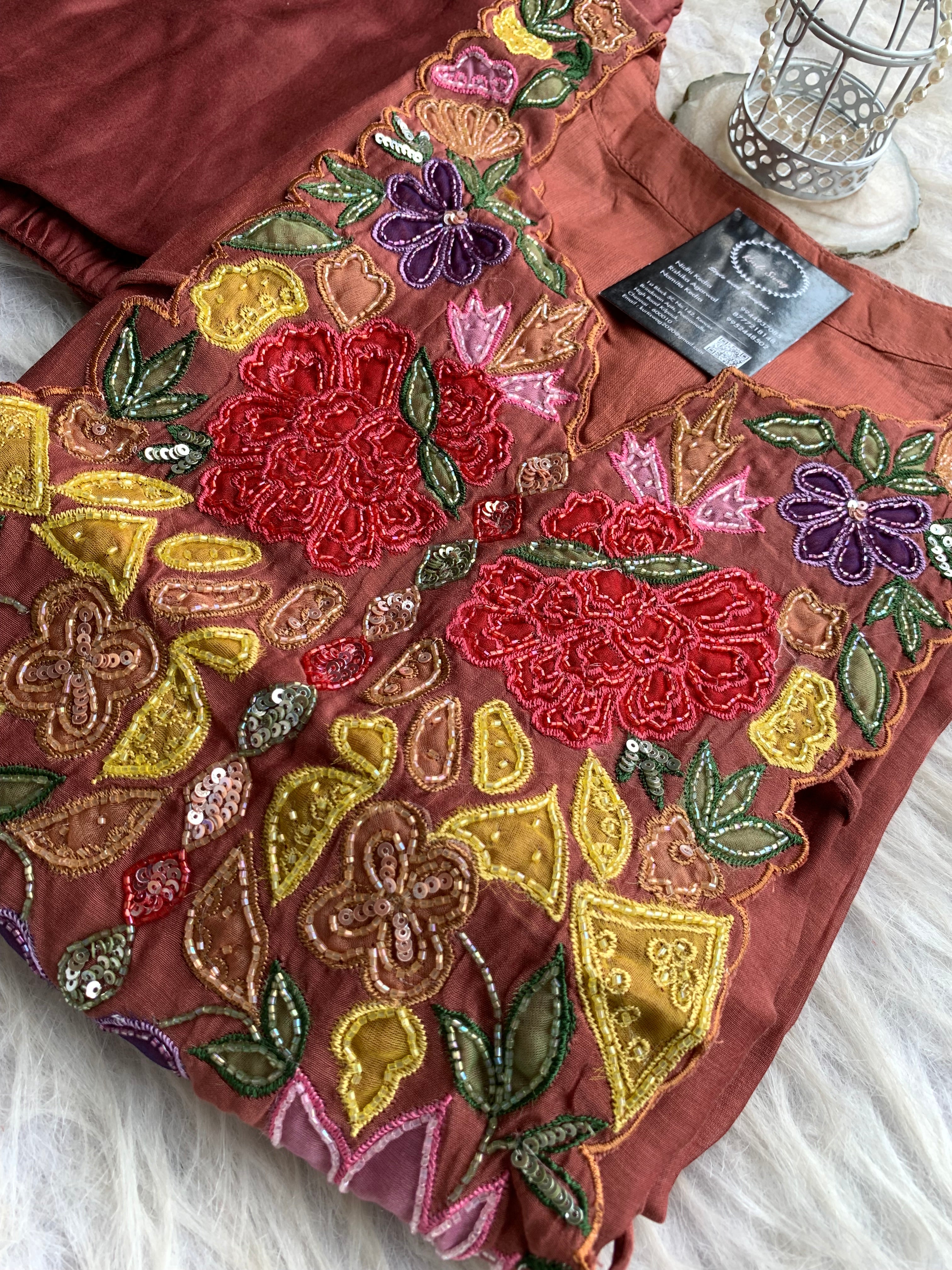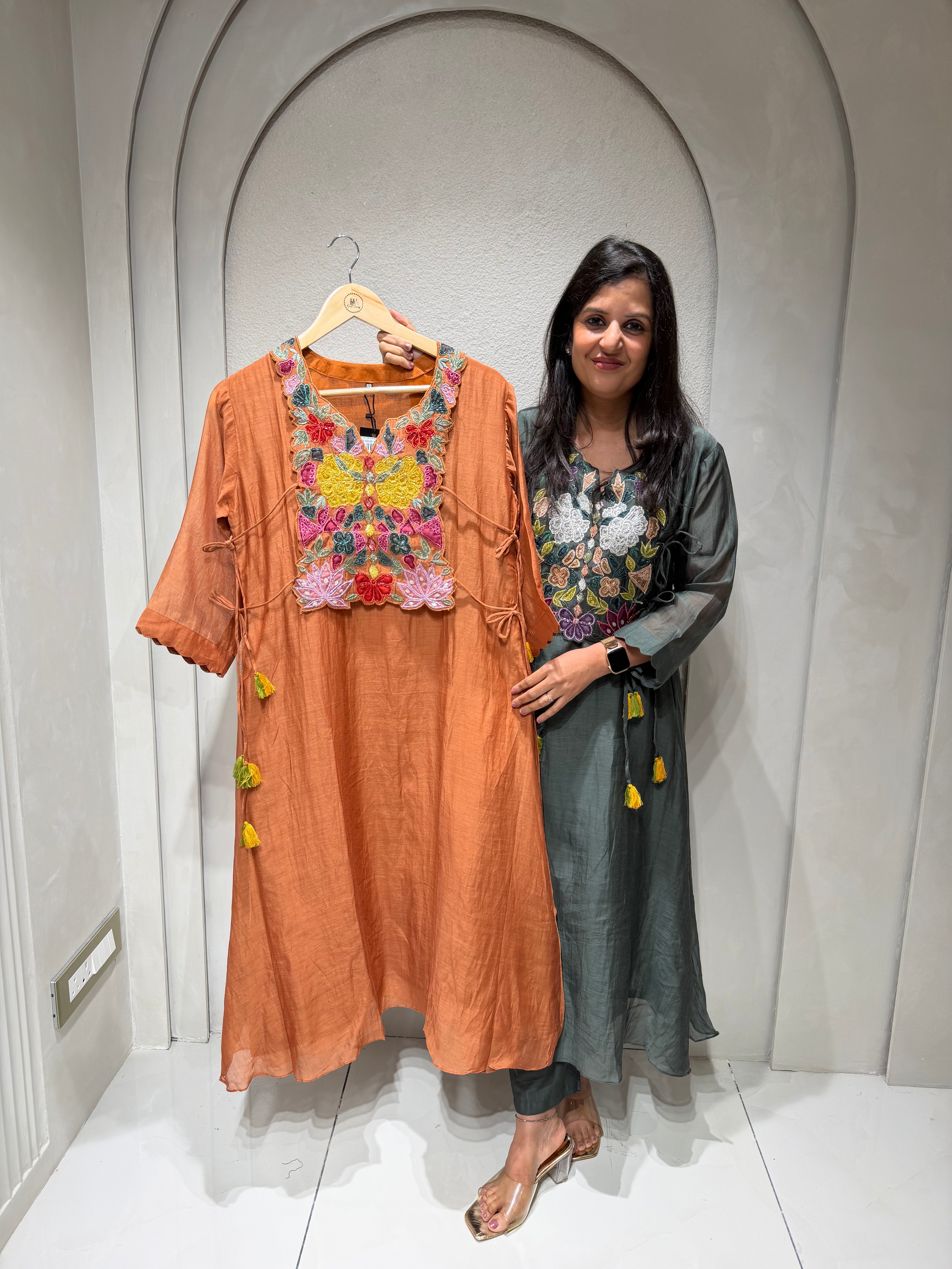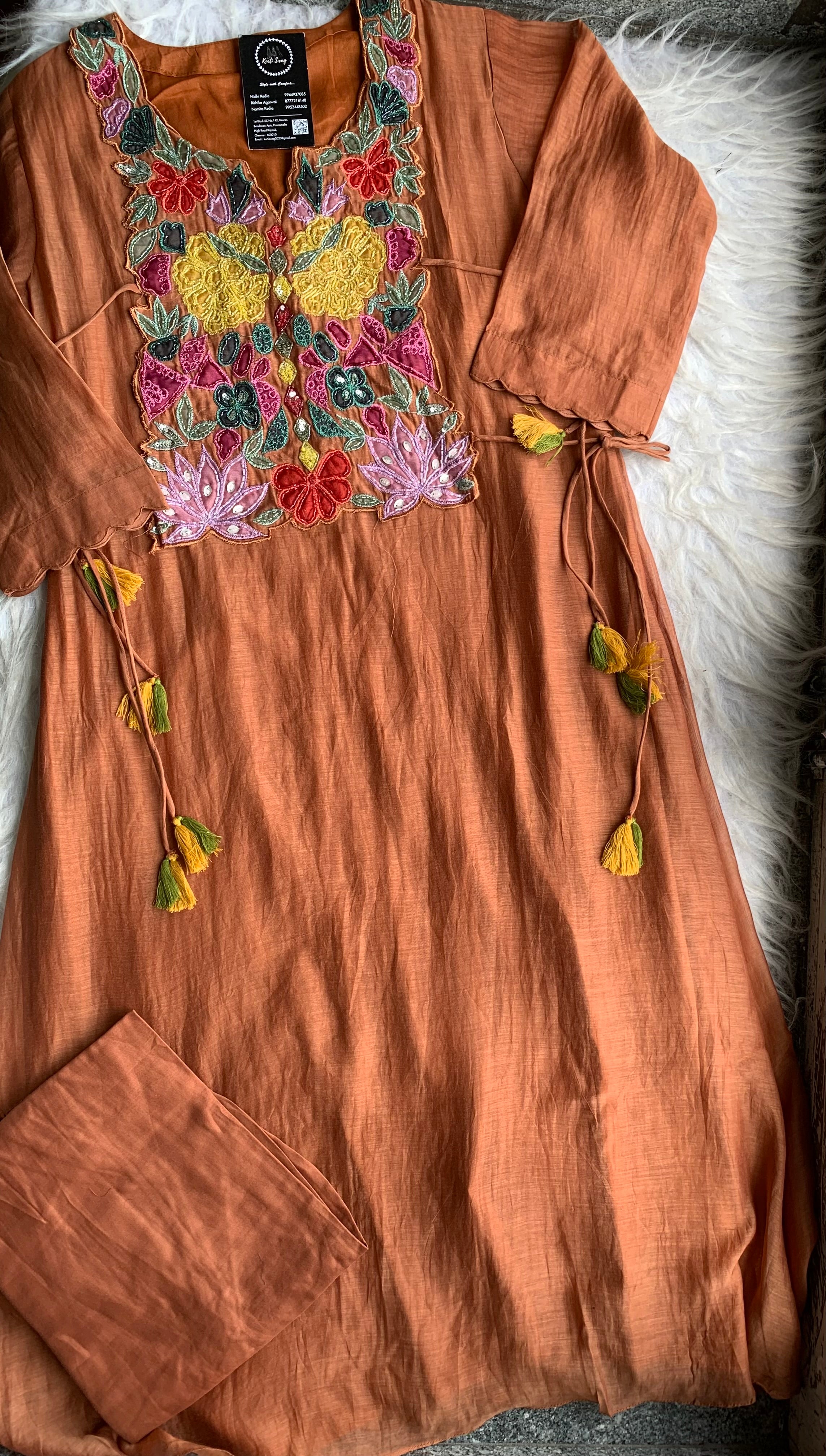 ✅ Premium Mul Chanderi Kurti With thread, Applique And Cutdaana Handwork On The Yoke Of The Kurta