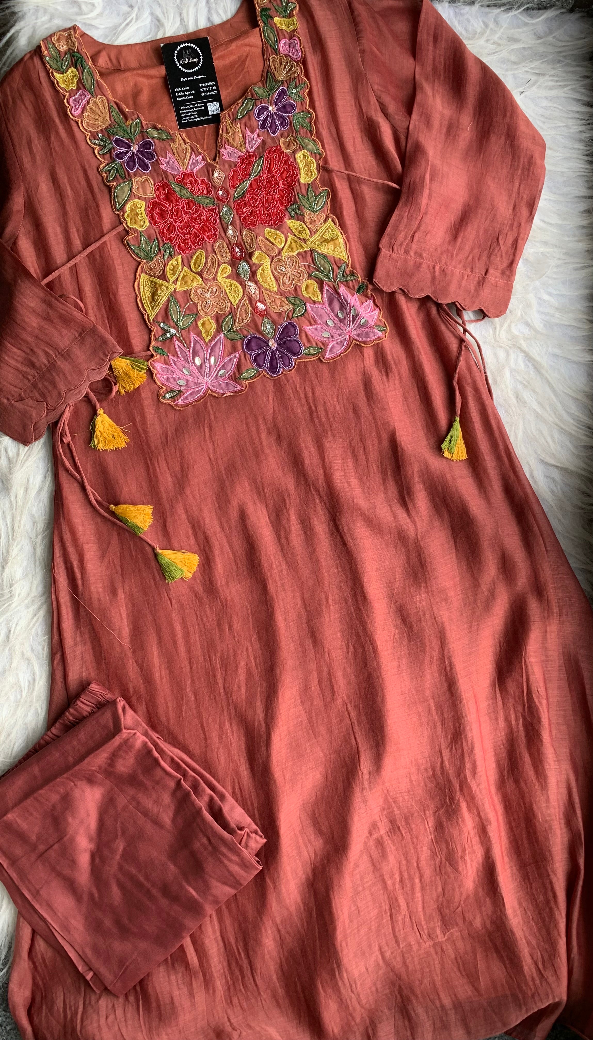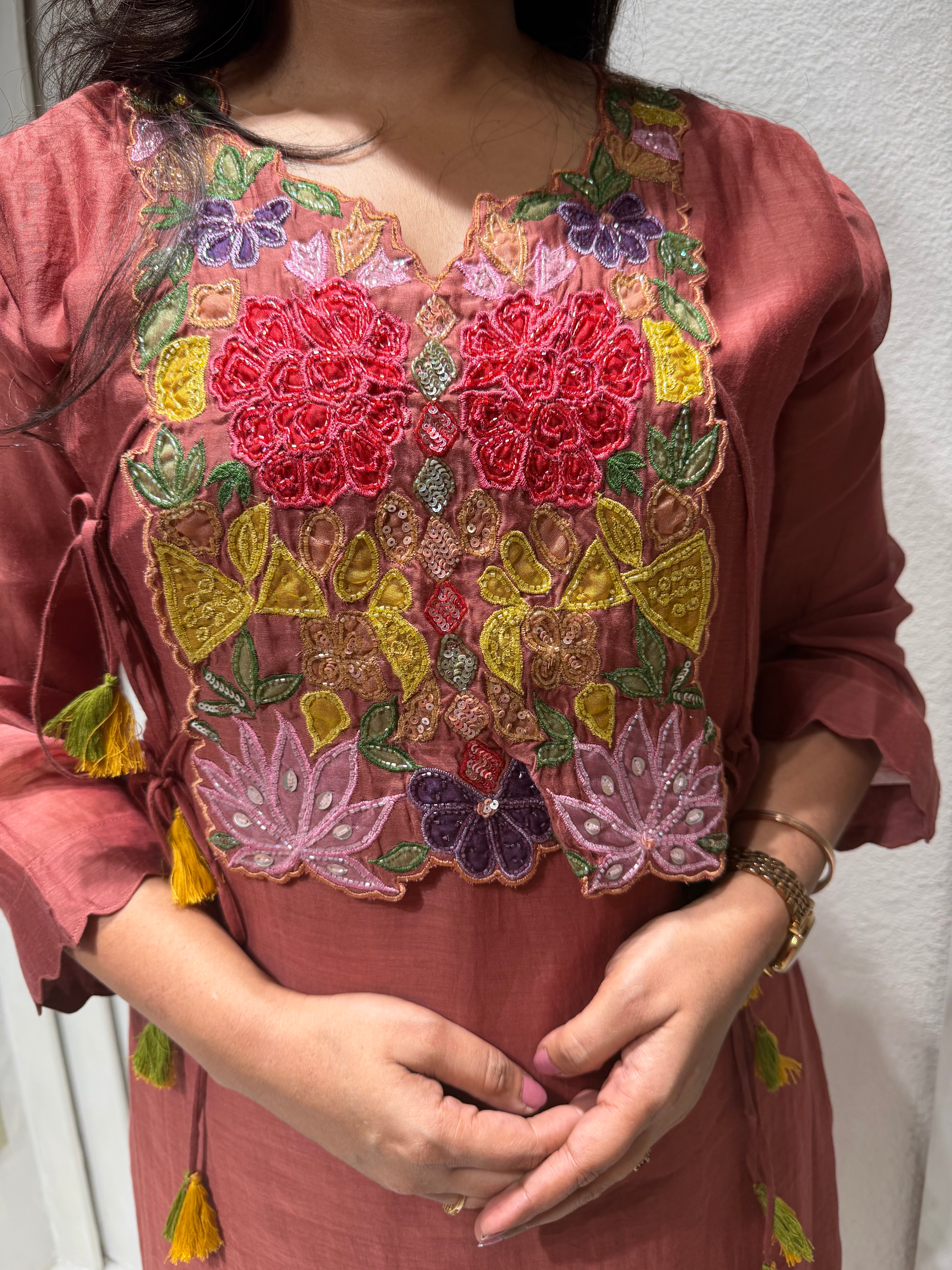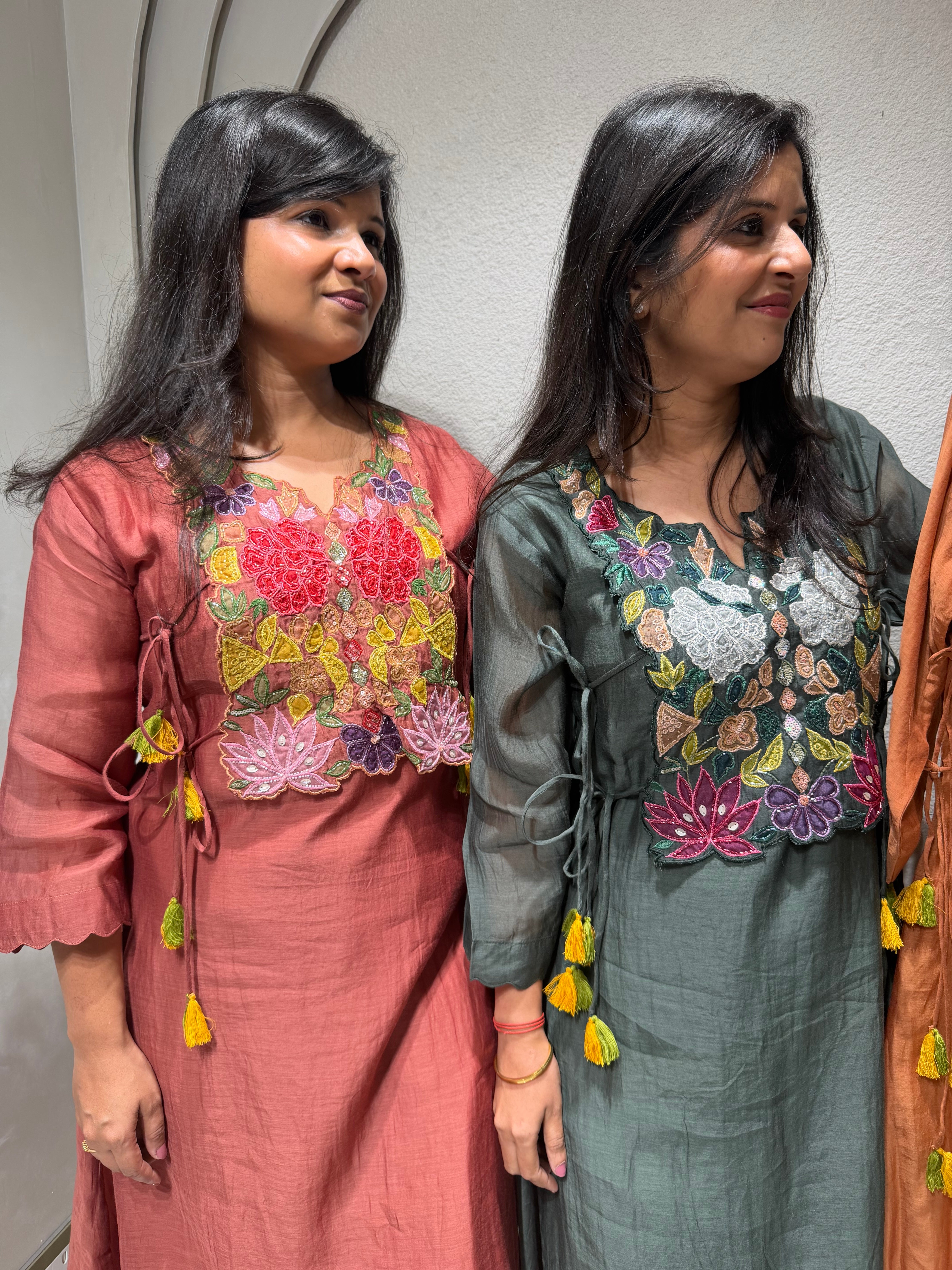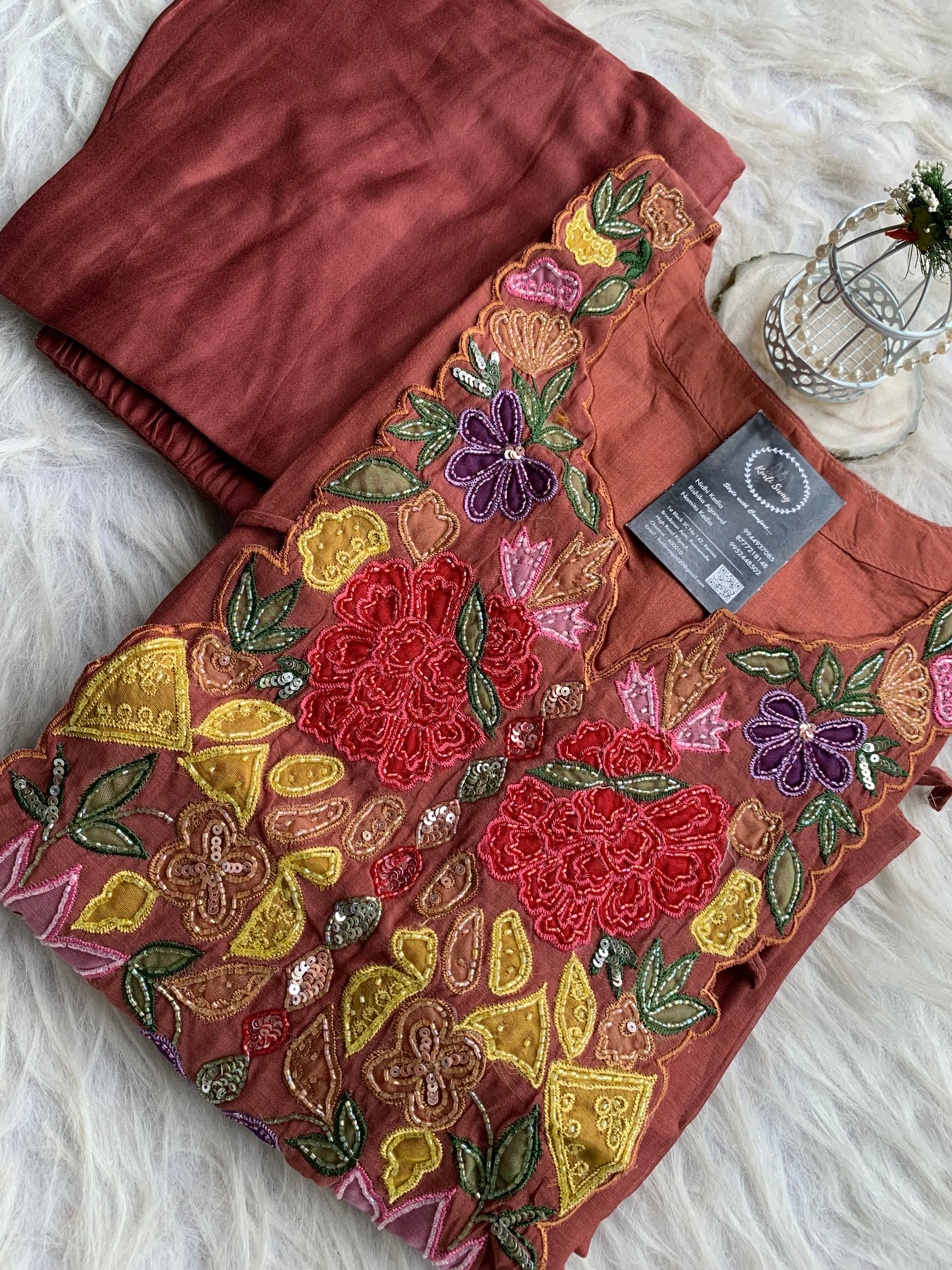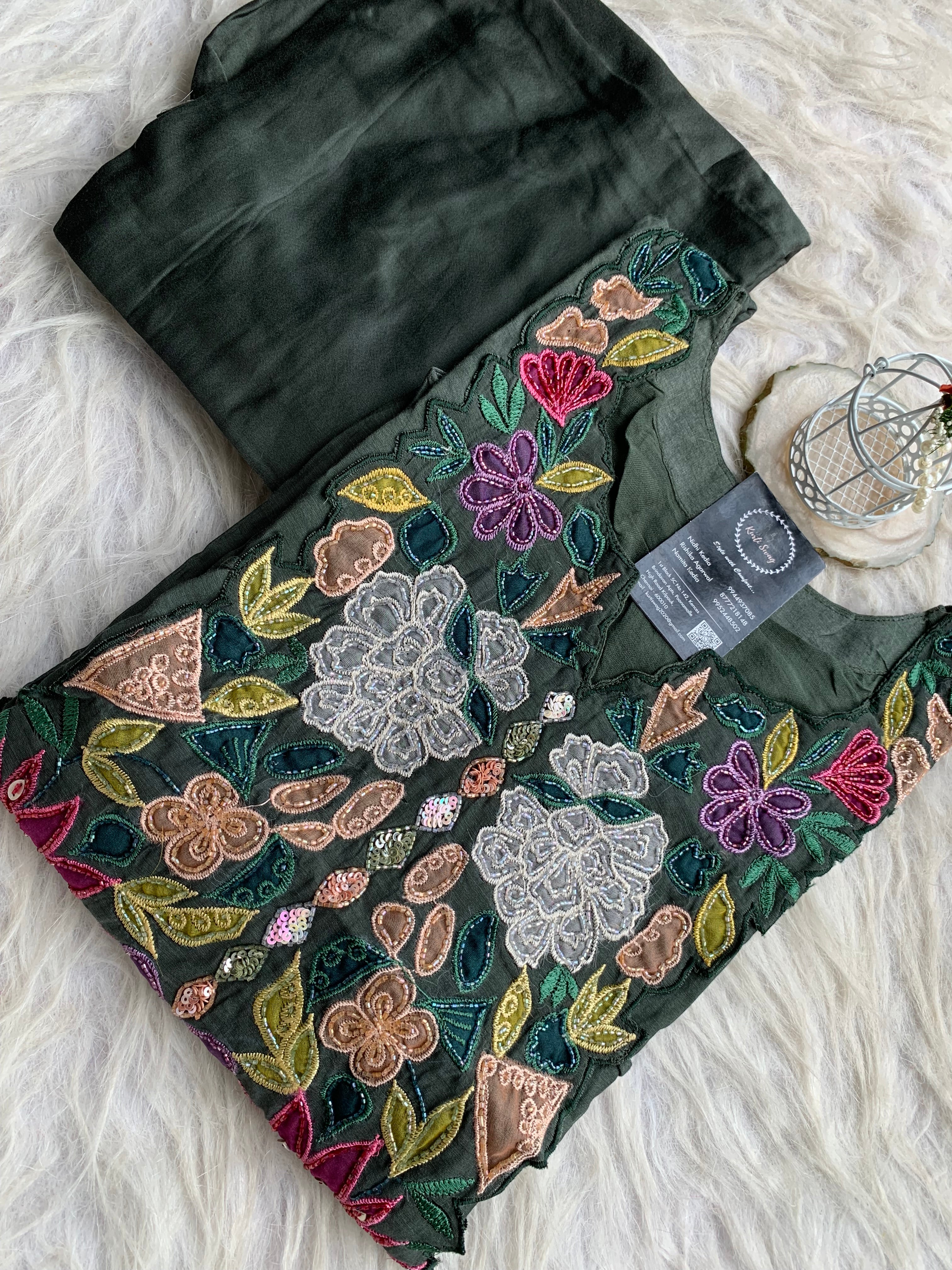 ✅ Premium Mul Chanderi Kurti With thread, Applique And Cutdaana Handwork On The Yoke Of The Kurta