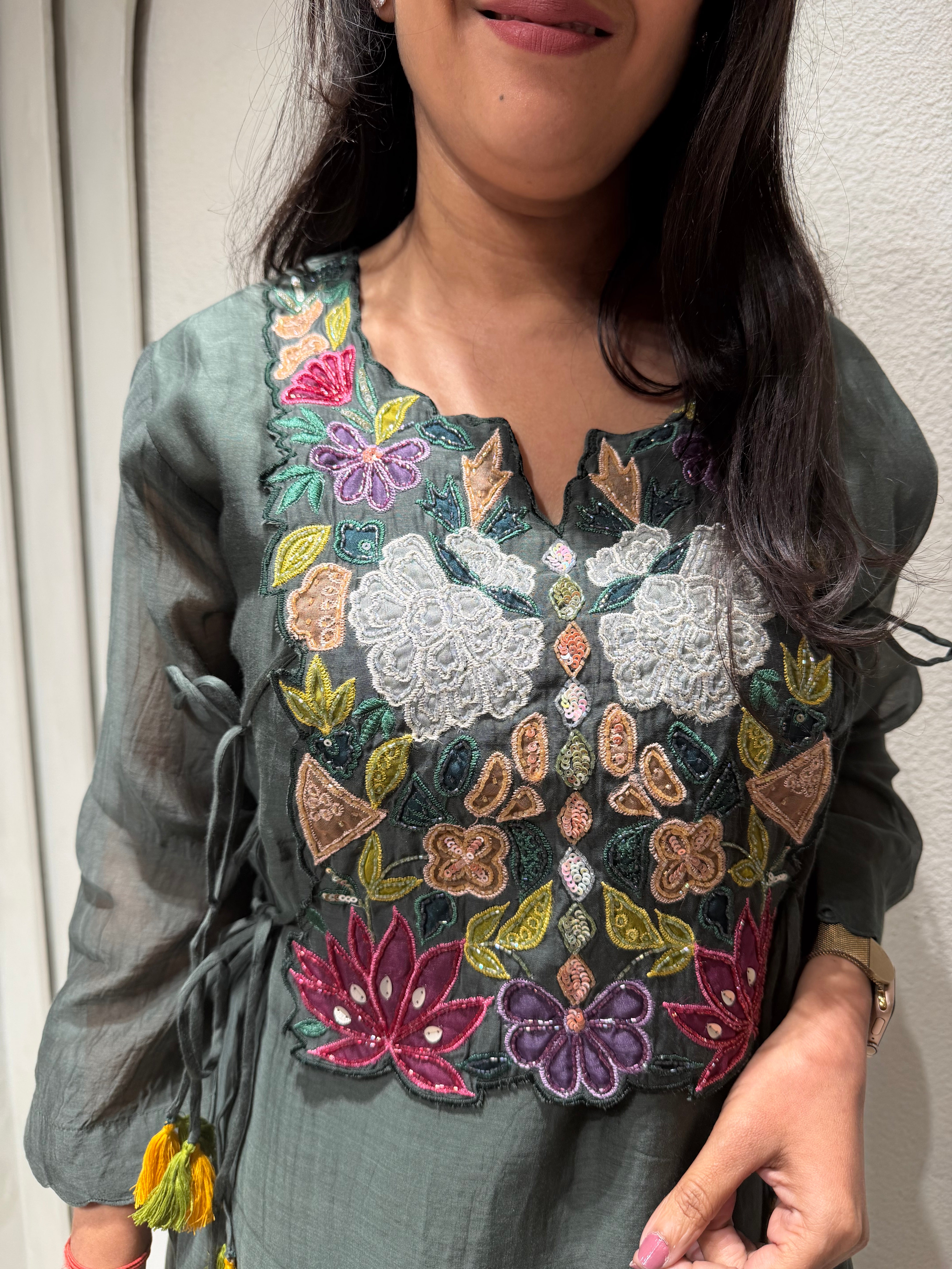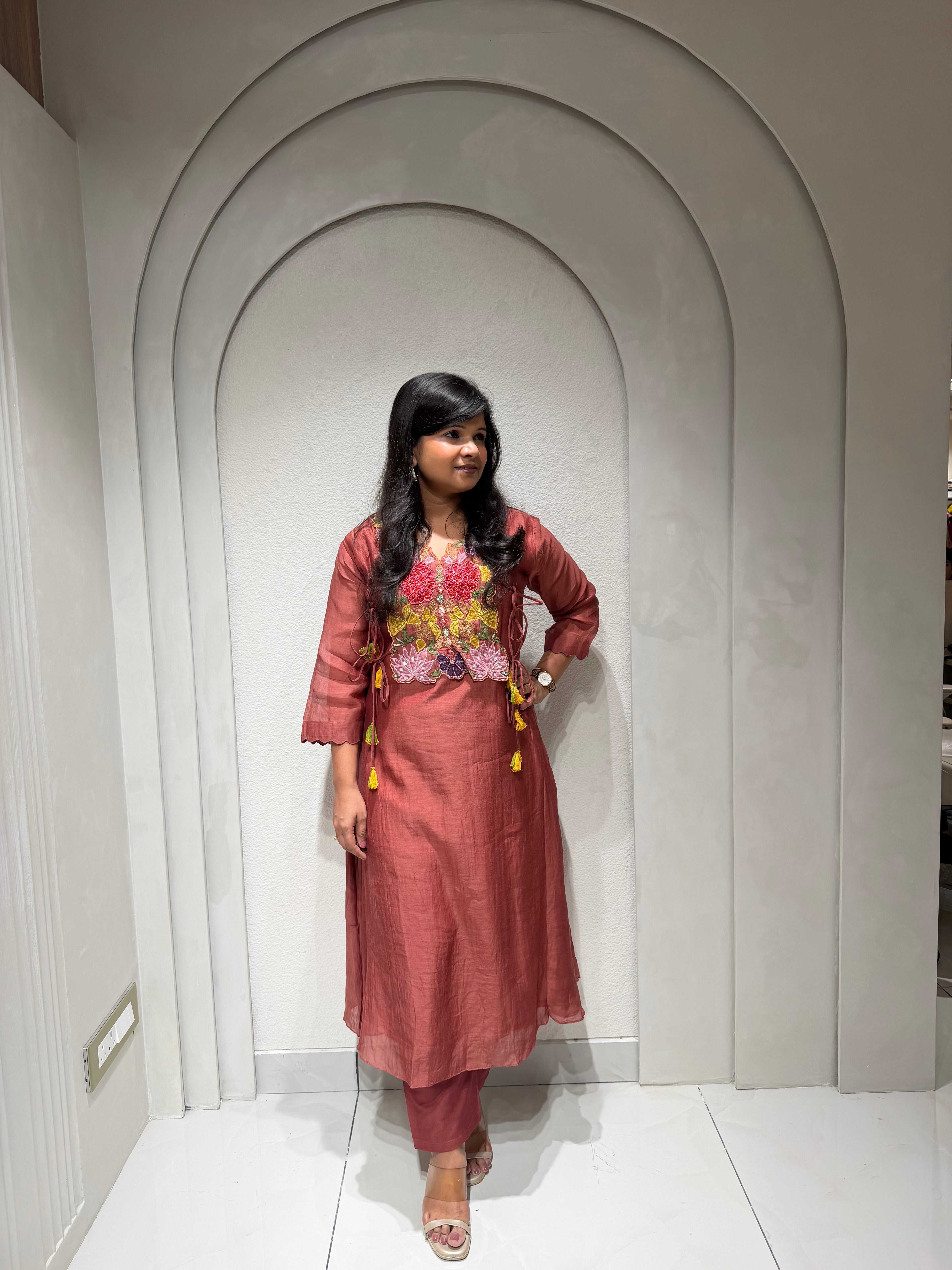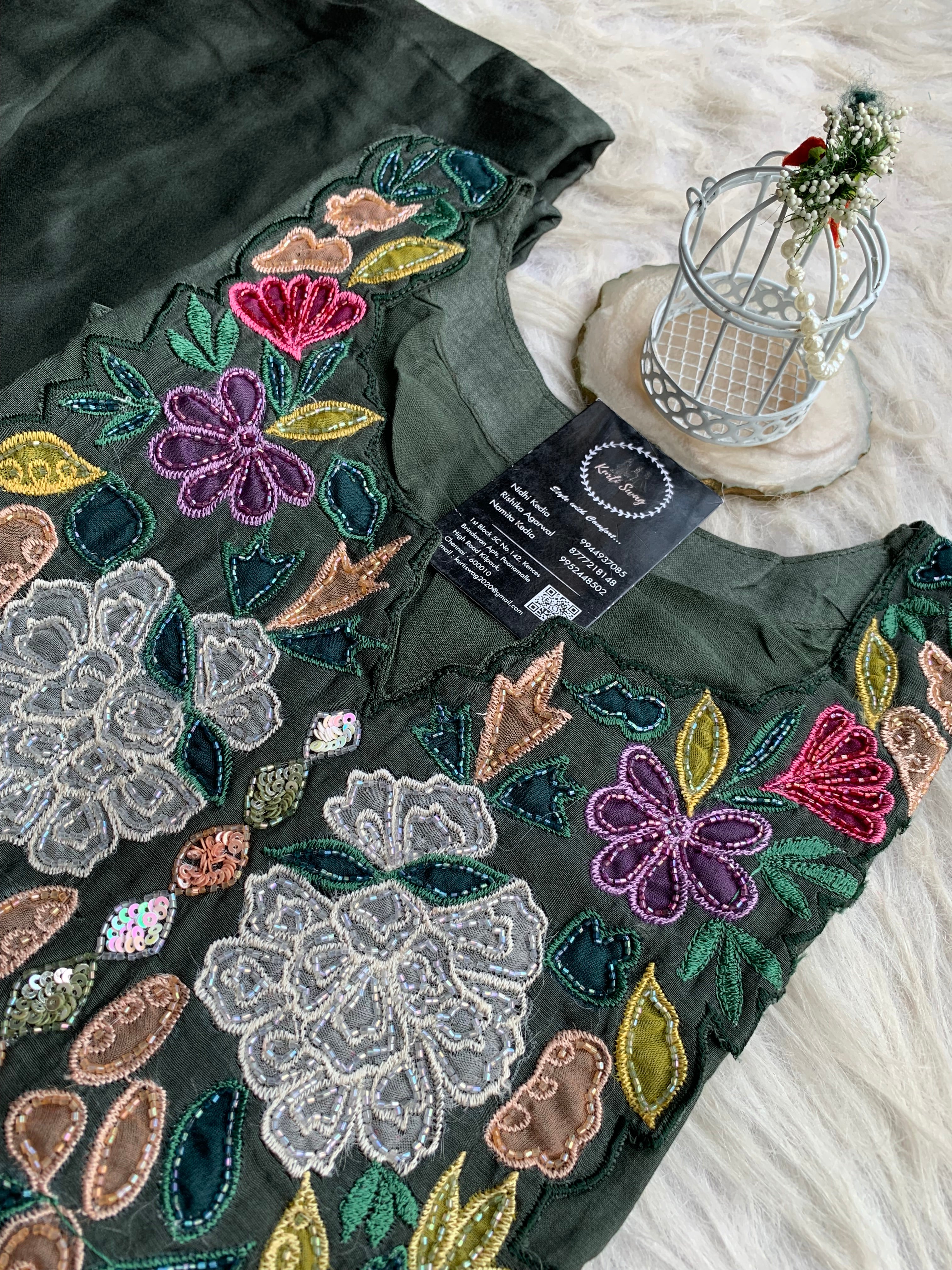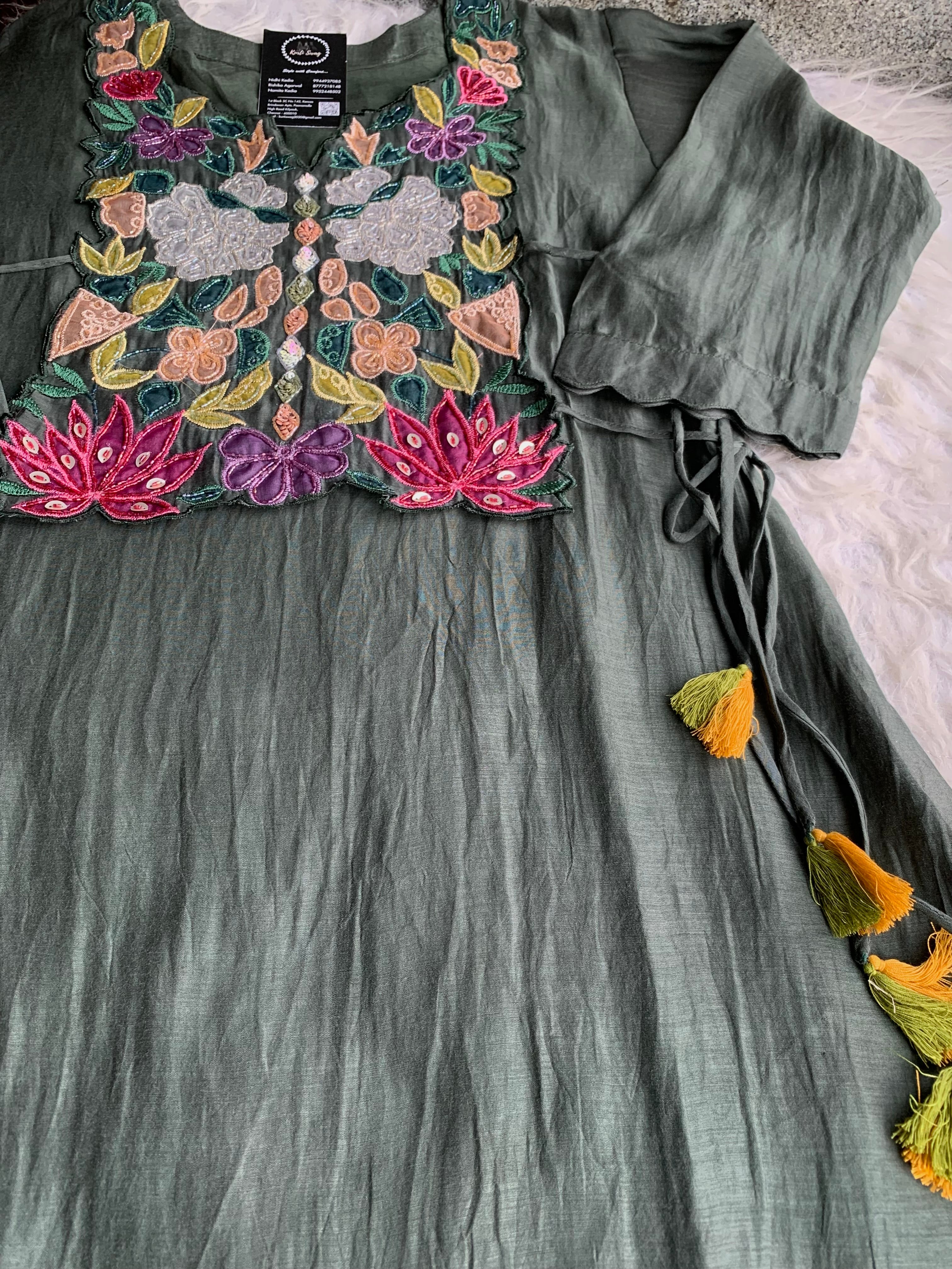 ✅ Premium Mul Chanderi Kurti With thread, Applique And Cutdaana Handwork On The Yoke Of The Kurta
