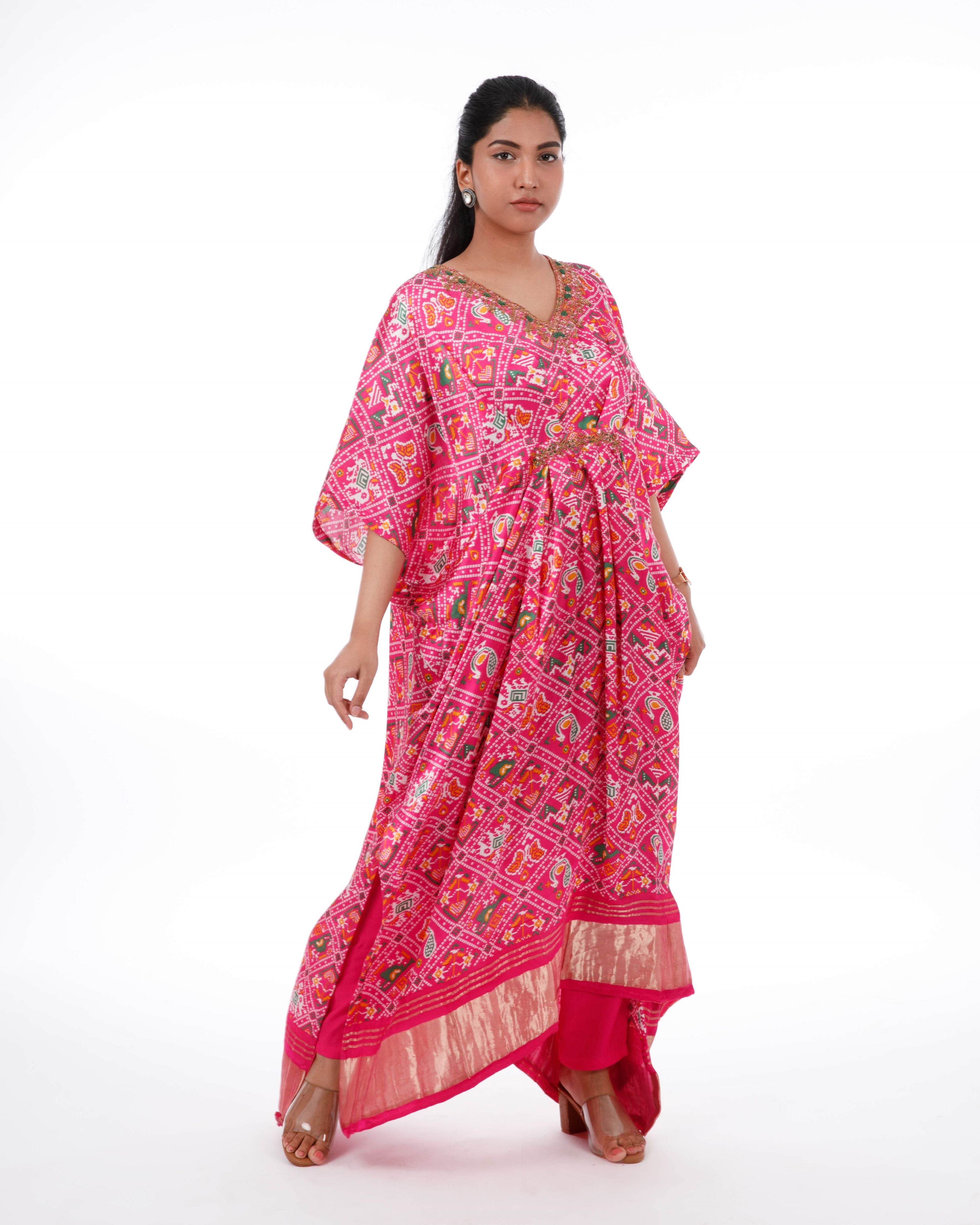 ✅ Gajji Silk Patola Print Kaftan With Hand embroidery On The Neckline.