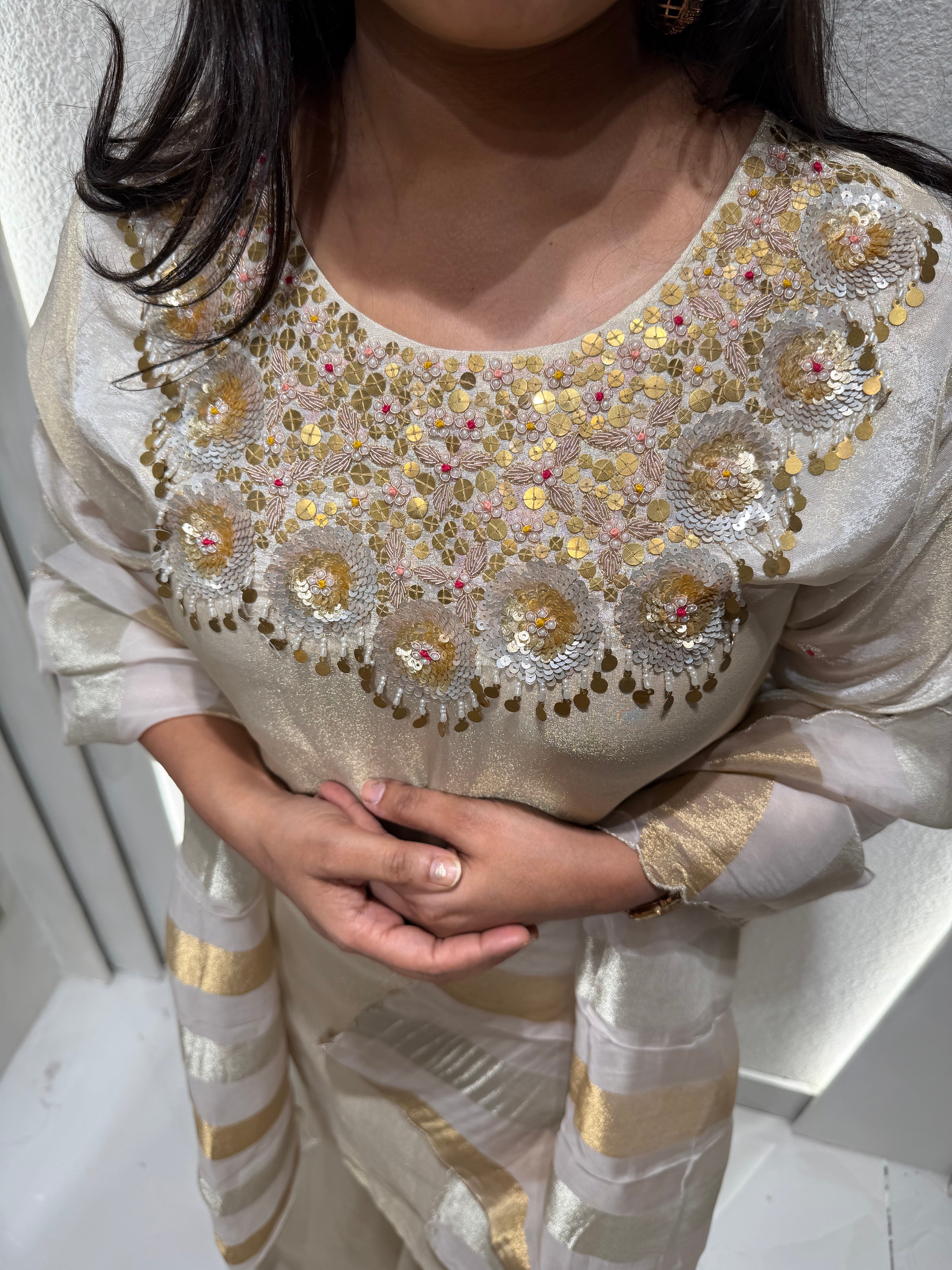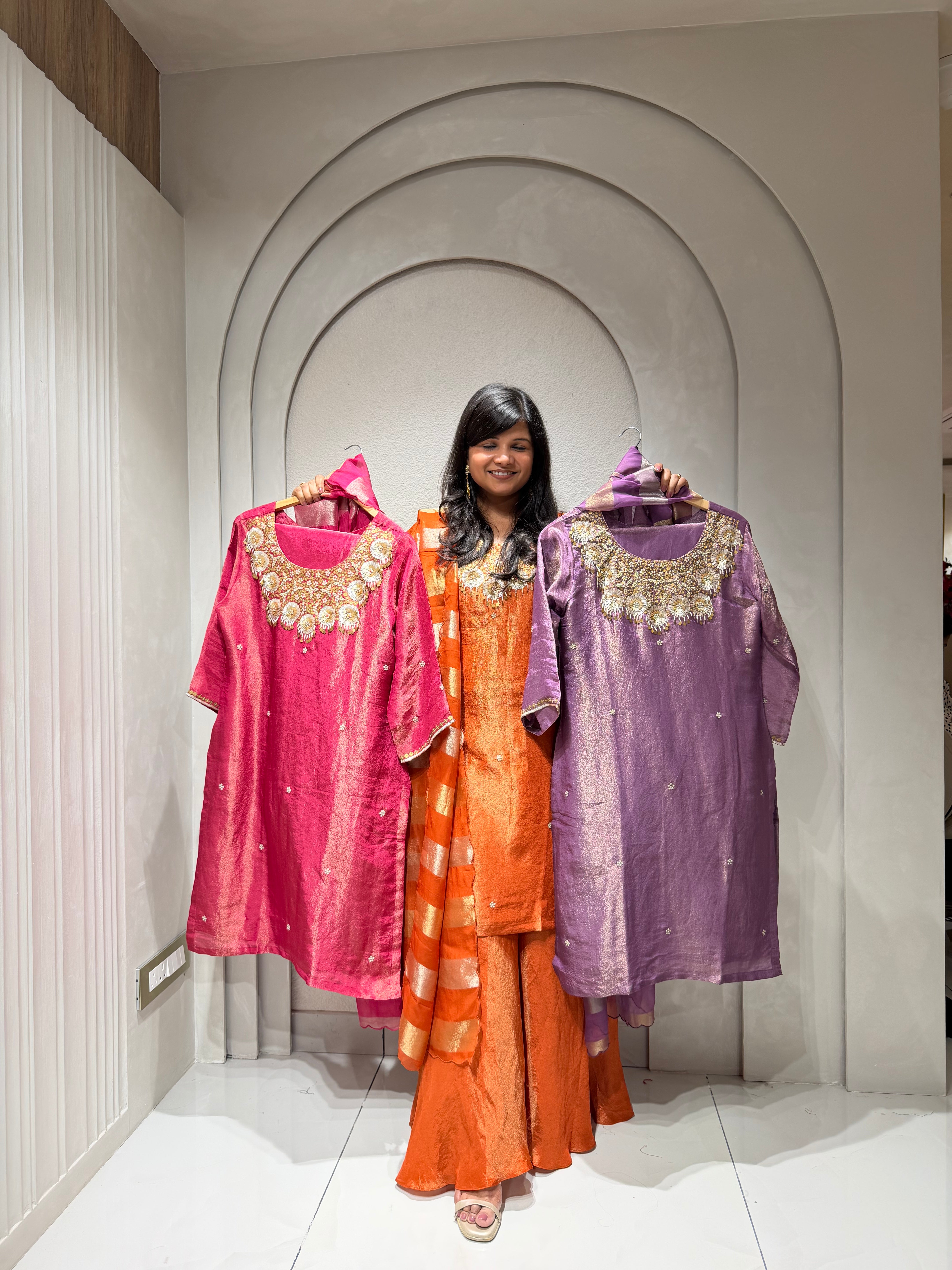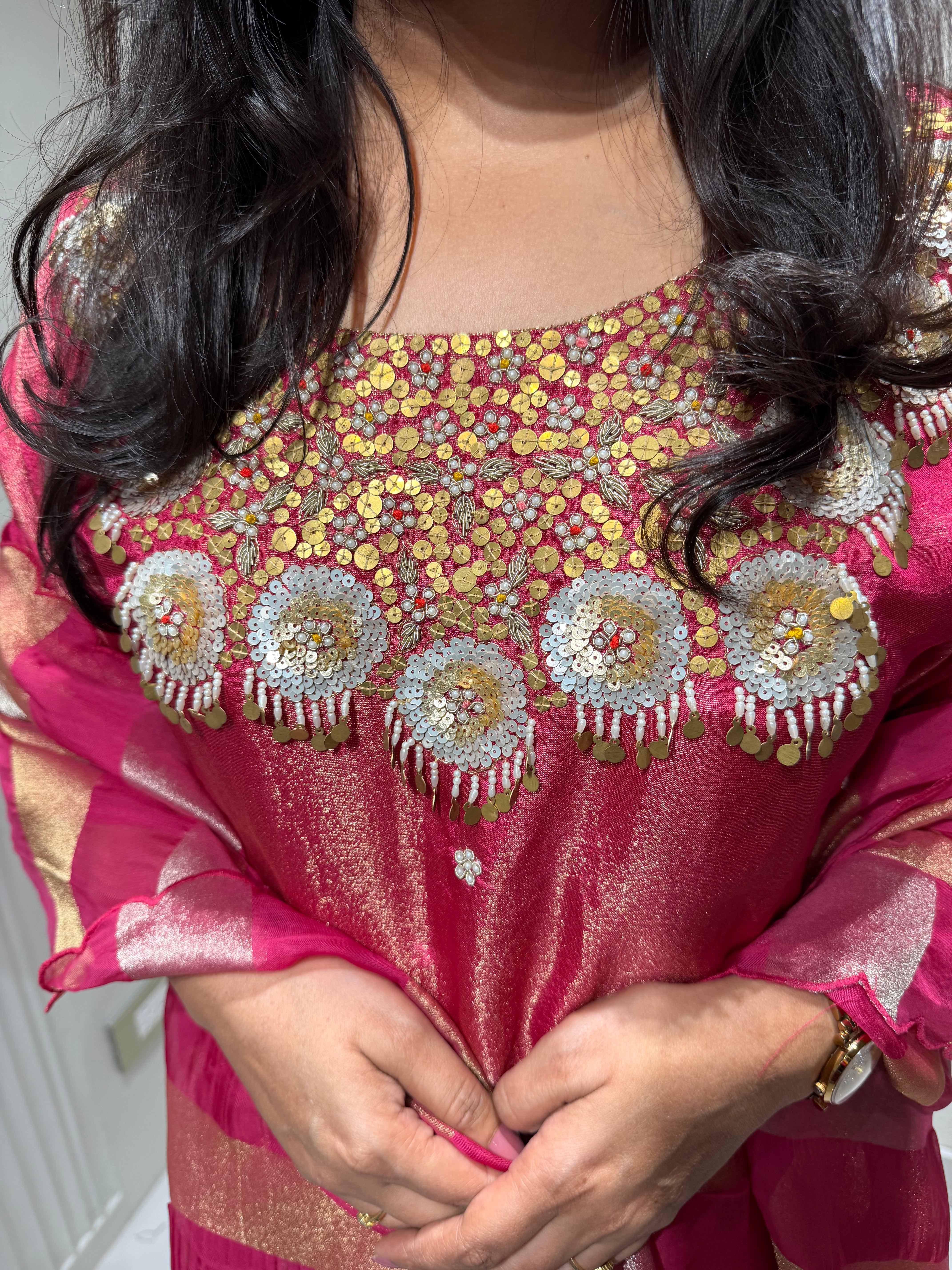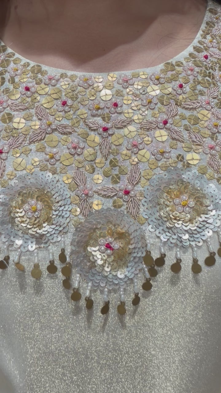 ✅ Premium Tissue Silk Kurti With Exclusive Zardosi , Sequence And dabka Work On The Yoke Of The Kurta