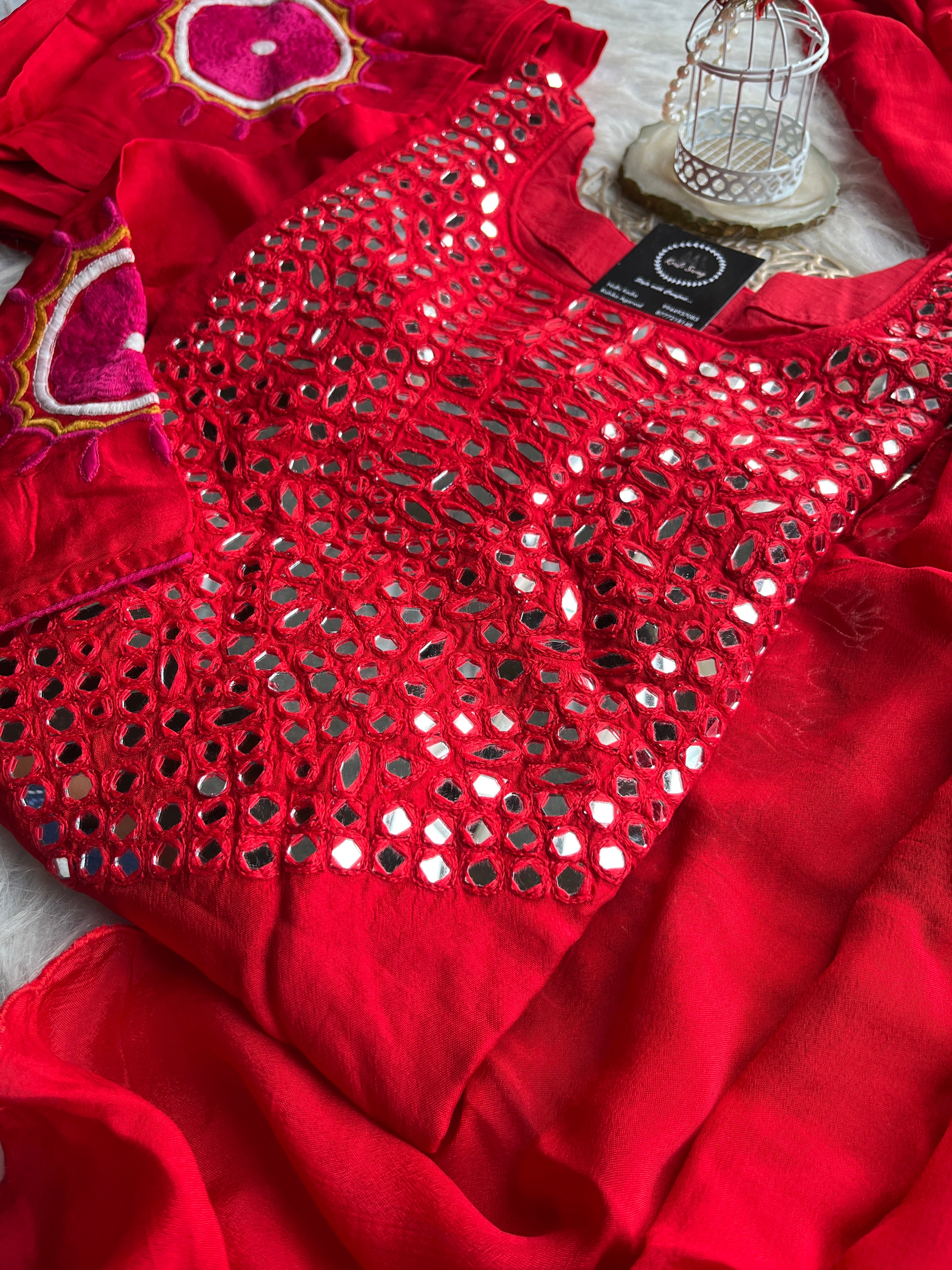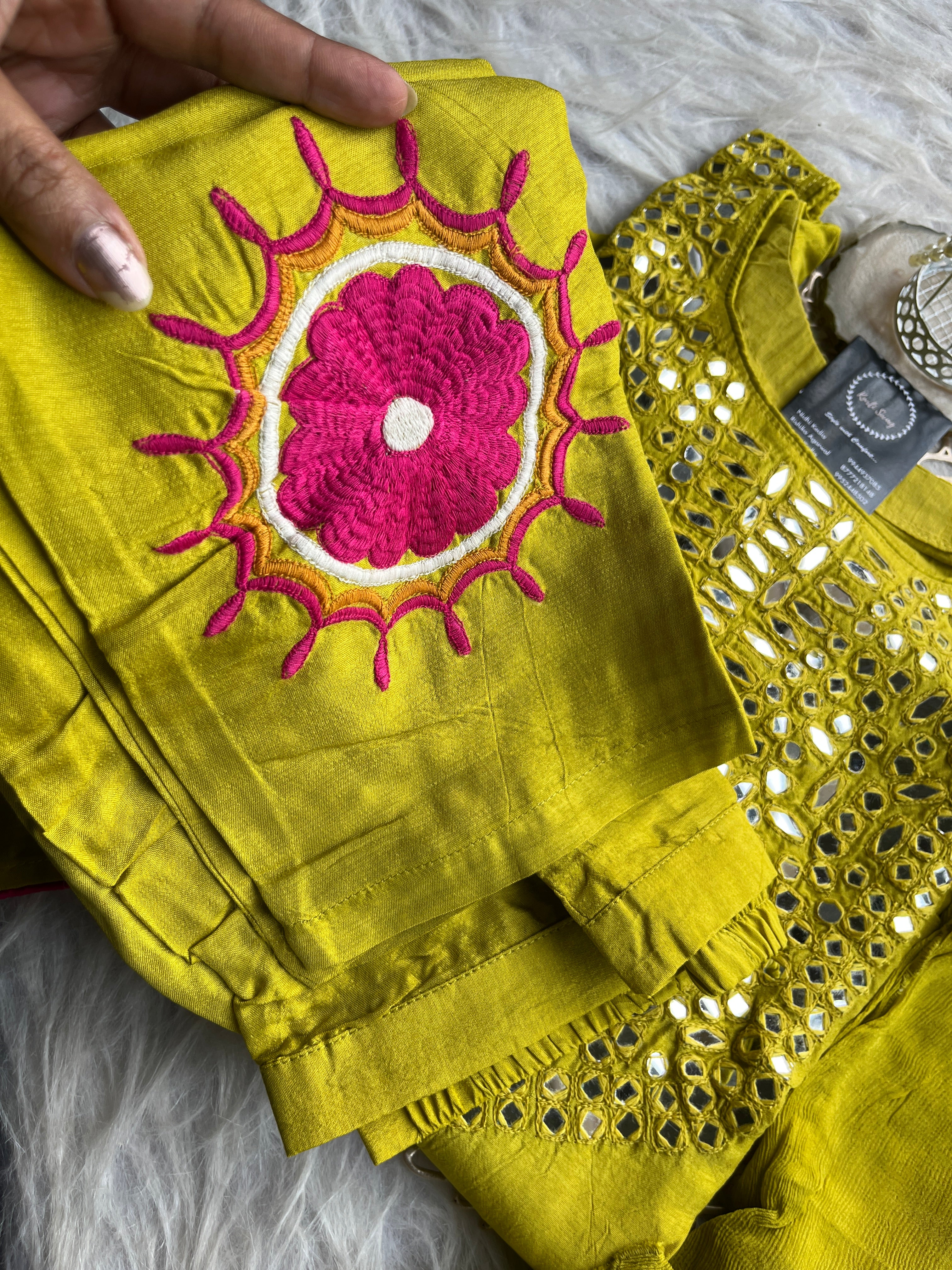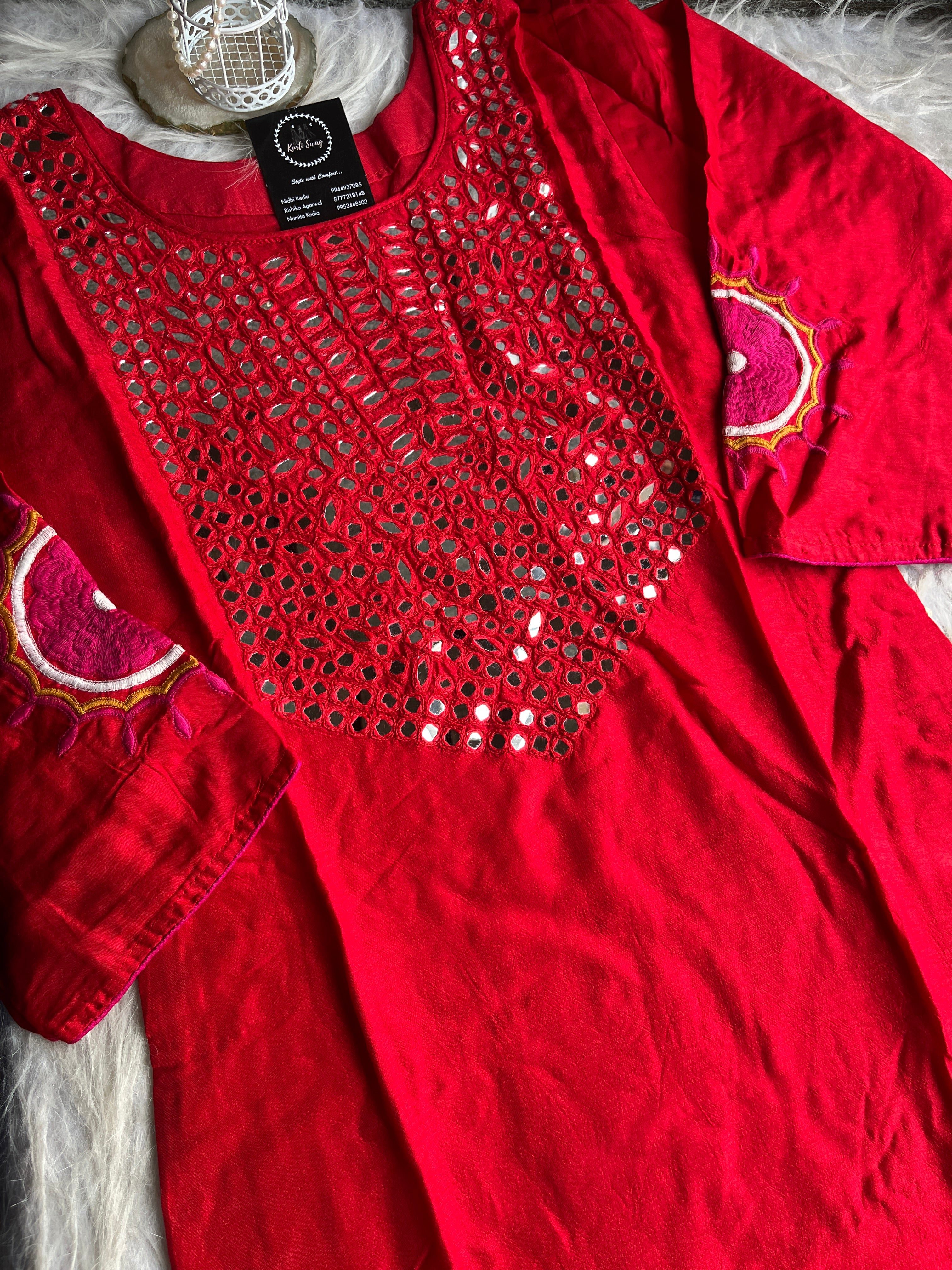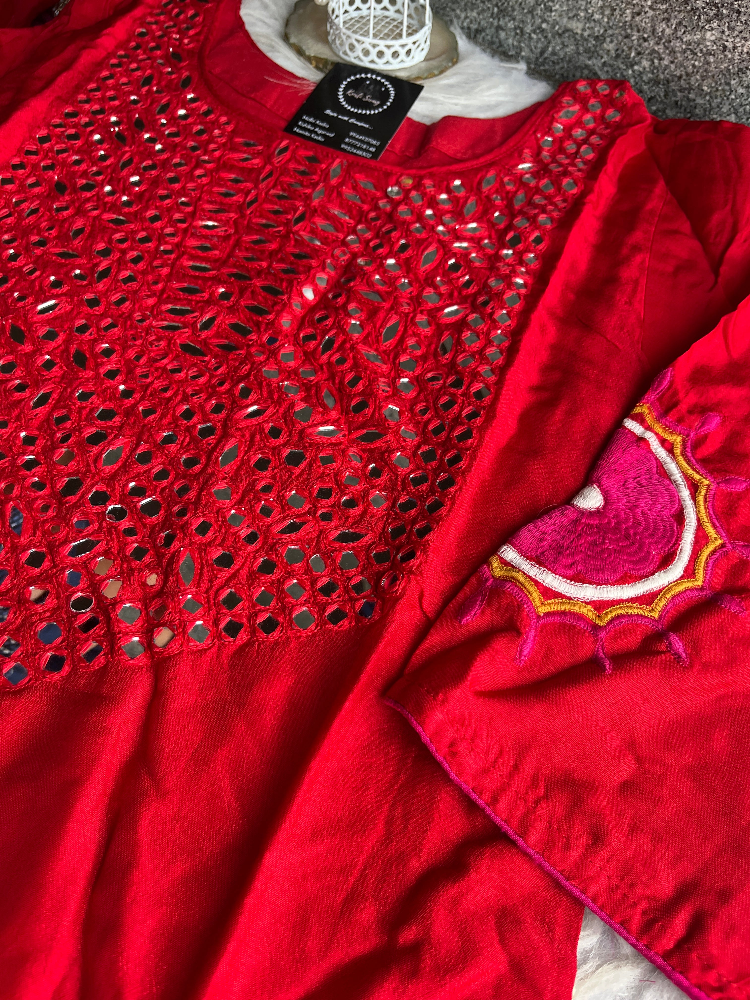 ✅ Dola Silk Kurti With Mirror Hand embroidery On The Neckline Of The Kurti