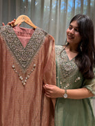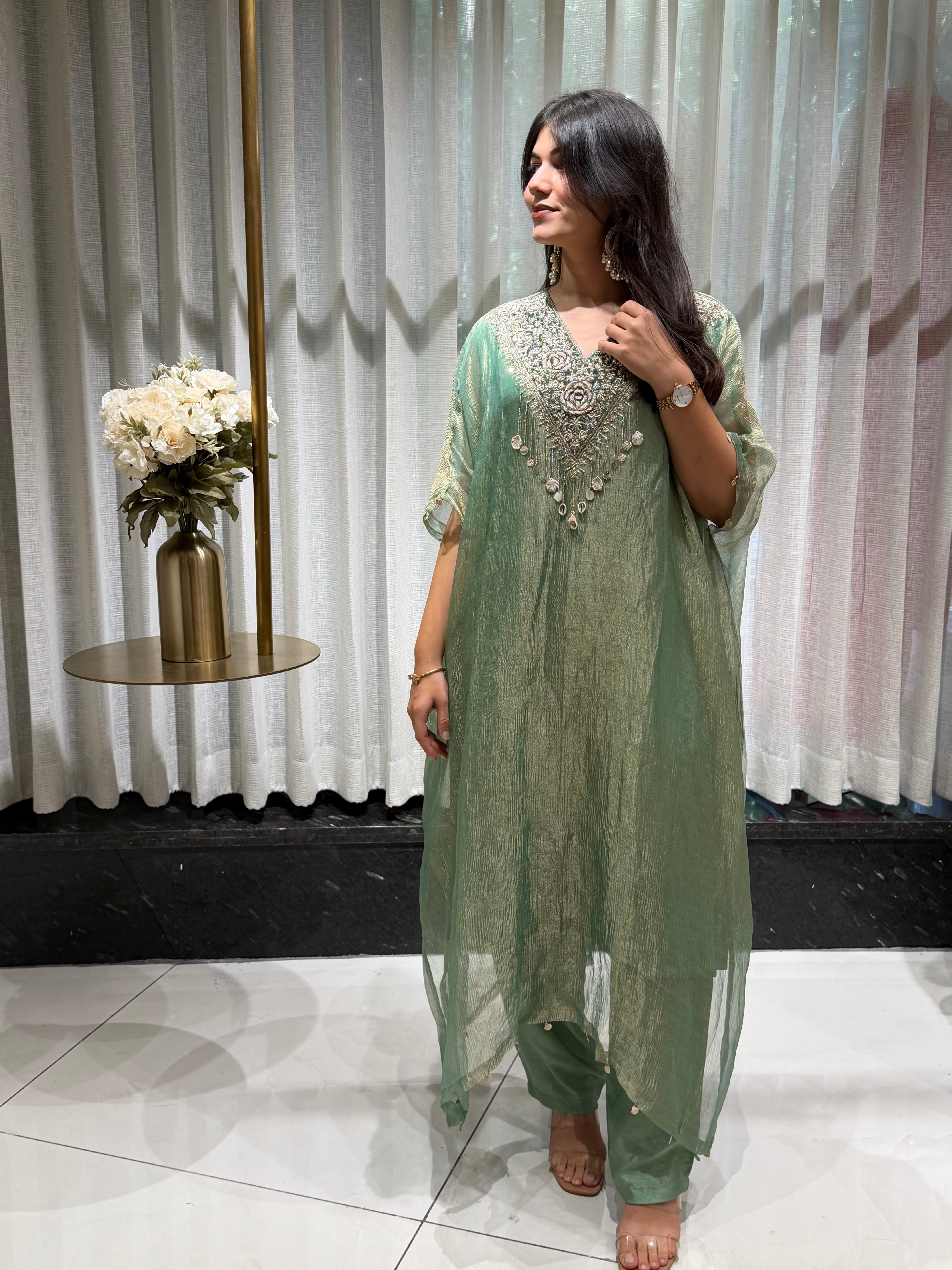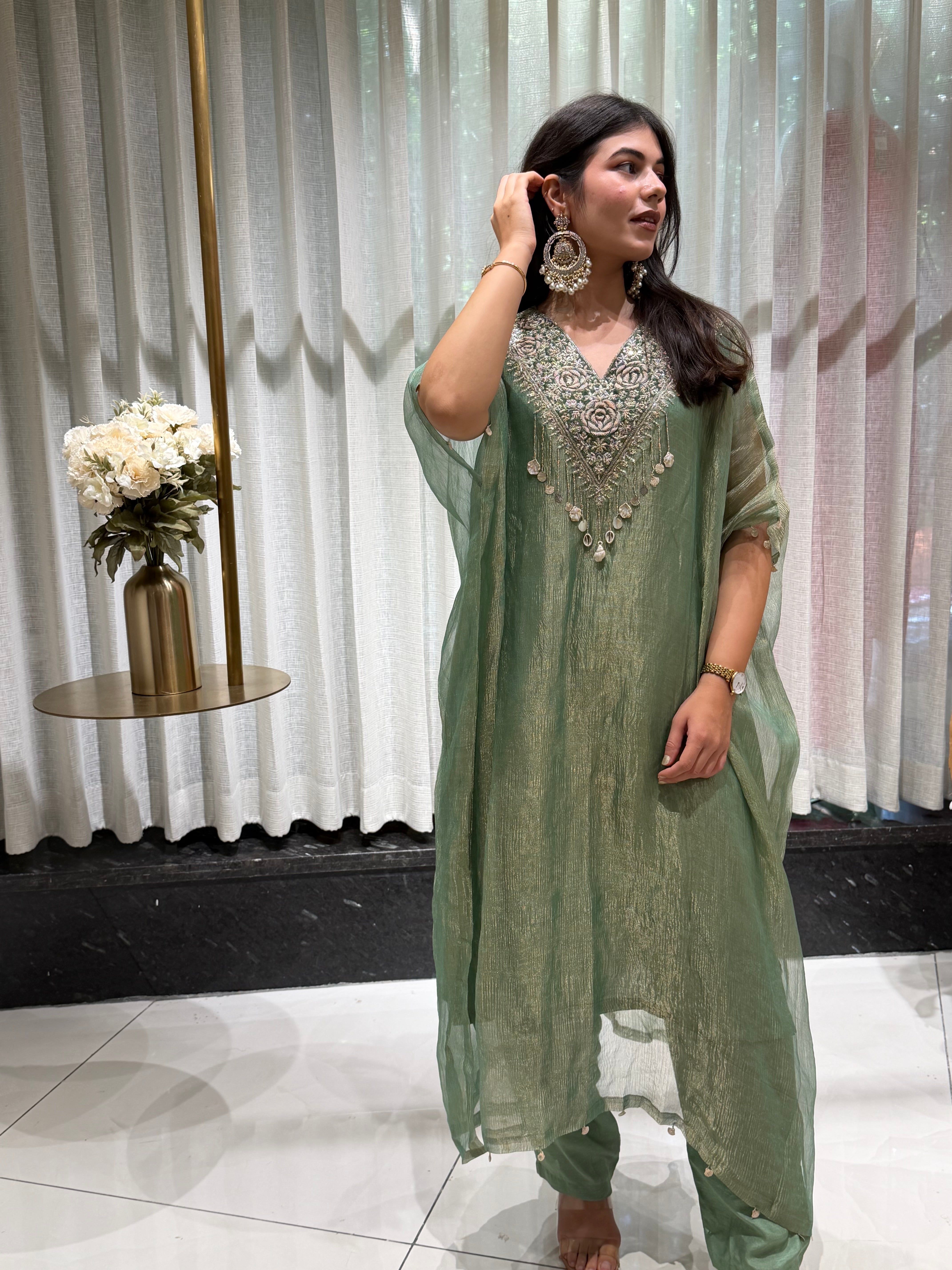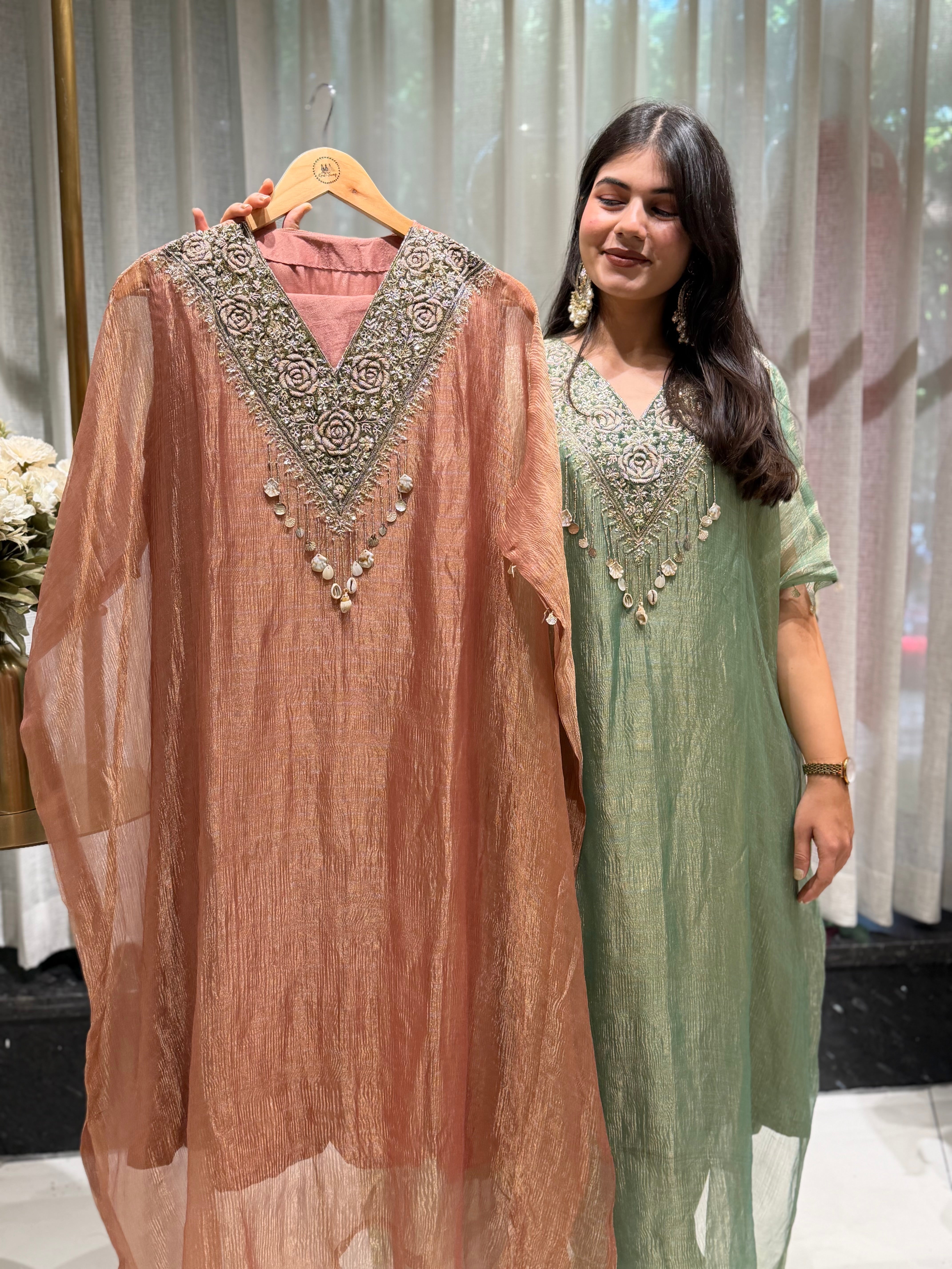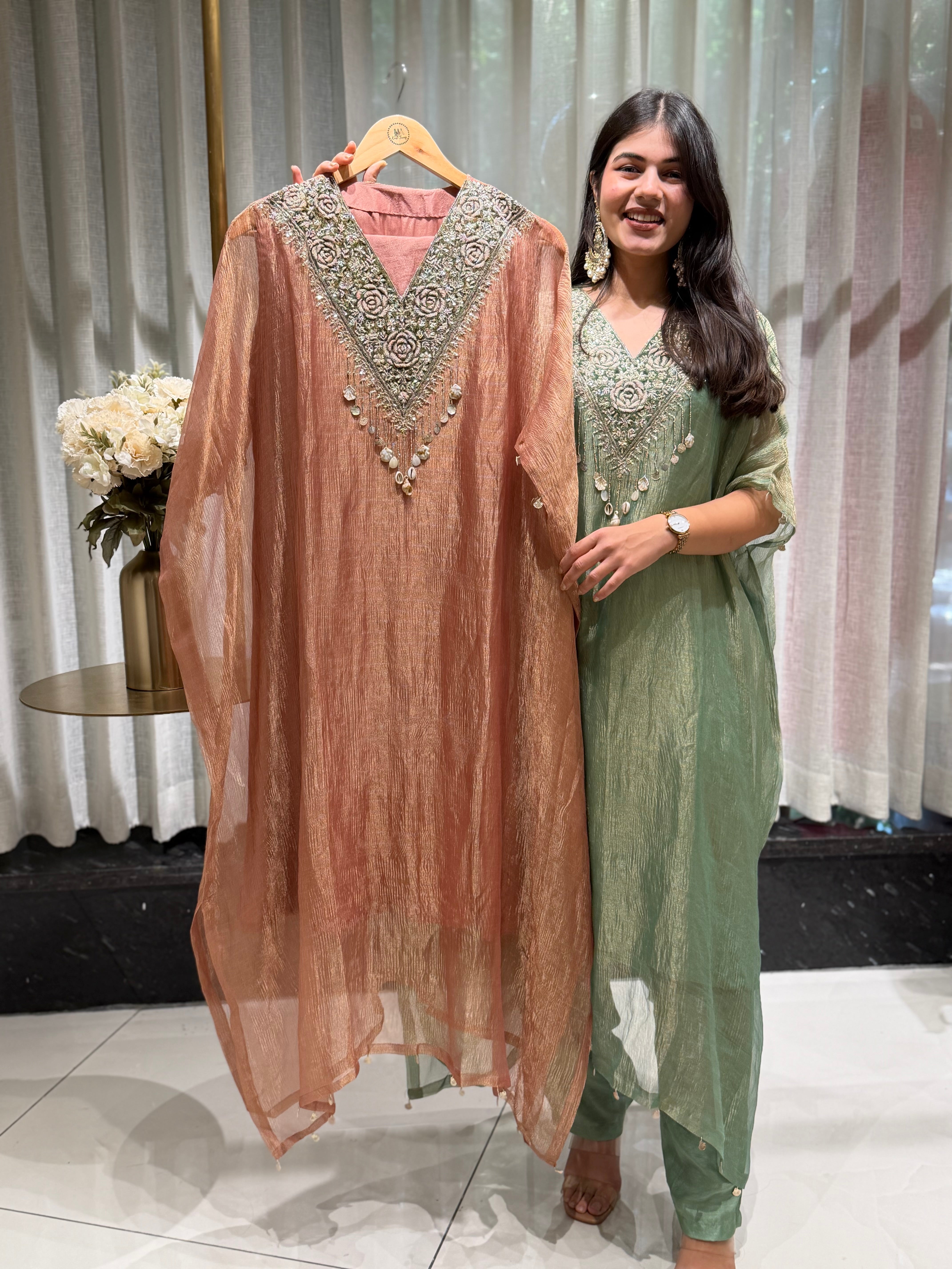 ✅ Premium Banarasi Crush Tissue Kaftan With Golden Zardosi Amd Dabka Handwork On The Yoke