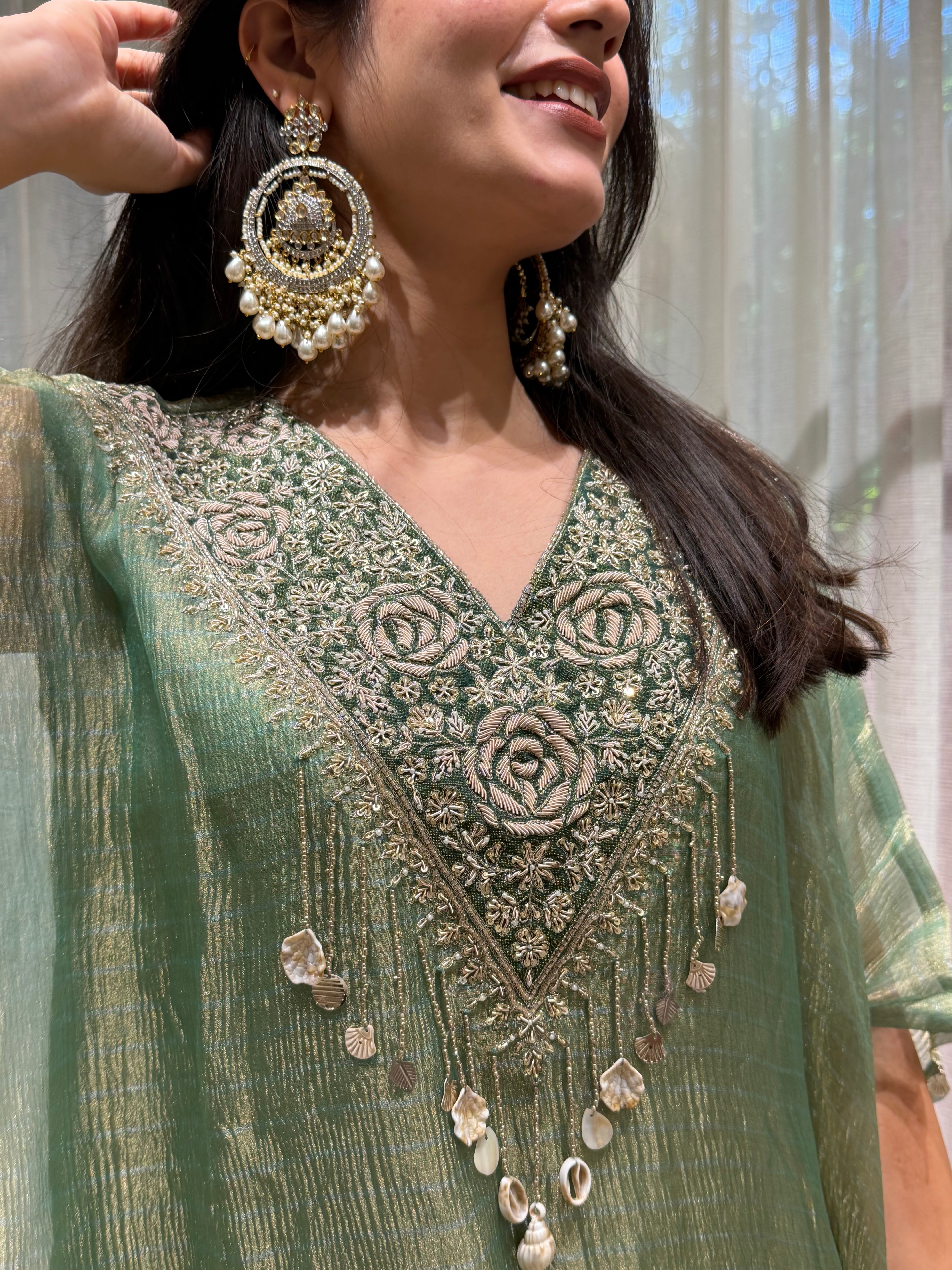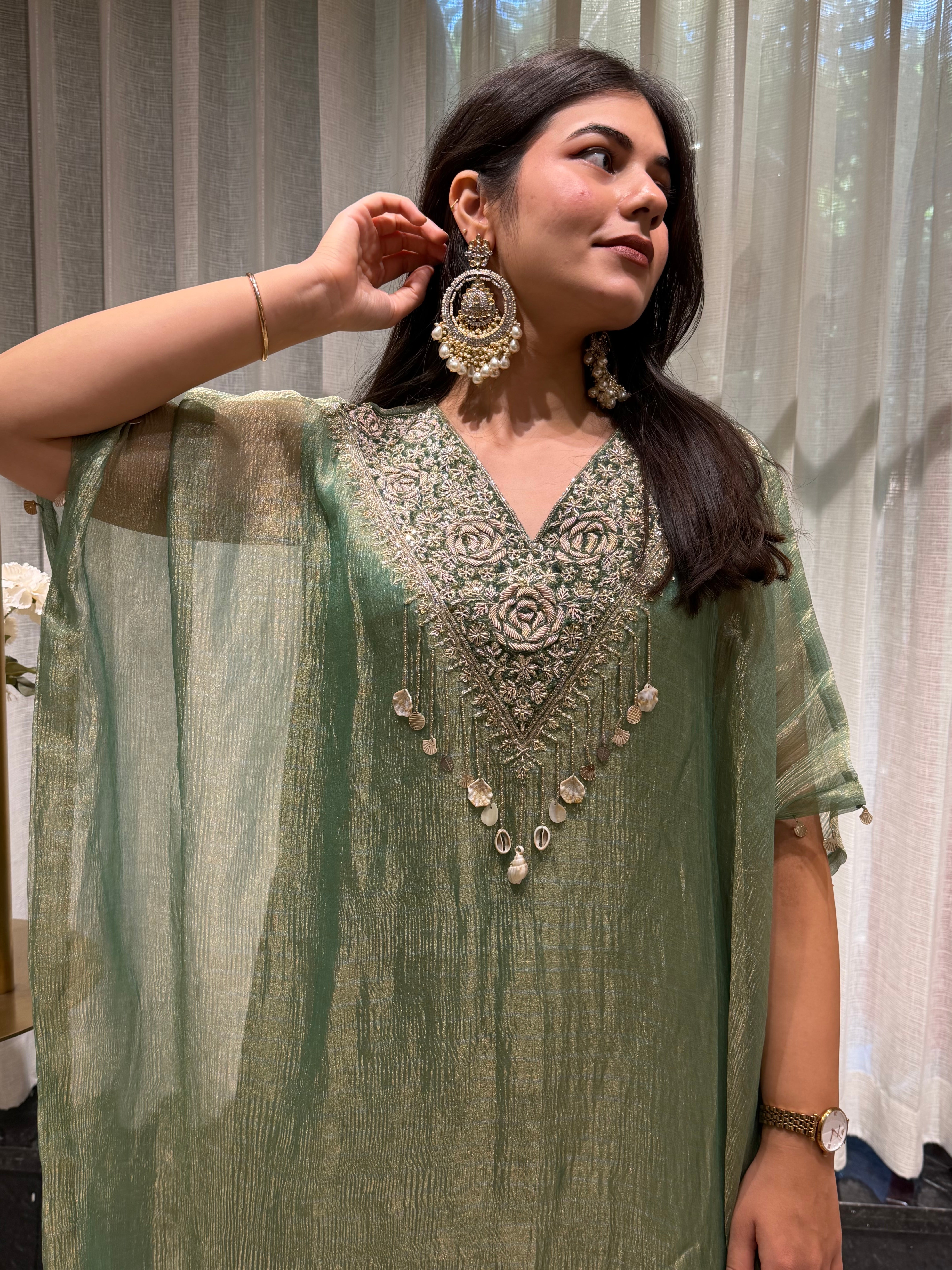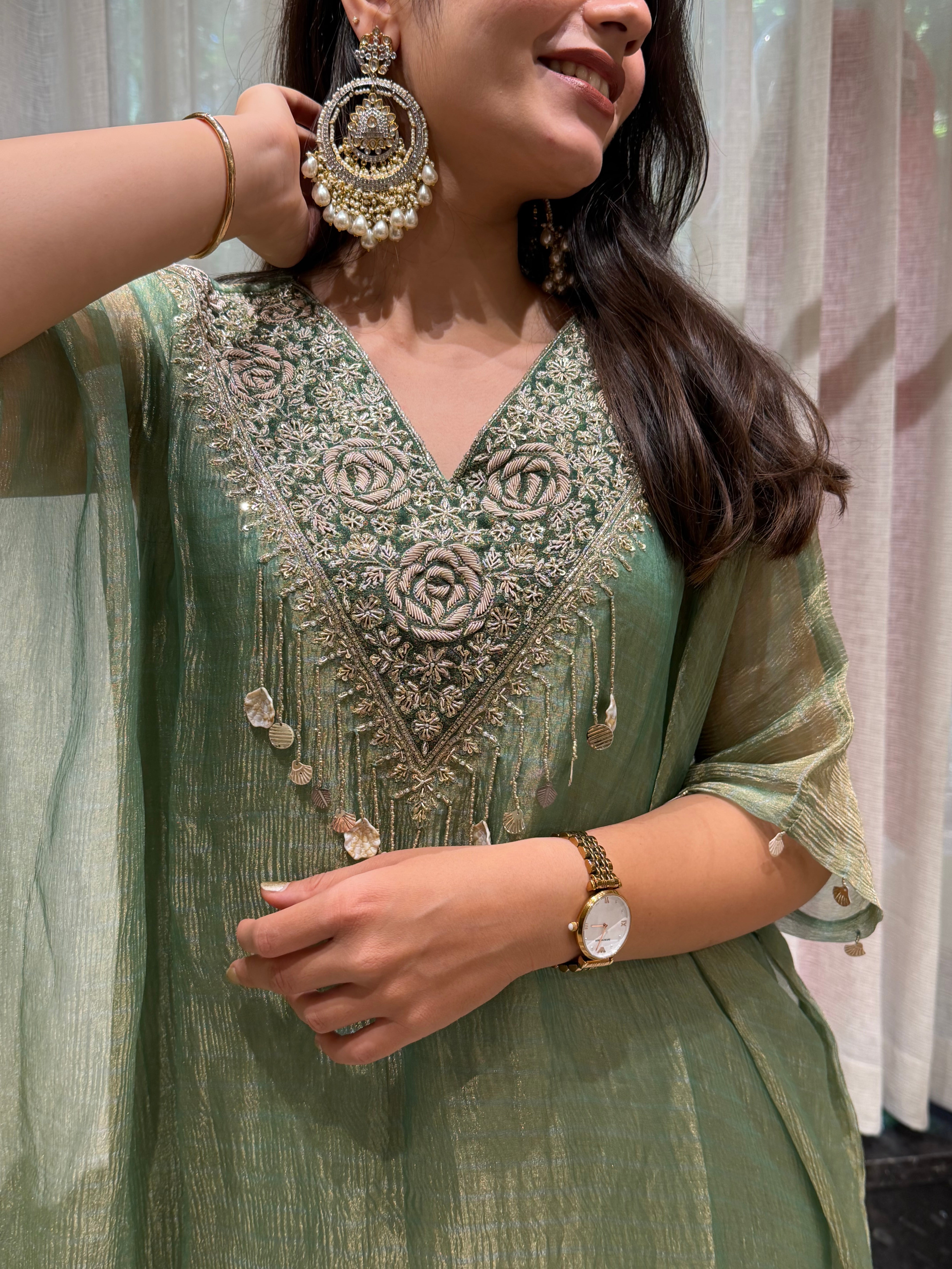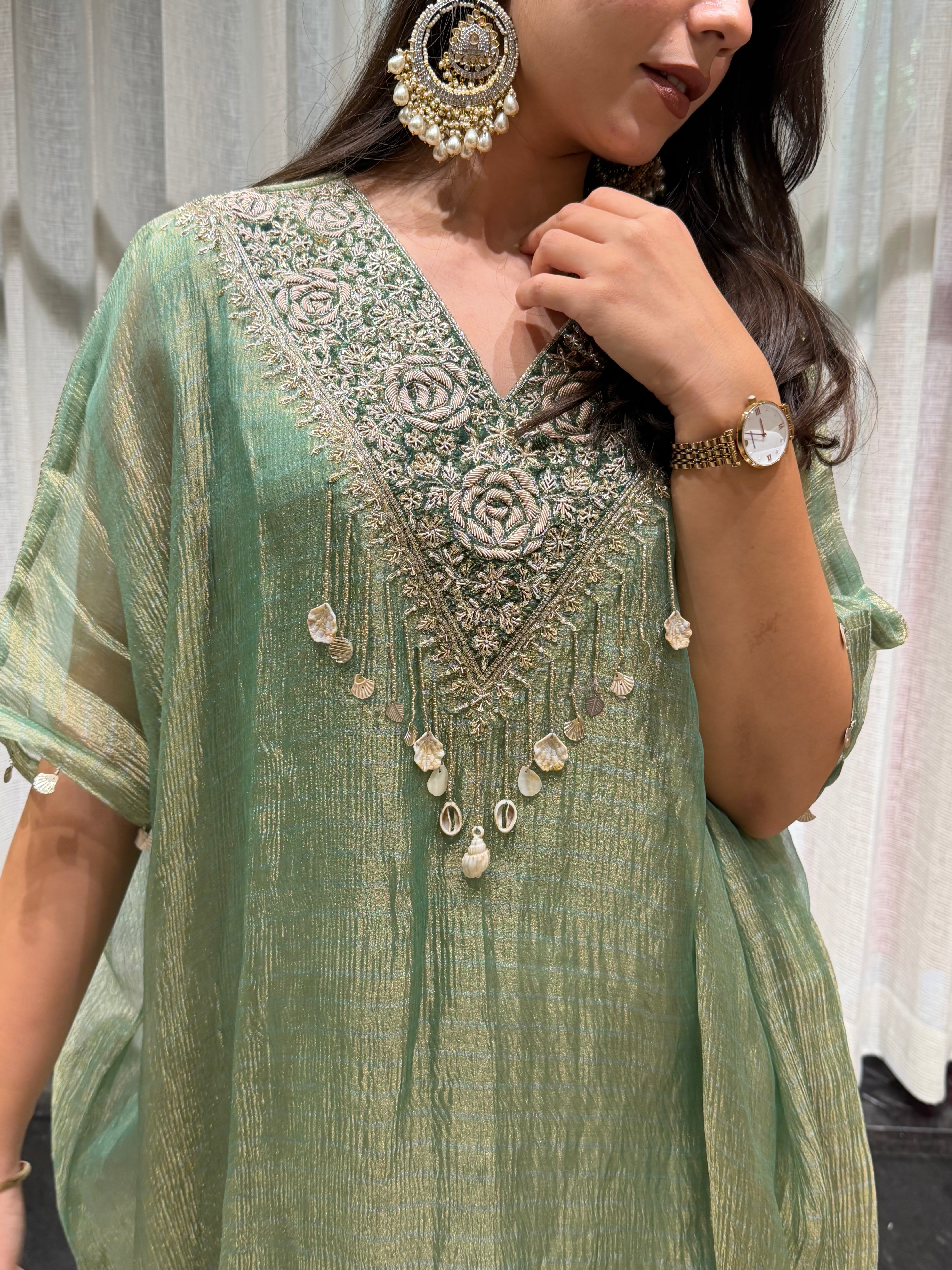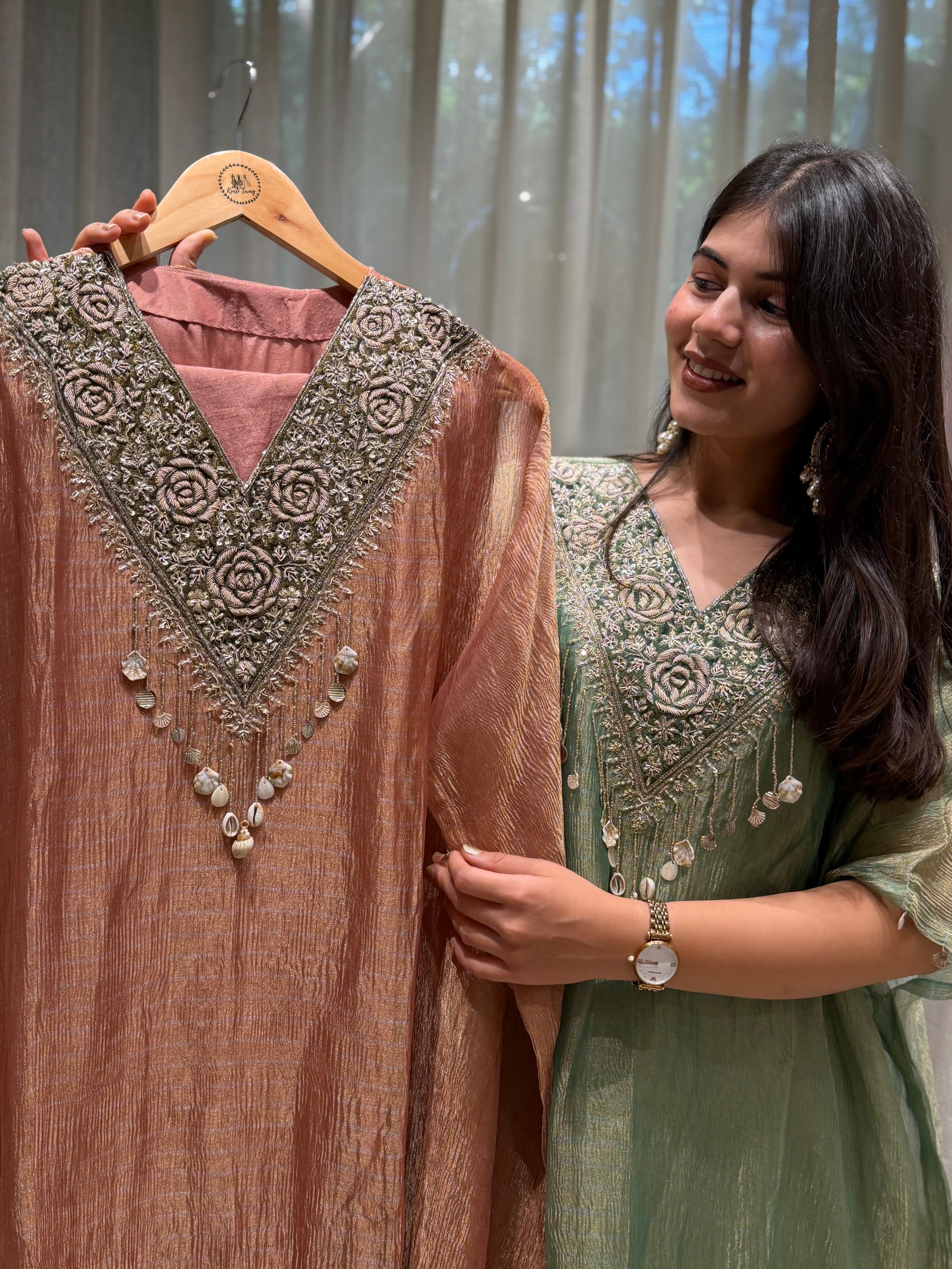 ✅ Premium Banarasi Crush Tissue Kaftan With Golden Zardosi Amd Dabka Handwork On The Yoke