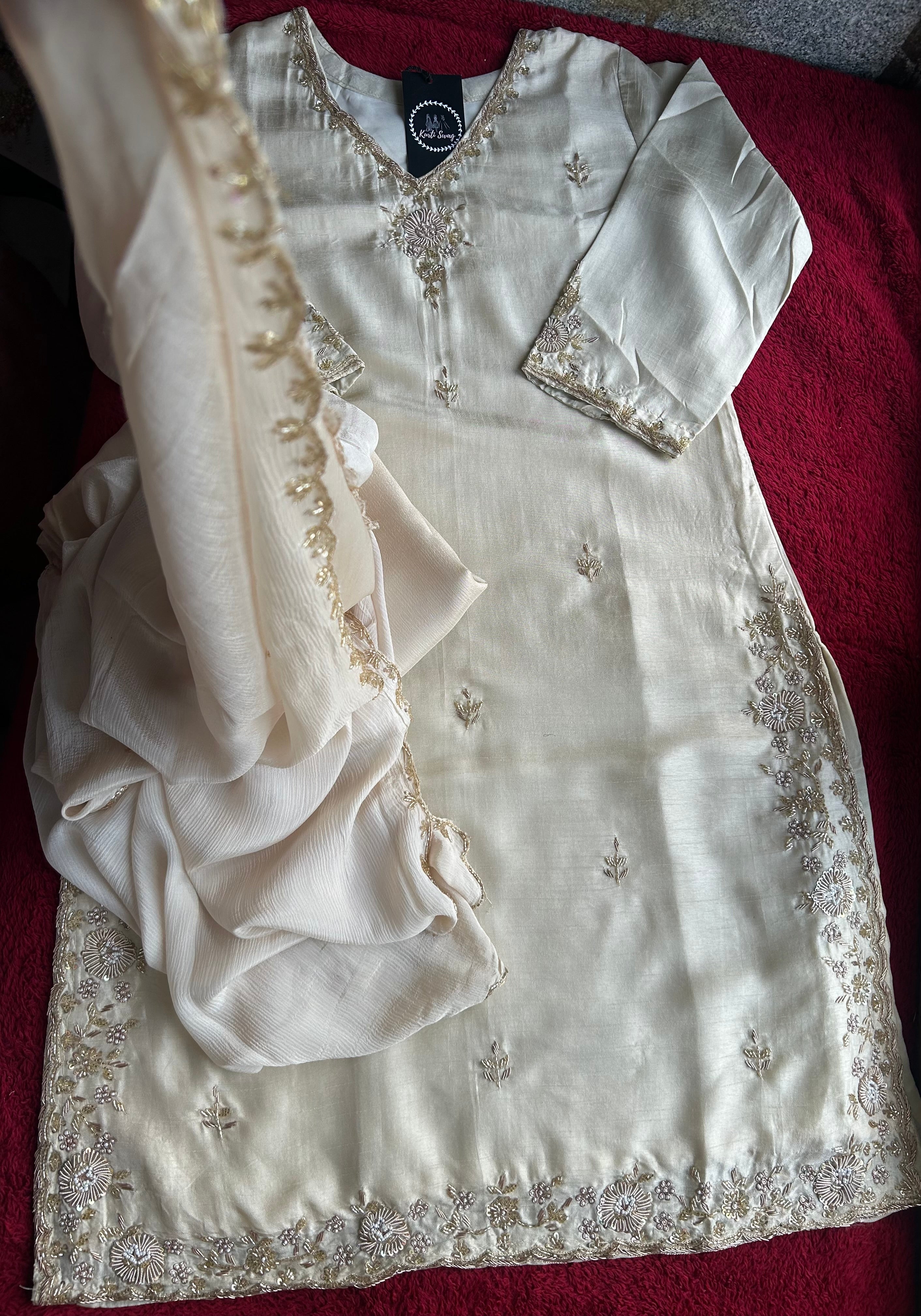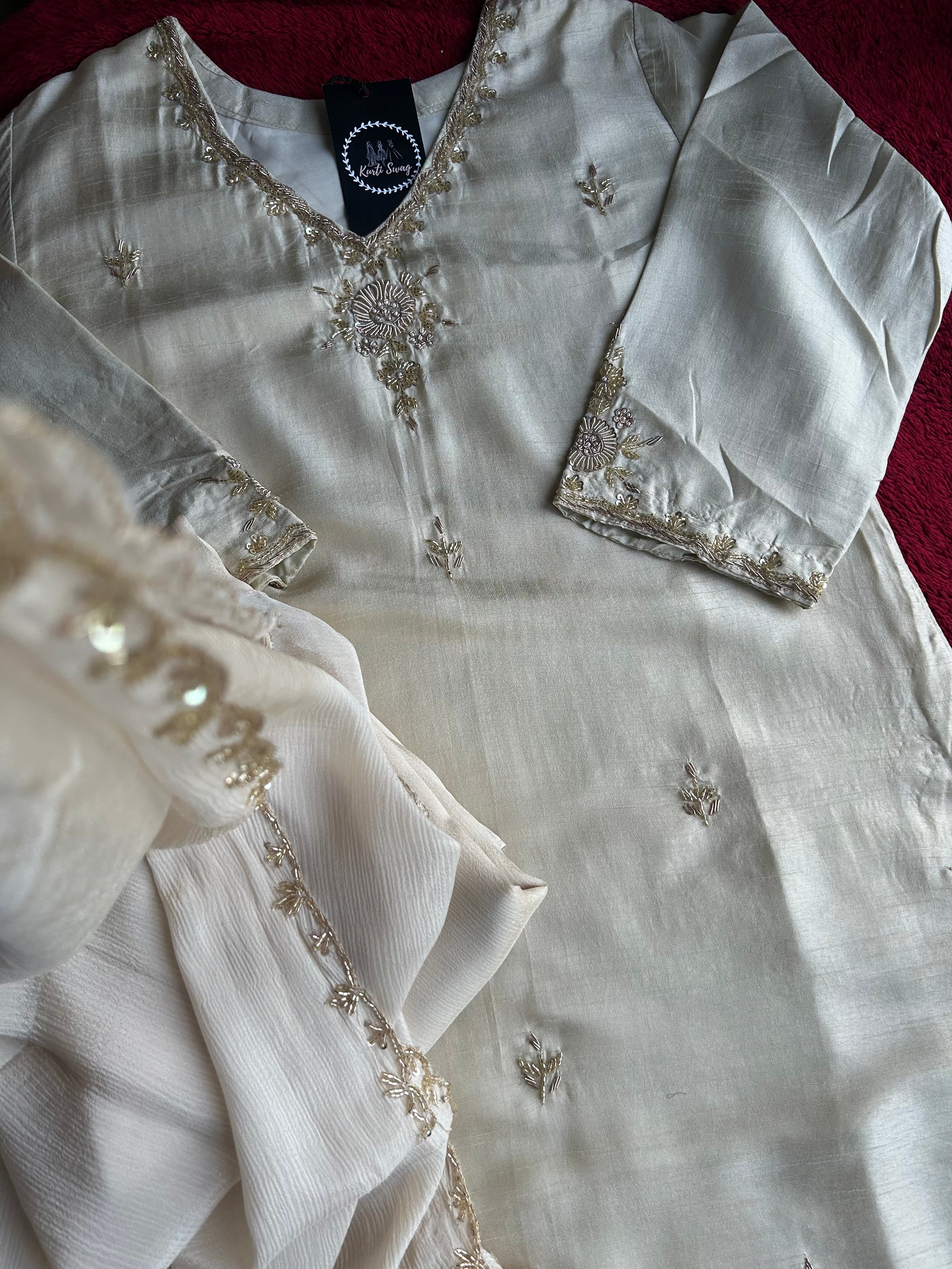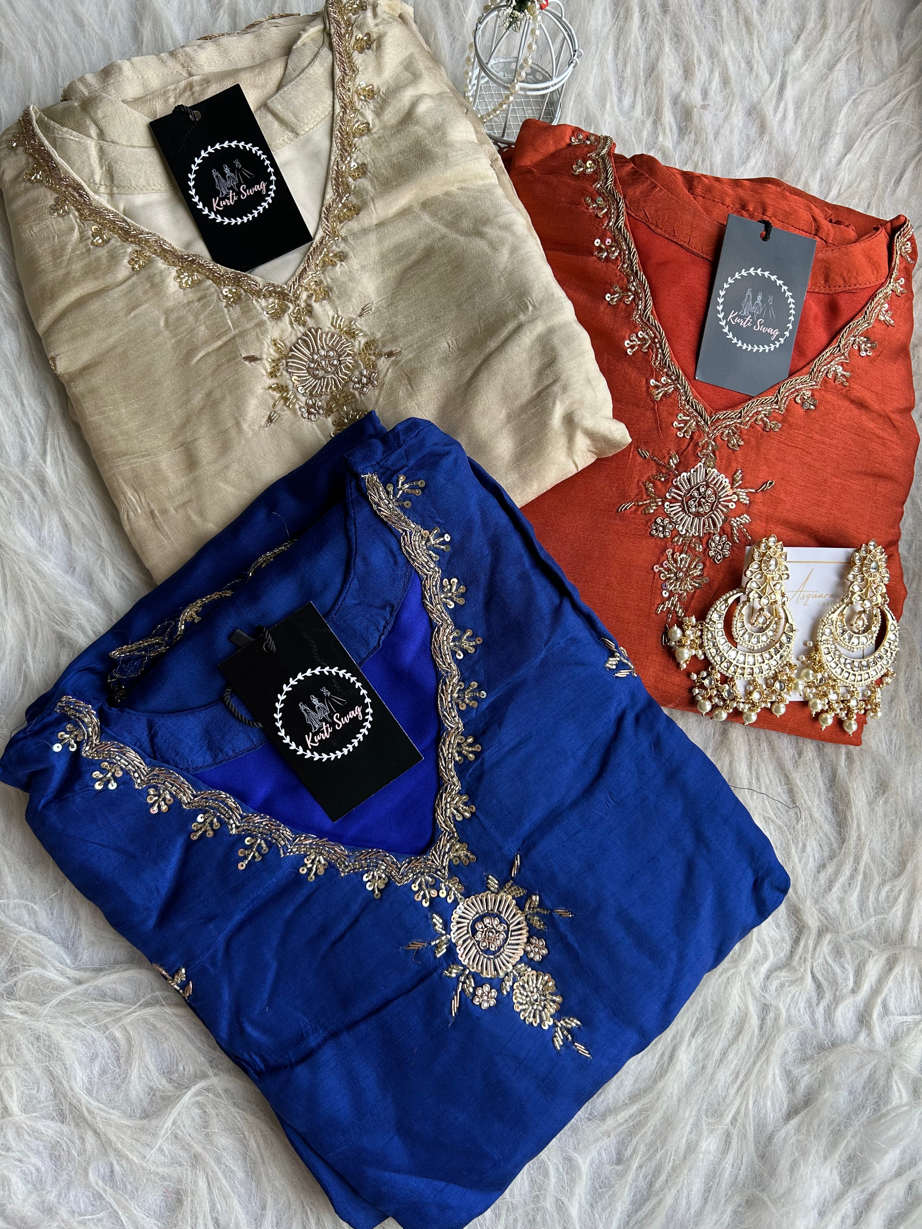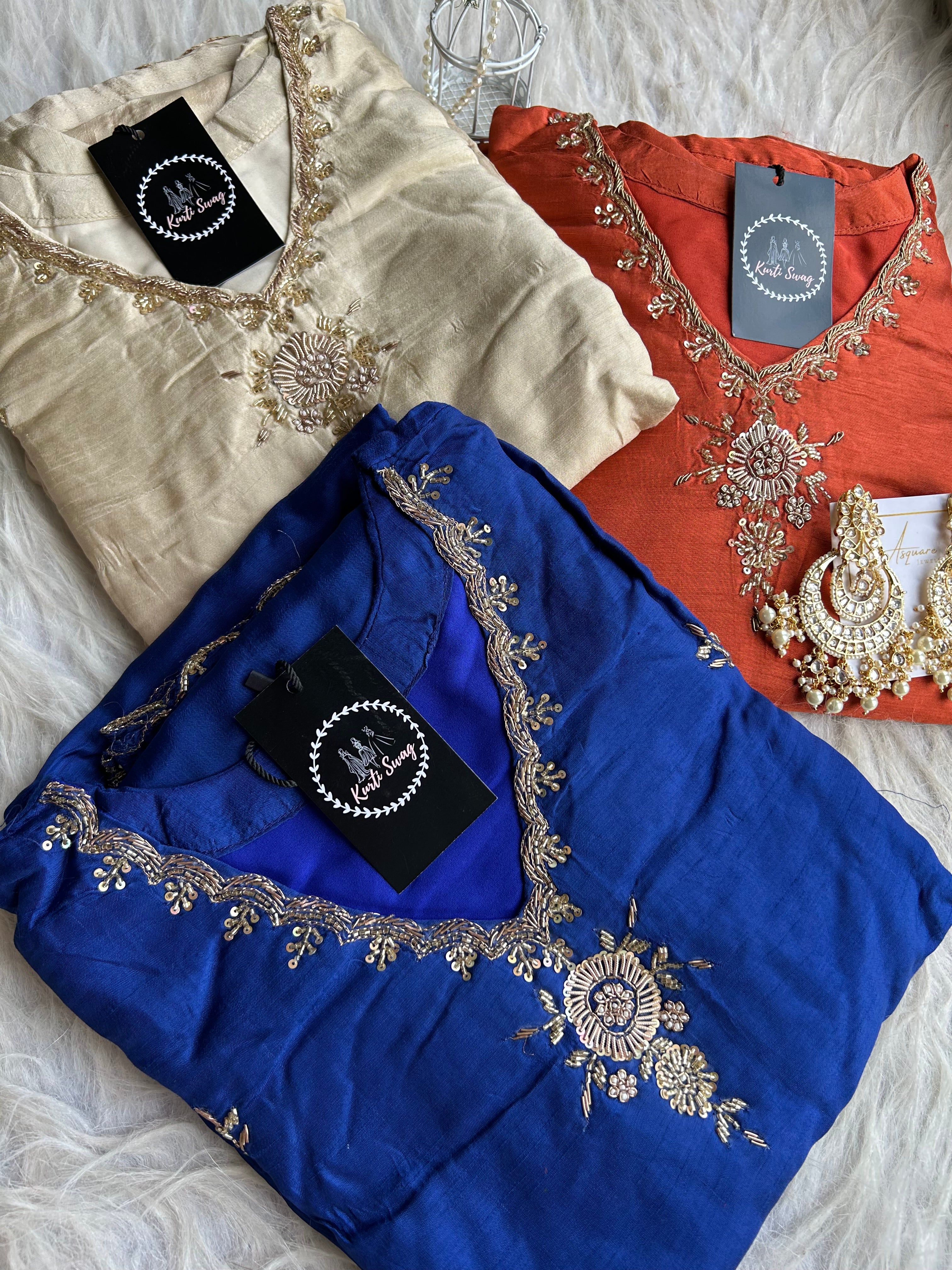 ✅ Premium Dola Silk Kurti With Zardosi & Dabka Handwork on the Neckline And On The Sides Of The Kurta