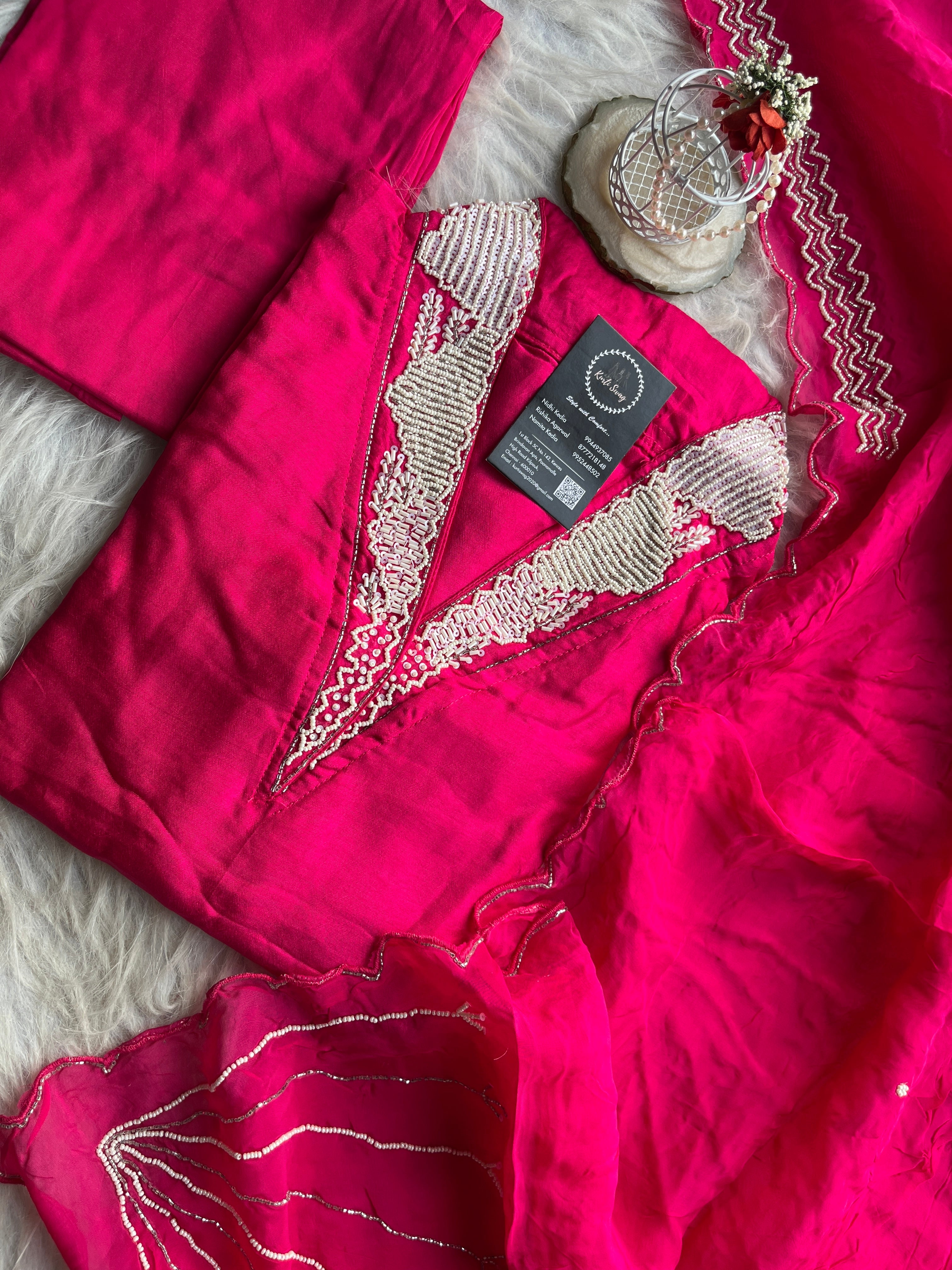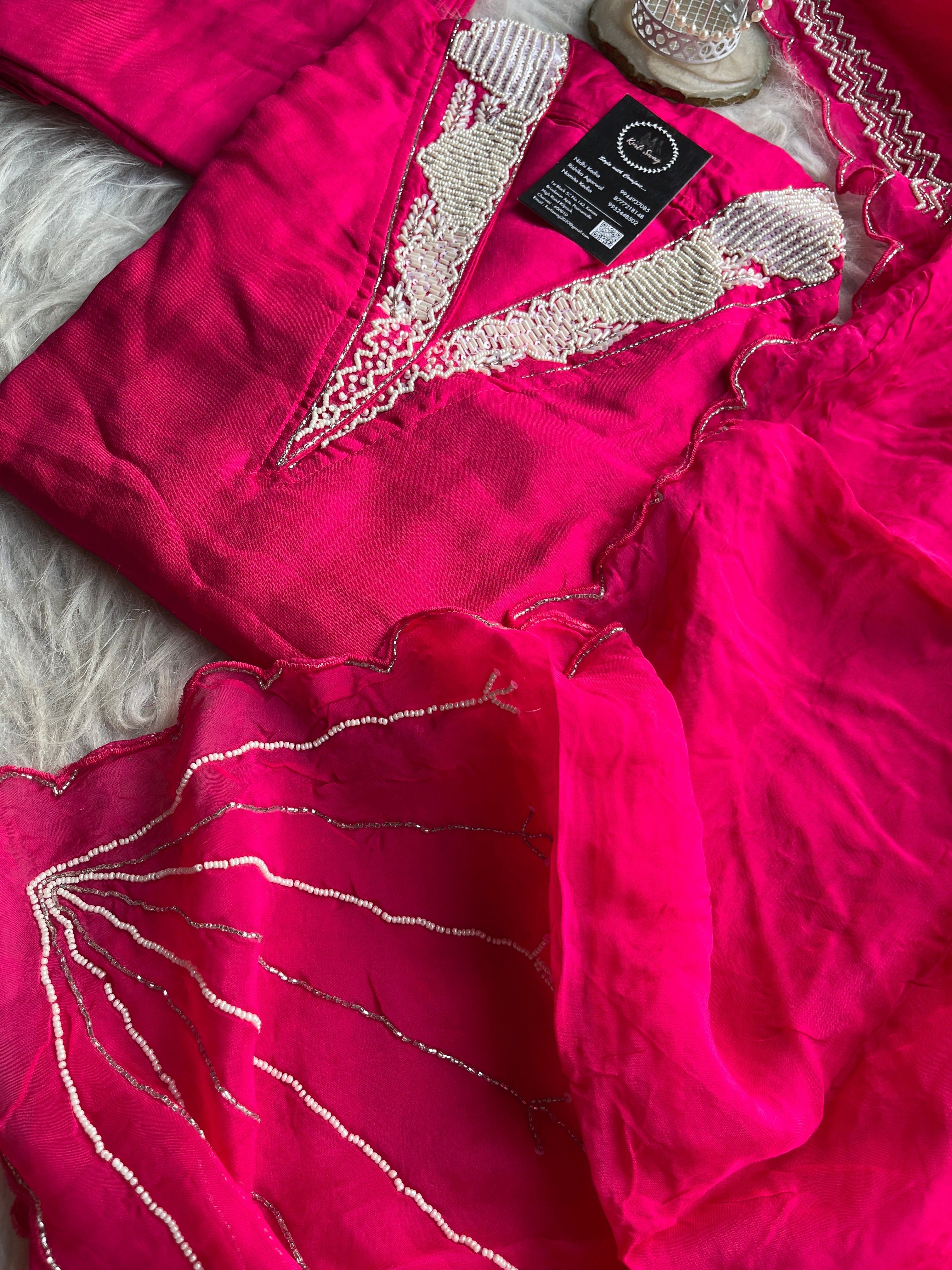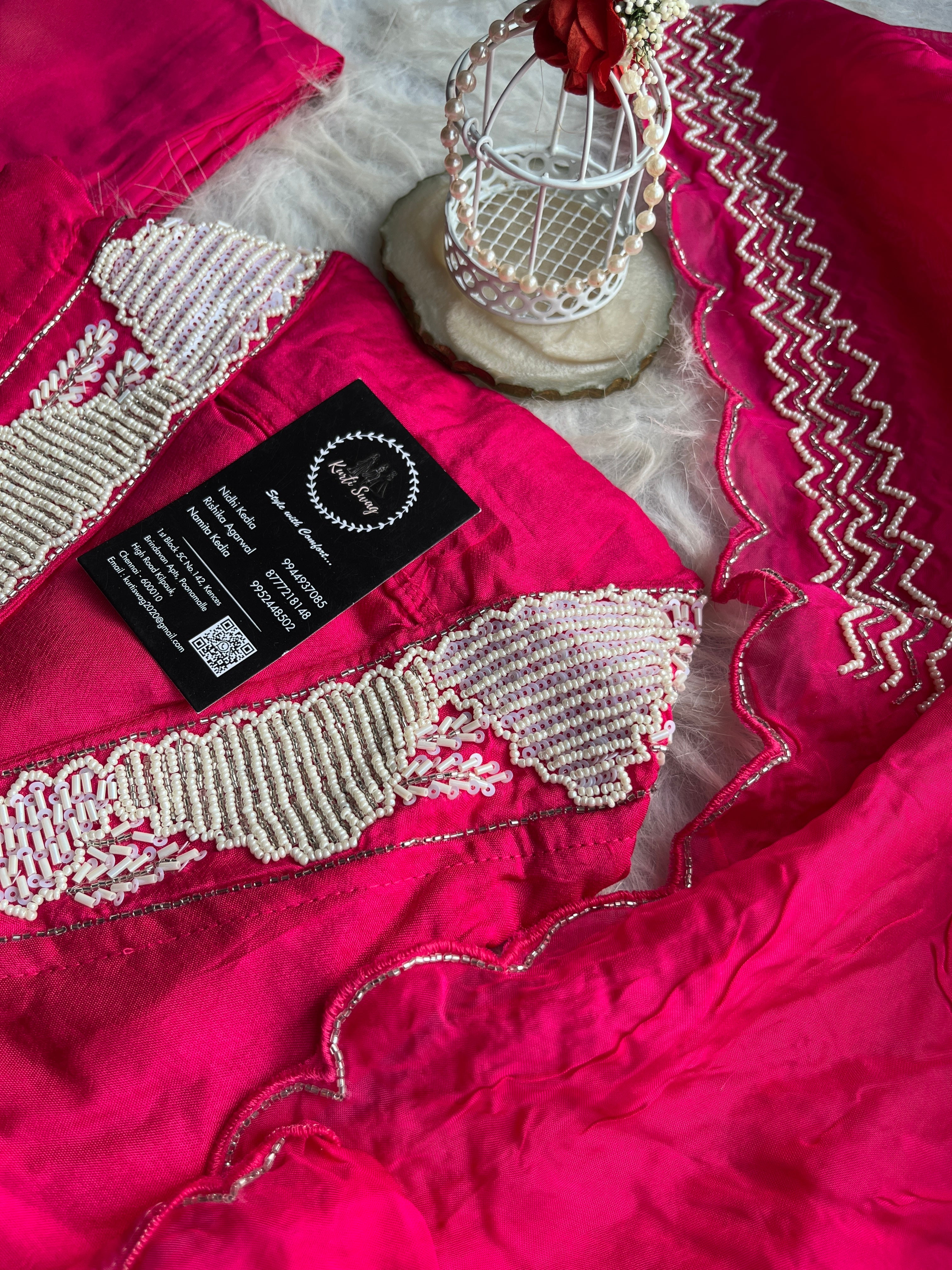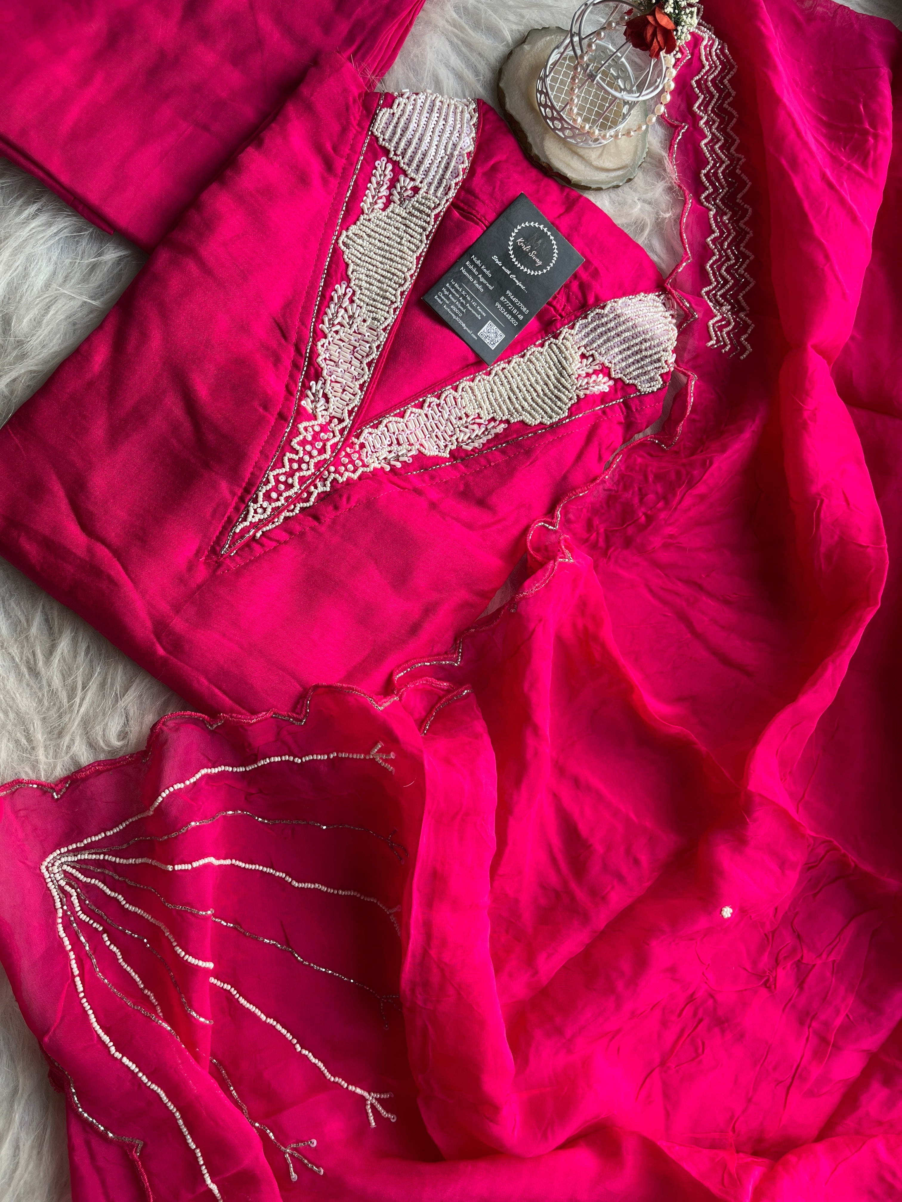 “PEARLS” Dola Silk Pearl Embellished Suit Set With Organza Dupatta ✨💕