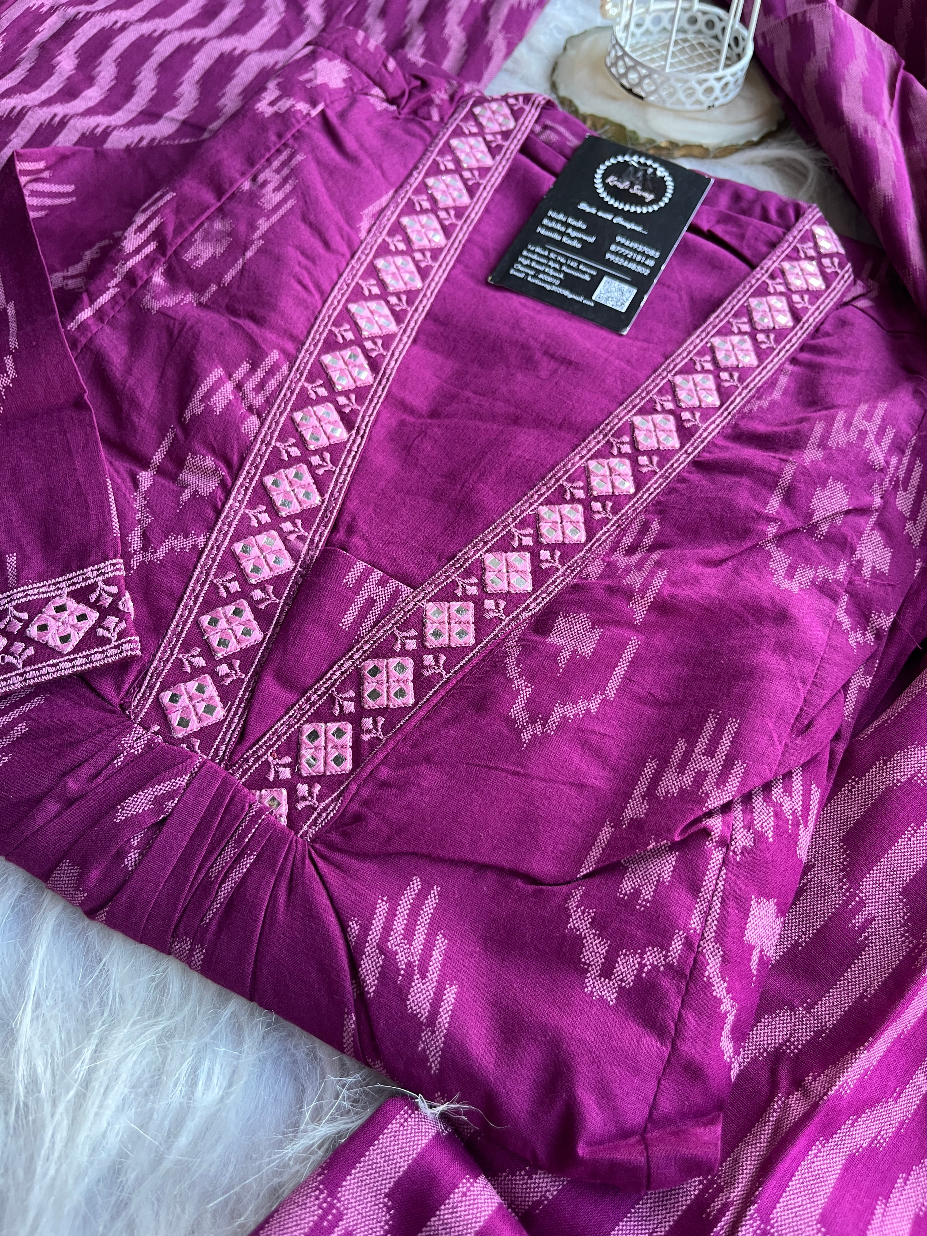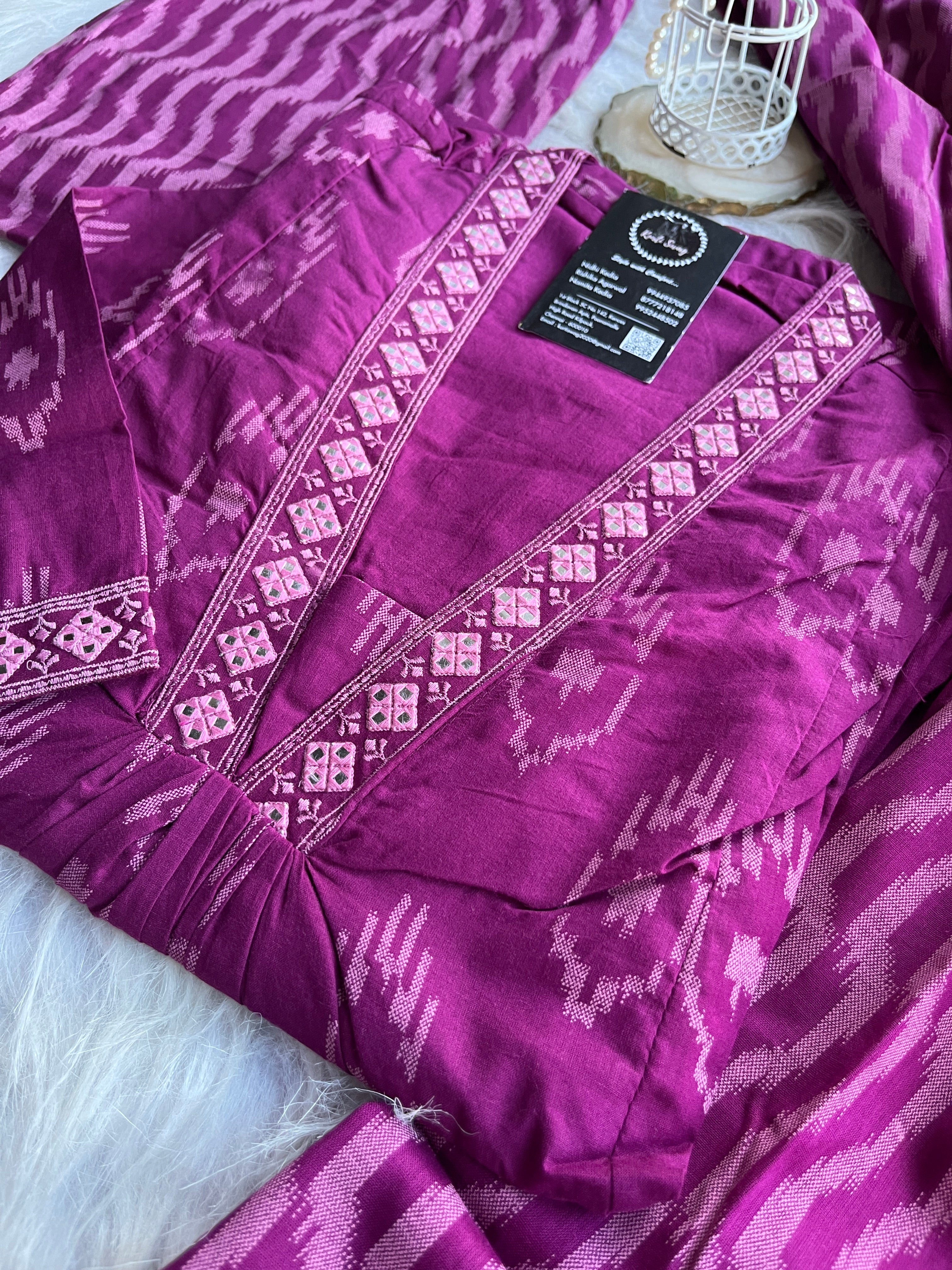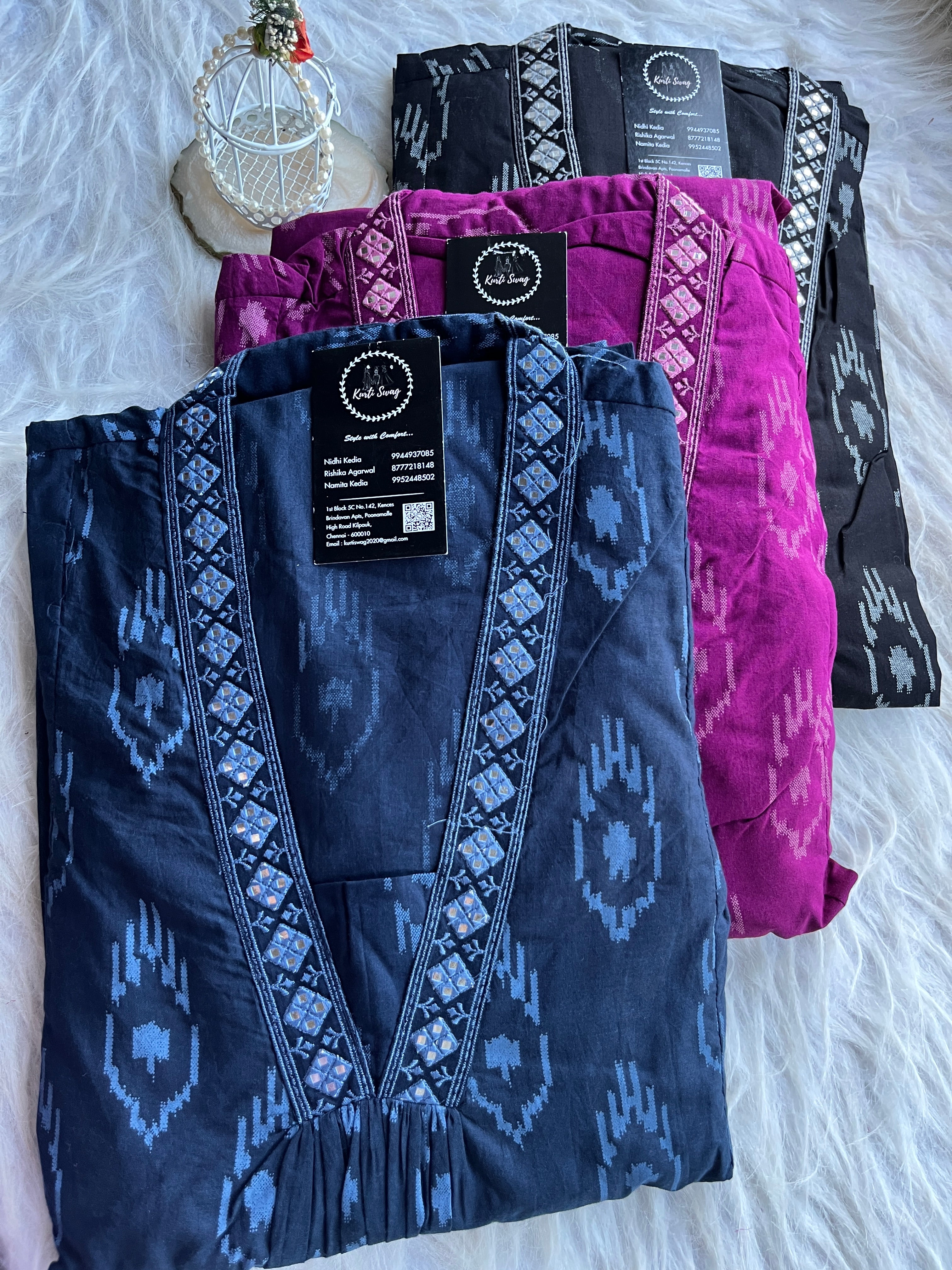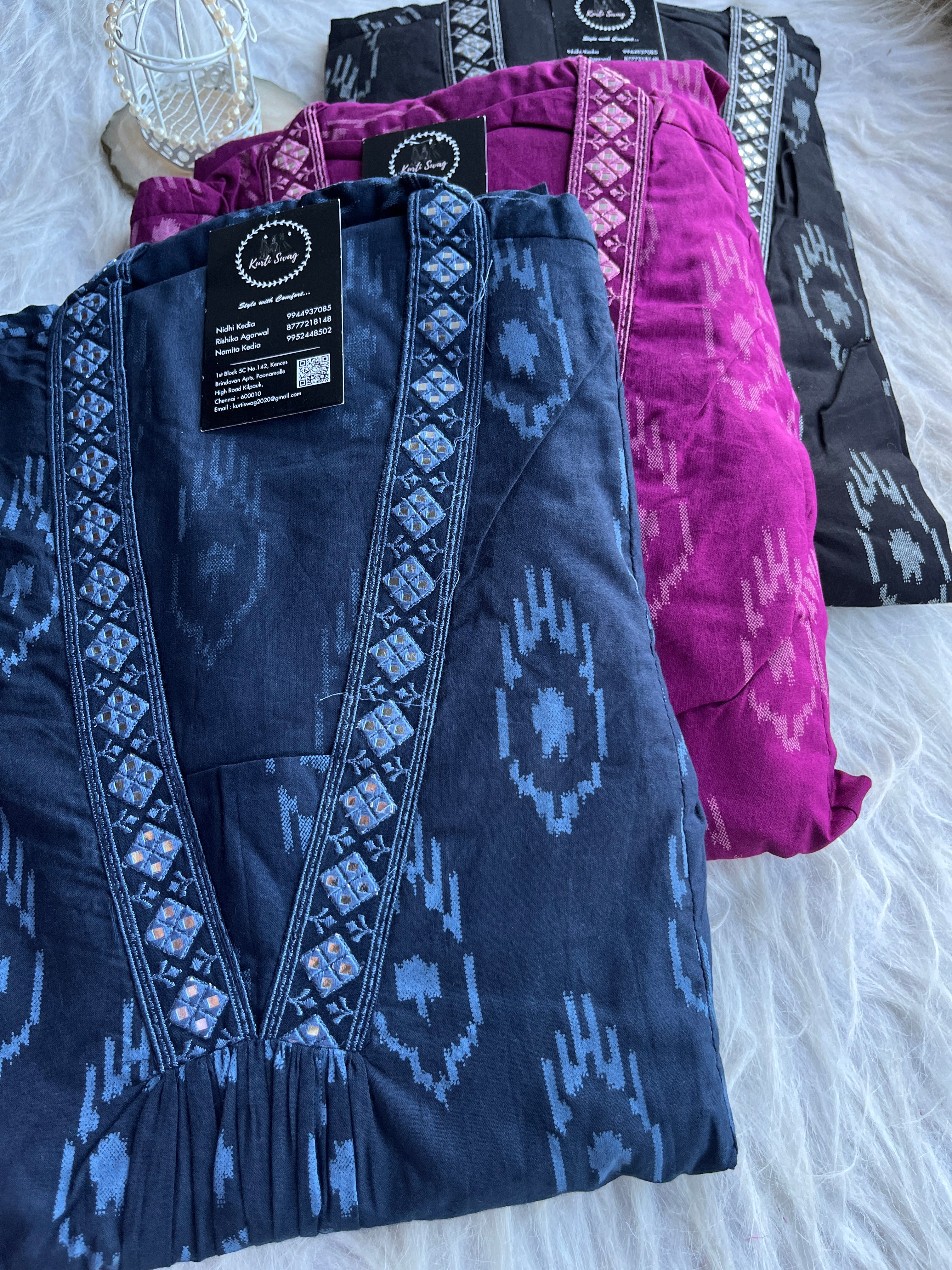 ✅ Pure Cotton Ikkat Print Kurti With Embroidery Detailing On The Neckline Of The Kurti