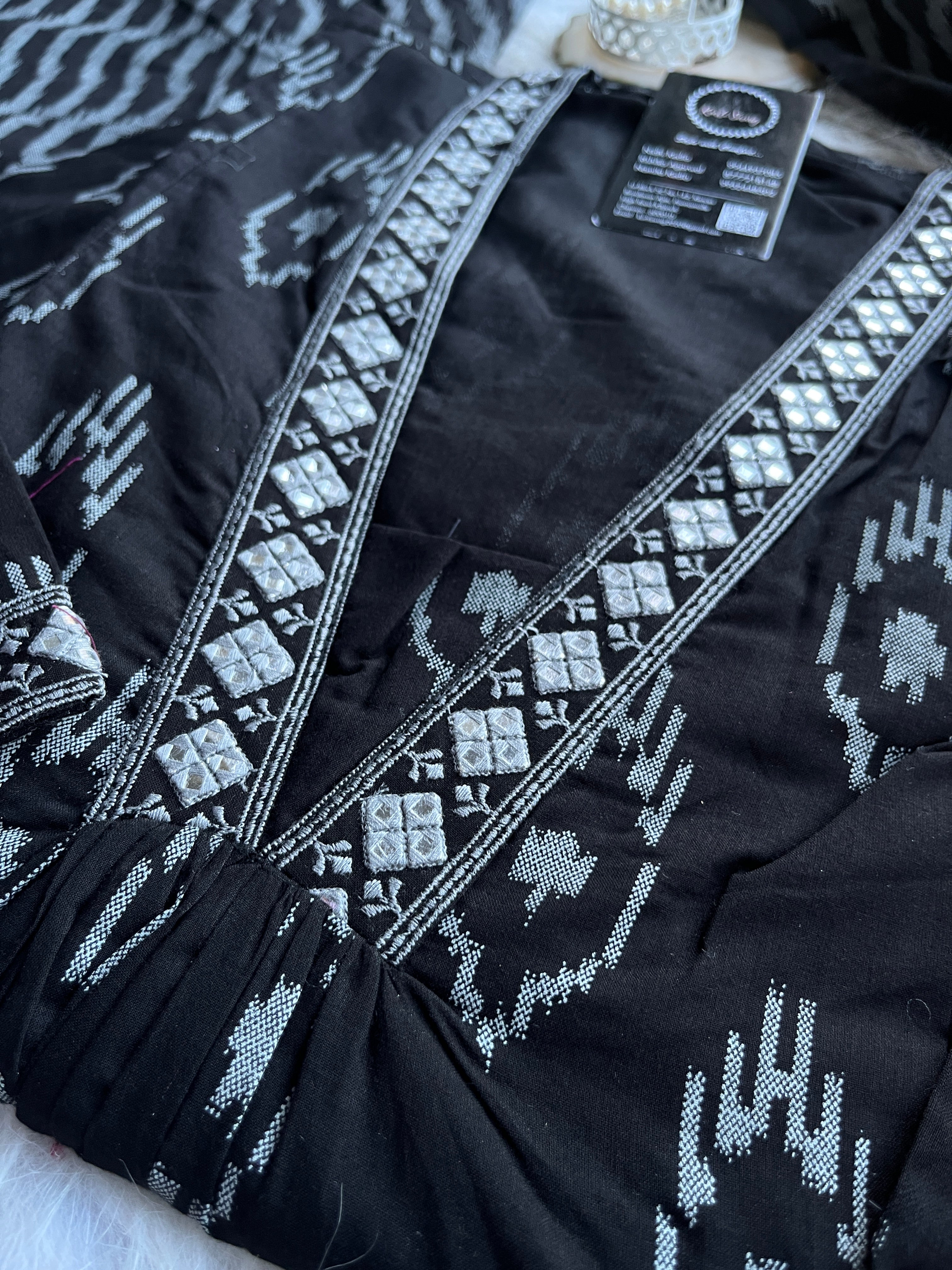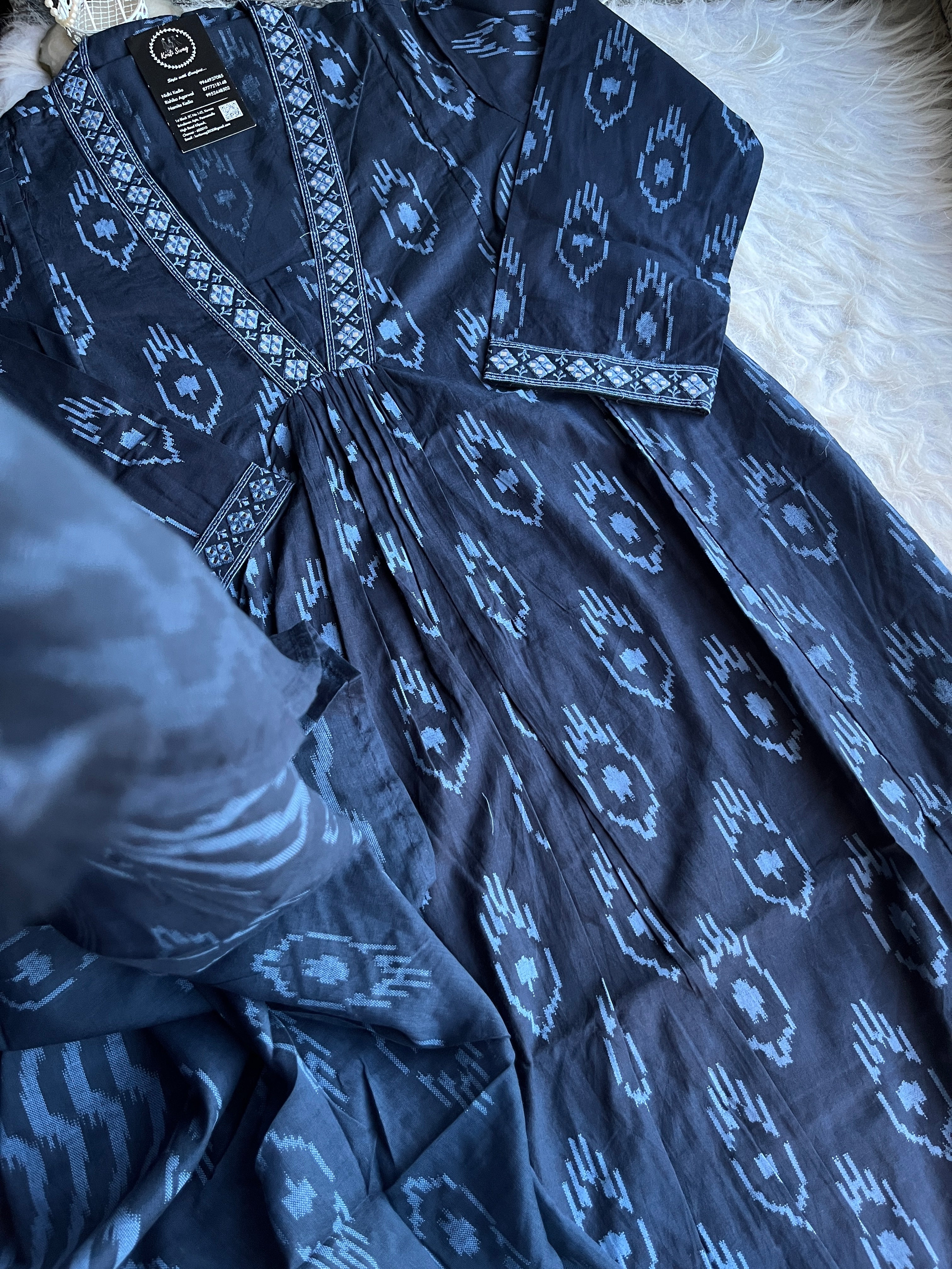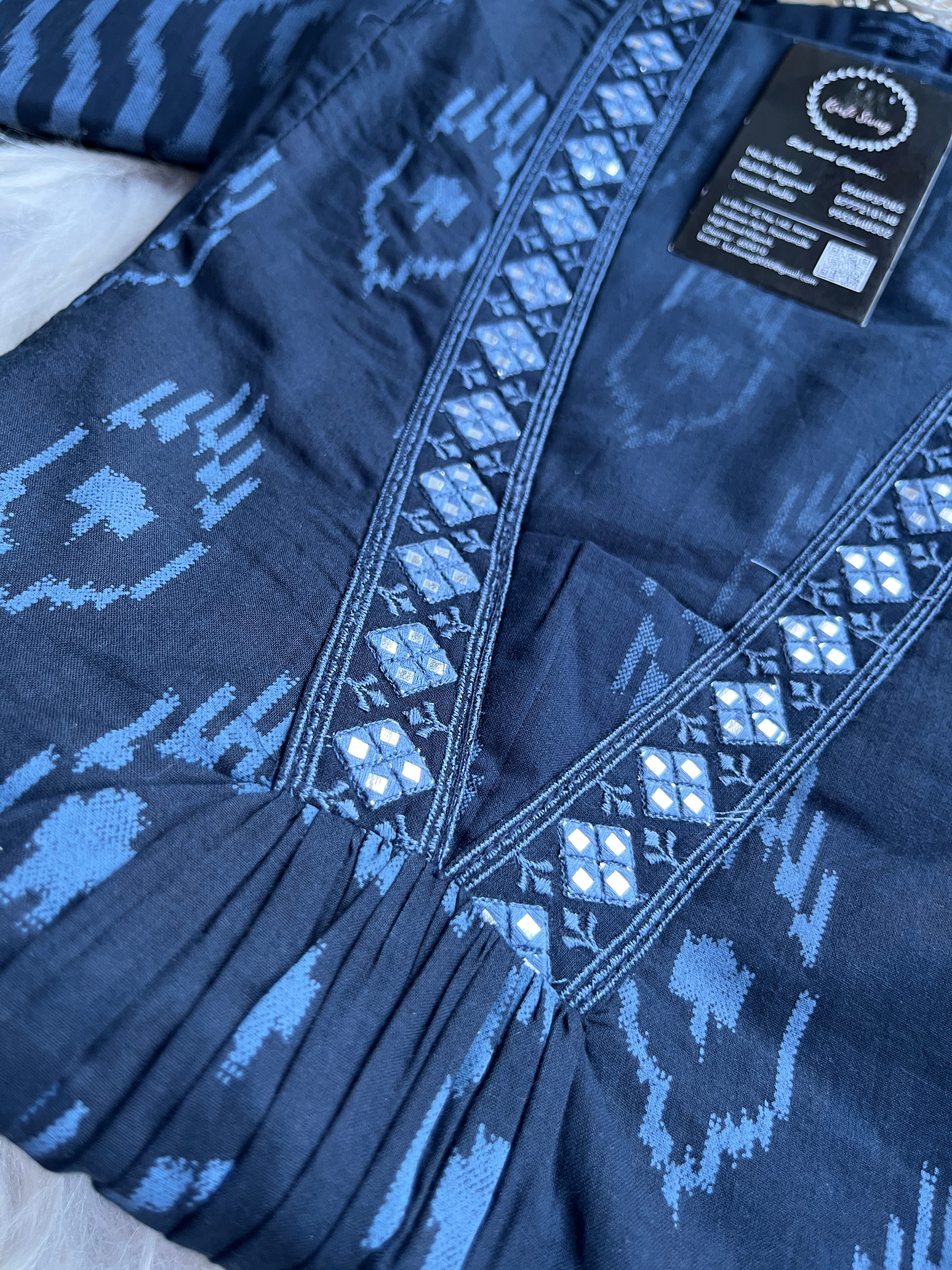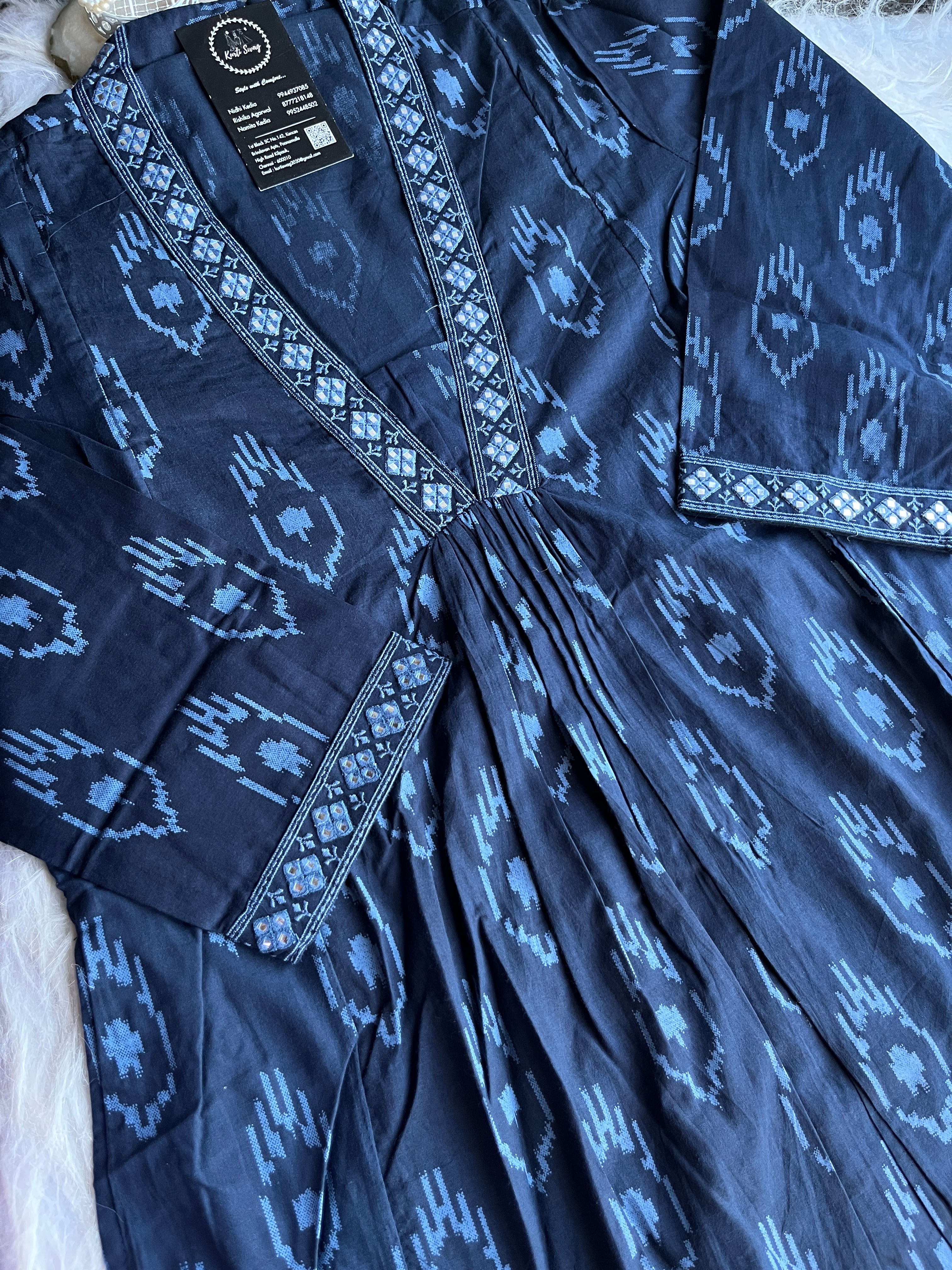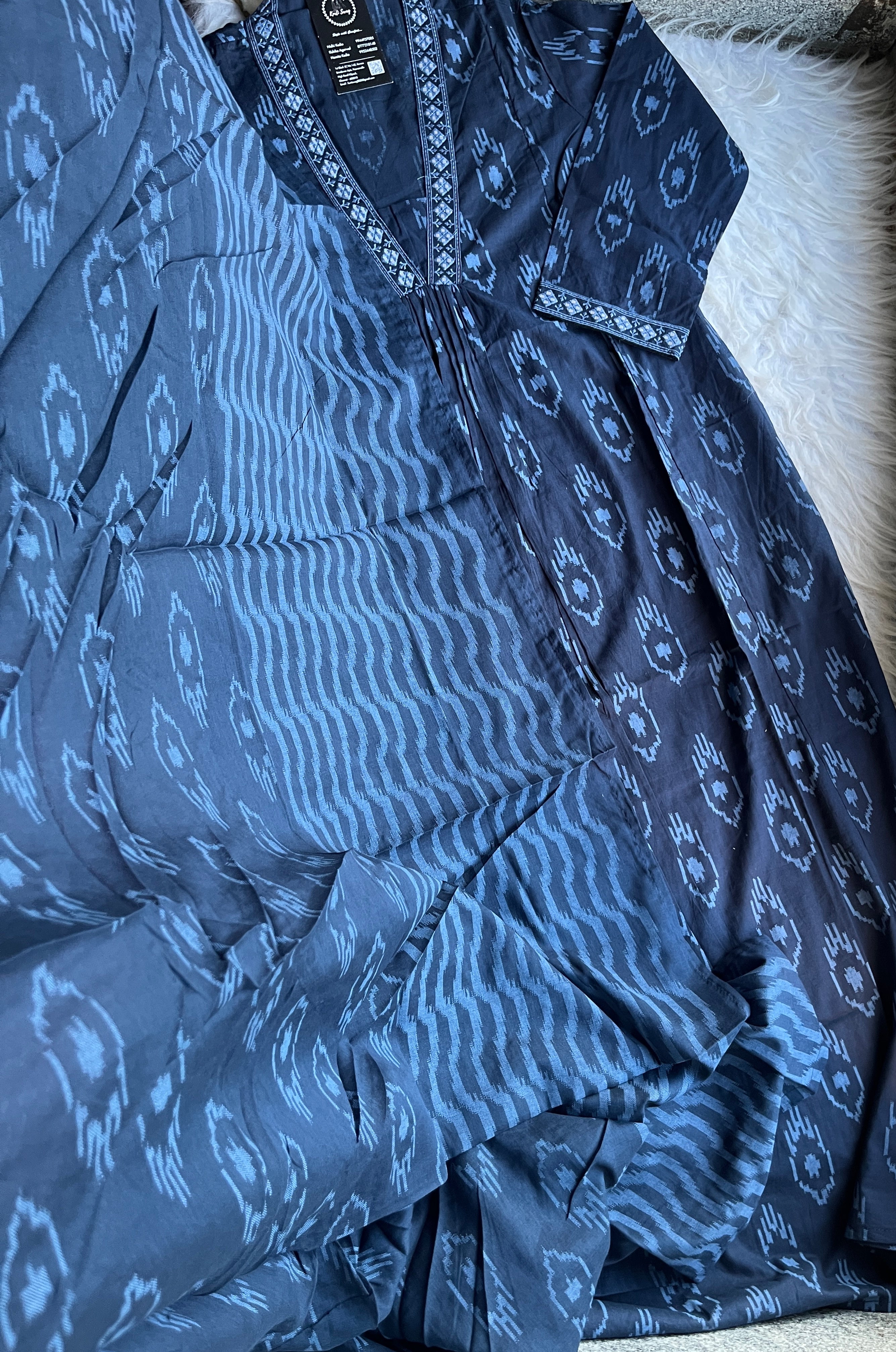 ✅ Pure Cotton Ikkat Print Kurti With Embroidery Detailing On The Neckline Of The Kurti