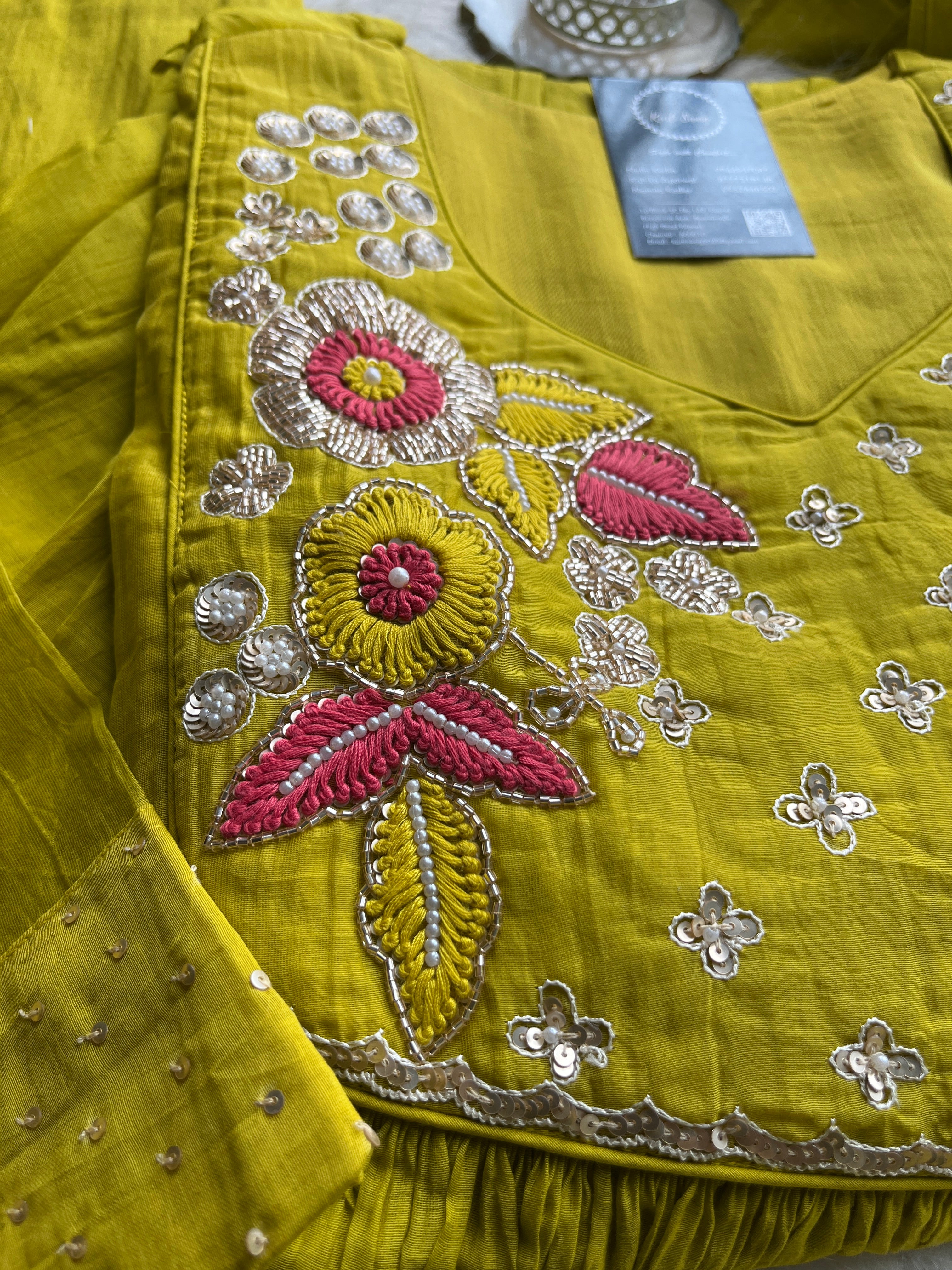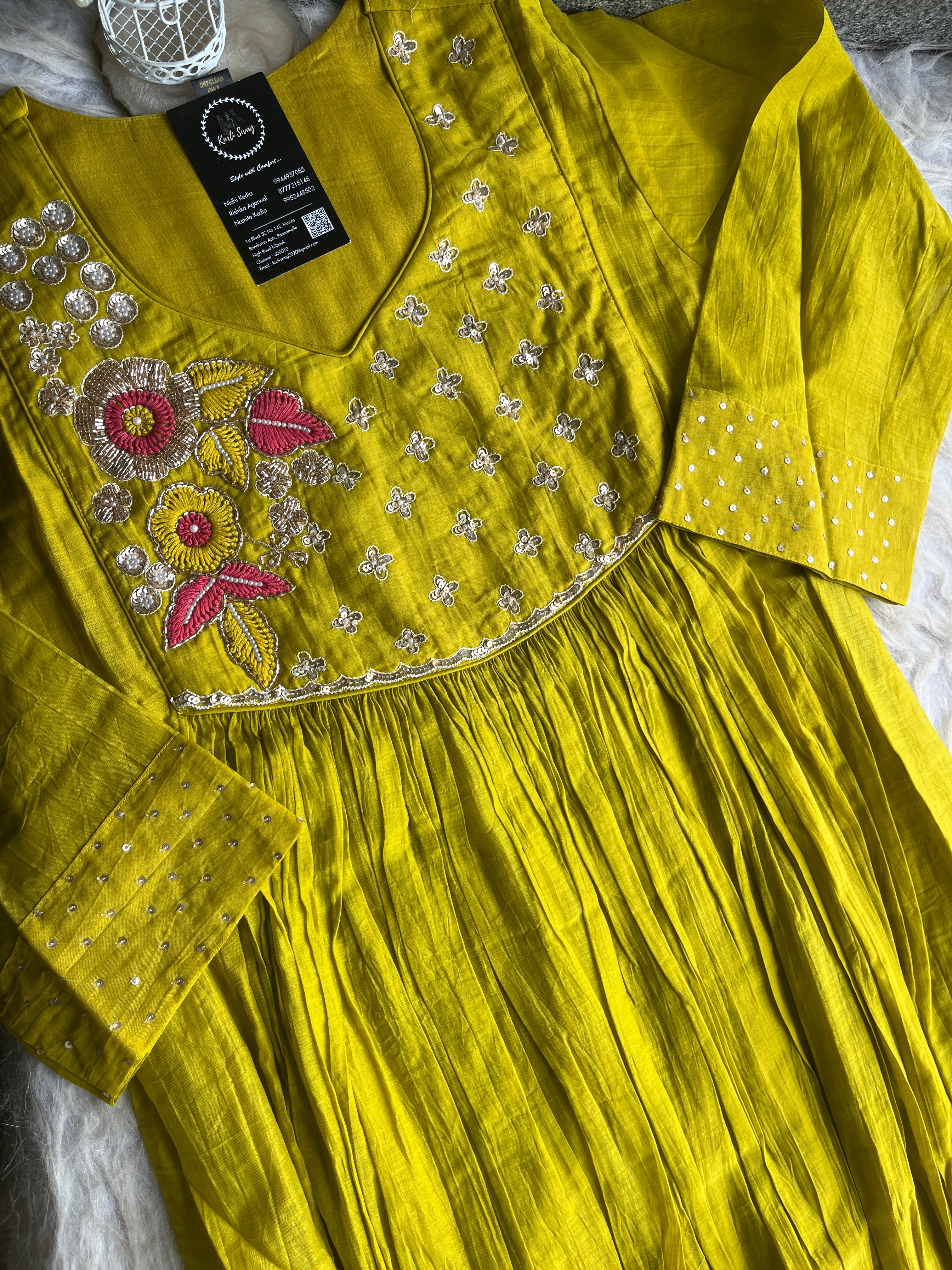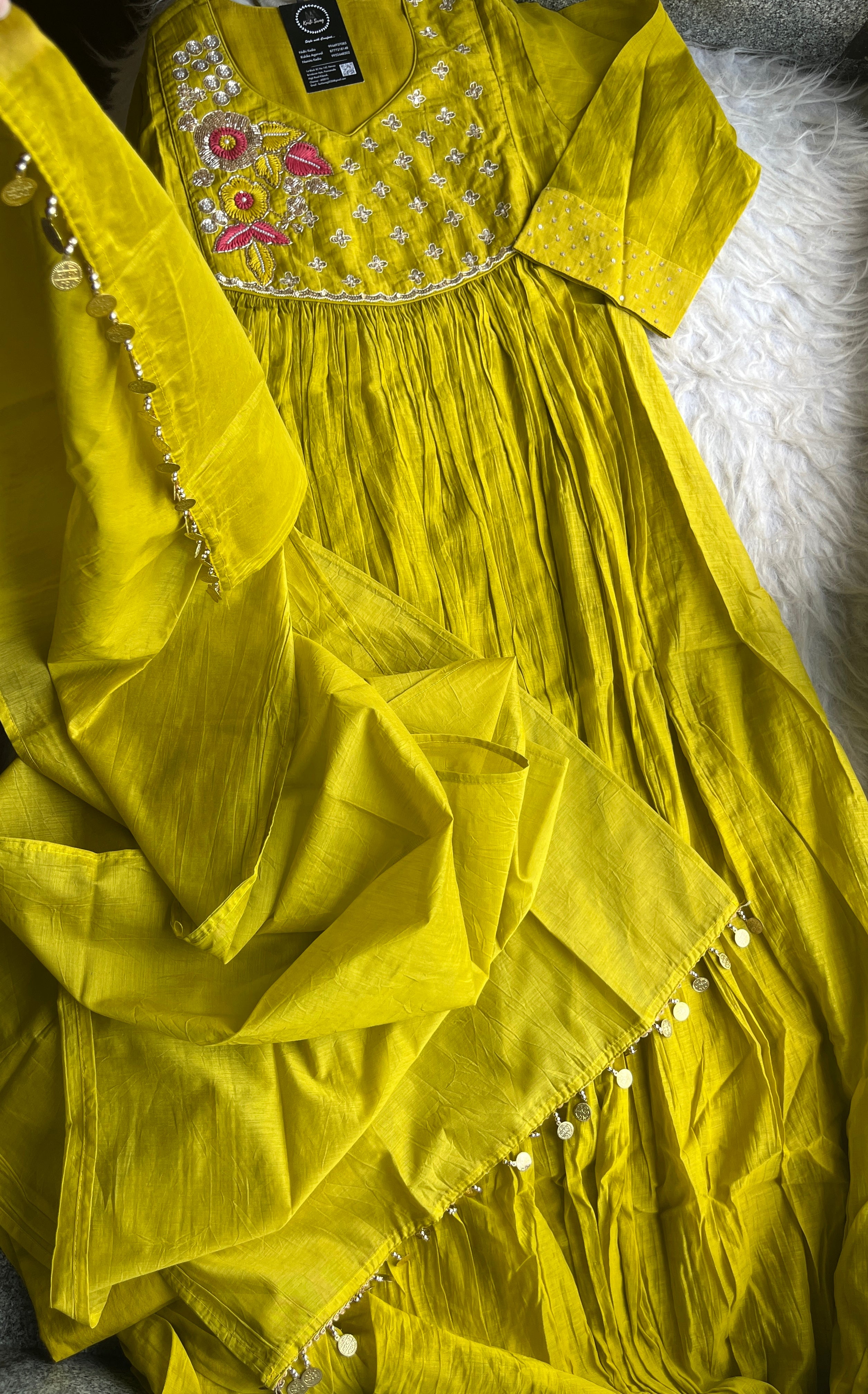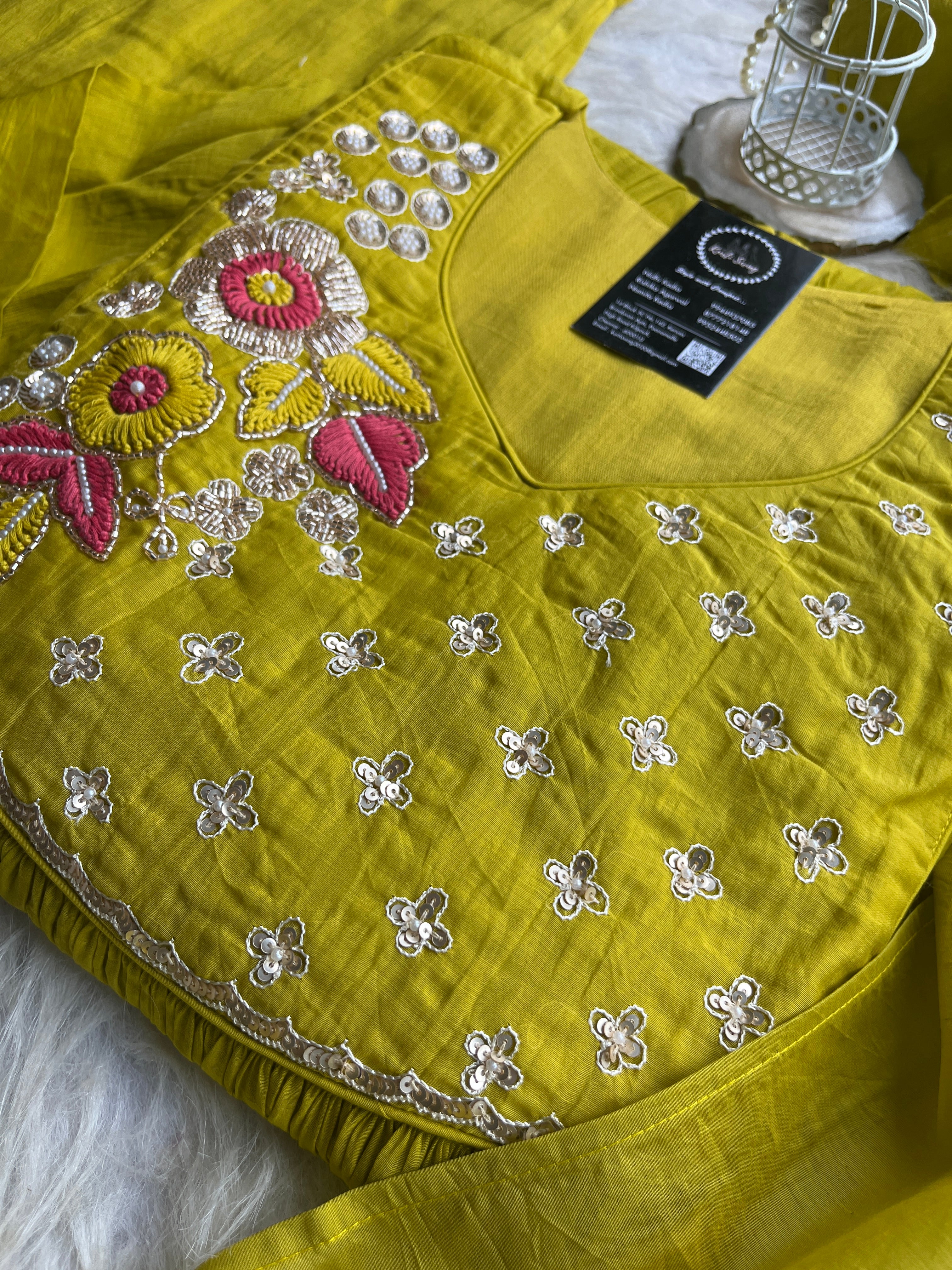 ✅ Premium Mul Chanderi Dress With Thread, Zari And Cutdaana Handwork Work On The Yoke