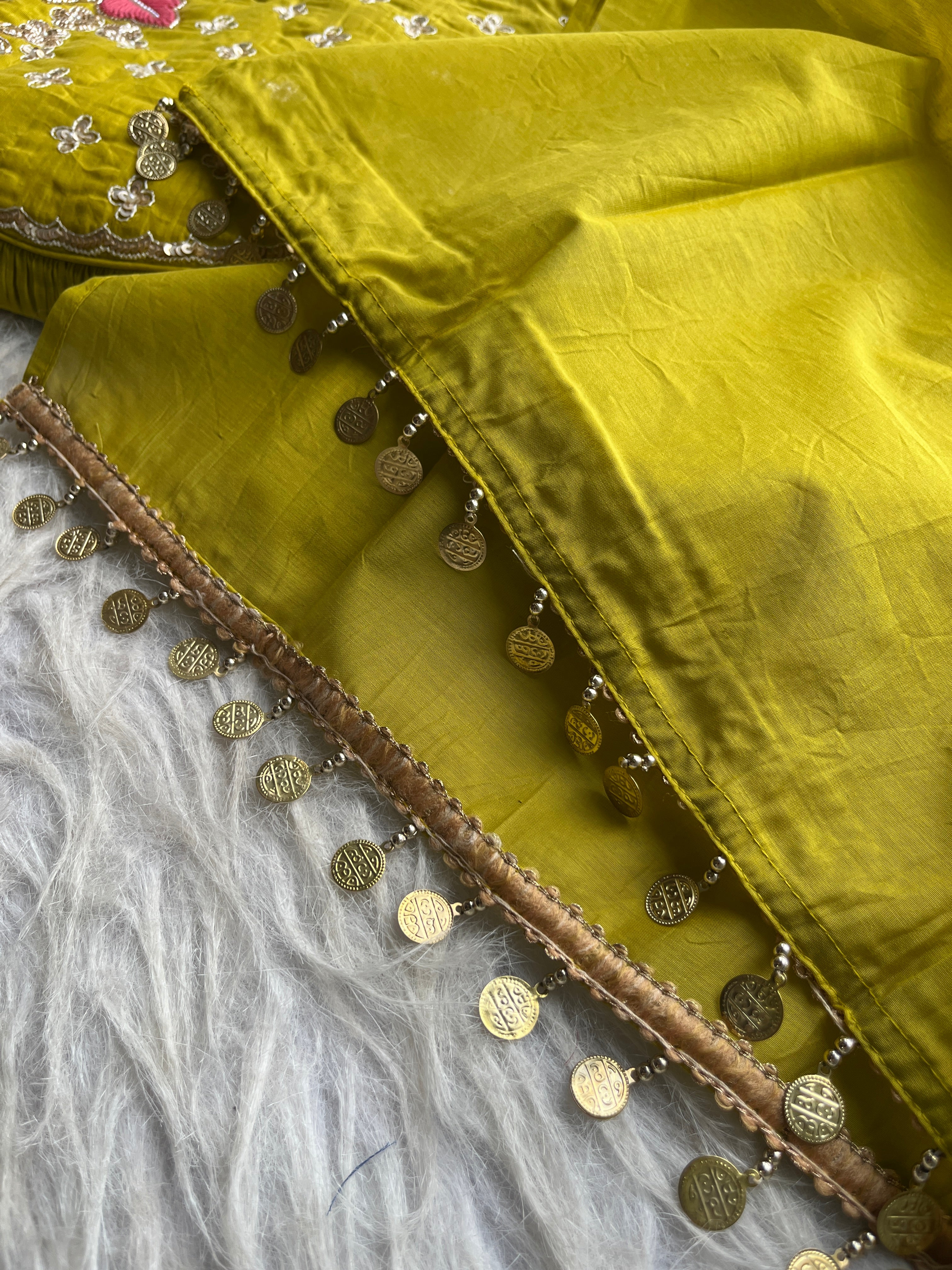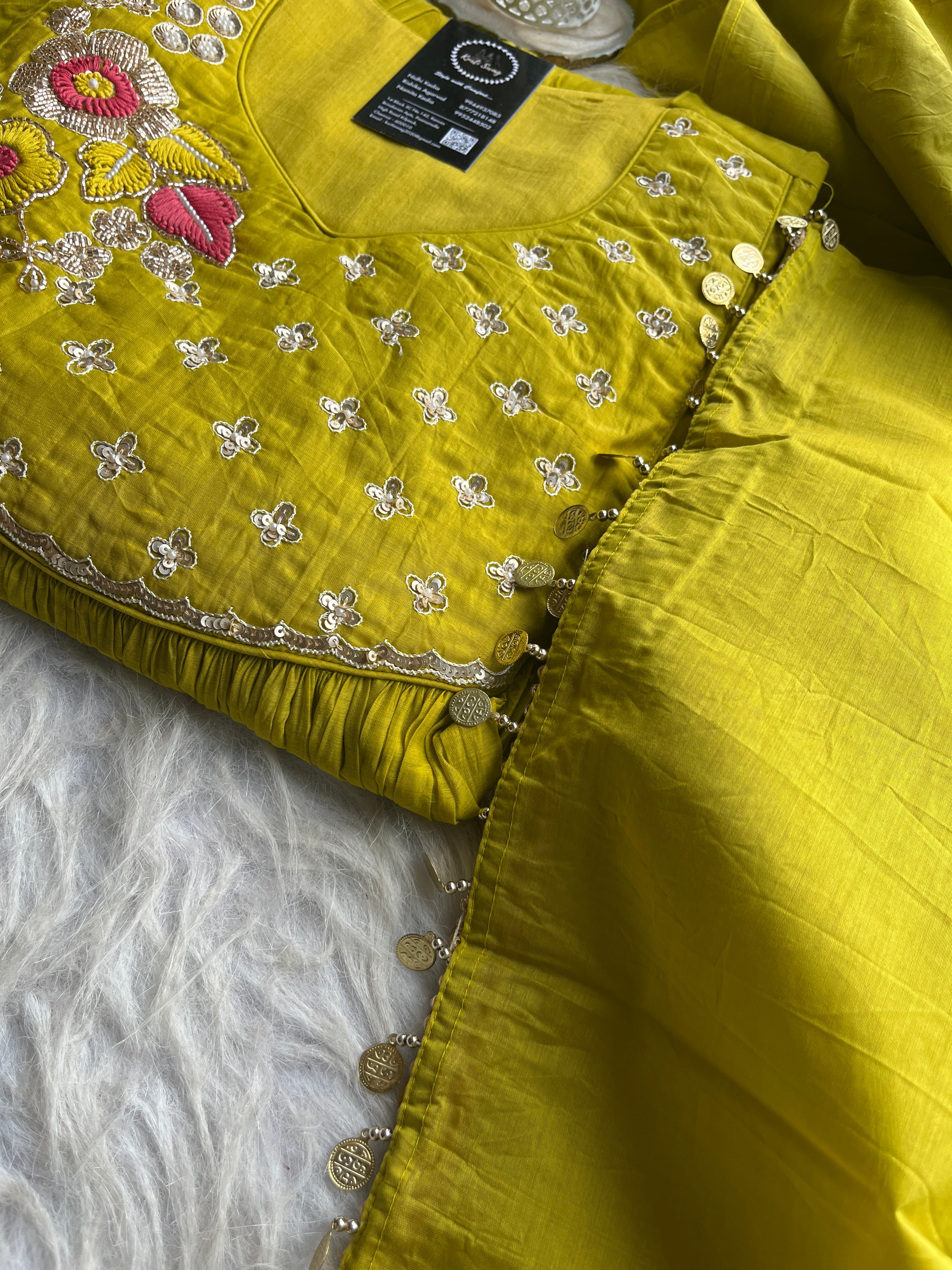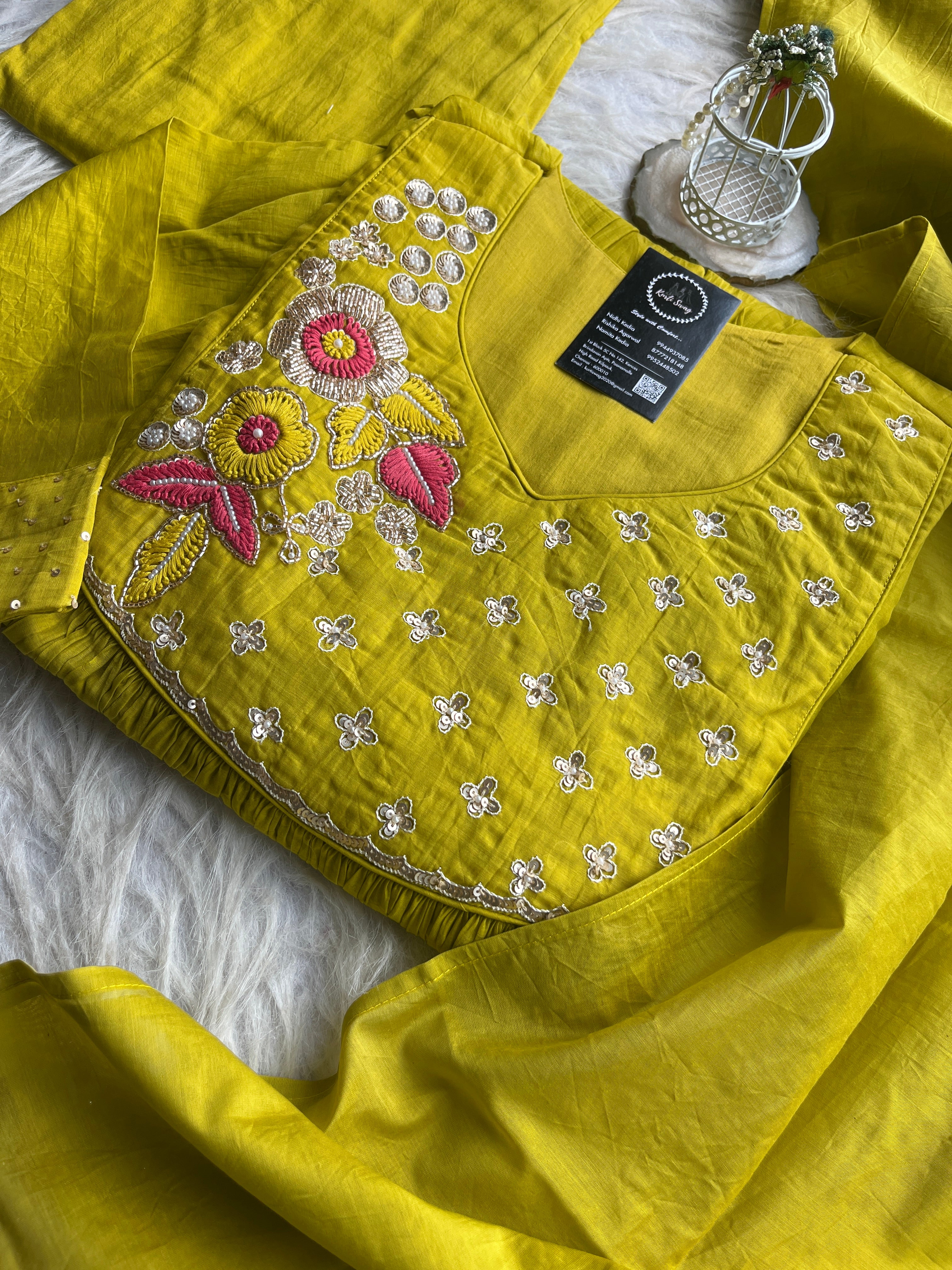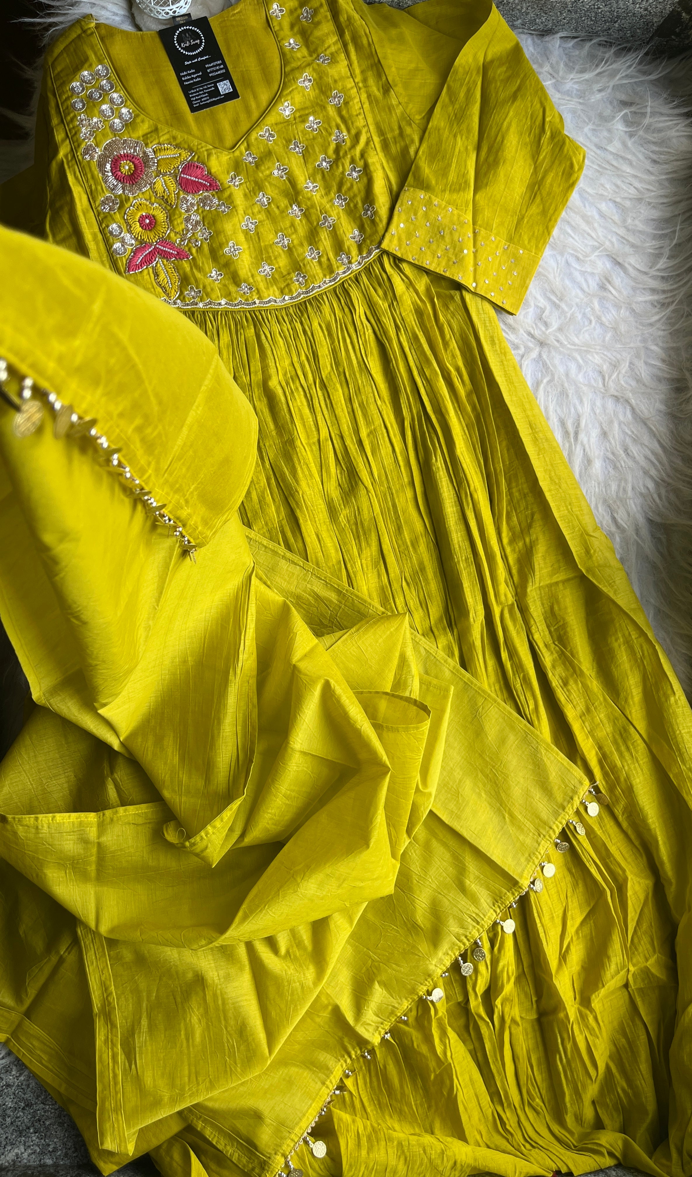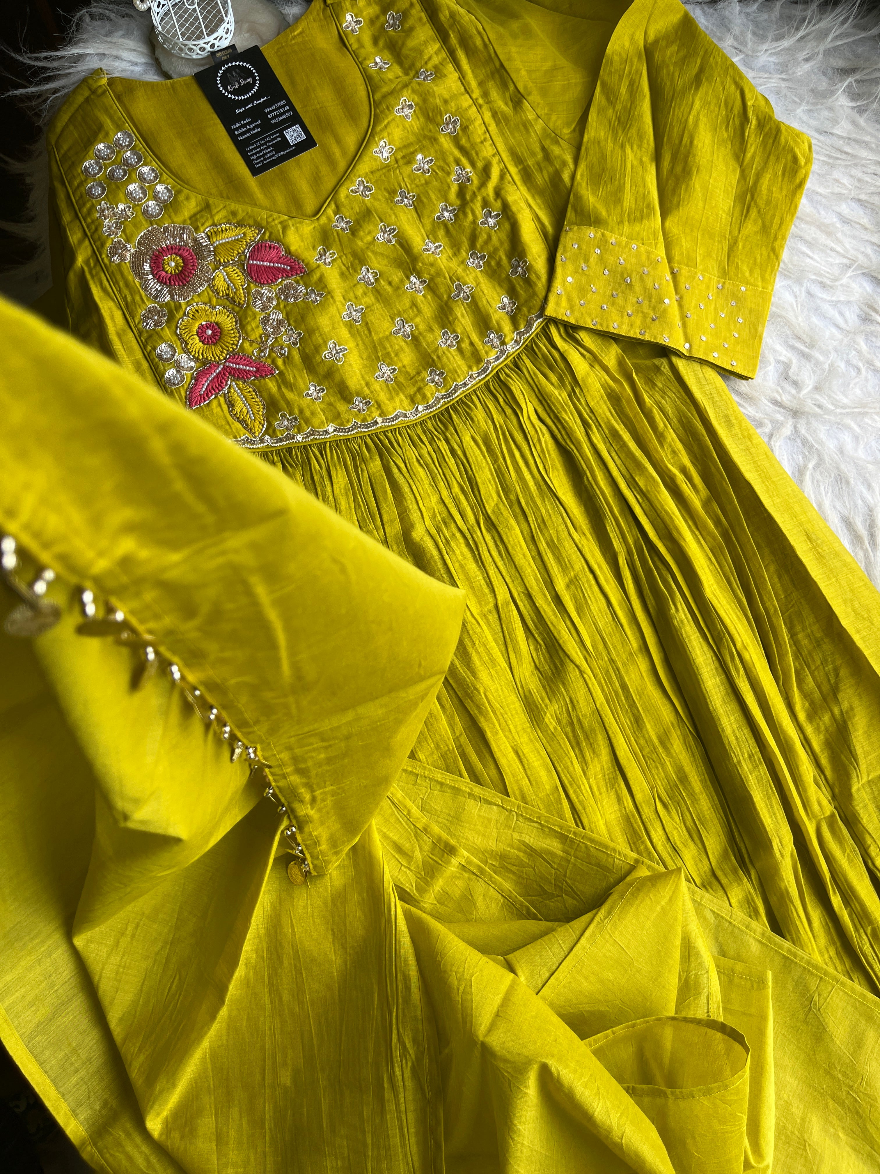 ✅ Premium Mul Chanderi Dress With Thread, Zari And Cutdaana Handwork Work On The Yoke